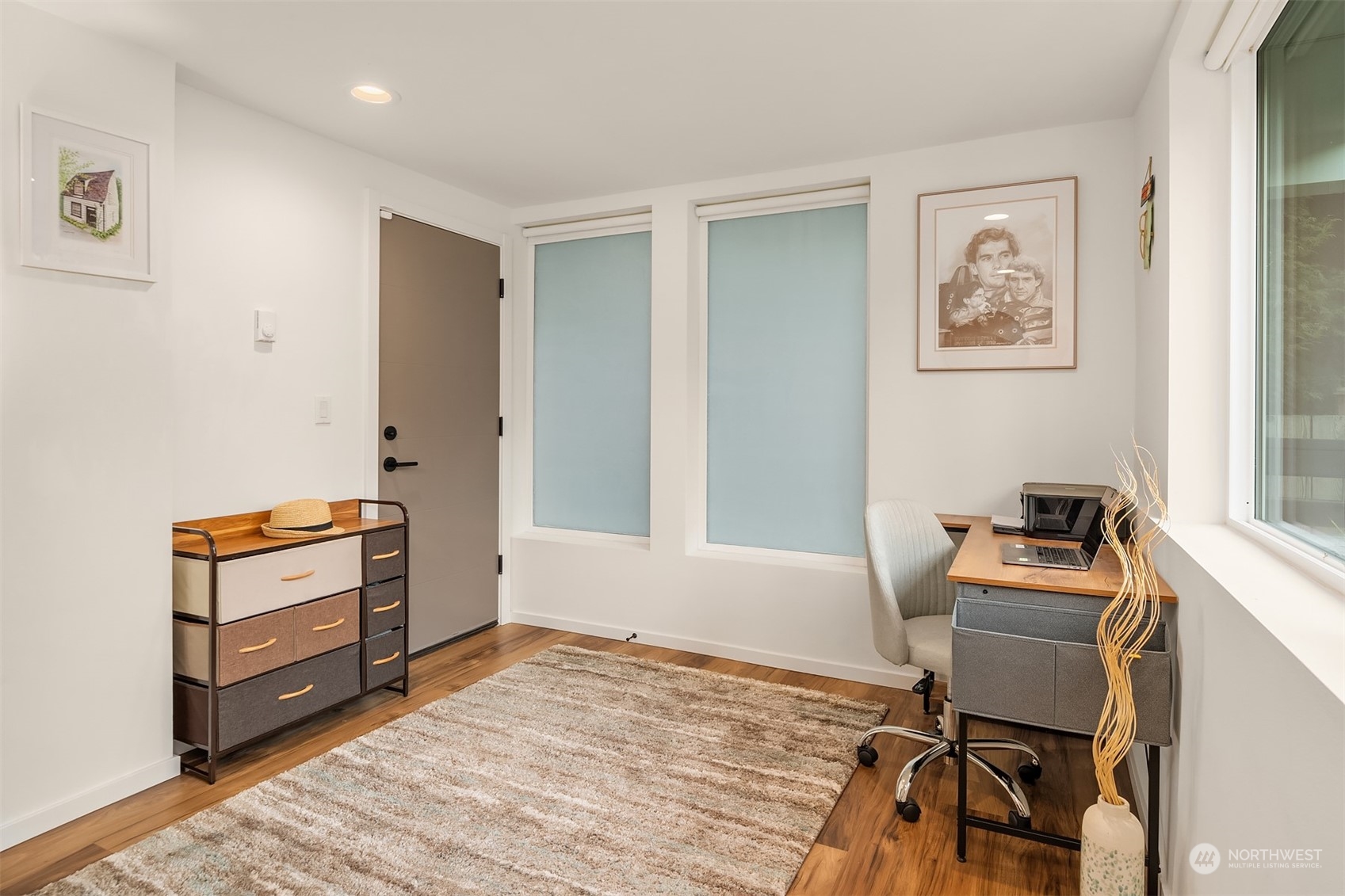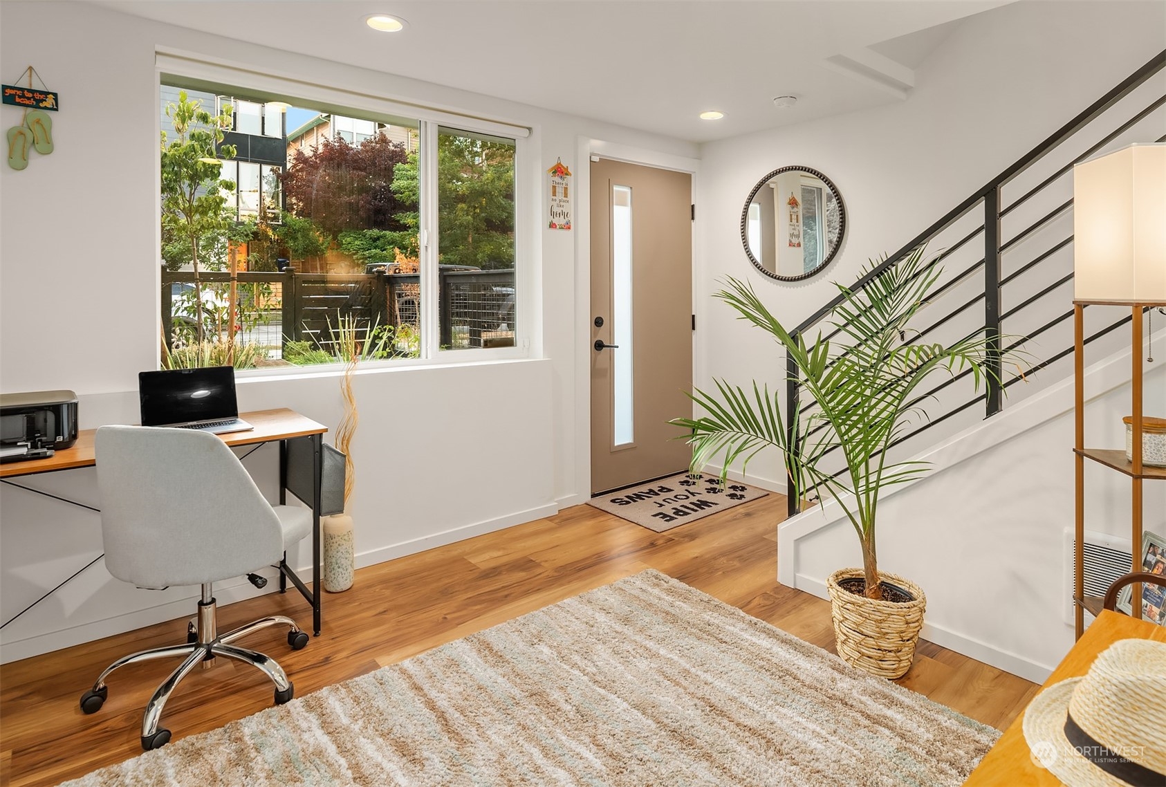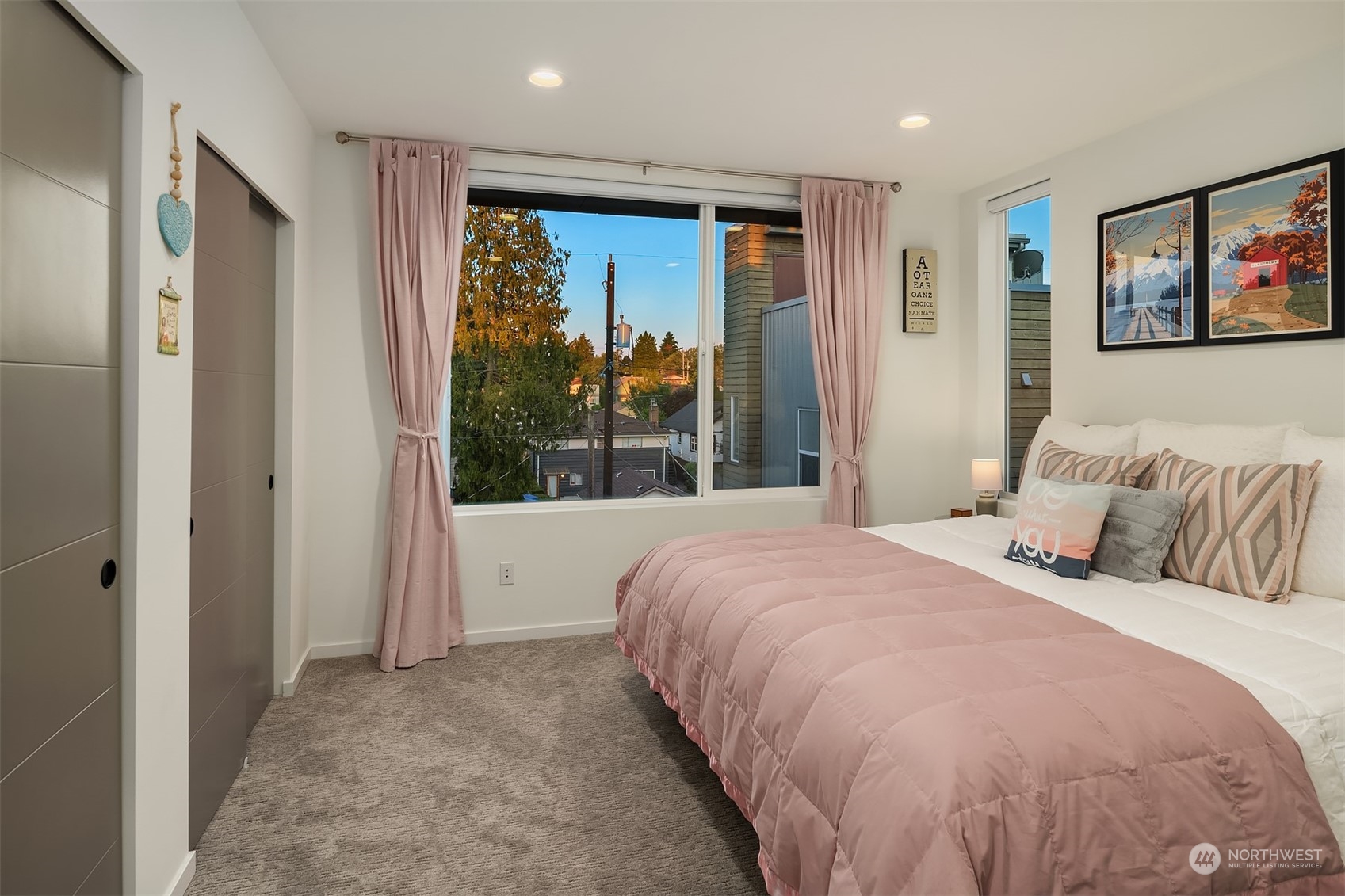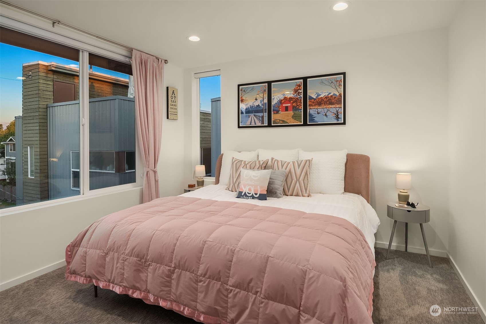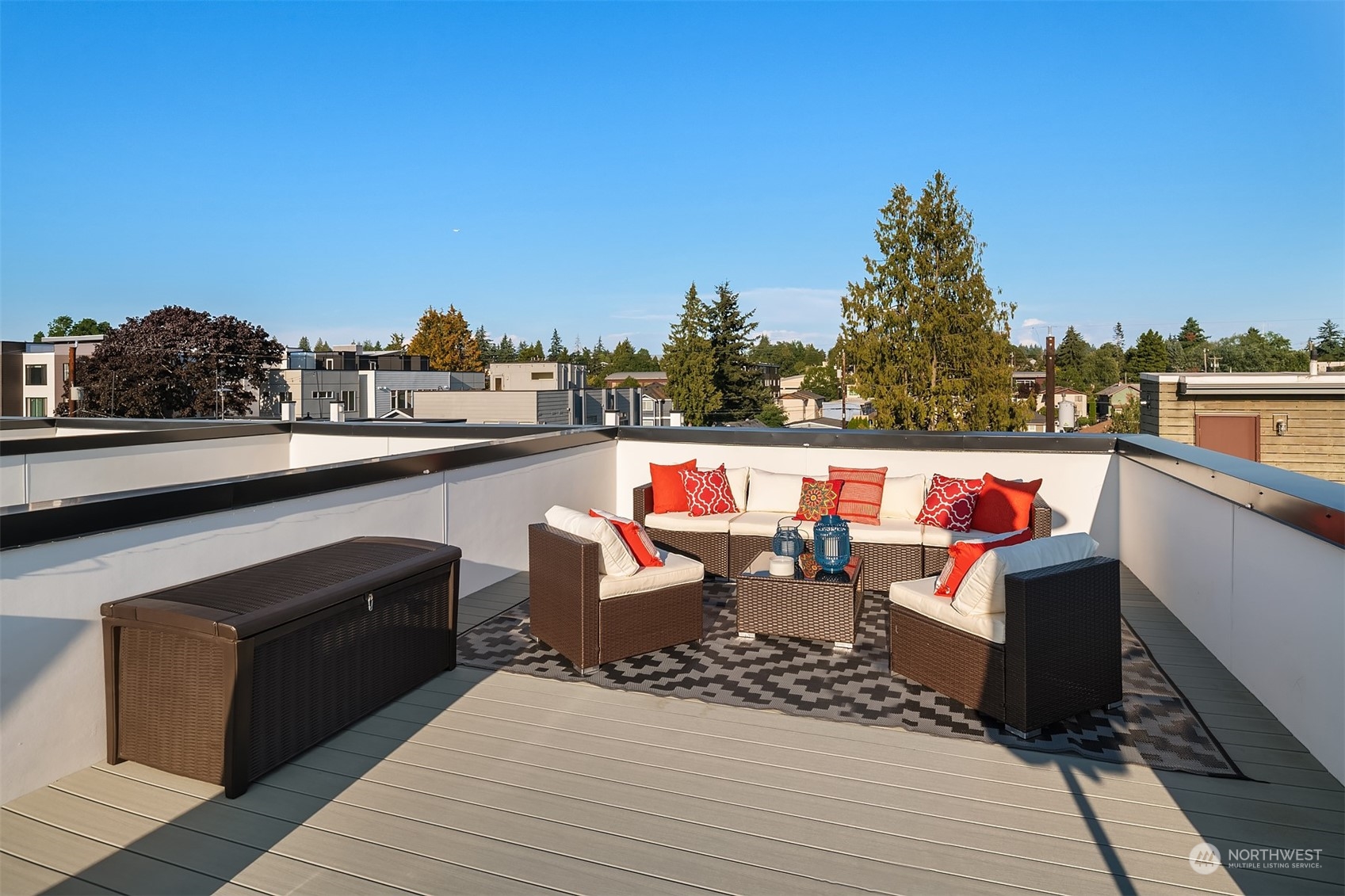 BETTER THAN NEW HOME by ecoBuilders, EASY ACCESS GARAGE, Additional exterior space & 1 YEAR WARRANTY INCLUDED!! Contemporary 2 bed/den/1.5 bath end unit with natural light on three sides. Open living space with oversized bar and extra cabinet storage topped with quartz counters, gas cooking and SS appliances. A powder room, balcony and custom shades complete this space. The entry level boasts a home office and access to the garage with extra storage. Pet owners will love the fully fenced courtyard. The 2nd level includes 2 bedrooms, an oversized bath with double vanity, large walk-in shower and access to the rooftop deck finished with Trex decking. Ring security system & LG front load washer/dryer included. Option to purchase furnished!