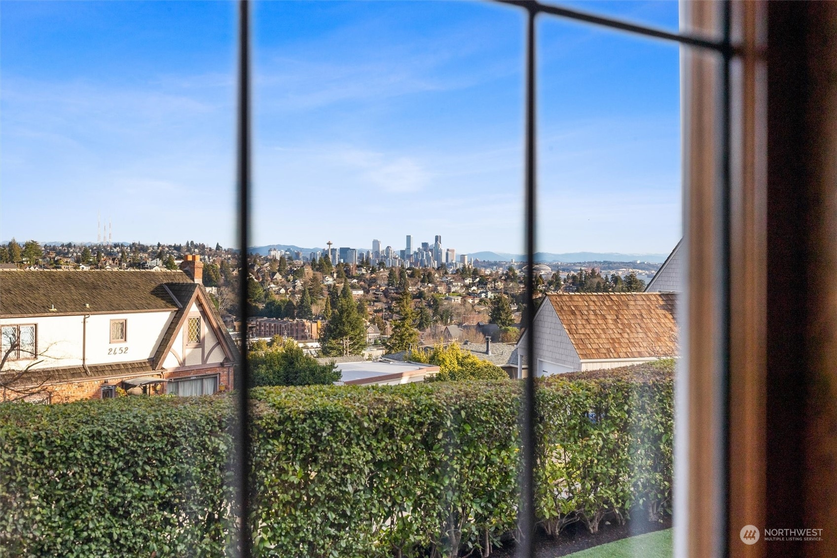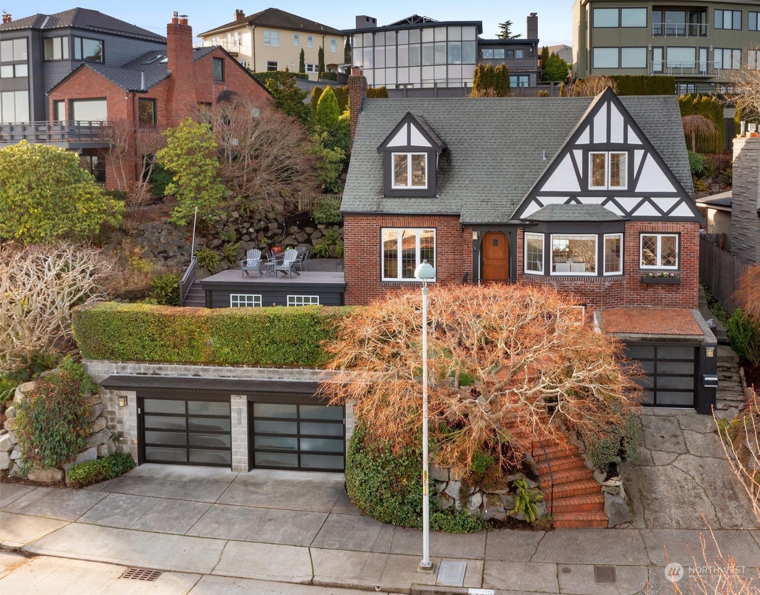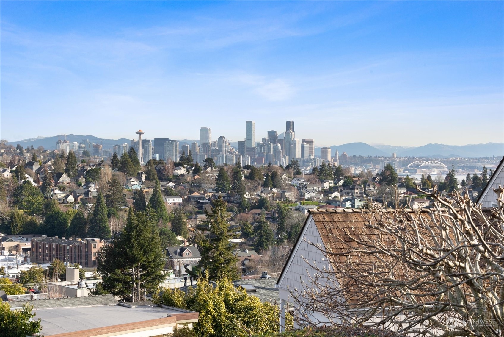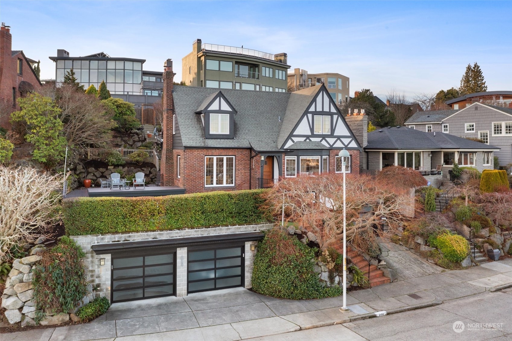 Perched on the crest of Magnolia's desirable west hill, this updated and charming tudor presents Seattle's finest views from almost every window. From the sunrise over the Cascades to the twinkling nighttime downtown lights, all four seasons offer a stunning backdrop. Coveted three bedrooms on the top floor with a large five-piece bath. Open kitchen with adjacent sitting room and generous living and dining room with period details in tact. Huge street to alley lot with potential for parking pad, sports court or separate view DADU. Rare large garage-fits an SUV! Carleton Park offers underground wires to take advantage of the stunning views in this area. Few short blocks to the village and minutes to downtown and SLU. Welcome home!