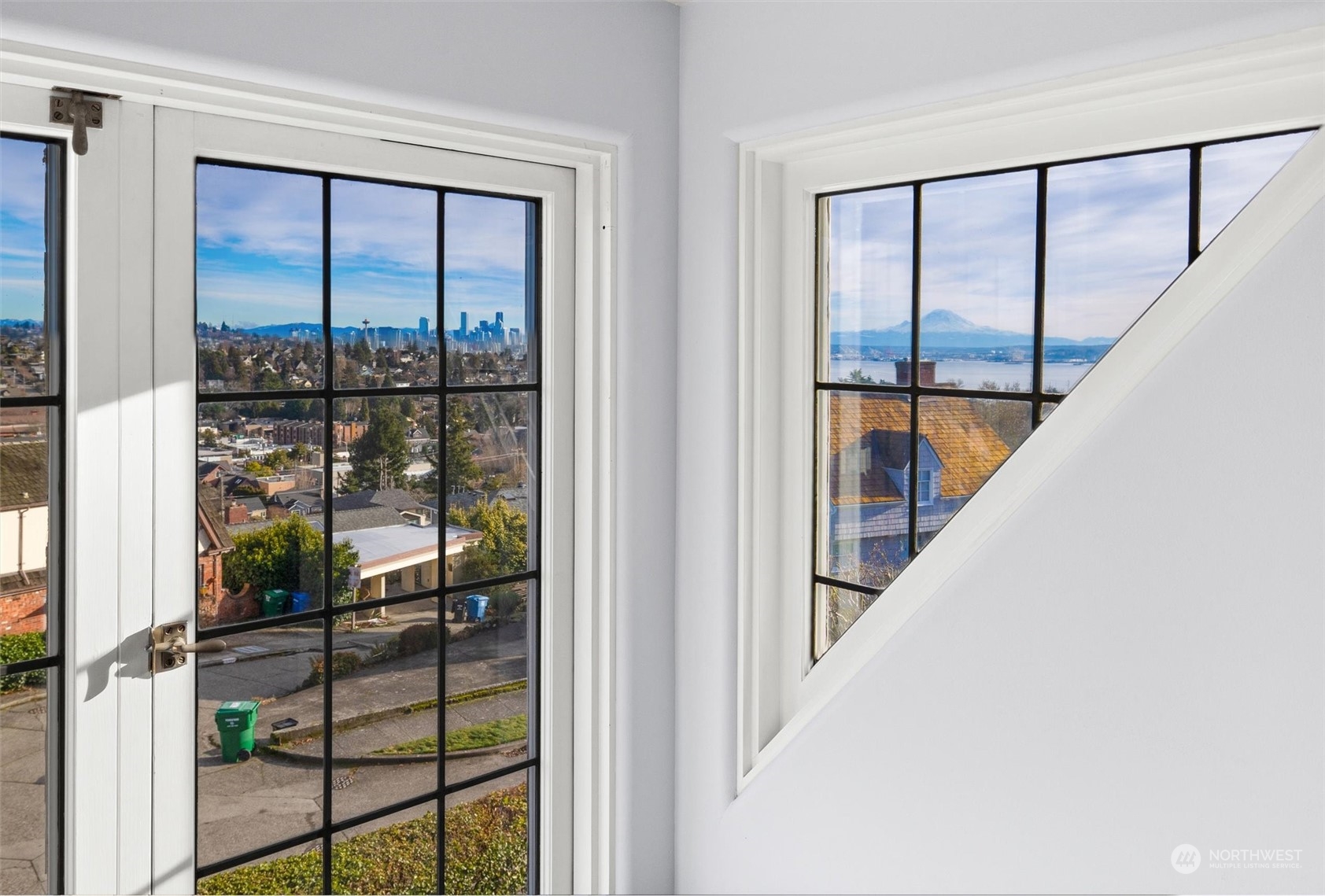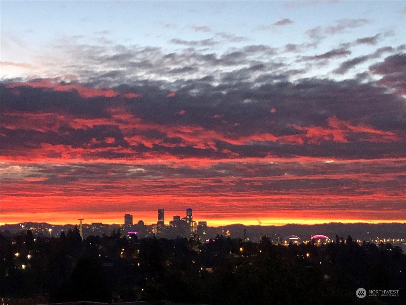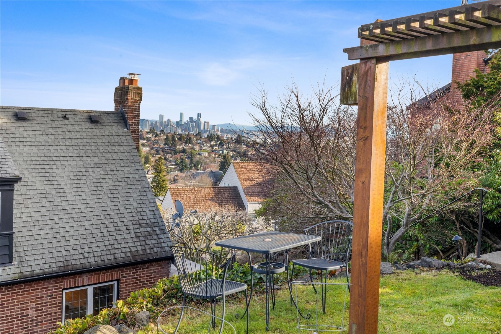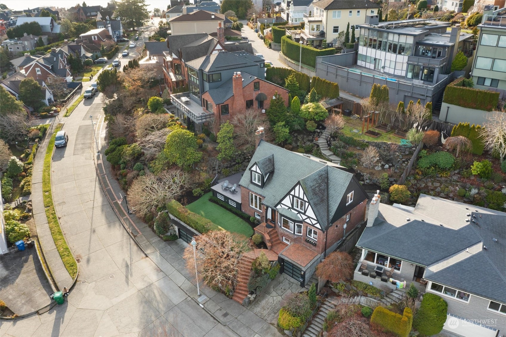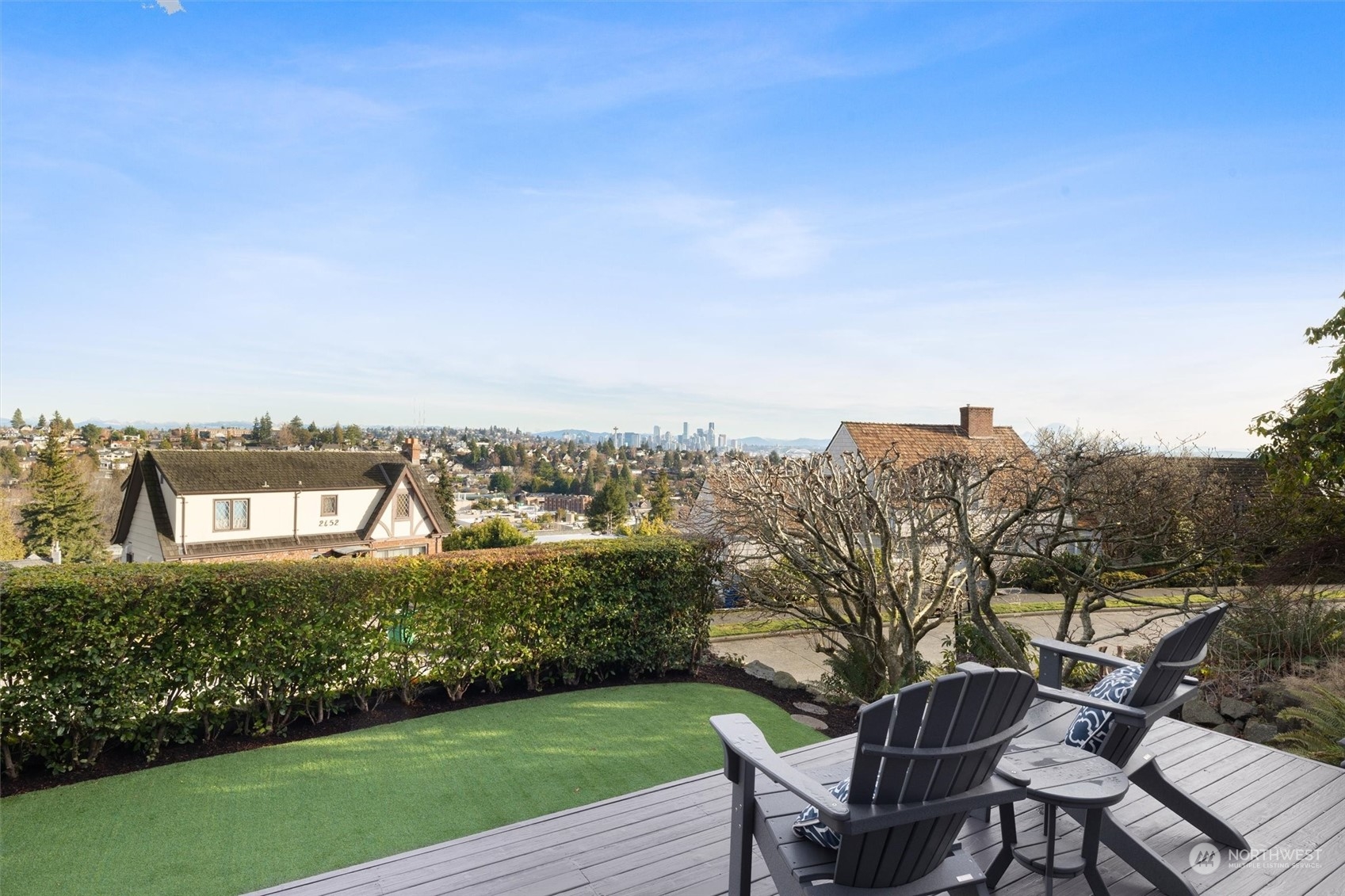 Perched on the crest of Magnolia's desirable west hill, this updated and charming tudor presents Seattle's finest views from almost every window. From the sunrise over the Cascades to the twinkling nighttime downtown lights, all four seasons offer a stunning backdrop. Coveted three bedrooms on the top floor with a large five-piece bath. Open kitchen with adjacent sitting room and generous living and dining room with period details in tact. Huge street to alley lot with potential for parking pad, sports court or separate view DADU. Rare large garage-fits an SUV! Carleton Park offers underground wires to take advantage of the stunning views in this area. Few short blocks to the village and minutes to downtown and SLU. Welcome home!