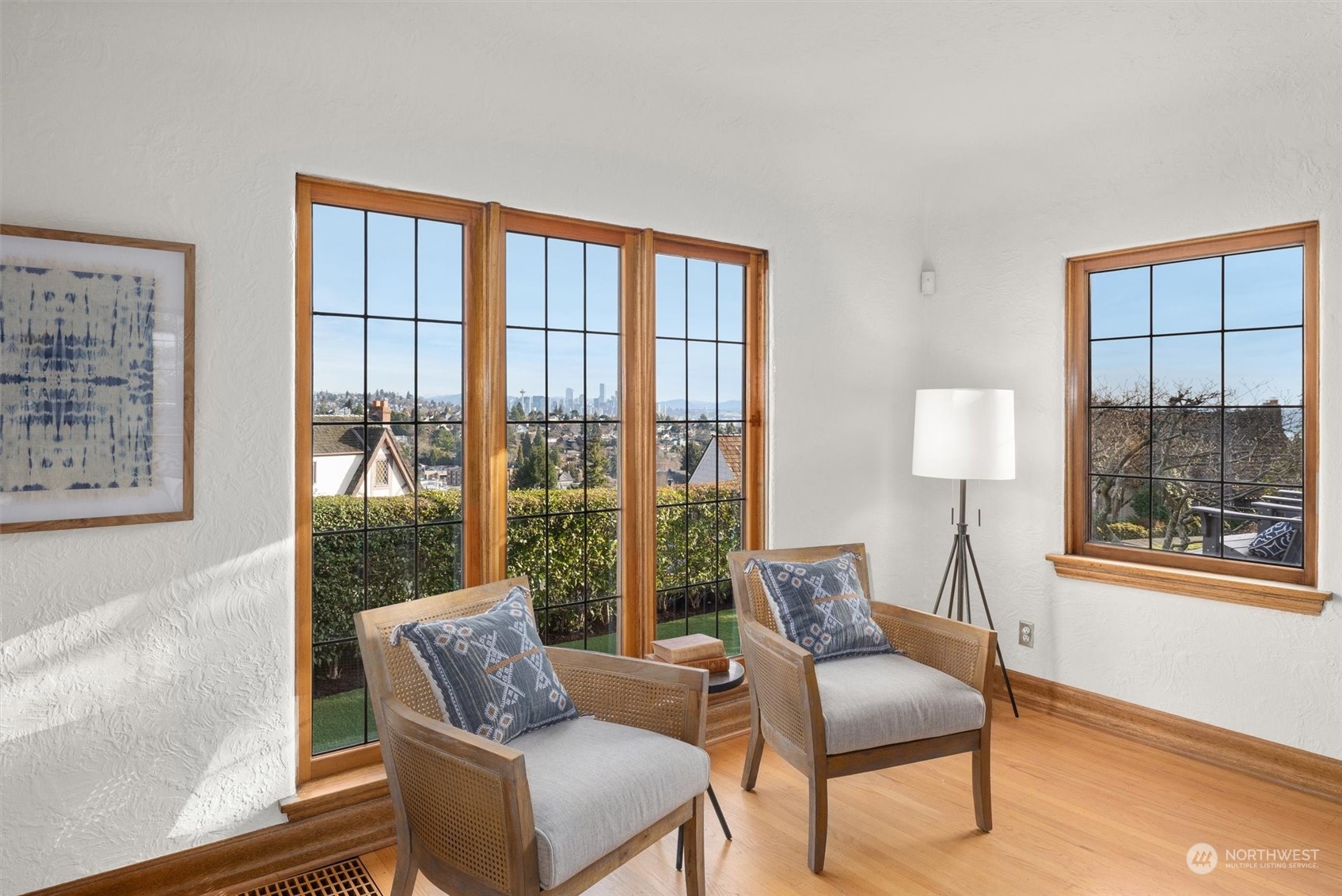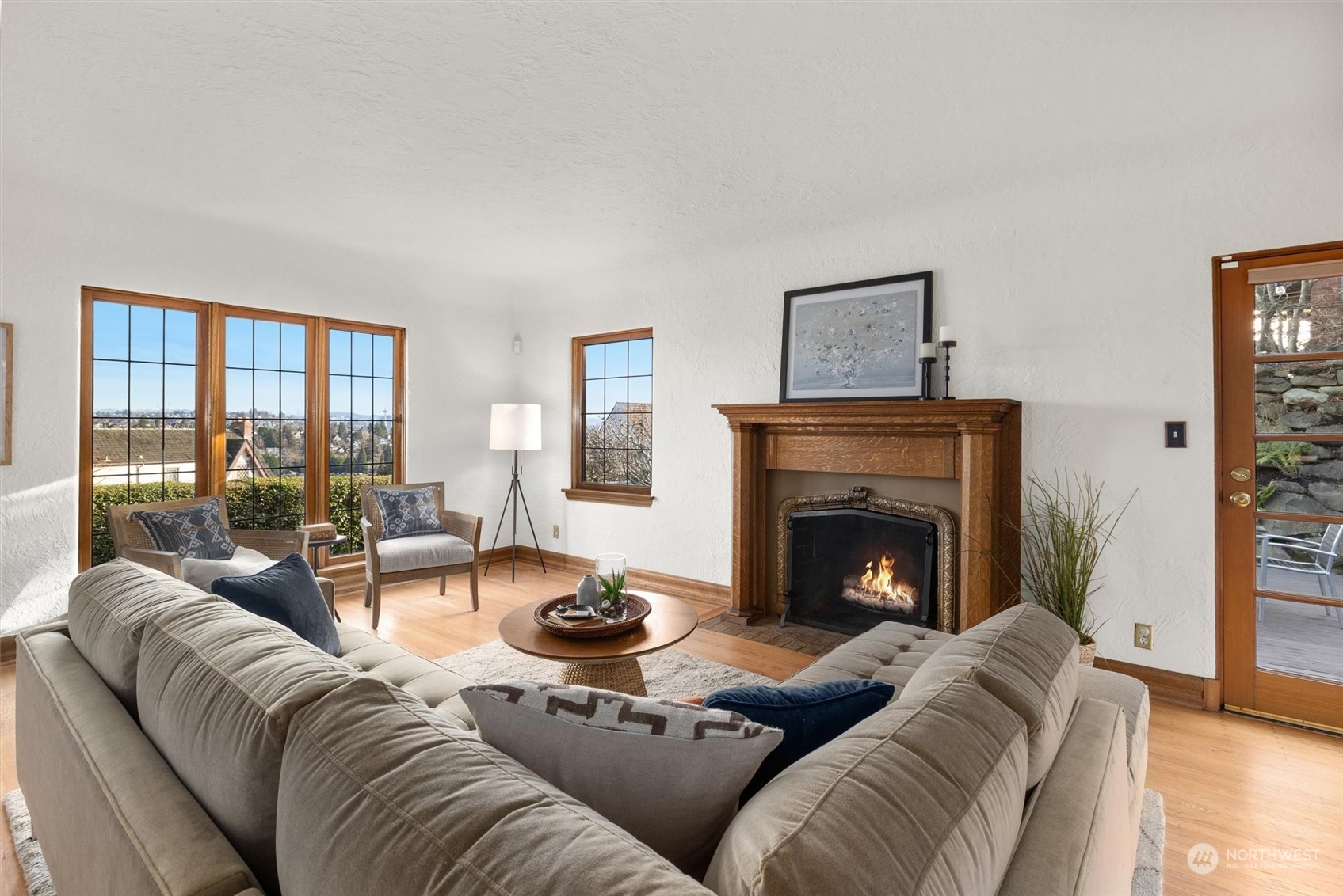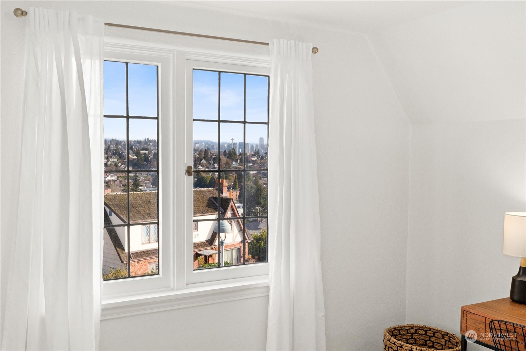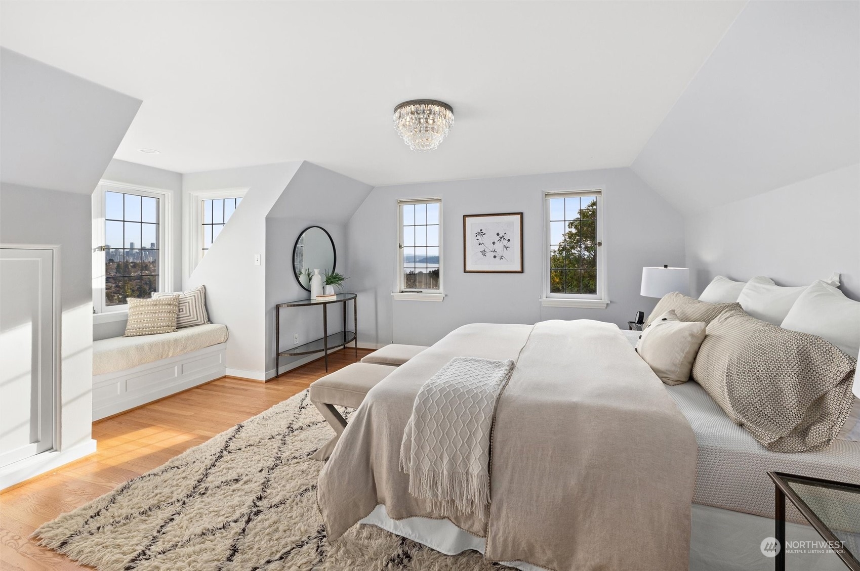 Perched on the crest of Magnolia's desirable west hill, this updated and charming tudor presents Seattle's finest views from almost every window. From the sunrise over the Cascades to the twinkling nighttime downtown lights, all four seasons offer a stunning backdrop. Coveted three bedrooms on the top floor with a large five-piece bath. Open kitchen with adjacent sitting room and generous living and dining room with period details in tact. Huge street to alley lot with potential for parking pad, sports court or separate view DADU. Rare large garage-fits an SUV! Carleton Park offers underground wires to take advantage of the stunning views in this area. Few short blocks to the village and minutes to downtown and SLU. Welcome home!