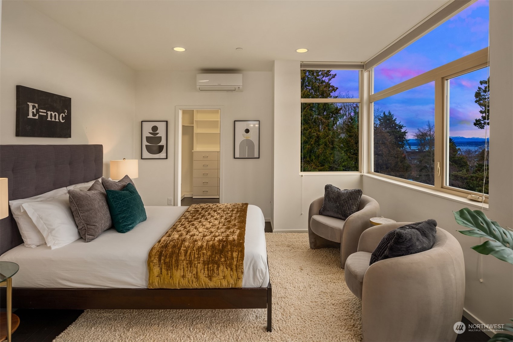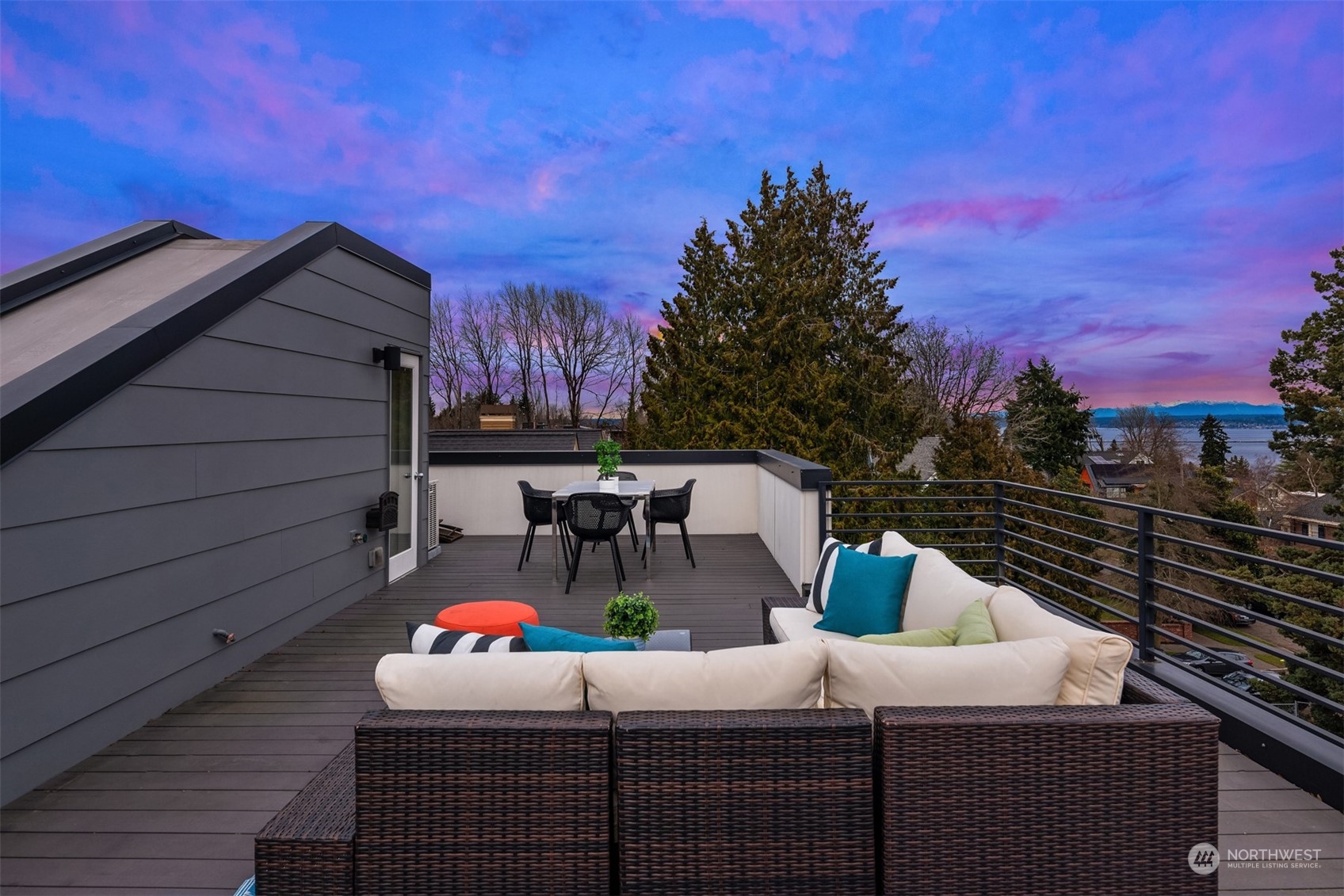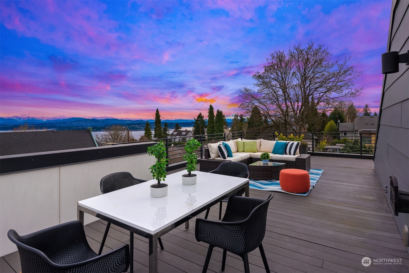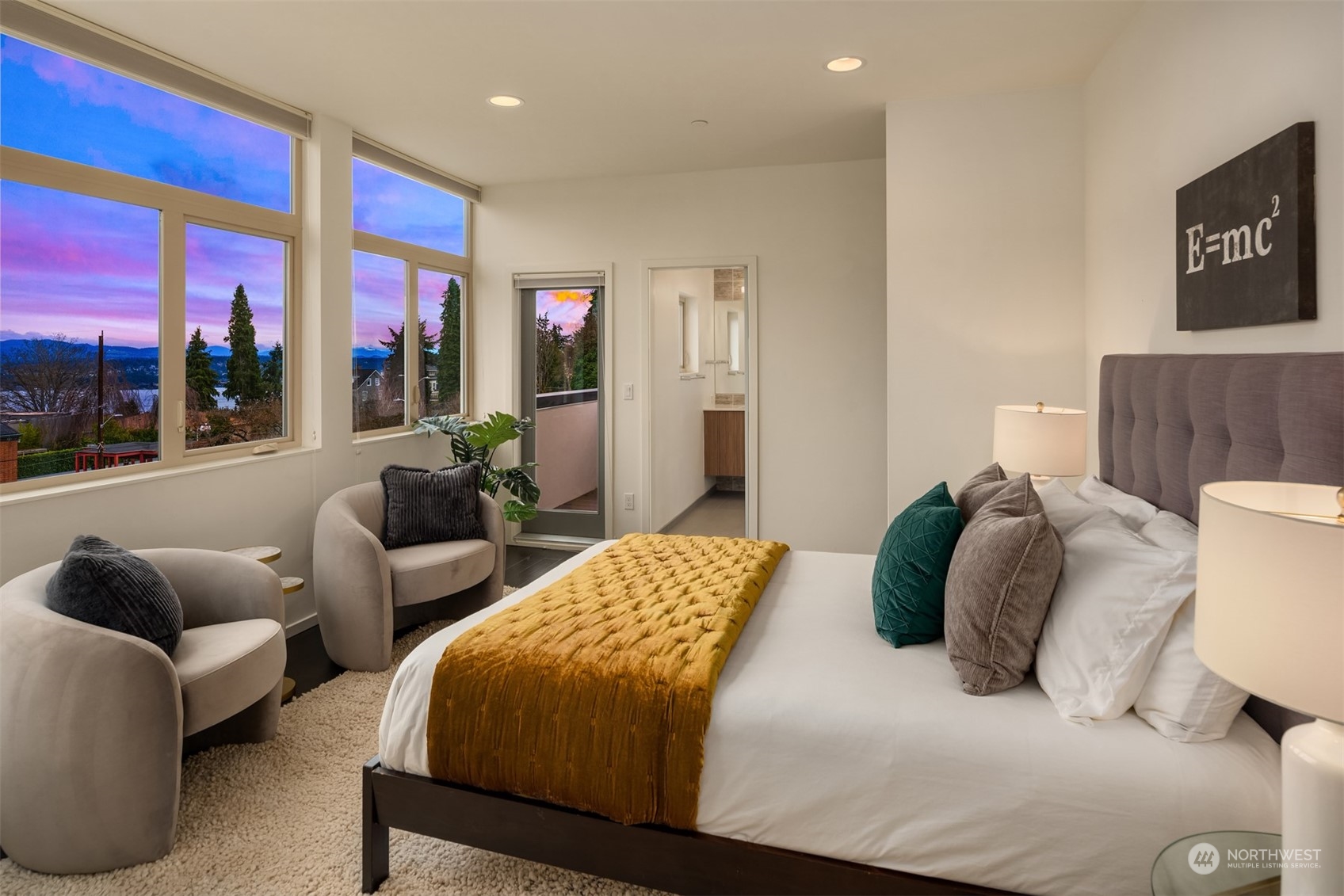 Stunning Madrona home showcases modern architecture spreading over four levels of indoor/outdoor living space. Open-concept main living level boasts richly hued flooring, custom metalwork, soaring ceilings + fireplace. Beautiful euro-style cabinets highlight sleek chef’s kitchen with high-end appliances, pantry + large island. Two bedrooms, bonus room, bath are found on lower level. Great set-up for home office w/ access to patio. Retreat in luxury to the primary suite on third level with its spa-like bath, private balcony + oversized walk-in closet. A rooftop deck with lake + mountain views make this home an entertainer’s paradise. Tree-lined neighborhood with adjacent park land. Dedicated parking space + close to refined dining, shopping.