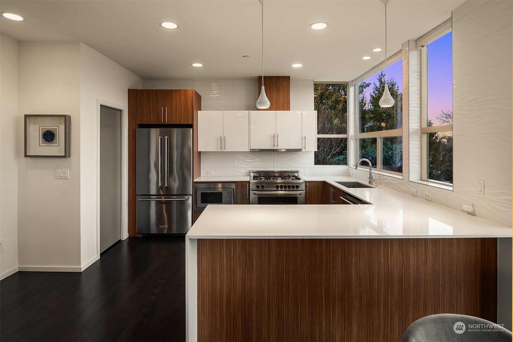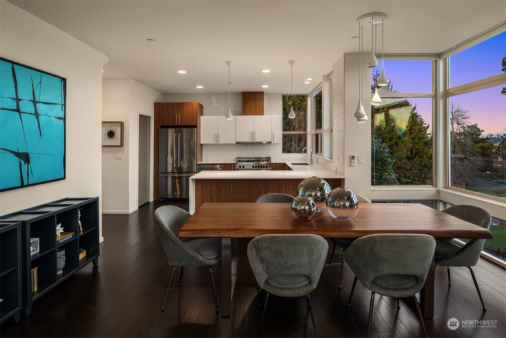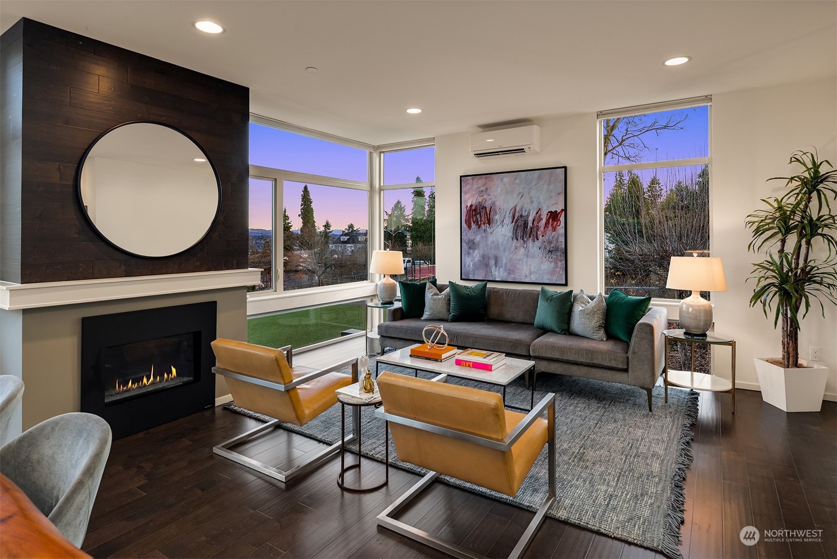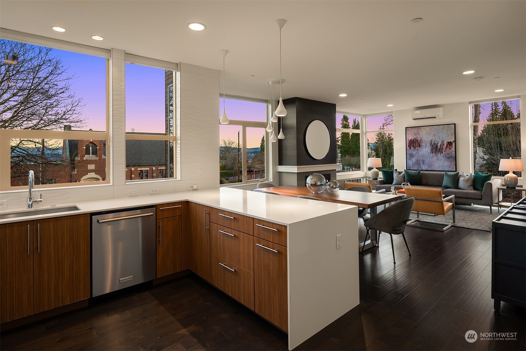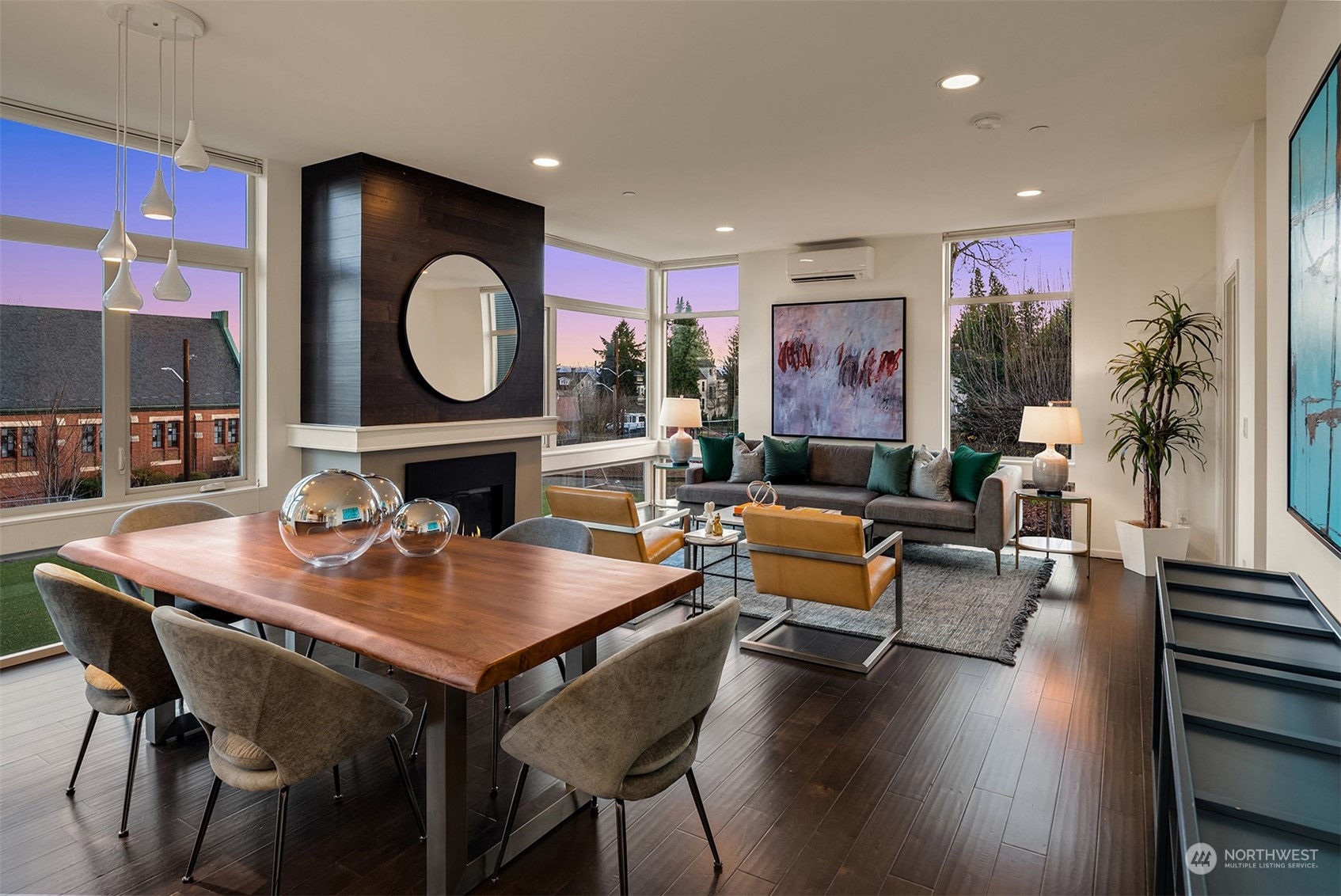Stunning Madrona home showcases modern architecture spreading over four levels of indoor/outdoor living space. Open-concept main living level boasts richly hued flooring, custom metalwork, soaring ceilings + fireplace. Beautiful euro-style cabinets highlight sleek chef’s kitchen with high-end appliances, pantry + large island. Two bedrooms, bonus room, bath are found on lower level. Great set-up for home office w/ access to patio. Retreat in luxury to the primary suite on third level with its spa-like bath, private balcony + oversized walk-in closet. A rooftop deck with lake + mountain views make this home an entertainer’s paradise. Tree-lined neighborhood with adjacent park land. Dedicated parking space + close to refined dining, shopping.