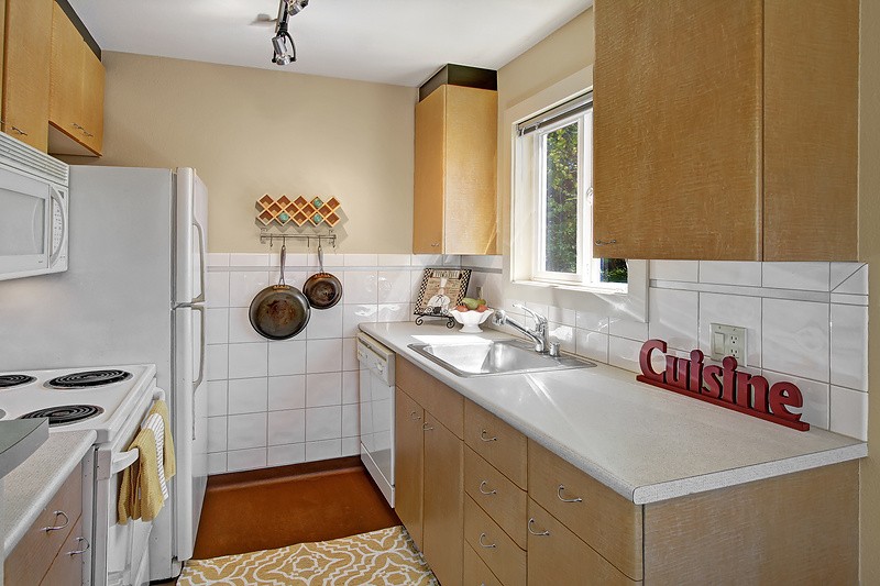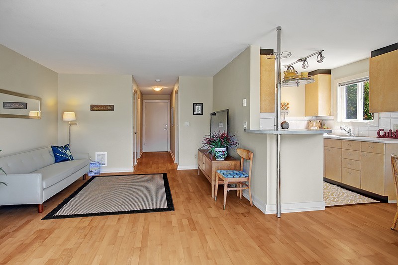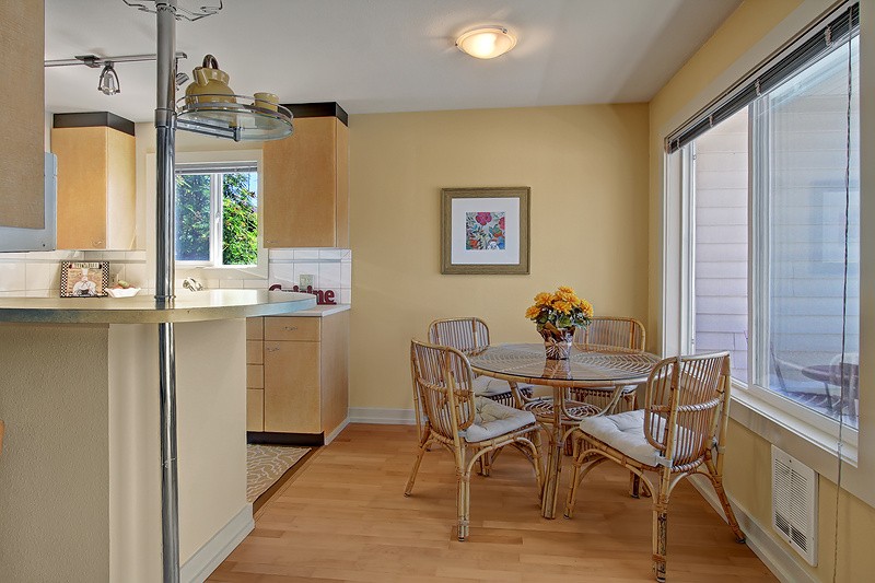 Fabulous Fremont condo seconds to shopping, cafes, metro, the Solstice Parade~Blocks to Google, Adobe & Tableau. Light-filled rooms w/marvelous S & W exposure. Chic ambiance, fresh interior paint, new hardwoods, retro cocktail bar. Huge balcony ideal for al fresco dining. Corner unit, eco-friendly cork flooring, secure entry, storage unit & bike storage. All appliances stay, incl W&D. Burke-Gilman Trail & Green Lake Park nearby. Low $251/mo dues. Rarely available unit in outstanding complex.