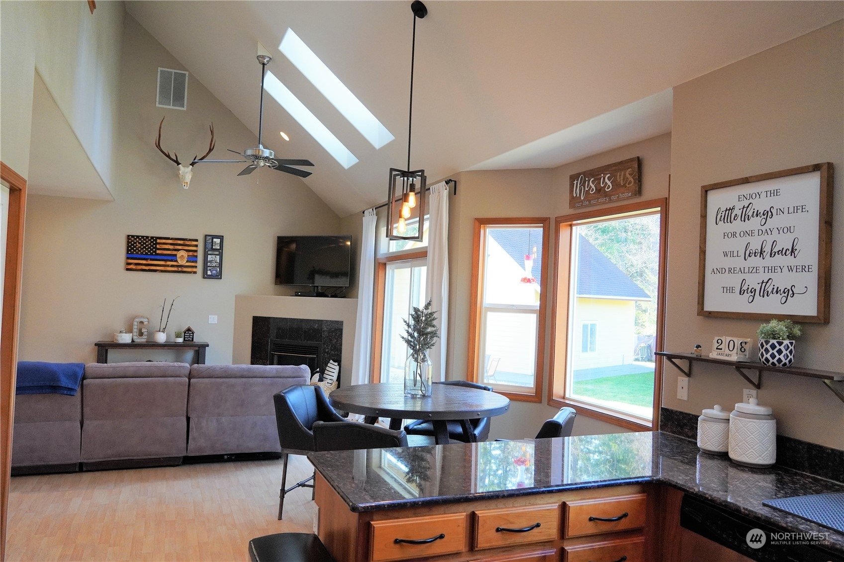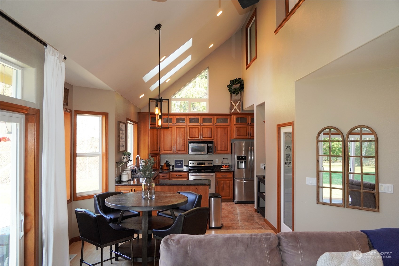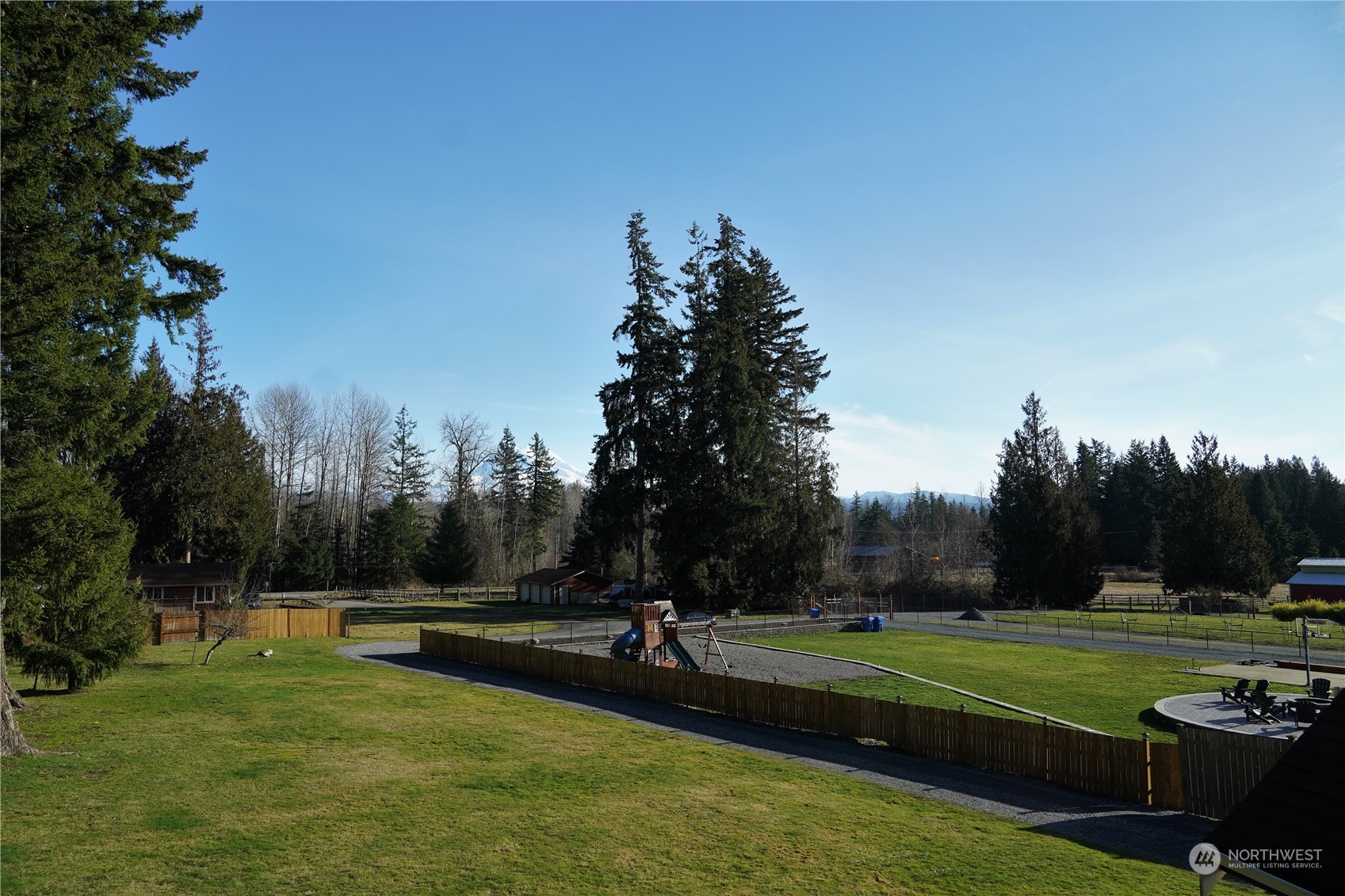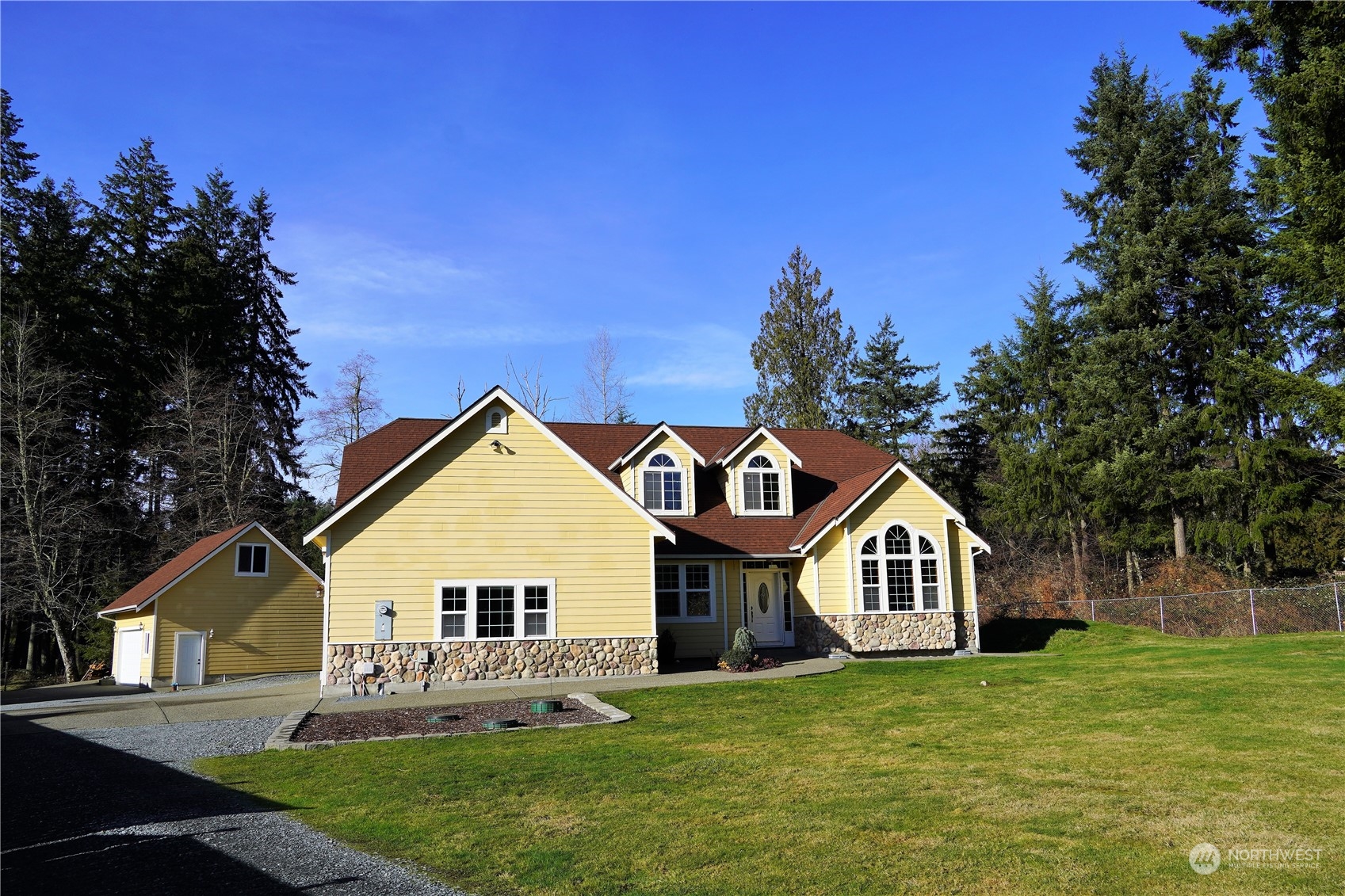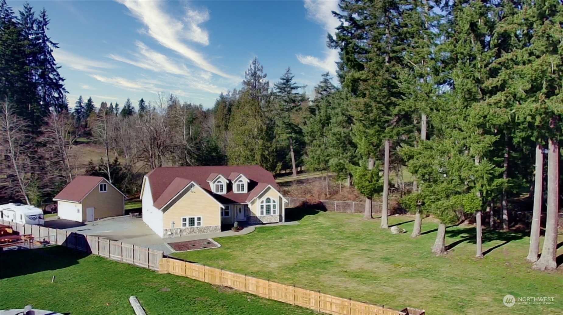Exceptional Opportunity: Spacious 2-Story home (2,904 sqft) on private 1.17 acres w/large detached garage & partial MR view! Hard to find - Primary bedrm on MAIN w/coffered ceiling, walk-in, 5 pc bath, jetted tub, tile, access to back yard. Great room has vaulted ceilings w/skylights that connect the kitchen (slab granite, SS apps, W-I pantry), eating area, family rm w/FP & the BIG back yard w/fire pit. Off the entry is a vaulted formal living rm w/MR views & formal dining rm w/coffered ceiling, office & 1/2 bath. Upstairs: 2 additional bedrms, full bath & giant bonus rm. Ample parking w/2 car garage + 2 car detached garage w/loft & shop (potential ADU?) + RV parking & generator hook up!. A/C, heat pump, mostly fenced, greenbelt...