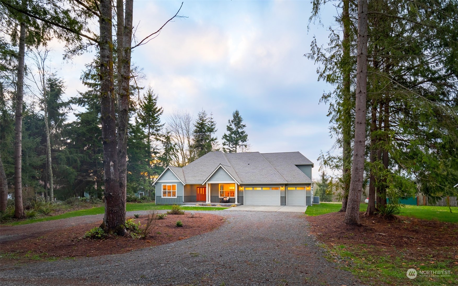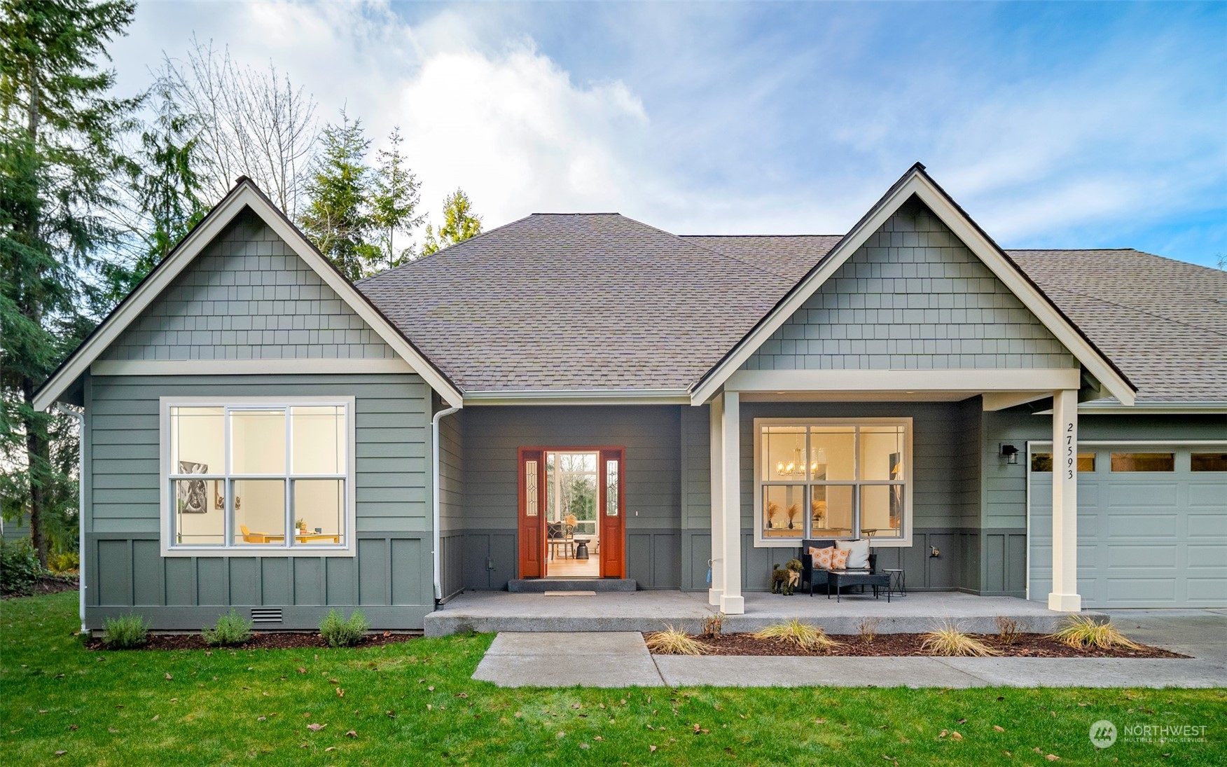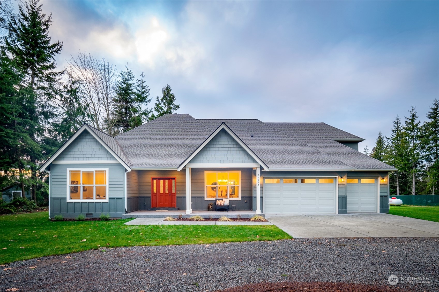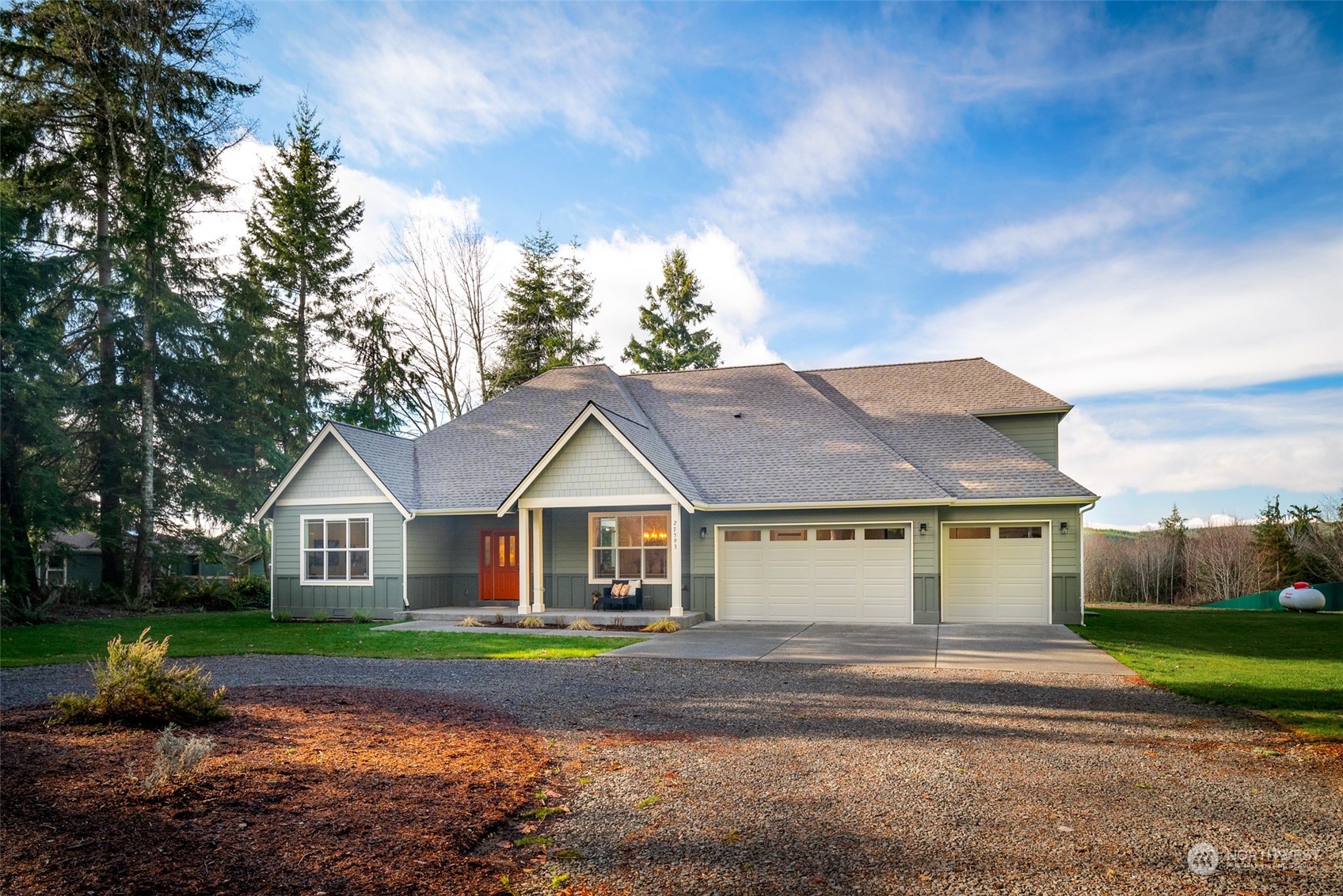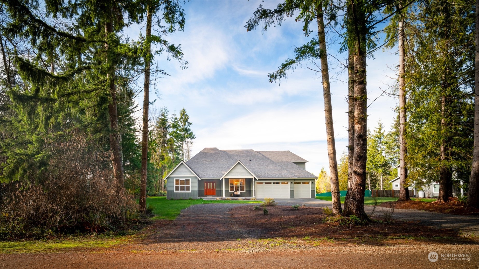 A winning combination - New construction on a tranquil 3+ acres just minutes to ferries. This peach, by Central Sound Construction, was created for discerning buyers searching for one level living with stylish finishes. This floorplan's flow gets an A+ & you will love the stunning great room with it's vaulted ceilings, floor to ceiling stone hearth, abundant windows & a deluxe Chef's kitchen with a pretty dining nook. The attractive entry is flanked by an office & formal dining room & the large, level yard can be enjoyed from the covered patio. A spacious, deluxe primary suite boasts a gorgeous, ensuite bath. 2 additional bedrooms grace the main floor. Media/bonus room, 3 car garage, heat pump & tankless hot water, partial mountain view.