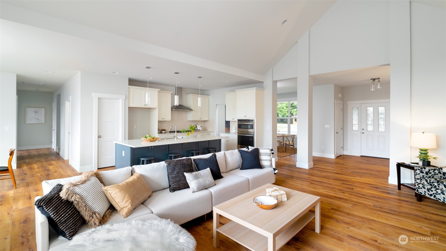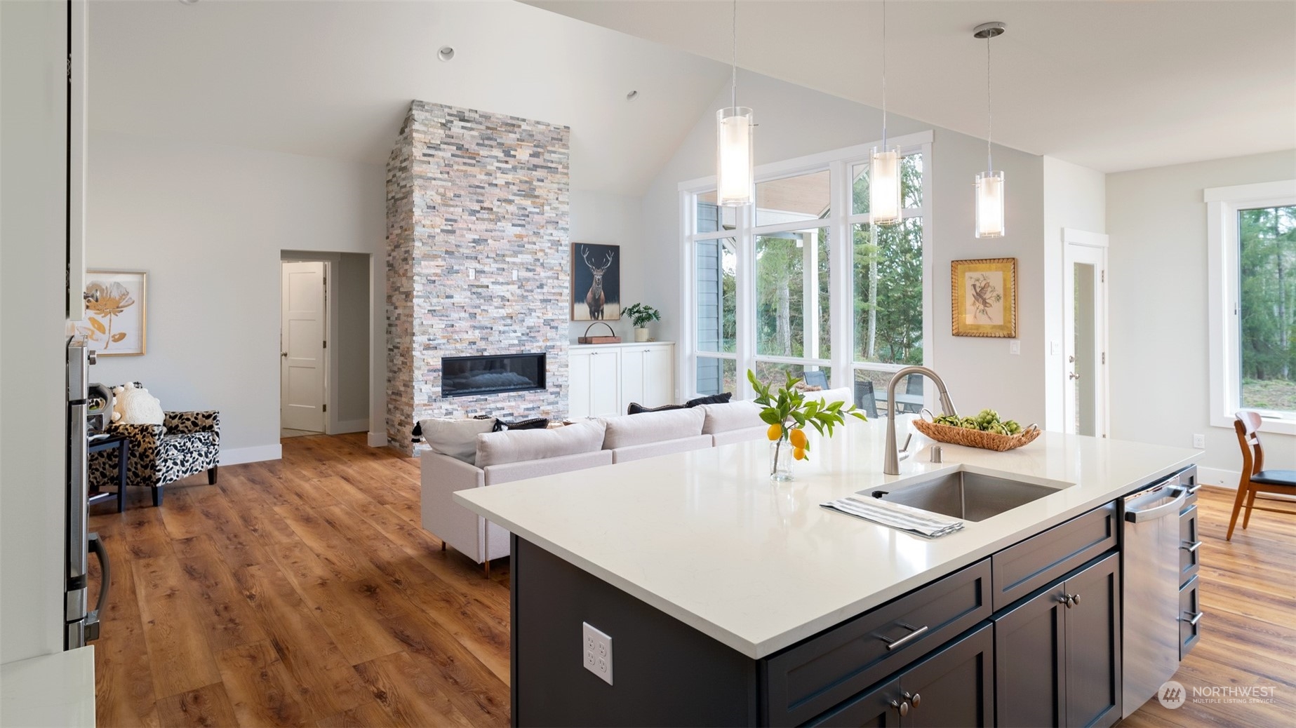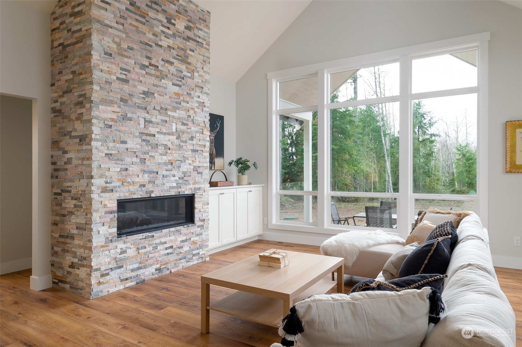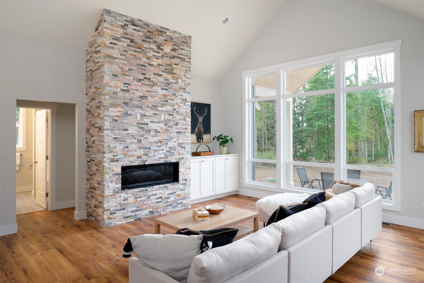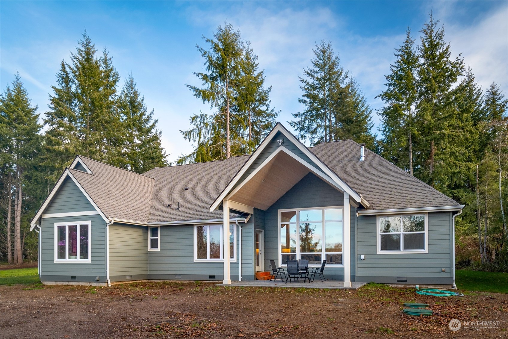 A winning combination - New construction on a tranquil 3+ acres just minutes to ferries. This peach, by Central Sound Construction, was created for discerning buyers searching for one level living with stylish finishes. This floorplan's flow gets an A+ & you will love the stunning great room with it's vaulted ceilings, floor to ceiling stone hearth, abundant windows & a deluxe Chef's kitchen with a pretty dining nook. The attractive entry is flanked by an office & formal dining room & the large, level yard can be enjoyed from the covered patio. A spacious, deluxe primary suite boasts a gorgeous, ensuite bath. 2 additional bedrooms grace the main floor. Media/bonus room, 3 car garage, heat pump & tankless hot water, partial mountain view.