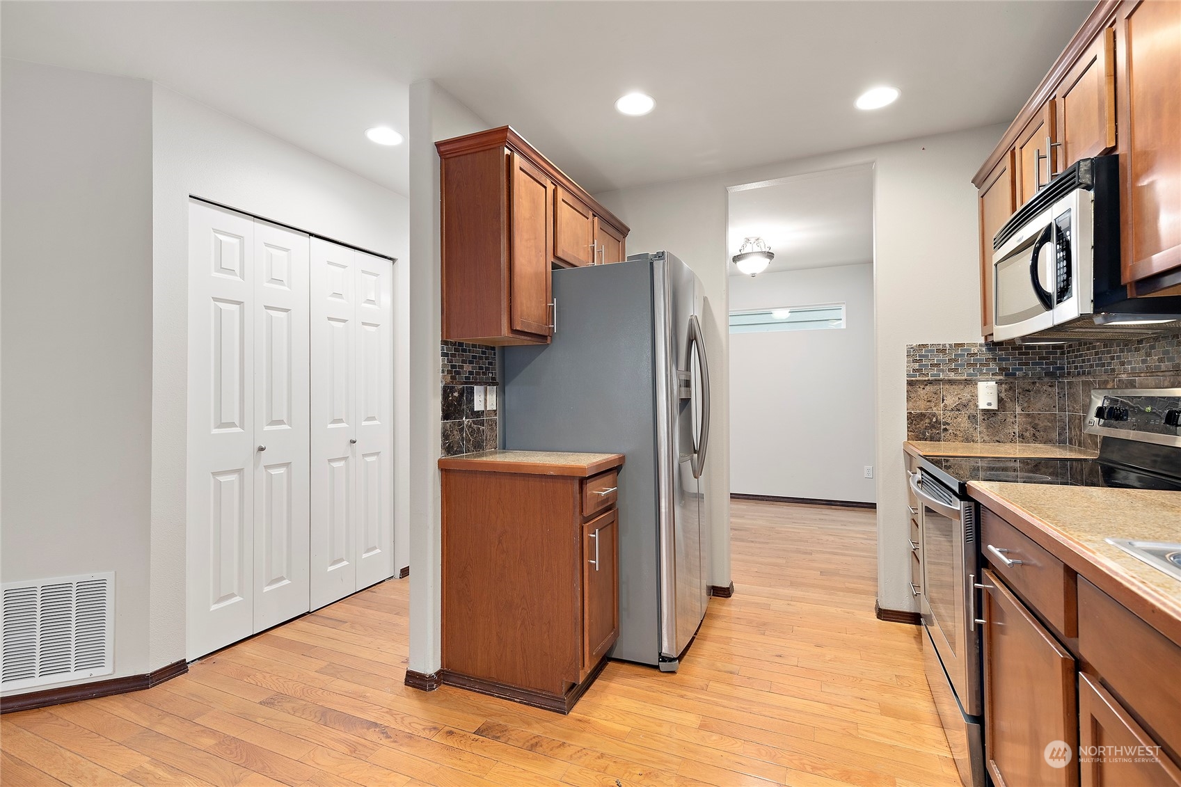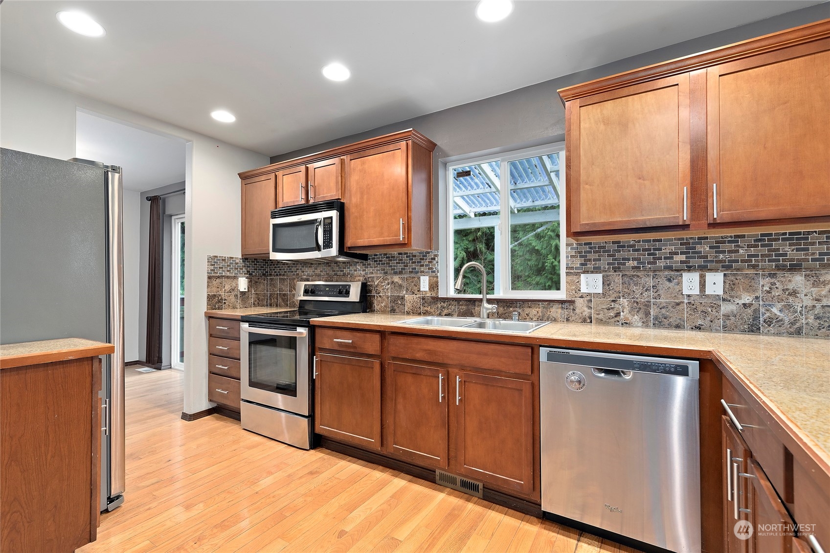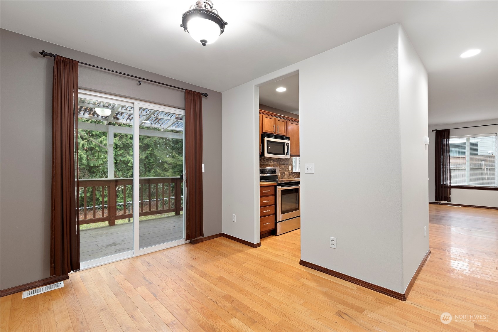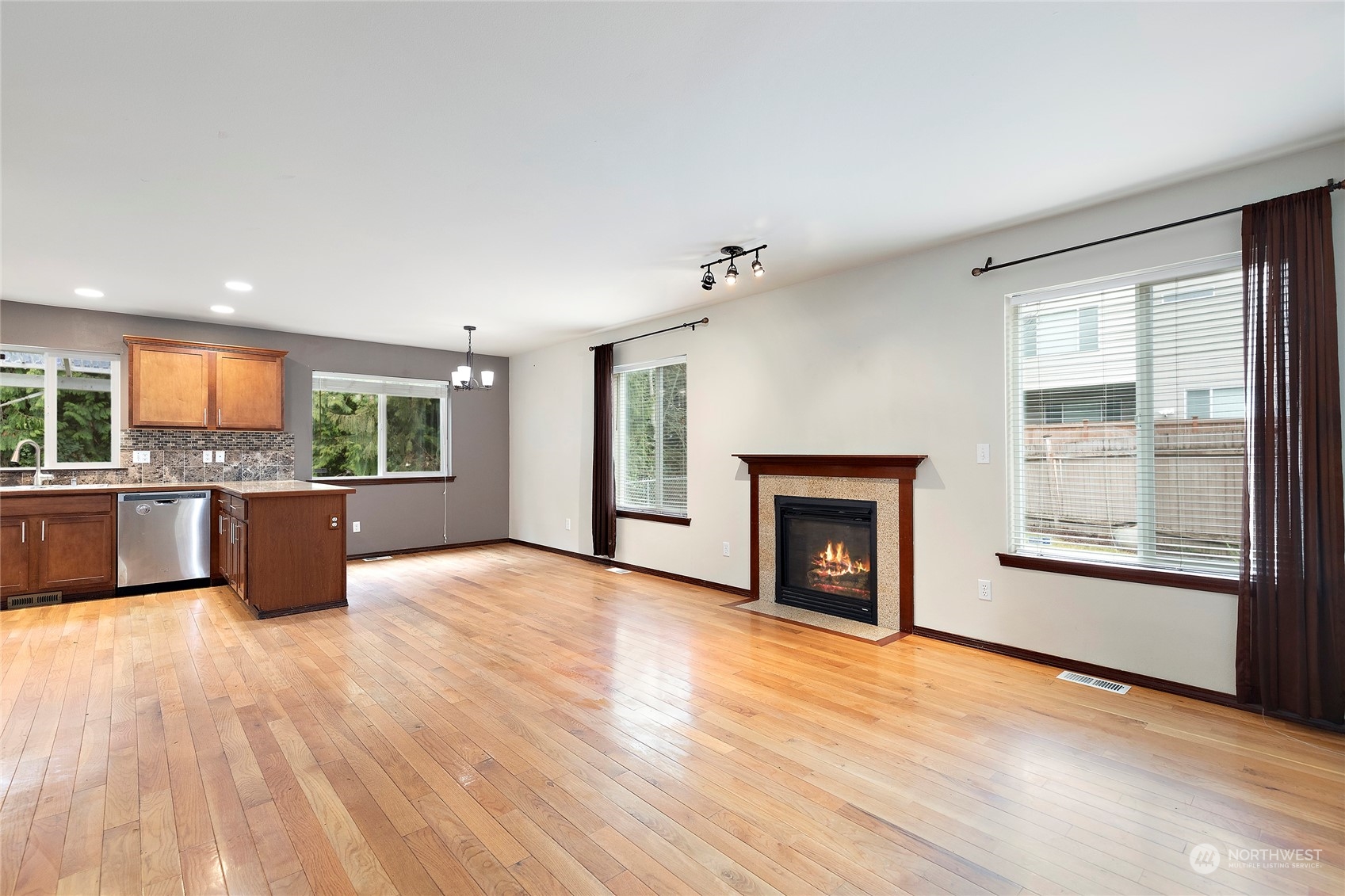 Welcome to Ashley Place! This 3 bedroom 2.5 bath home is the best lot in the complex located on the green belt. Private and spacious with REAL hardwood floors, this home includes an open kitchen with gorgeous maple cabinets, granite countertops, titled backsplash, SS appliances, casual and formal dining areas. The great room is spacious and features a cozy fireplace and adjacent powder room. Primary en-suite includes a private bath and walk-in closet. Upstairs boasts a spacious bonus area and separate "nook" great for an office space or? Enjoy your large coved deck, great for those summertime BBQs and large fenced rear yard. Convenient location, close to Boeing, shopping, dining and EZ freeway access!