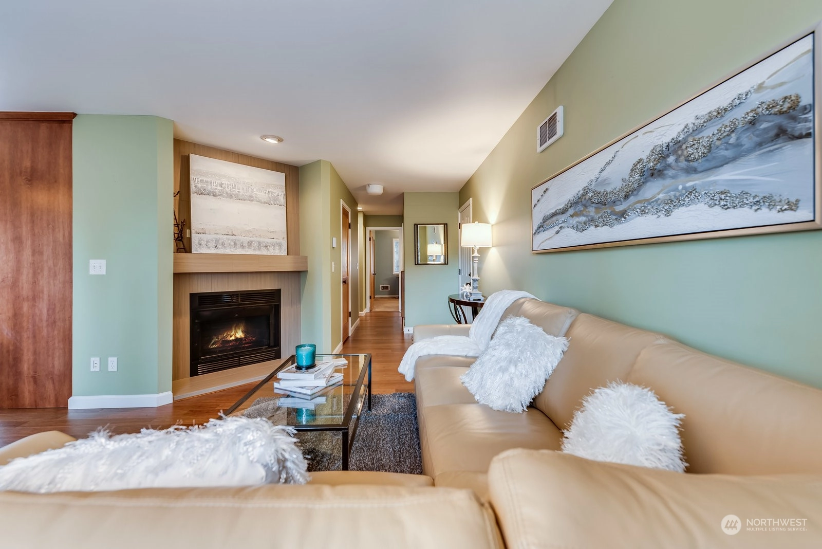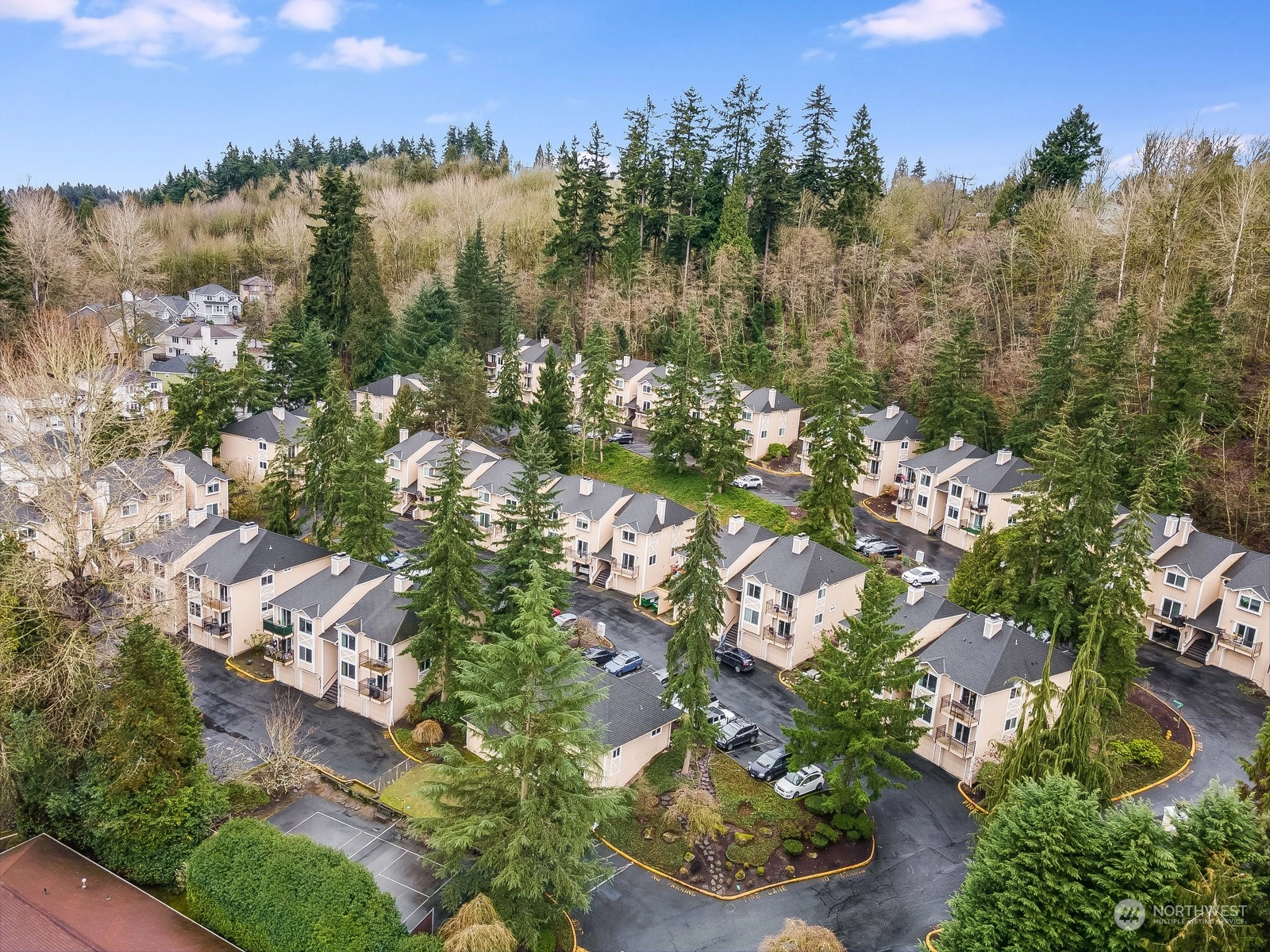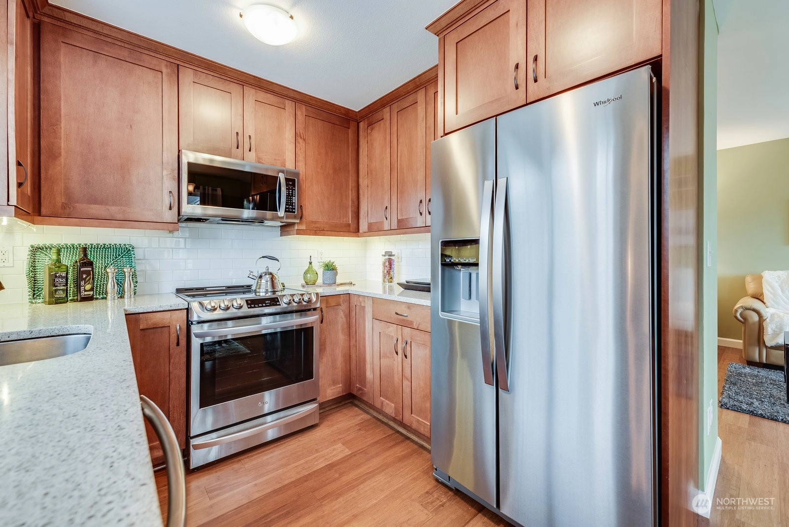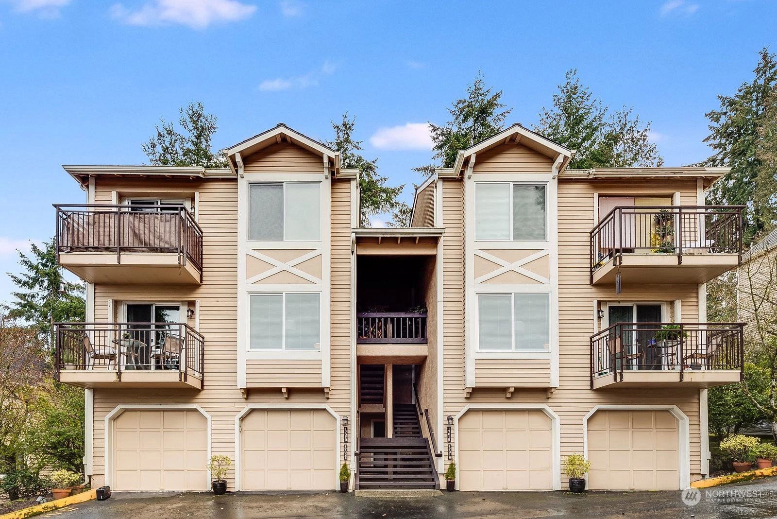 Tastefully updated and beautifully maintained end unit condo with valley views from main room and deck. Open floor plan with hardwoods throughout. New kitchen appliance's featured in this great working kitchen. Designer painted walls and newly tiled fire place all add up to make this 2 Bed, 2 full bath 934 SF unit as comfortable and stylish as a discerning buyer requires with two closets in master suite. Nice size laundry with large W/D included. Fantastic one car garage with private storage and an extra assigned parking space. A+ location by Burke Gillman Trails, easy access to 405 and a great walkability to downtown Woodinville. Terrific community with club house, tennis/pickle ball court and gardens. Pets Allowed!!!
