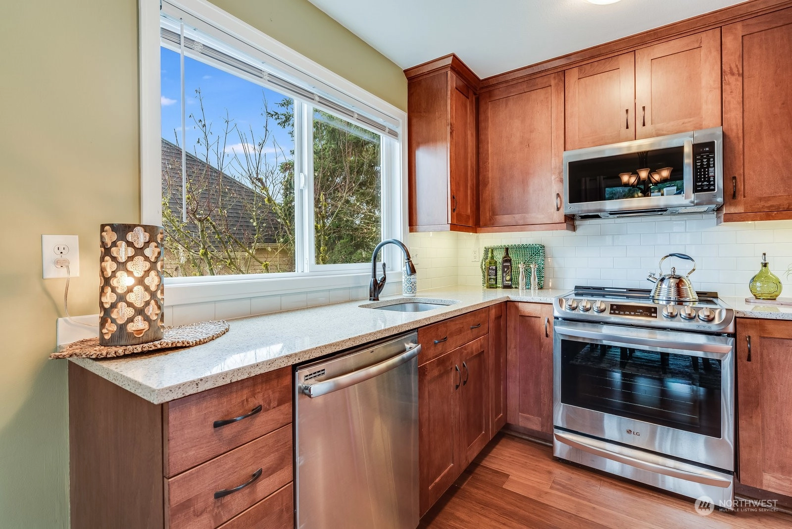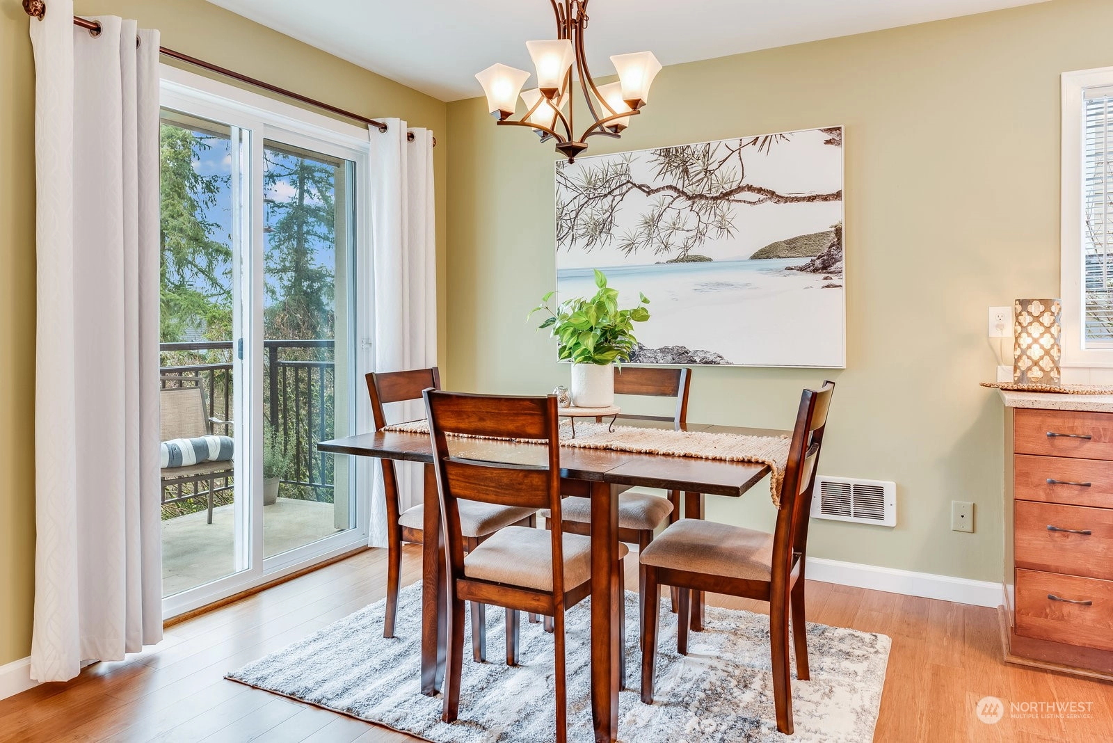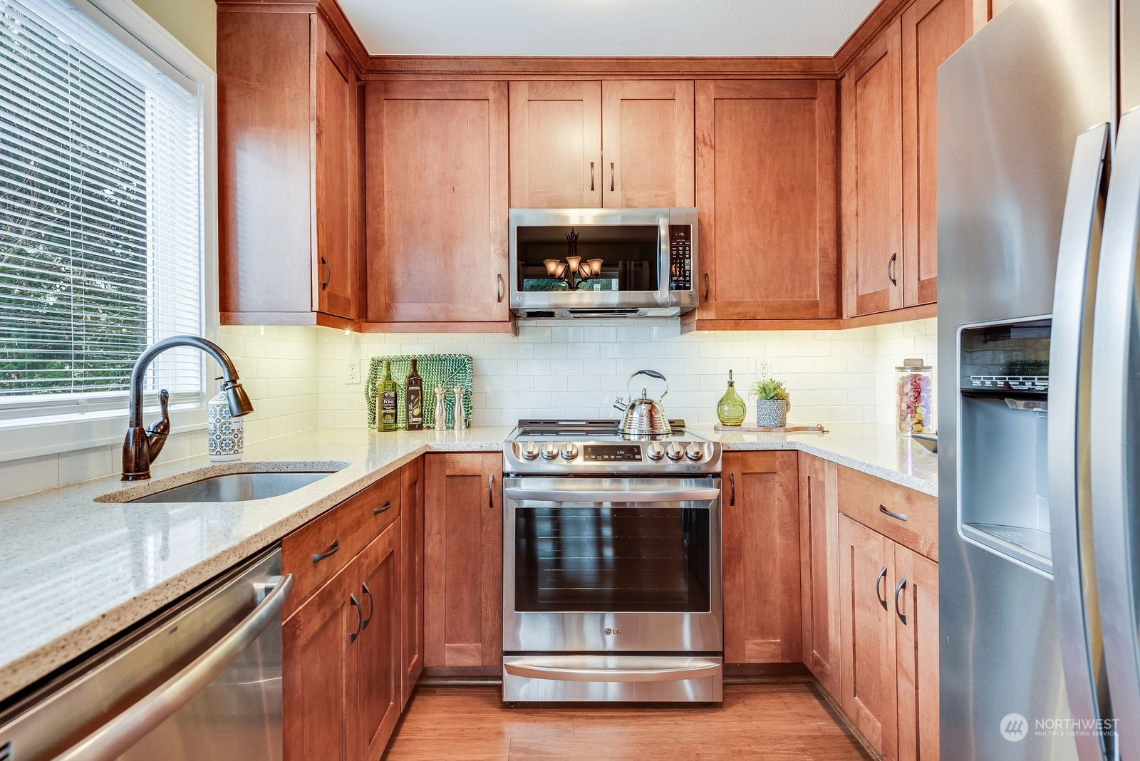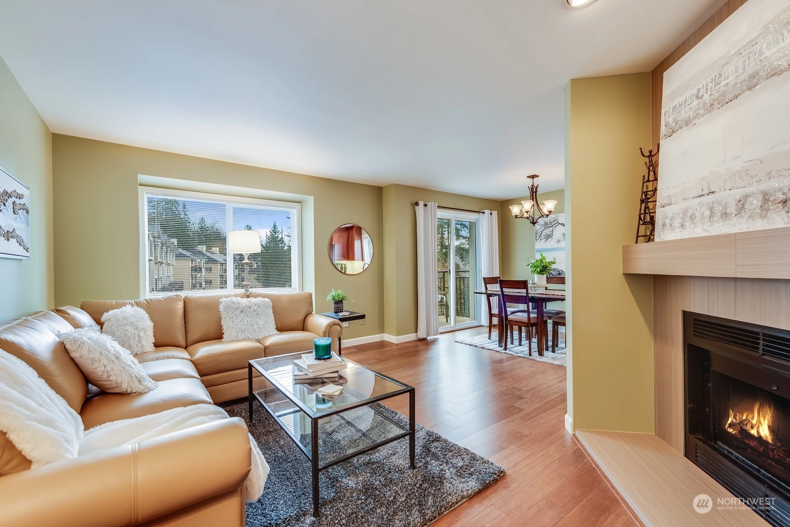 Tastefully updated and beautifully maintained end unit condo with valley views from main room and deck. Open floor plan with hardwoods throughout. New kitchen appliance's featured in this great working kitchen. Designer painted walls and newly tiled fire place all add up to make this 2 Bed, 2 full bath 934 SF unit as comfortable and stylish as a discerning buyer requires with two closets in master suite. Nice size laundry with large W/D included. Fantastic one car garage with private storage and an extra assigned parking space. A+ location by Burke Gillman Trails, easy access to 405 and a great walkability to downtown Woodinville. Terrific community with club house, tennis/pickle ball court and gardens. Pets Allowed!!!
