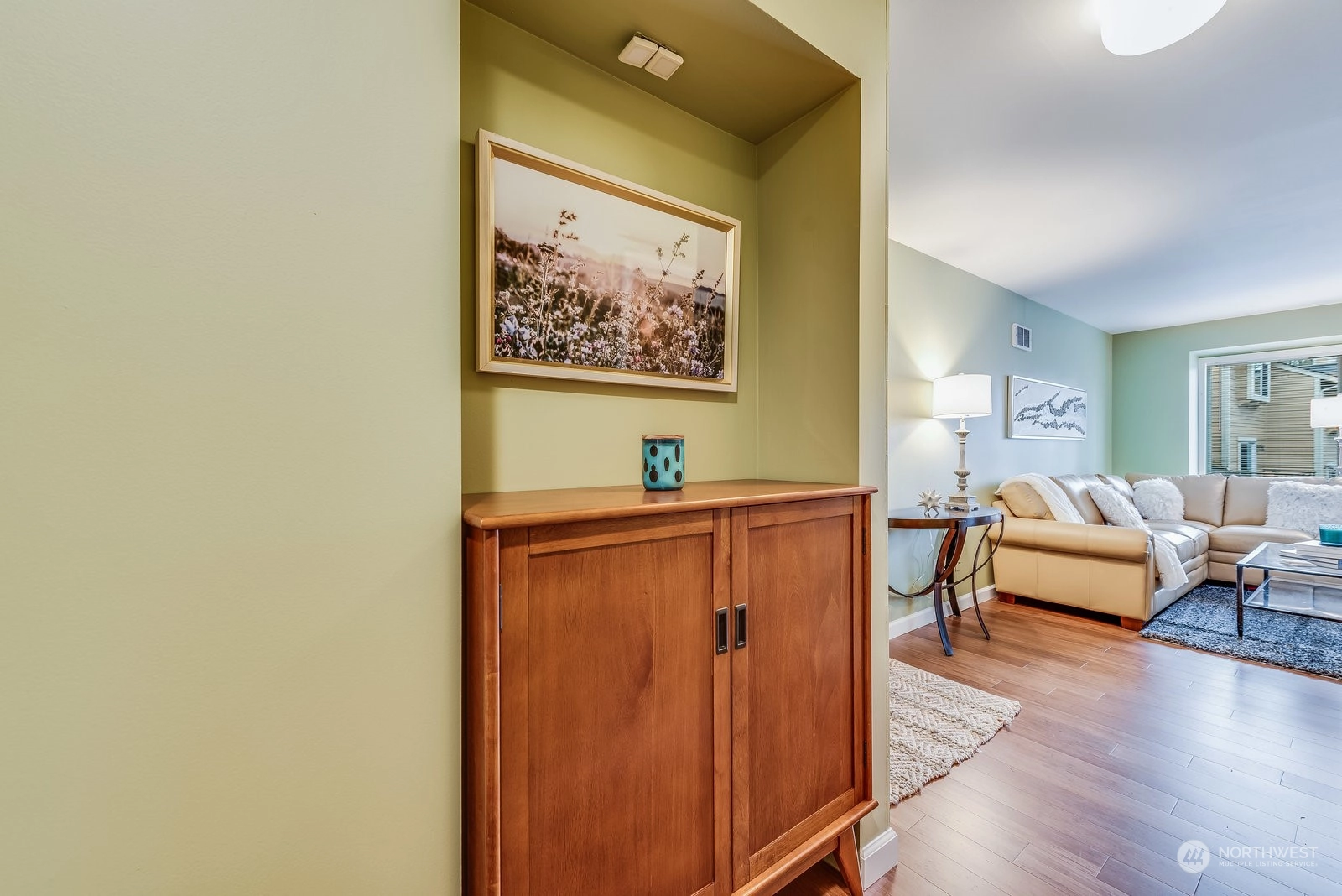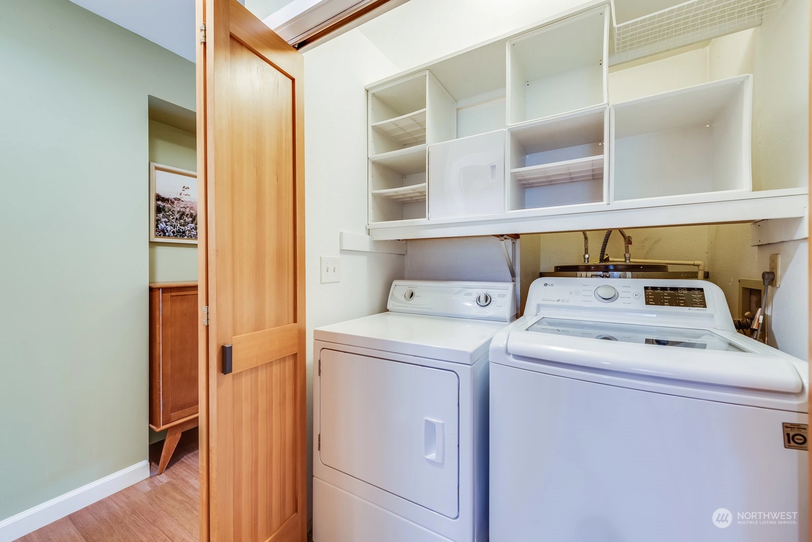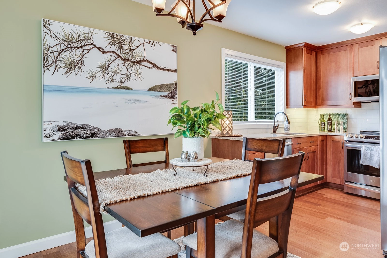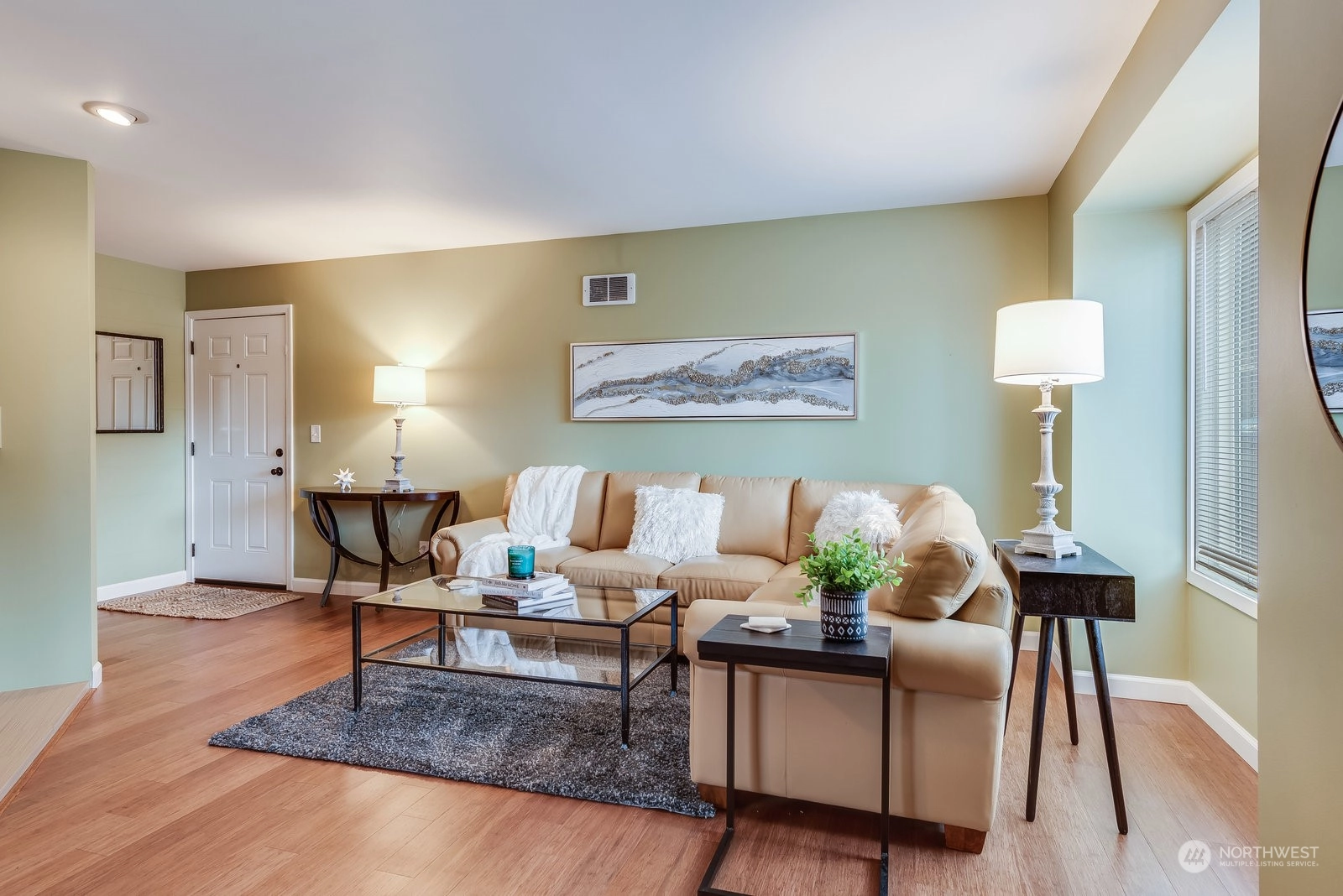 Tastefully updated and beautifully maintained end unit condo with valley views from main room and deck. Open floor plan with hardwoods throughout. New kitchen appliance's featured in this great working kitchen. Designer painted walls and newly tiled fire place all add up to make this 2 Bed, 2 full bath 934 SF unit as comfortable and stylish as a discerning buyer requires with two closets in master suite. Nice size laundry with large W/D included. Fantastic one car garage with private storage and an extra assigned parking space. A+ location by Burke Gillman Trails, easy access to 405 and a great walkability to downtown Woodinville. Terrific community with club house, tennis/pickle ball court and gardens. Pets Allowed!!!