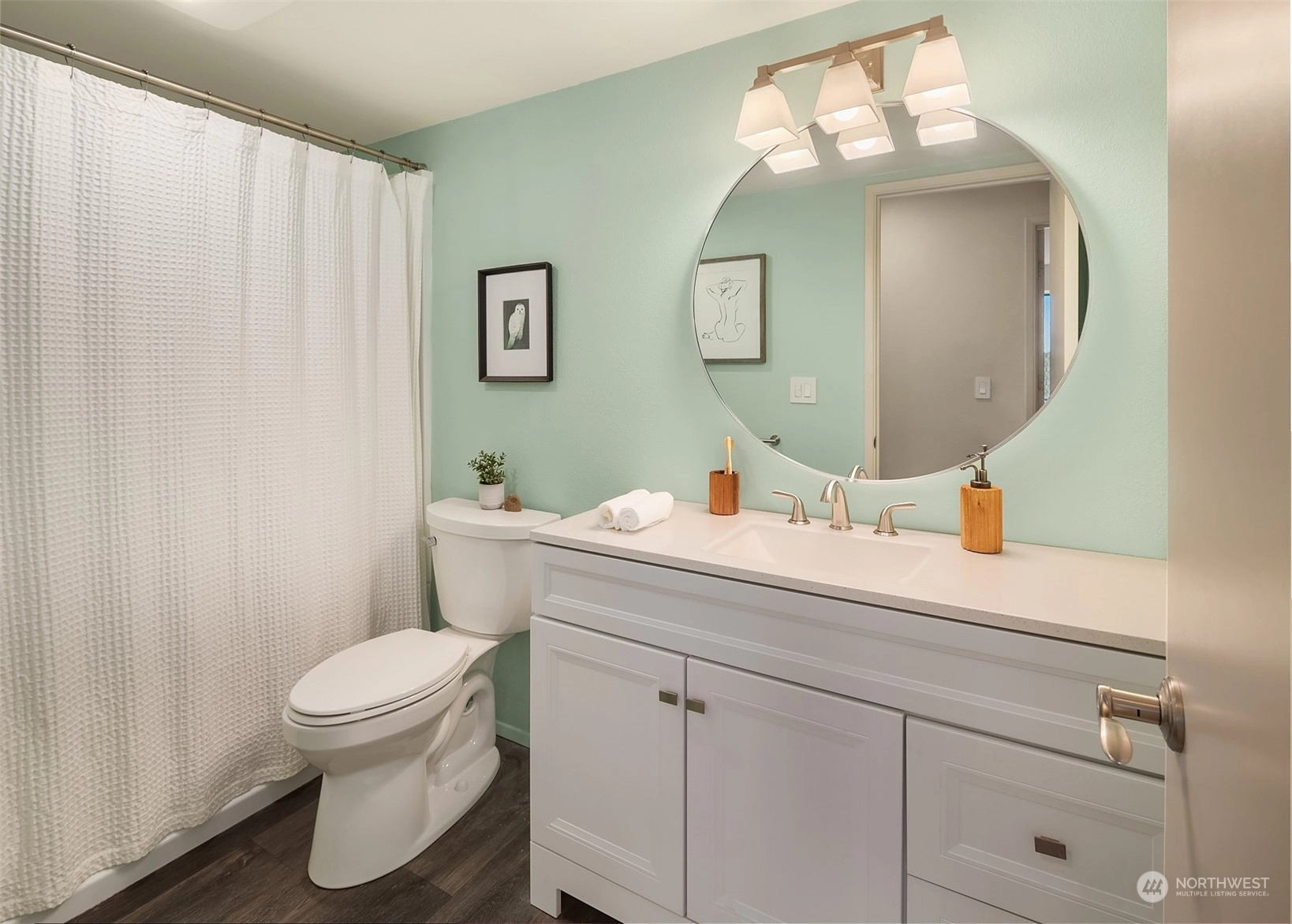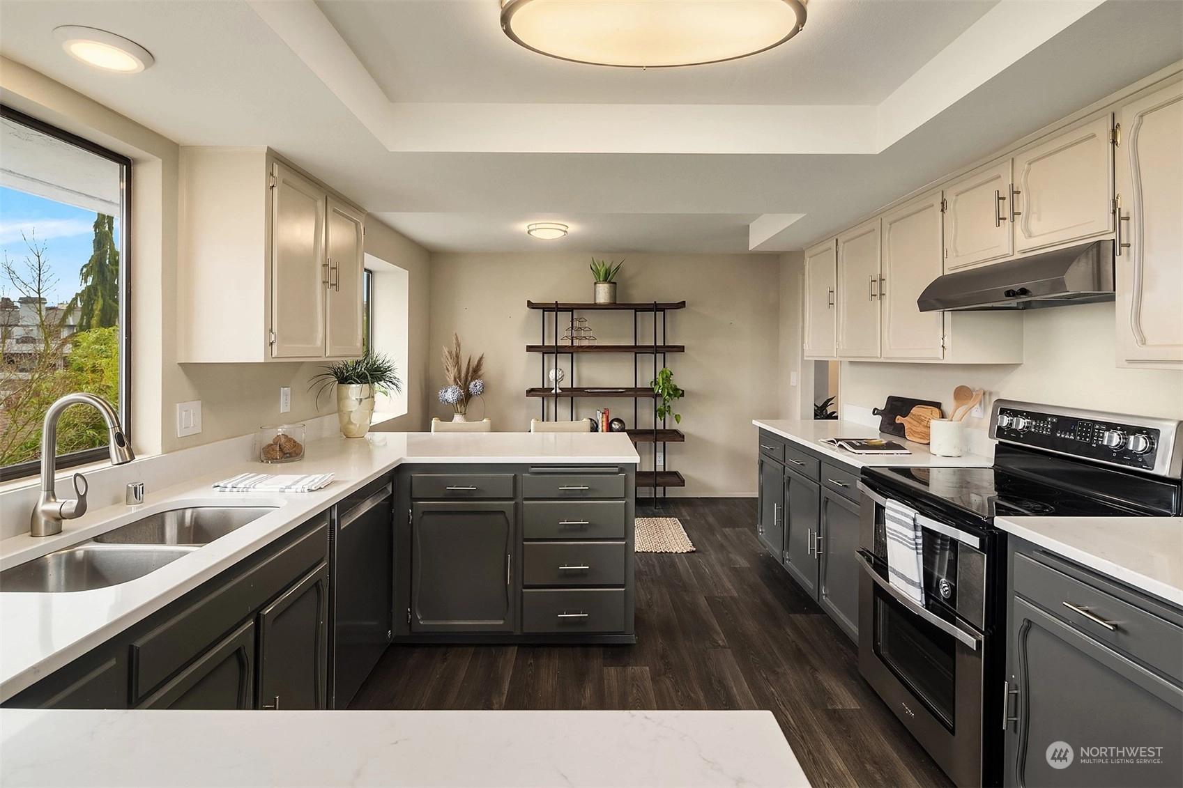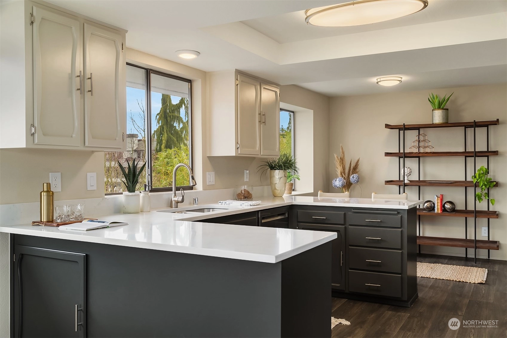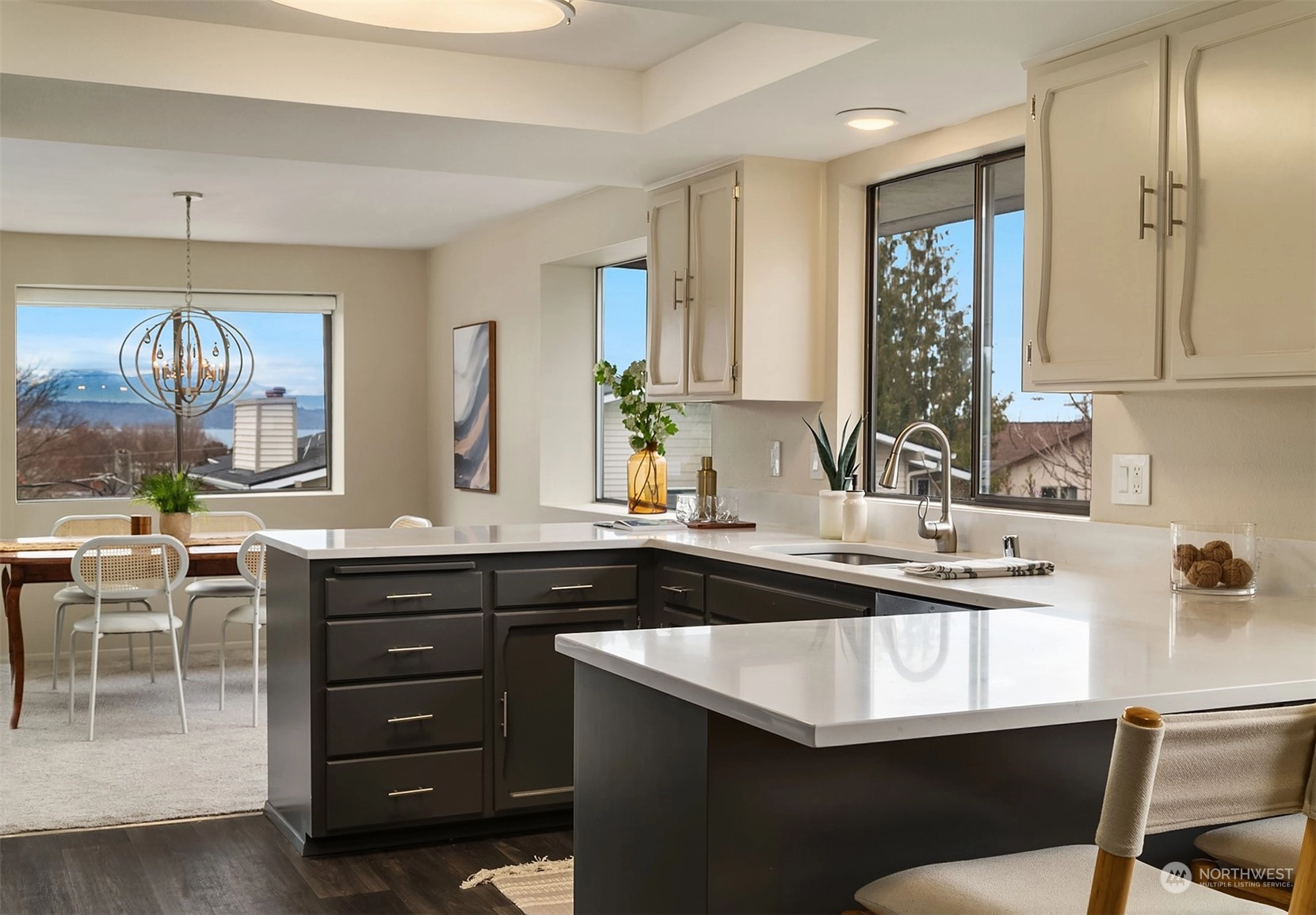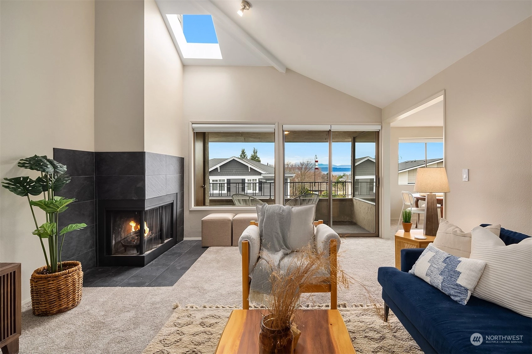 Welcome to the West Wind. In the heart of downtown Edmonds you'll love this spacious two-bedroom view condominium. Light and bright throughout and updated. Remodeled kitchen with quartz countertops, range & ovens, new dishwasher and more. Remodeled bathrooms and new flooring throughout. Huge living room with vaulted ceilings, a fireplace and a view deck. Enjoy watching the ferries cross as well the beautiful sunsets. There's plenty of storage, a one-car garage and a 2nd assigned parking spot. True Downtown living, just a minutes walk to coffee, shops, dining, the sounder trains and the Edmonds waterfront.