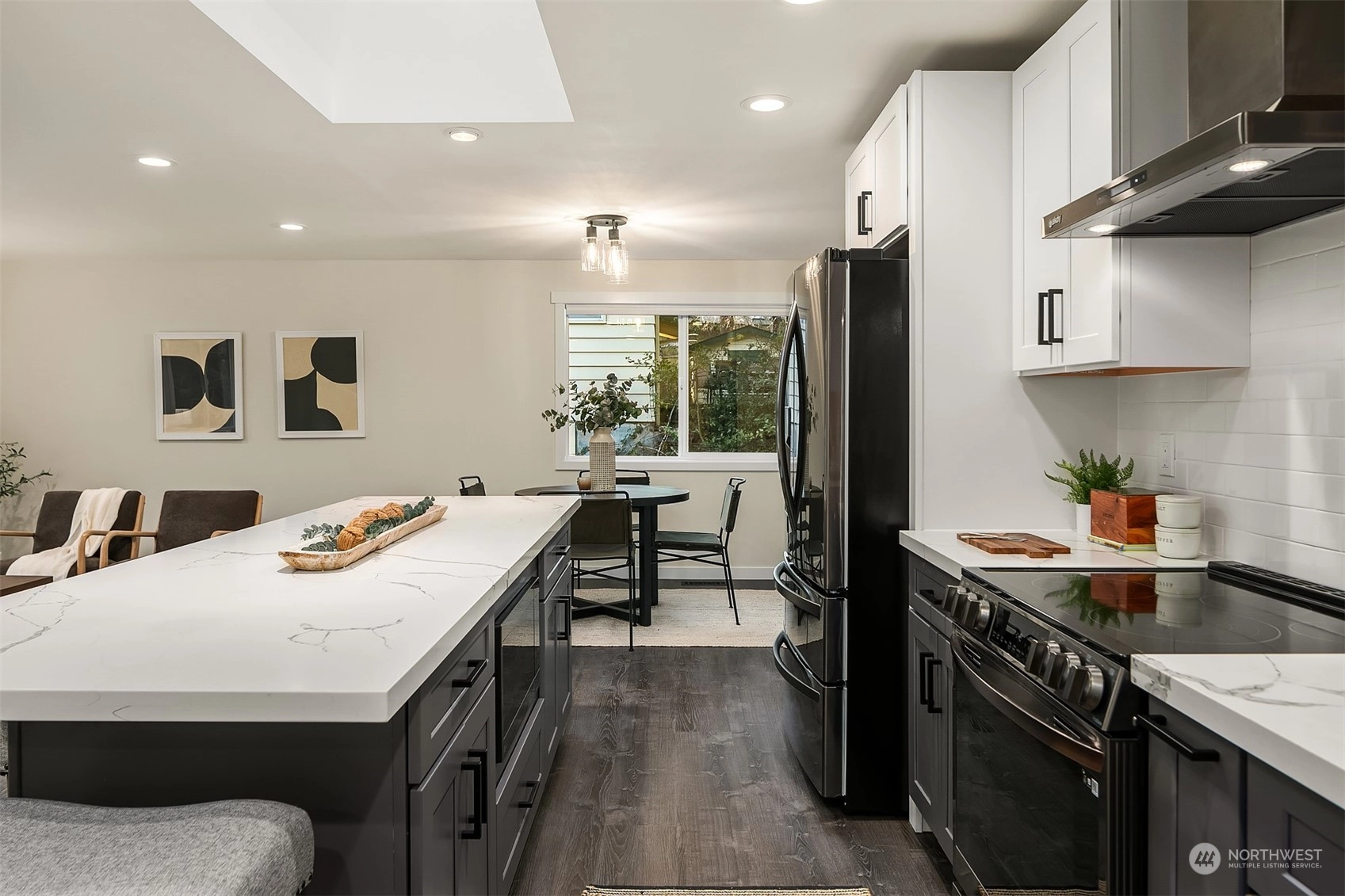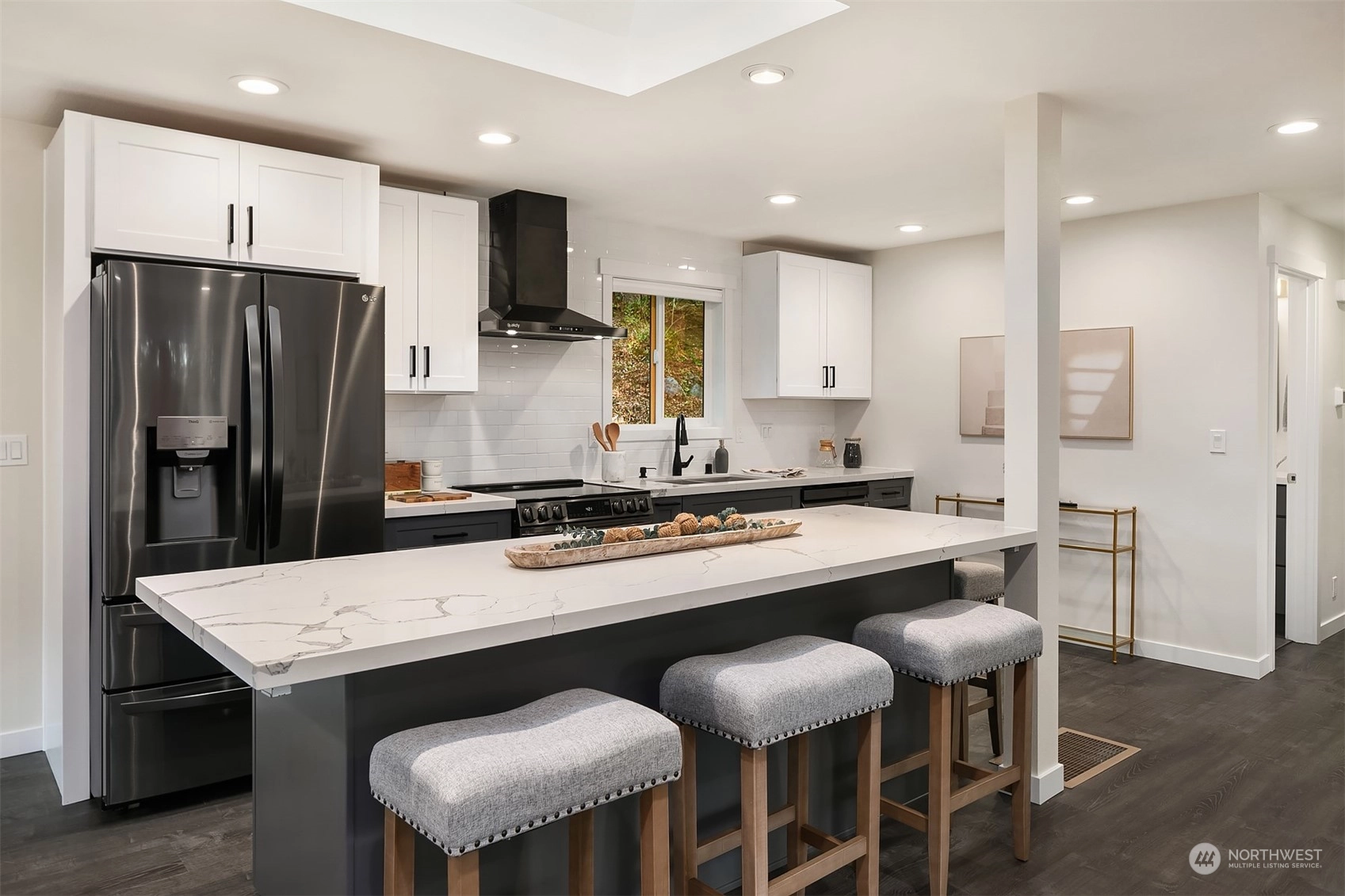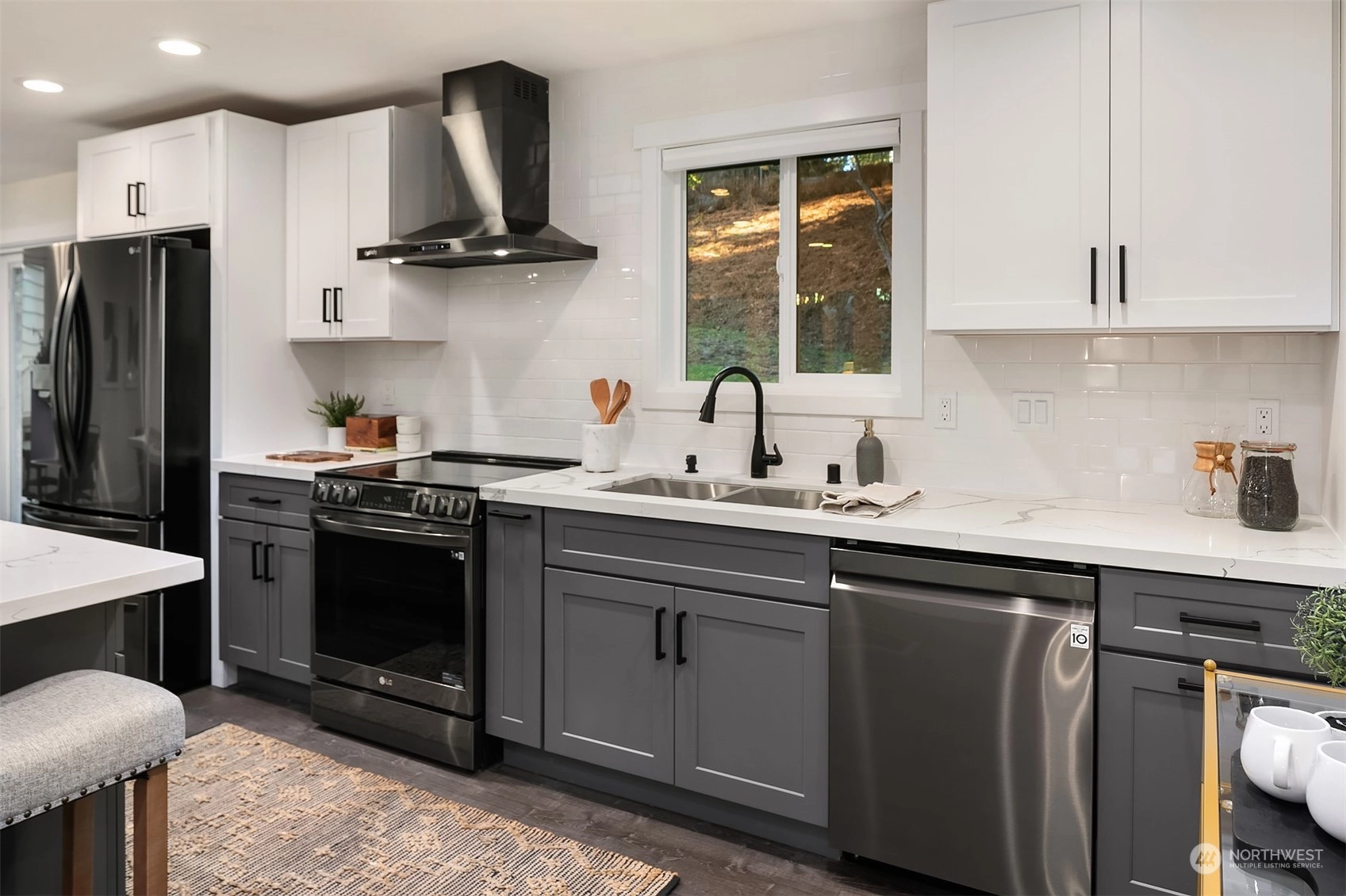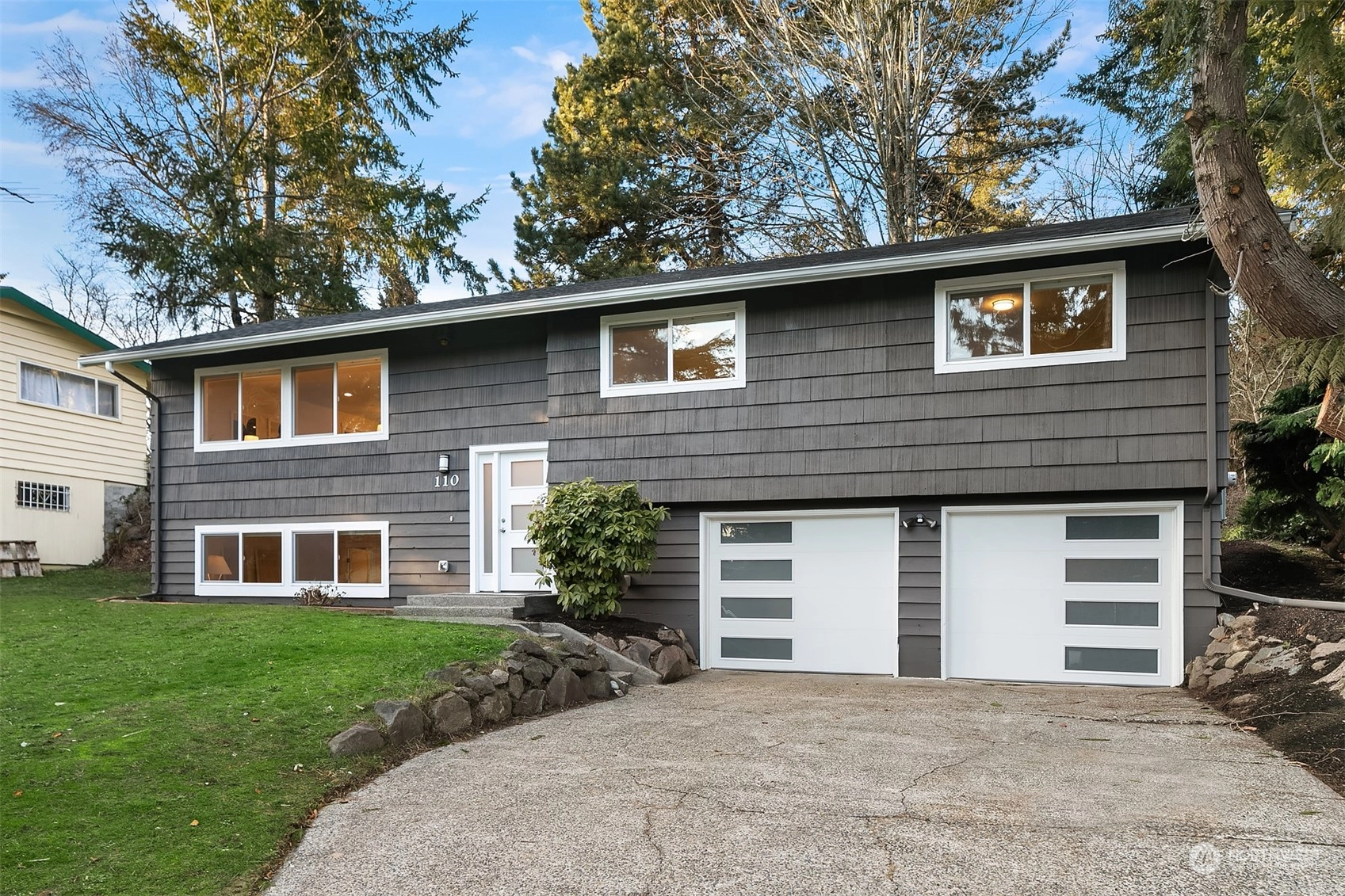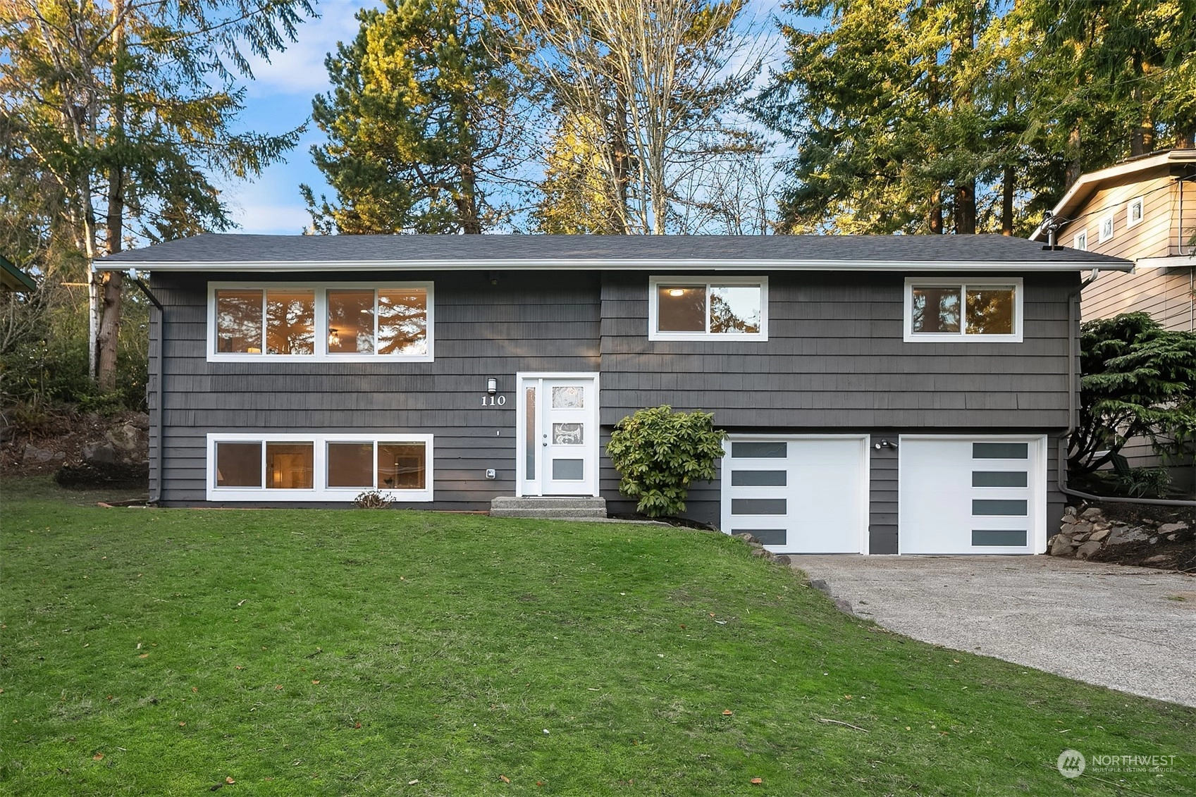 Perfect for modern entertaining, this 4-bed Hillwood home is significantly updated w/ stylish finishes! NEW roof, electrical, doors, fixtures, & flooring throughout. Inviting, light-filled spaces. All-NEW kitchen features dual white and gray custom cabinetry, quartz countertops, subway tile, & smart gunmetal appl. Incredible custom island anchors the open-concept main. Vaulted skylight adds a hint of drama. Dining opens to spacious NEW deck, enjoy summer BBQs! Lower level rec room a terrific hang-out space. Set back on a cul-de-sac & nearly ¼ acre lot, there is plenty of privacy, room for gardening, & play. Ample storage. 2-car garage w/ NEW garage doors & tons of driveway parking. Moments to Kings Schools, Einstein Middle, & the beach!
