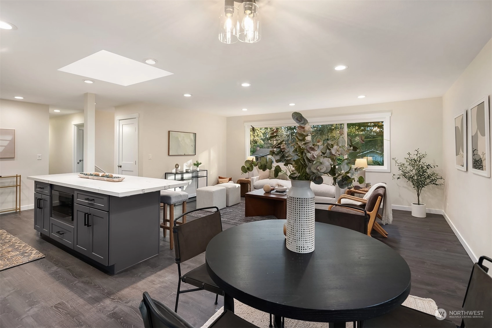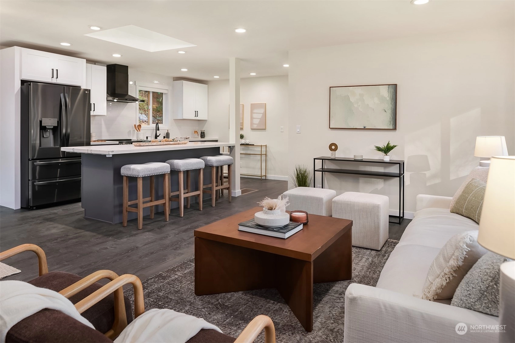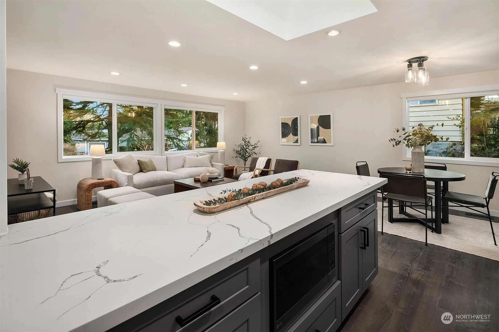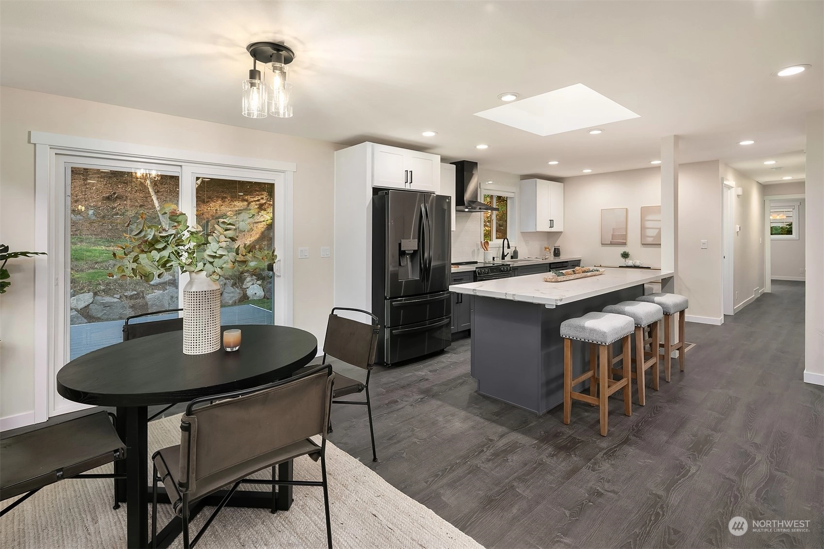 Perfect for modern entertaining, this 4-bed Hillwood home is significantly updated w/ stylish finishes! NEW roof, electrical, doors, fixtures, & flooring throughout. Inviting, light-filled spaces. All-NEW kitchen features dual white and gray custom cabinetry, quartz countertops, subway tile, & smart gunmetal appl. Incredible custom island anchors the open-concept main. Vaulted skylight adds a hint of drama. Dining opens to spacious NEW deck, enjoy summer BBQs! Lower level rec room a terrific hang-out space. Set back on a cul-de-sac & nearly ¼ acre lot, there is plenty of privacy, room for gardening, & play. Ample storage. 2-car garage w/ NEW garage doors & tons of driveway parking. Moments to Kings Schools, Einstein Middle, & the beach!
