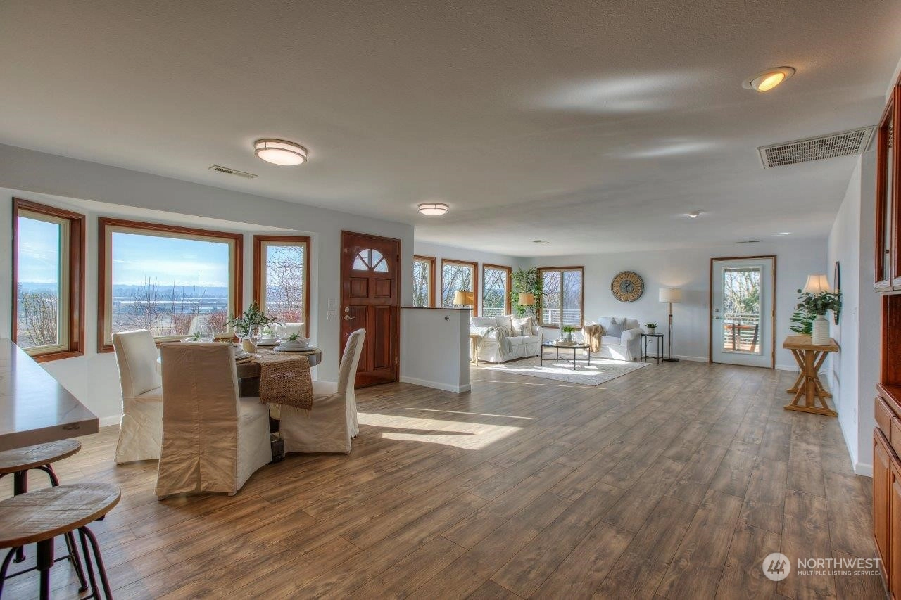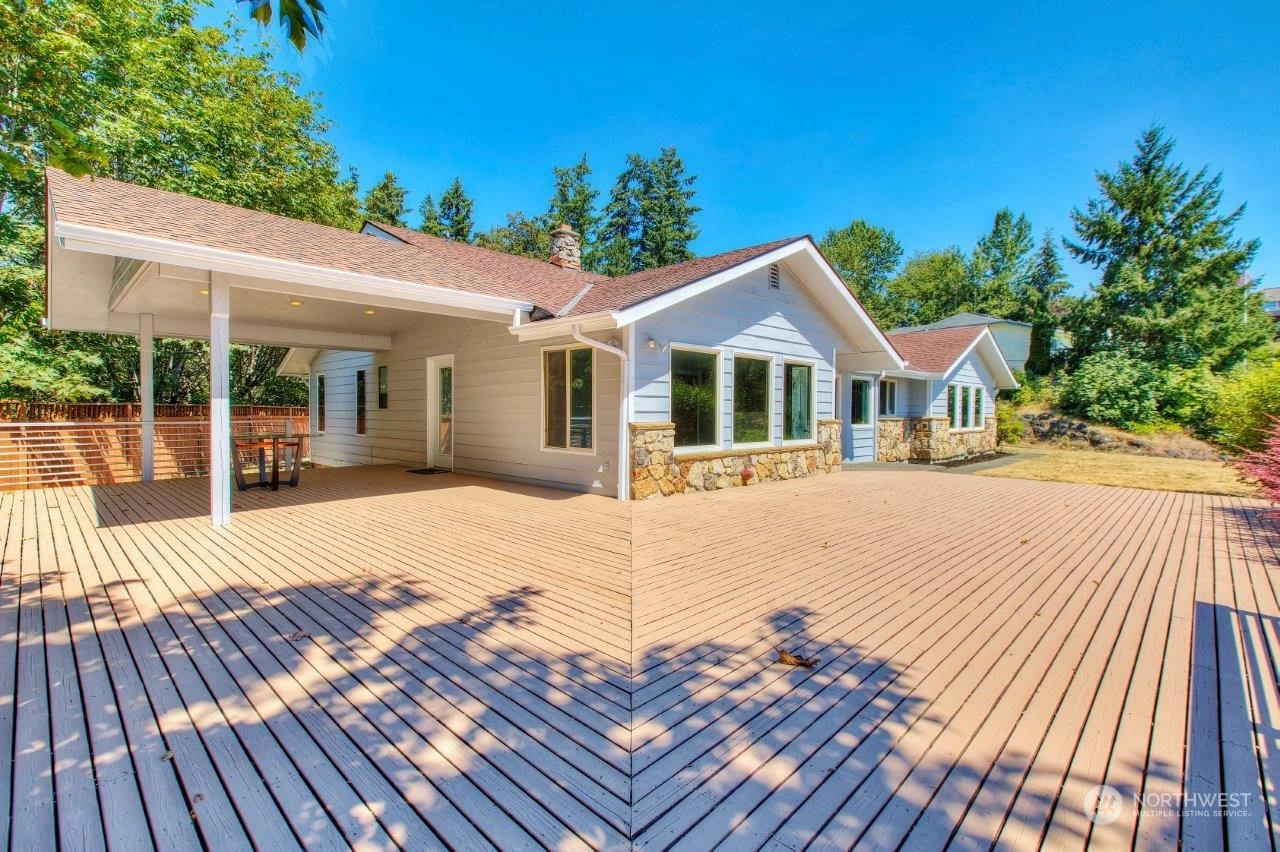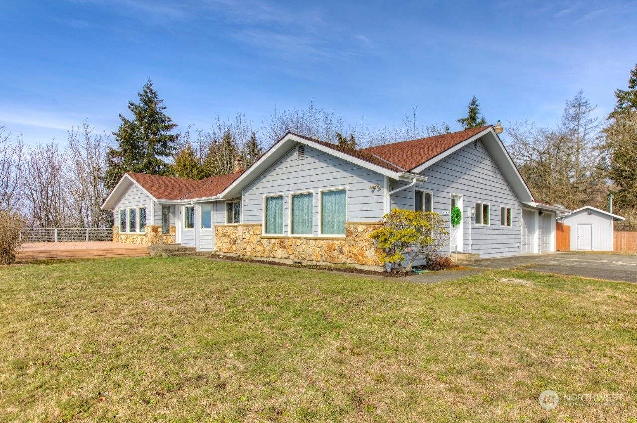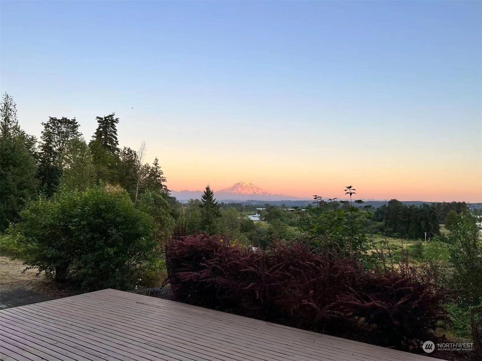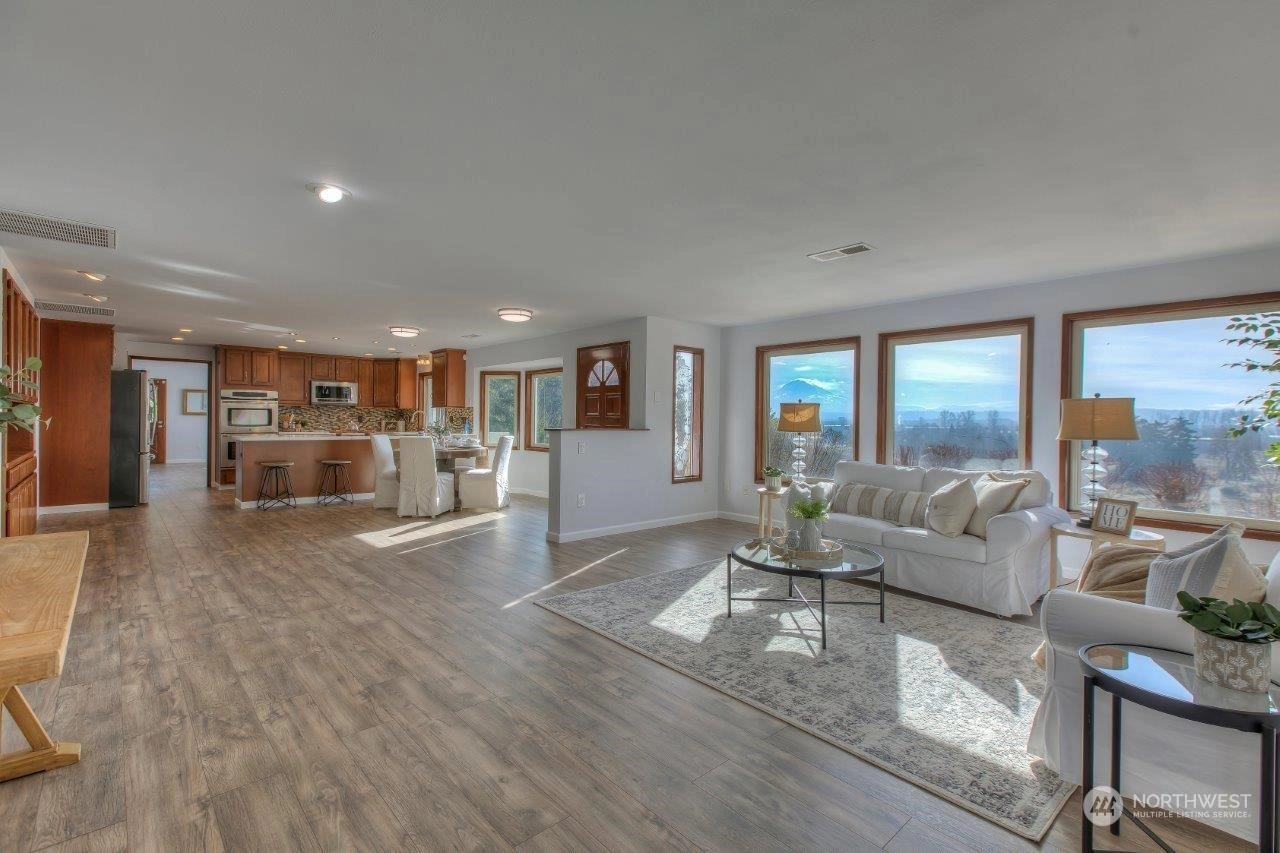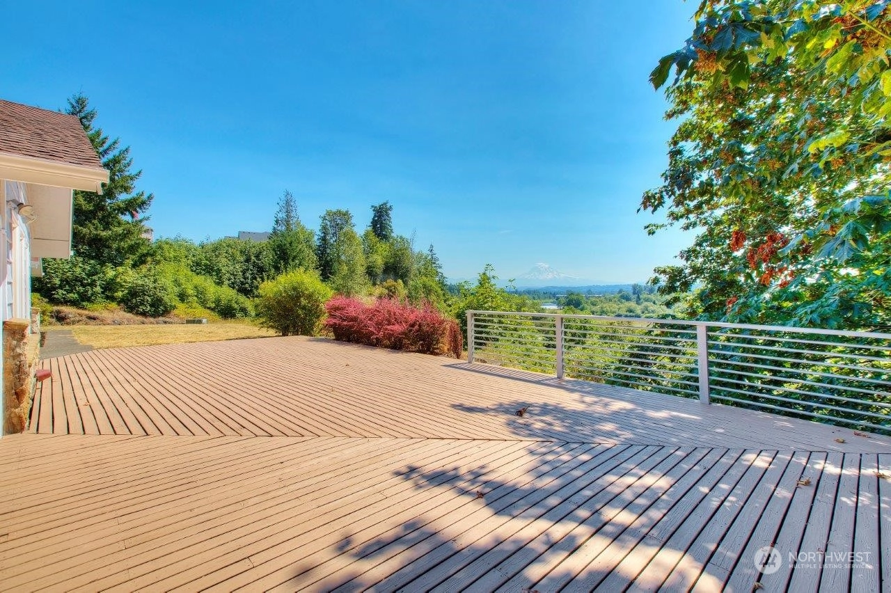 Spectacular views! Mt Rainer & Puyallup valley are stunning from all windows on the front of the home. Enjoy BBQs on the 1300 sq ft deck, perfect for entertaining. The kitchen is open to the dining & living rooms. All stainless appliances stay. 3 beds, 1.75 baths & den. Newer roof, fresh new paint inside and out. New wood flooring, new kitchen counter top. A/C, fenced back yard, large shed, shared well located on property, RV parking with electrical hook-up & over 3 acres. Don't miss this one!