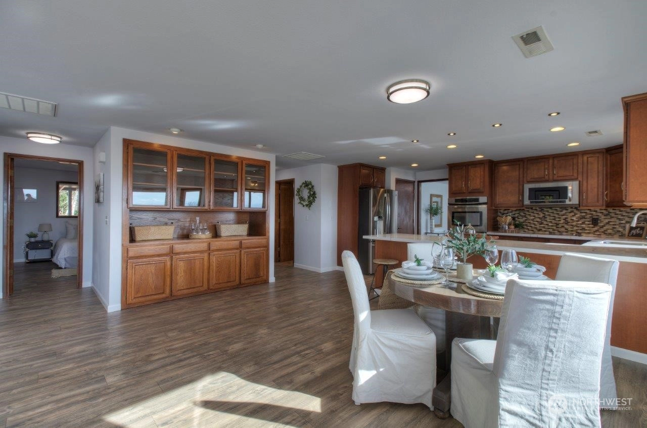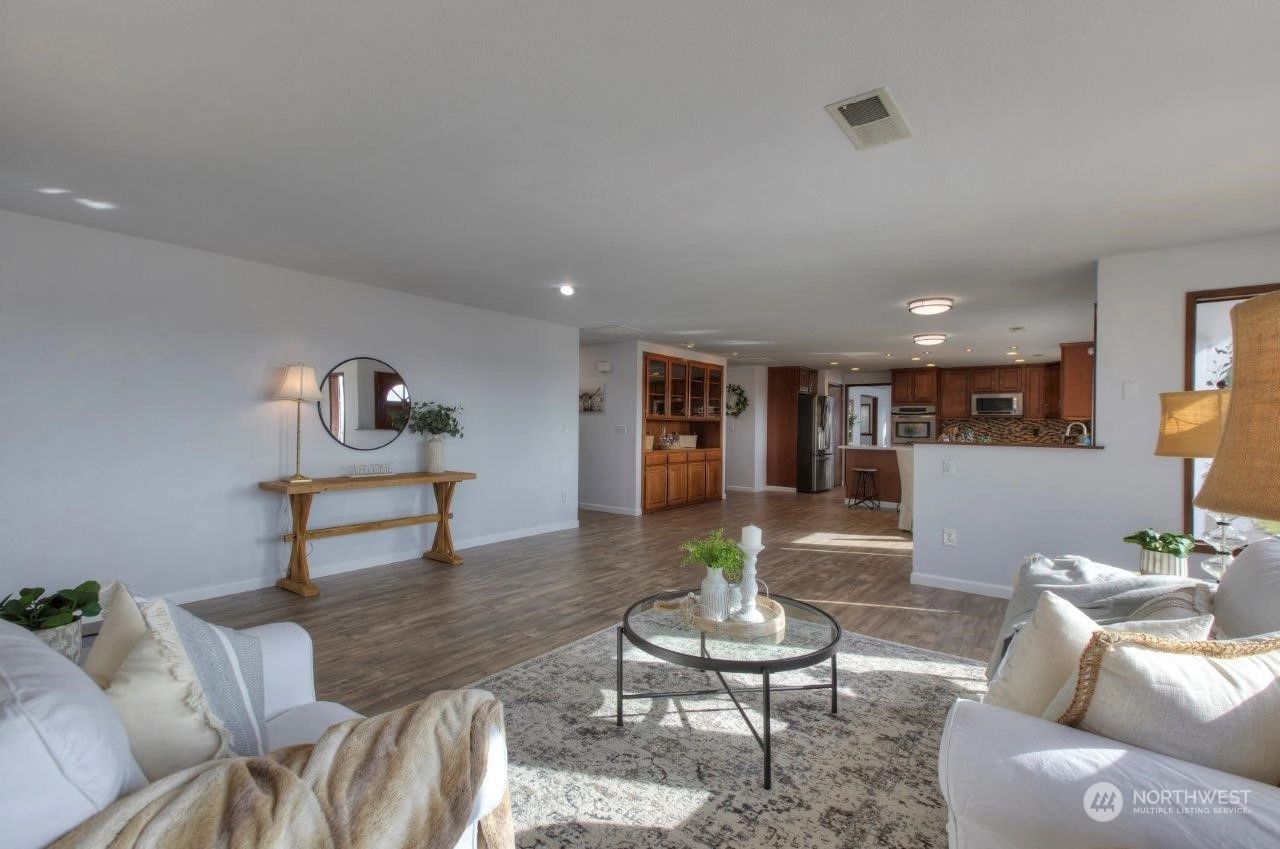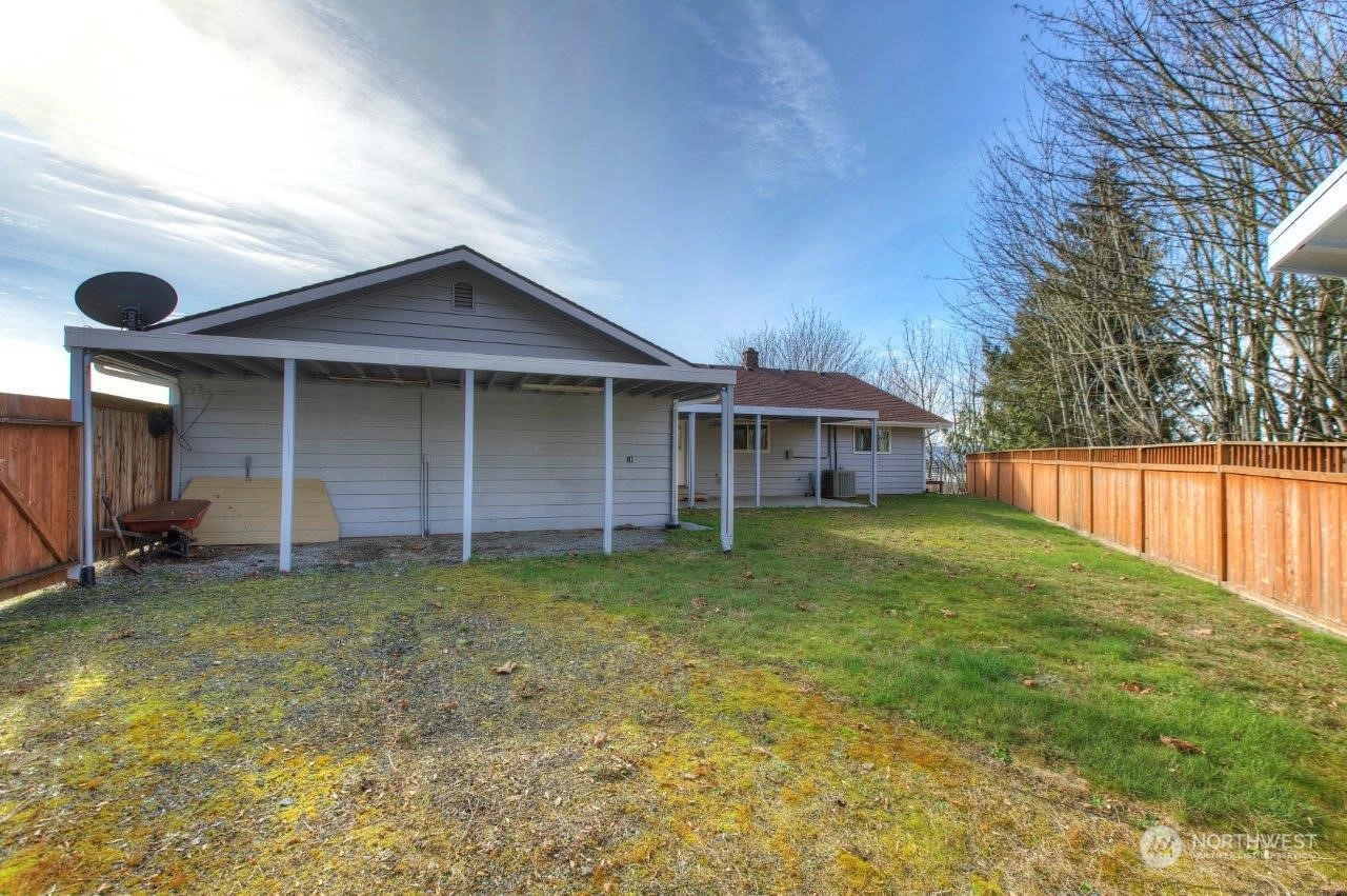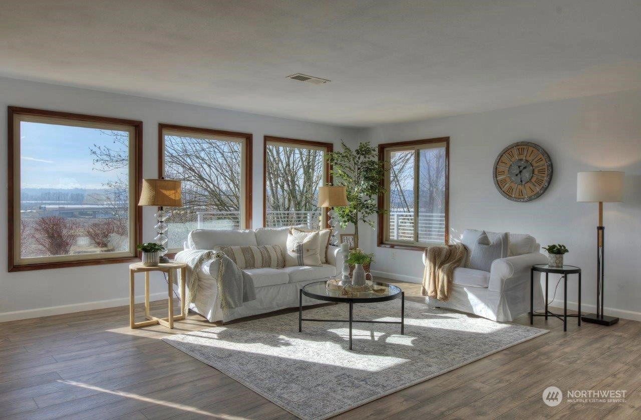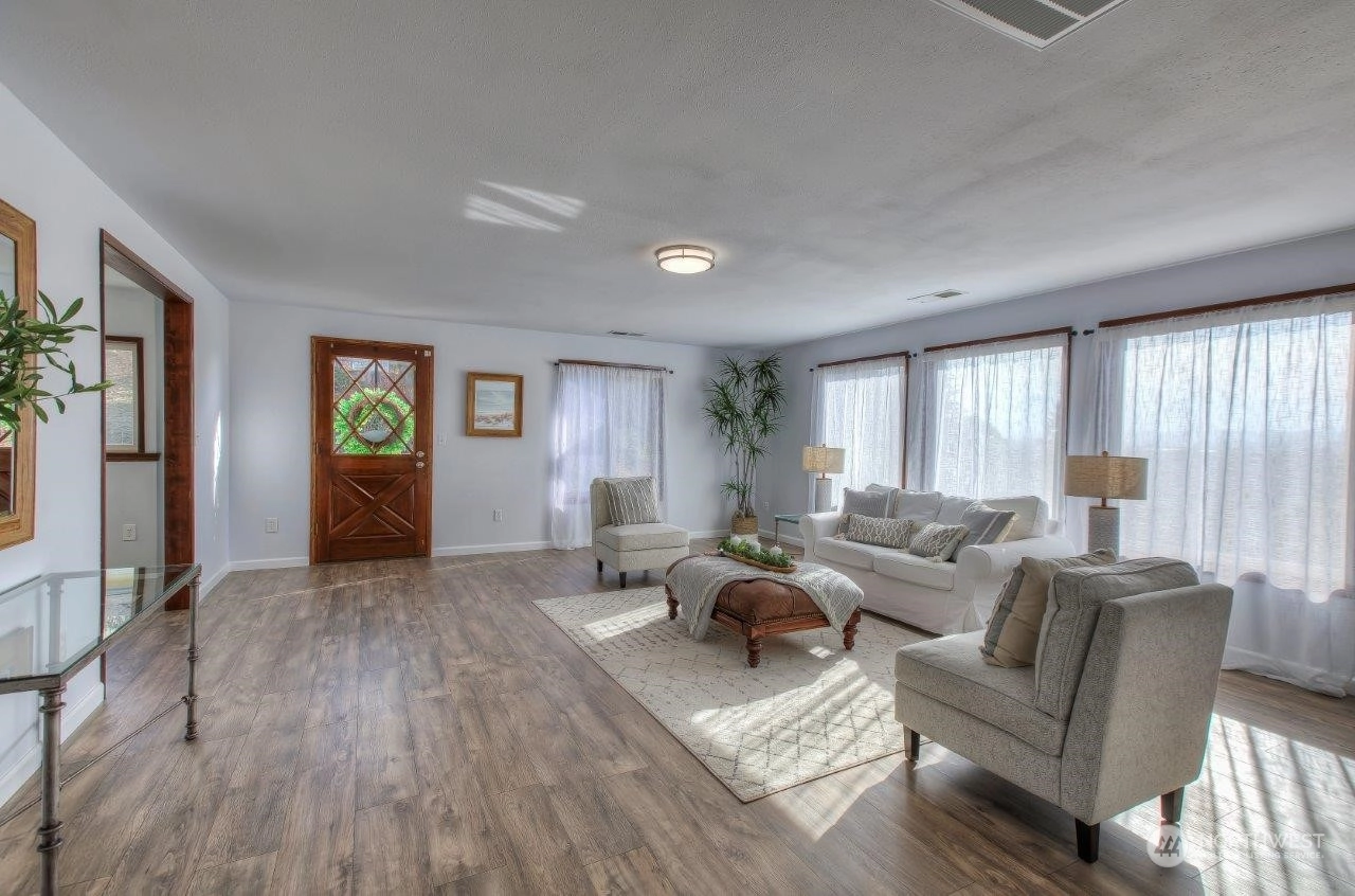 Spectacular views! Mt Rainer & Puyallup valley are stunning from all windows on the front of the home. Enjoy BBQs on the 1300 sq ft deck, perfect for entertaining. The kitchen is open to the dining & living rooms. All stainless appliances stay. 3 beds, 1.75 baths & den. Newer roof, fresh new paint inside and out. New wood flooring, new kitchen counter top. A/C, fenced back yard, large shed, shared well located on property, RV parking with electrical hook-up & over 3 acres. Don't miss this one!