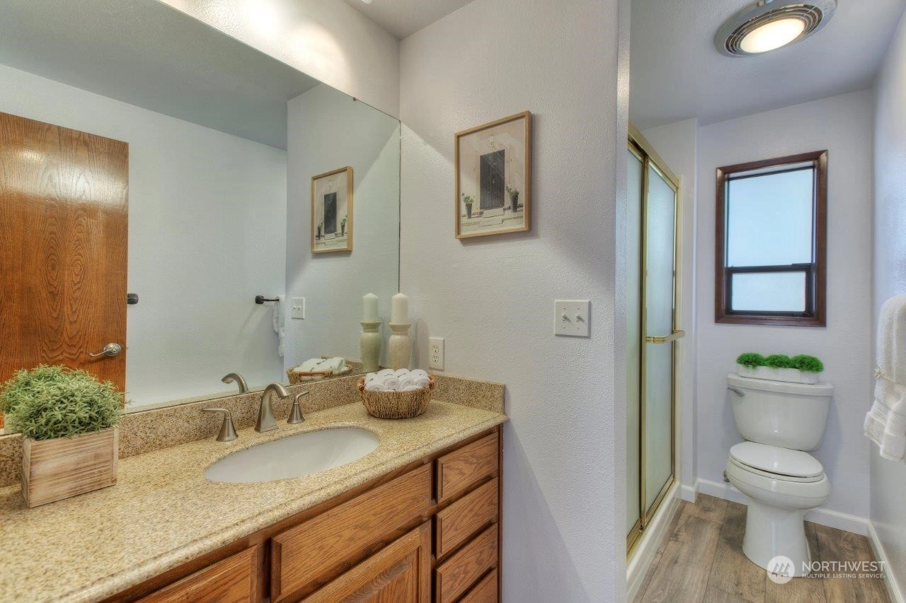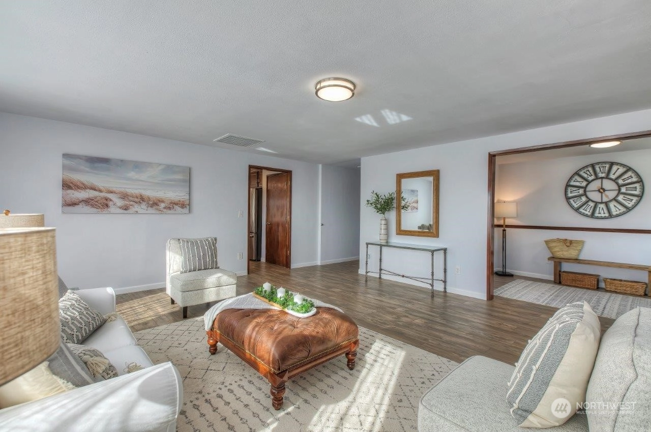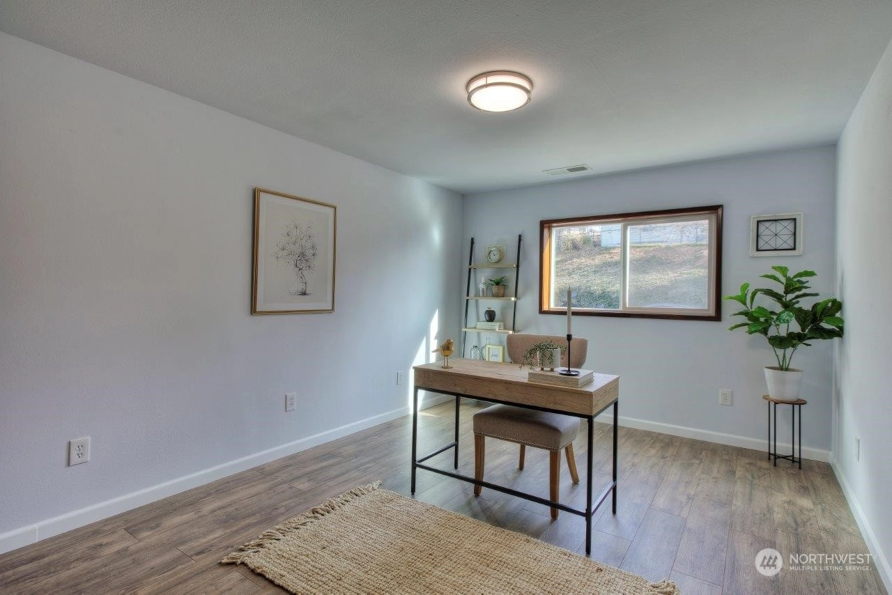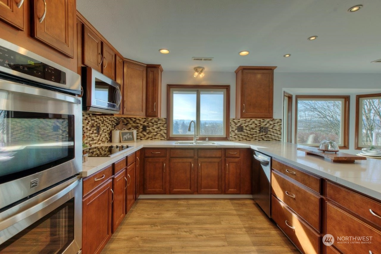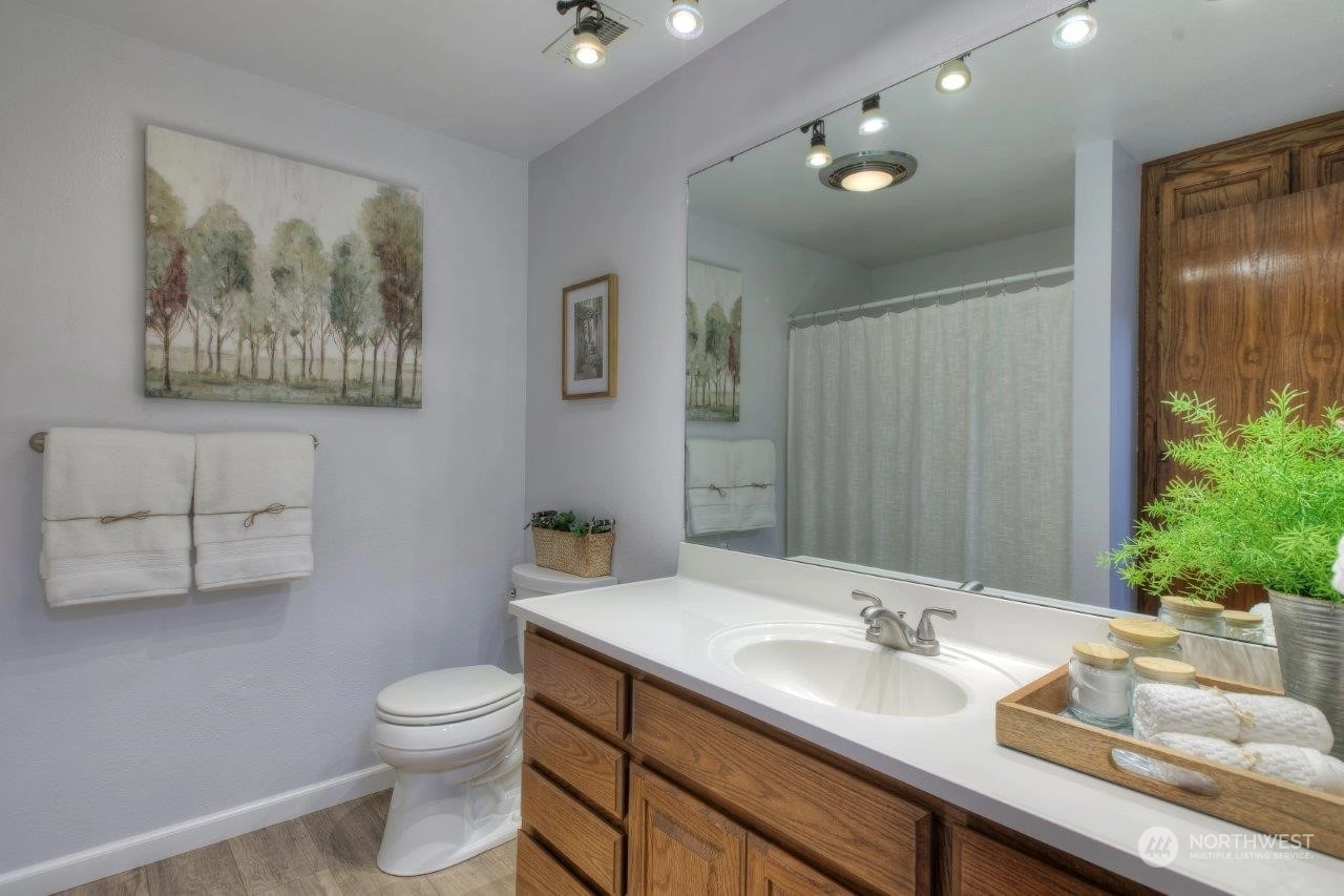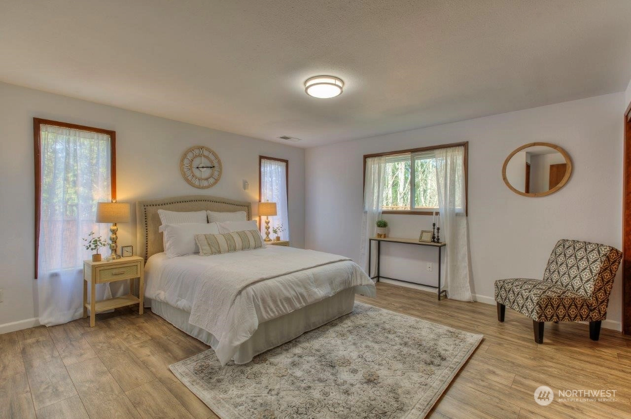 Spectacular views! Mt Rainer & Puyallup valley are stunning from all windows on the front of the home. Enjoy BBQs on the 1300 sq ft deck, perfect for entertaining. The kitchen is open to the dining & living rooms. All stainless appliances stay. 3 beds, 1.75 baths & den. Newer roof, fresh new paint inside and out. New wood flooring, new kitchen counter top. A/C, fenced back yard, large shed, shared well located on property, RV parking with electrical hook-up & over 3 acres. Don't miss this one!