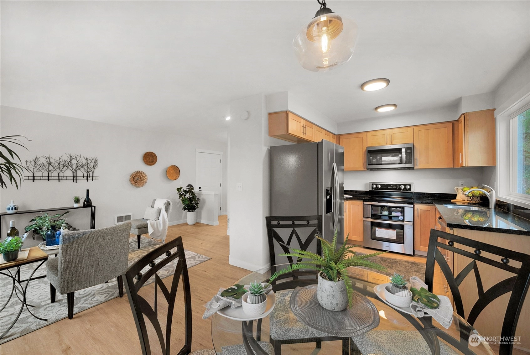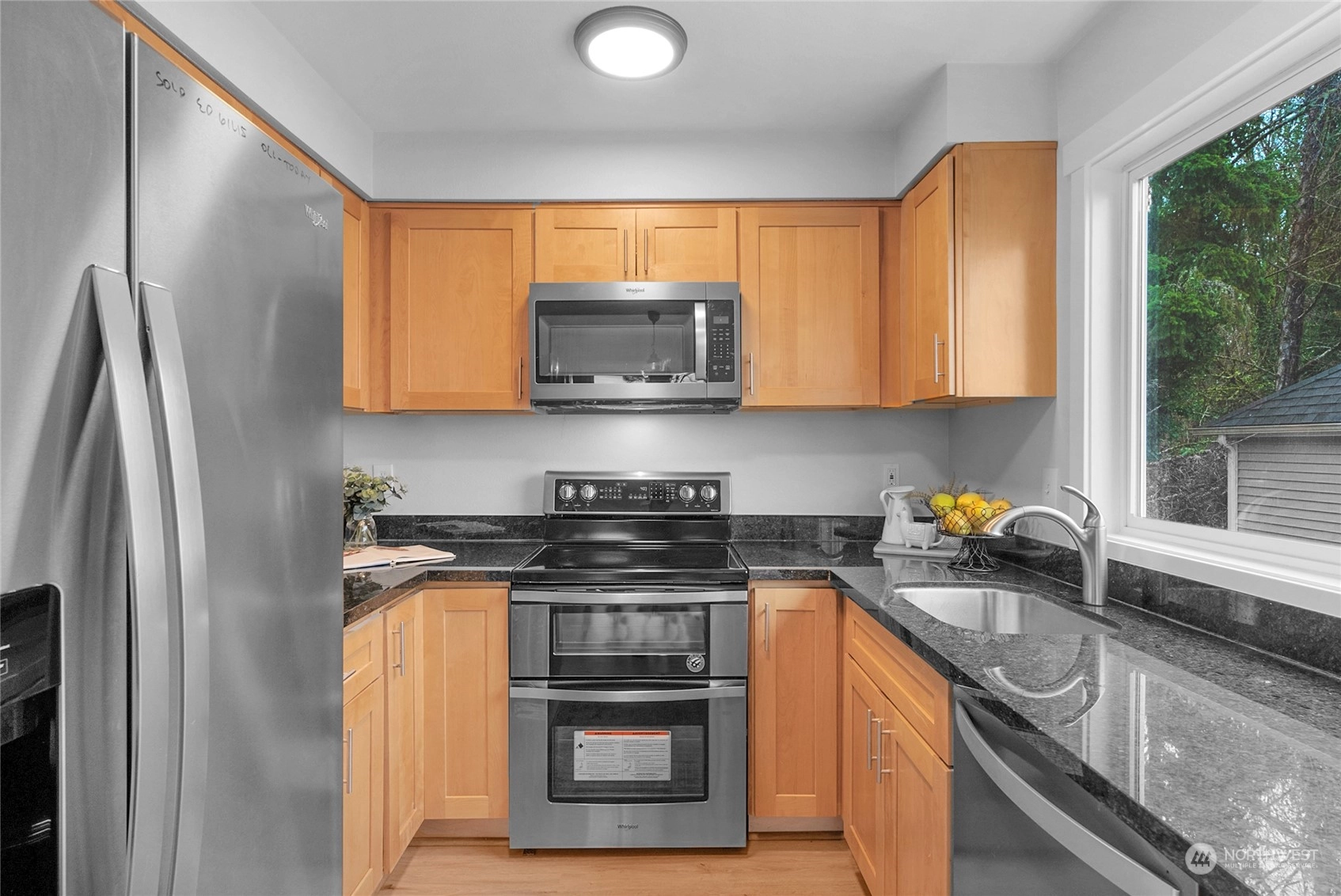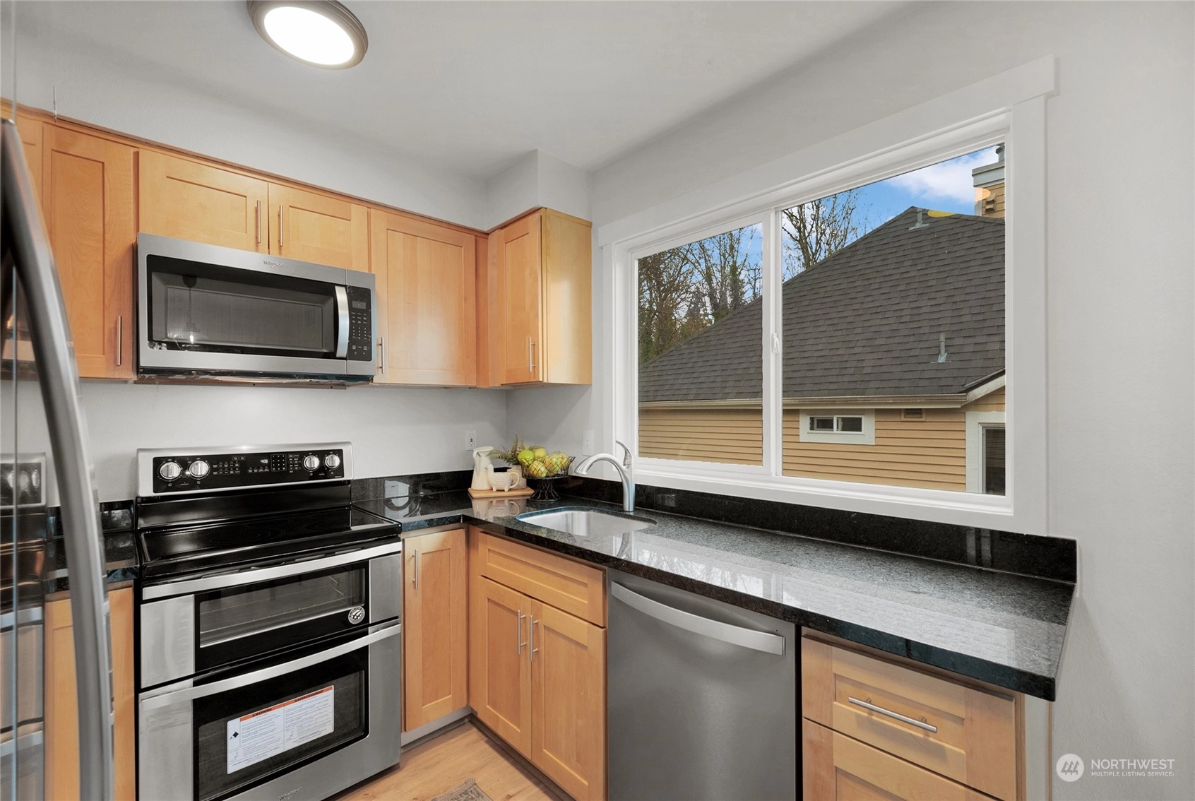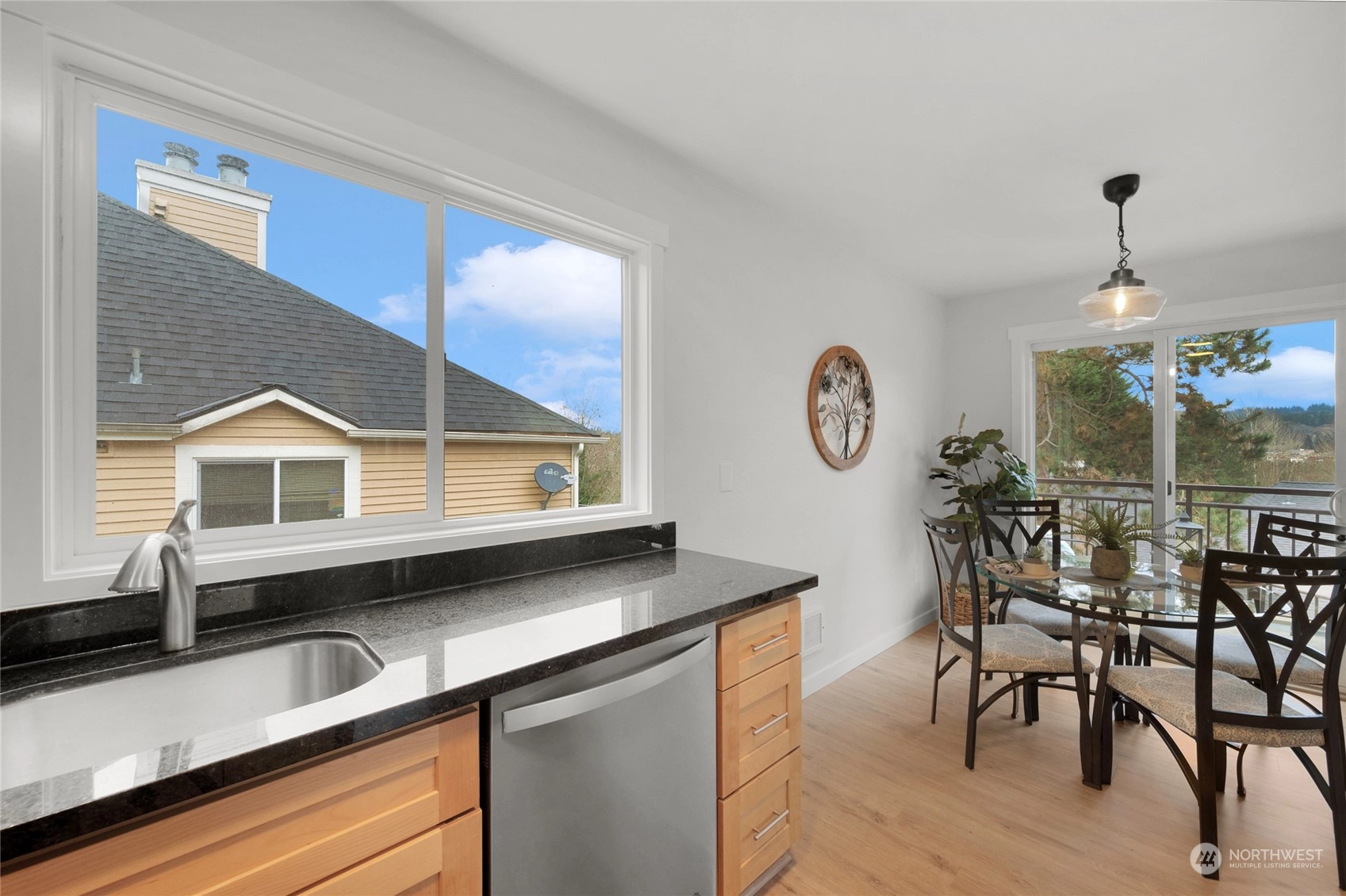Penthouse like “Top Floor” unit in Sunridge Condominiums. Enjoy single level living with territorial views and a short walk to downtown Woodinville. This desirable top floor unit was just fully renovated with Luxury Vinyl Plank flooring, new carpet, craftsman style white mill-work and 2-panel doors. Kitchen with Maple cabinets, Granite countertops and a full suite of Stainless Appliances to include Glass-top range w/double ovens, Side by Side Refer. w/Ice and water in door. Deep 1-Car Garage w/storage room plus 1 assigned parking space. Don’t miss this uniquely appointed home.