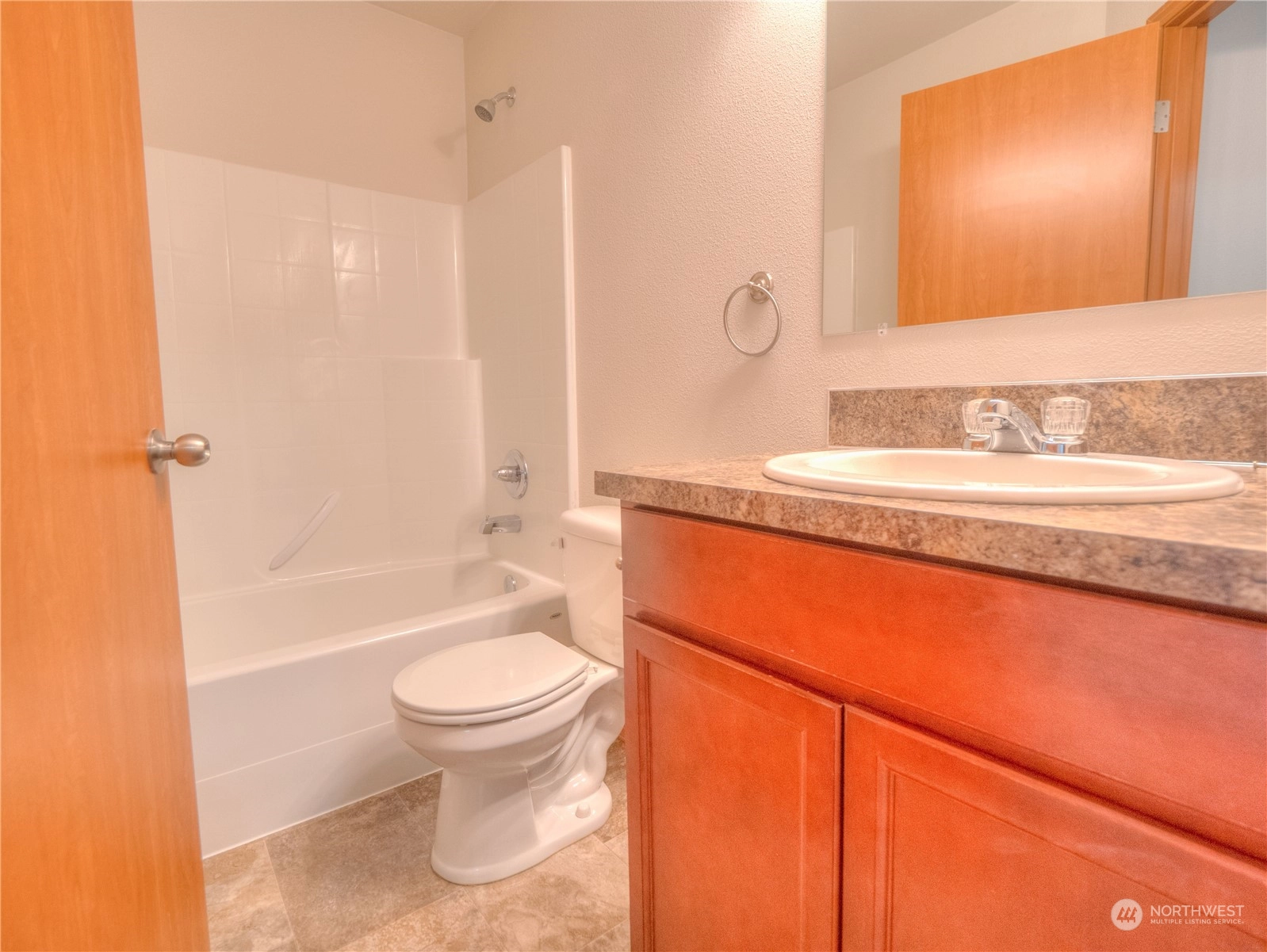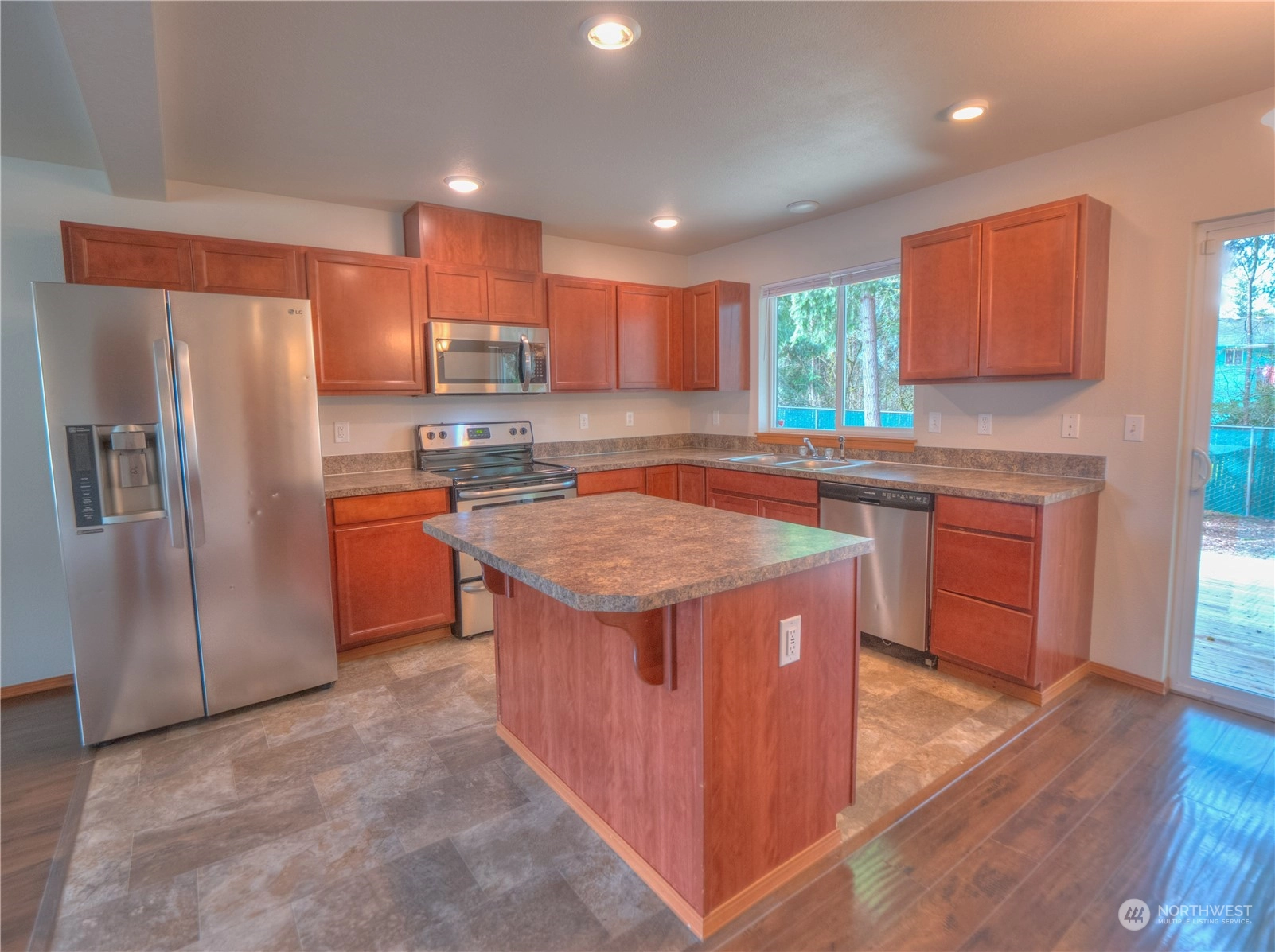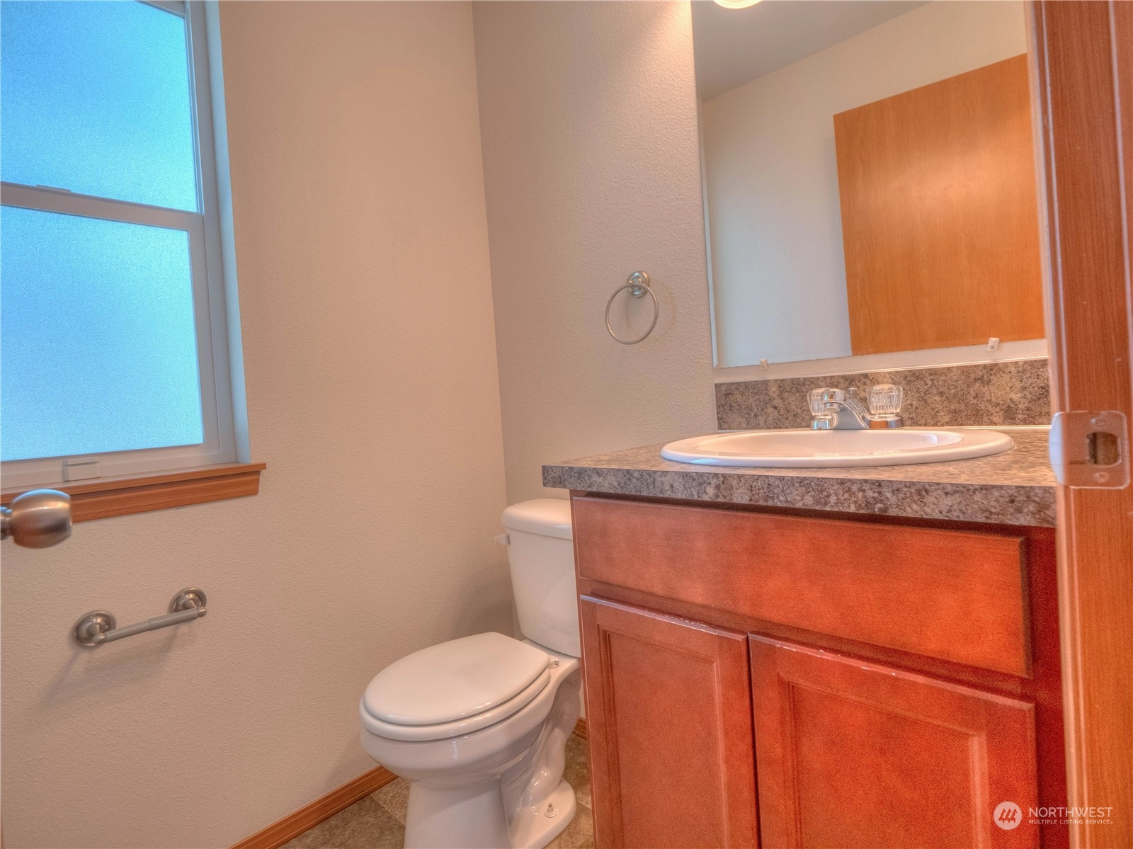 2017 built 3 bedroom, 2.5 bath home on a quiet cul-de-sac and large lot bordering neighborhood greenbelt. Open concept living/dining w/ hardsurface flooring. Spacious kitchen w/ stainless steel appliances. 1/2 bath downstairs. Efficient upstairs floorplan w/ 3 bedrooms, full guest bath, laundry/utility room, & a bonus/rec area. Primary bedroom w/ walk-in closet, private full bath, & dual vanity sinks. Sliding glass door adjacent to kitchen leads to private backyard and large deck. Attached 2-car garage w/ additional driveway/RV parking. Fresh interior paint, & new carpets in 2023.