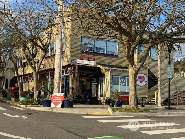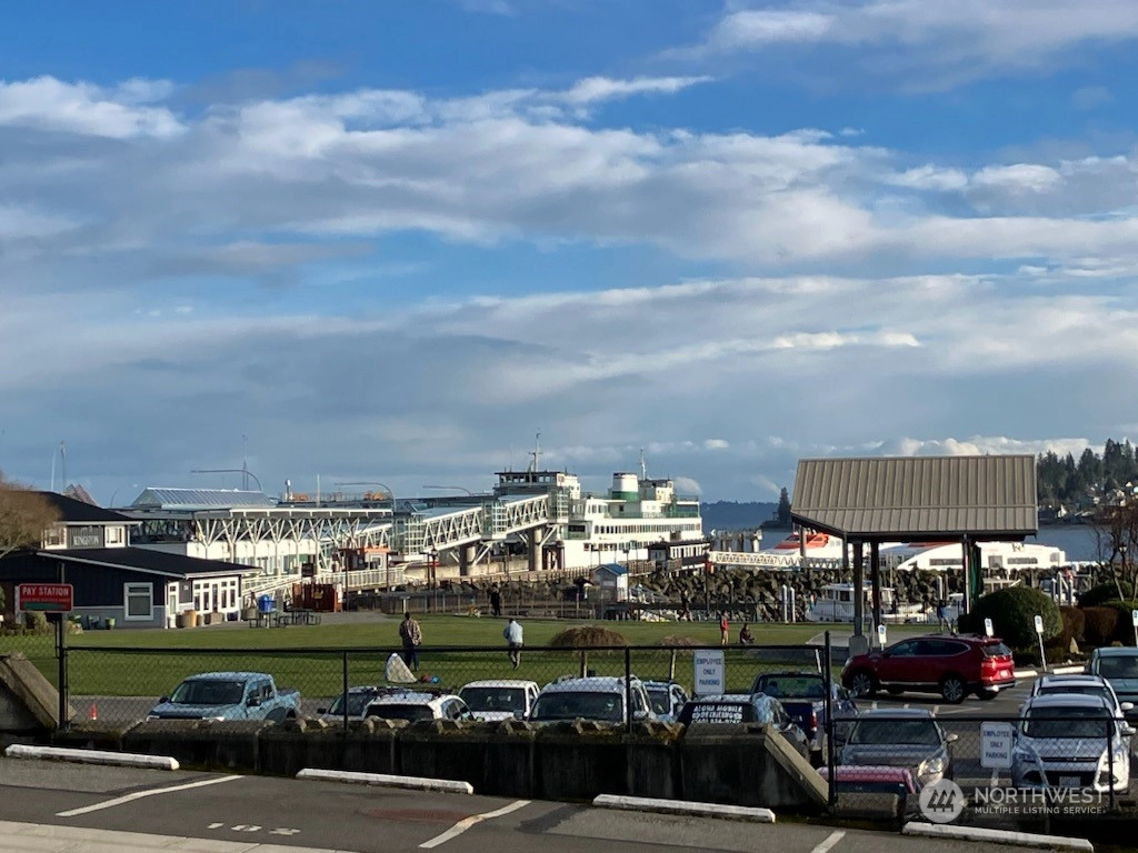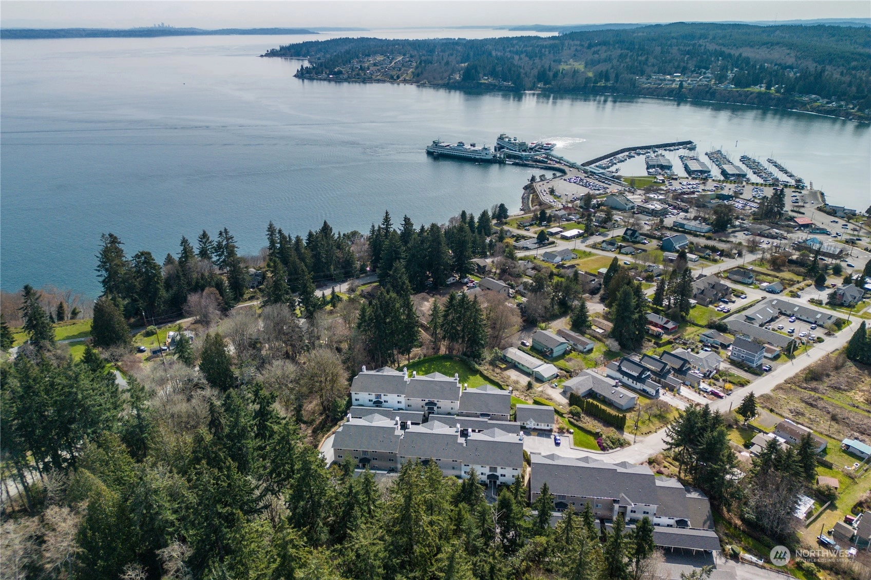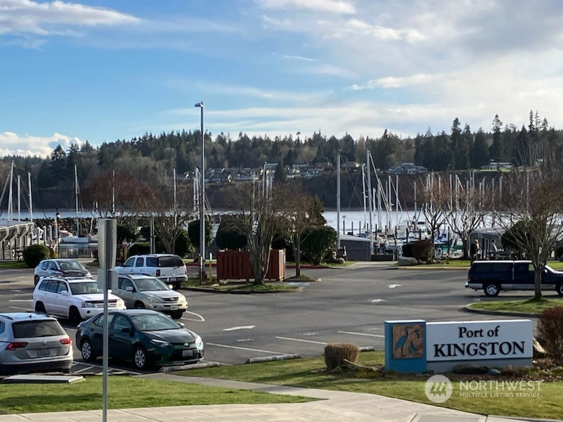 Be a part of Kingston's charming coastal community. Tucked on the hill above town, this top floor, end condo unit enjoys sunny SW exposure, forest views, & lovely views of snowy Olympics! An open floor plan, great for entertaining, expansive windows to savor the views, vaulted ceilings, stylish gas fireplace for cozy evenings, laminate floors & new carpet! Updated kitchen boasts granite counters, subway tile,& newer LG appliances looks out to dining area w/sliding doors to near full length deck for crimson sunsets! Primary Suite has its own small deck for a quiet read, full bath, & huge walk-in closet. Two add'l bedrooms/office & add'l full bath. Carport & garage! In-town amenities, car + Seattle foot ferry, marina, beach & parks close by!