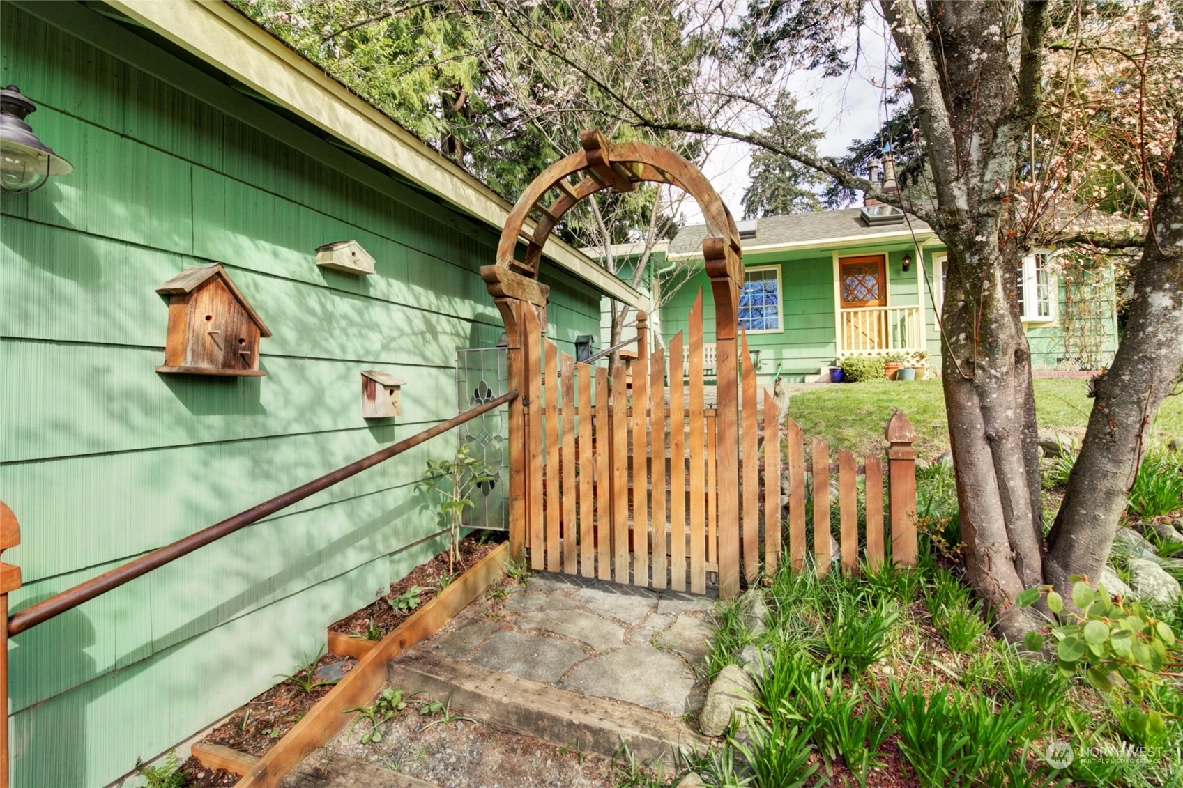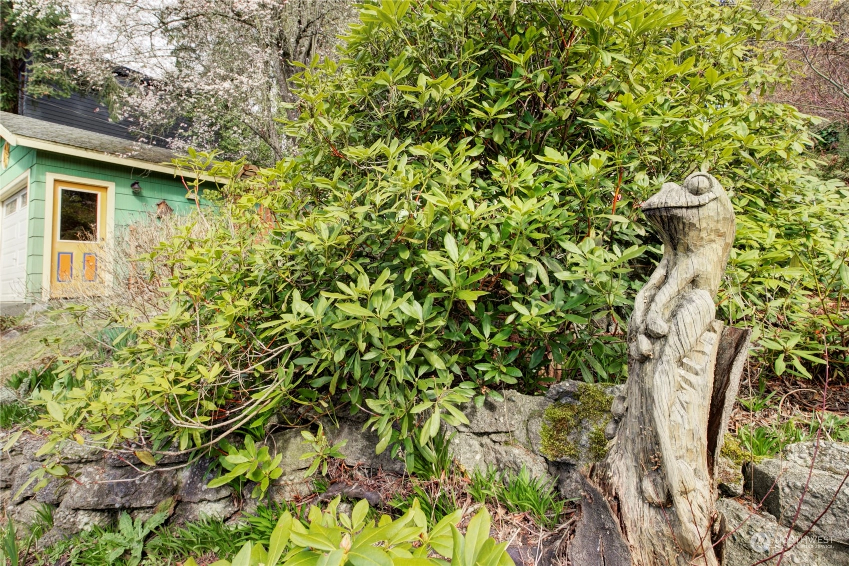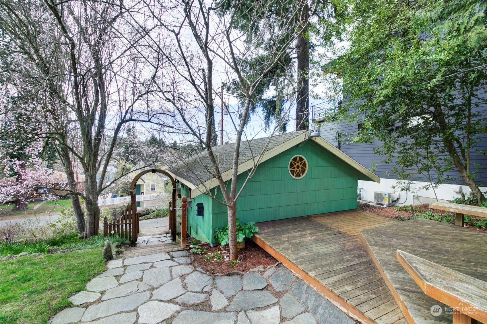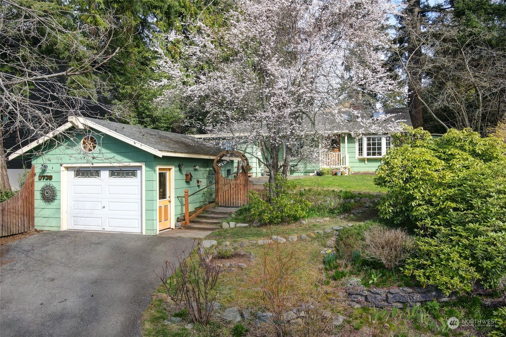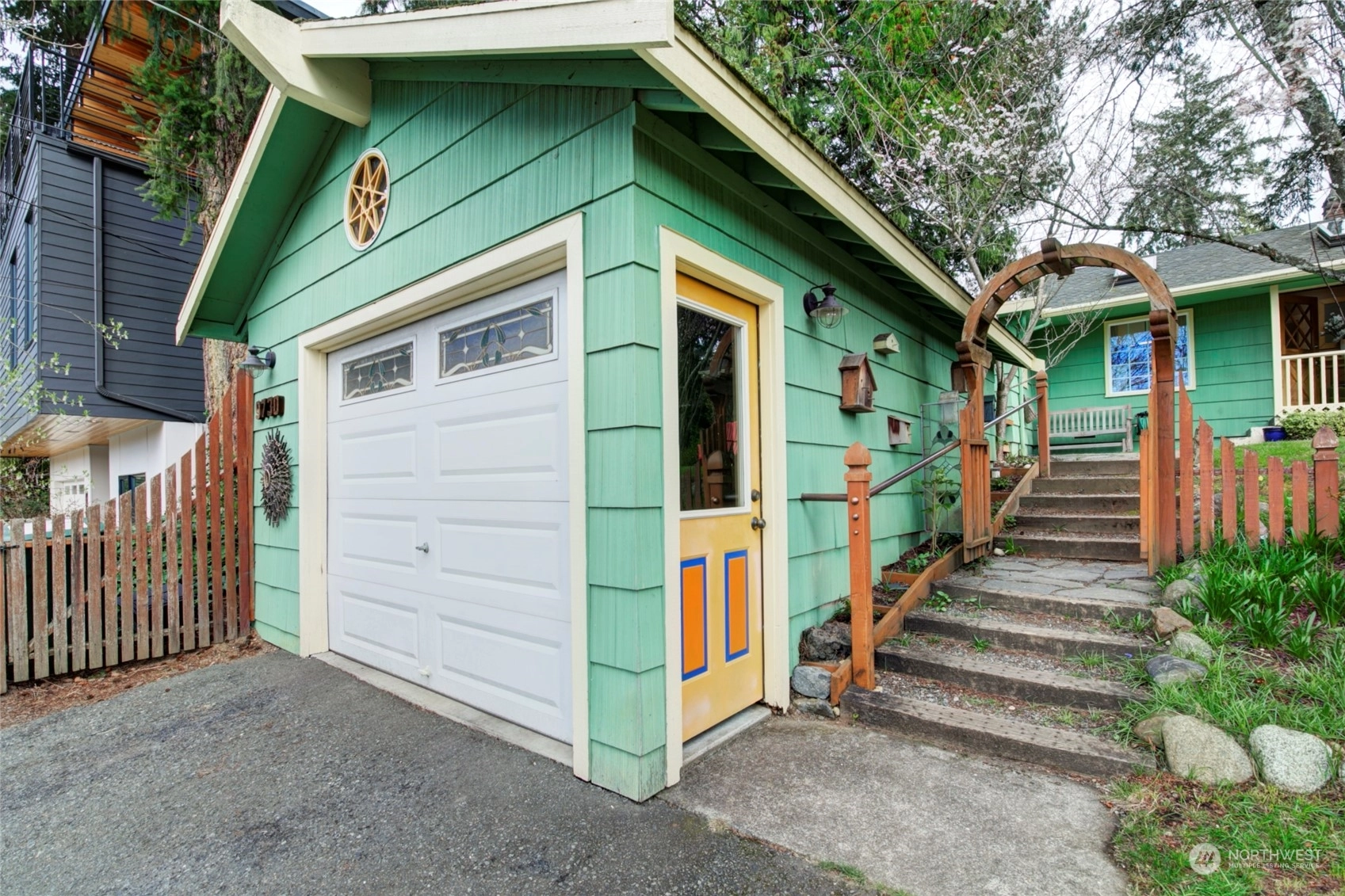 Delightful artist's cottage nestled in a lovingly landscaped yard in quiet neighborhood. Whimsical touches throughout. Two decks, one in front, one off back bedroom. Gorgeous living room with vaulted ceiling, gas fireplace, country bay window, skylight & freshly refinished oak floors. Big kitchen w/generous dining area, built-in sideboard, mullion window, vaulted ceiling. Three bedrooms & full bath. Private views from every window. Large laundry/utility room. Double-pane windows throughout. Custom detached oversized garage w/room for a vehicle plus motorcycles, plus tons of storage. Separate shed in back yard for gardening equipment, snowboards, skis, bicycles & more. Truly a delightful home, bathed in light, comfortable, solid & private.