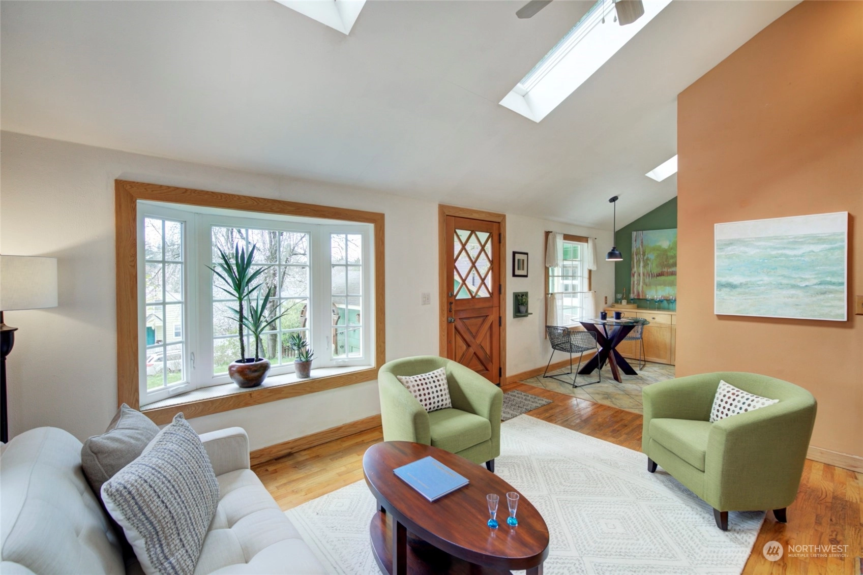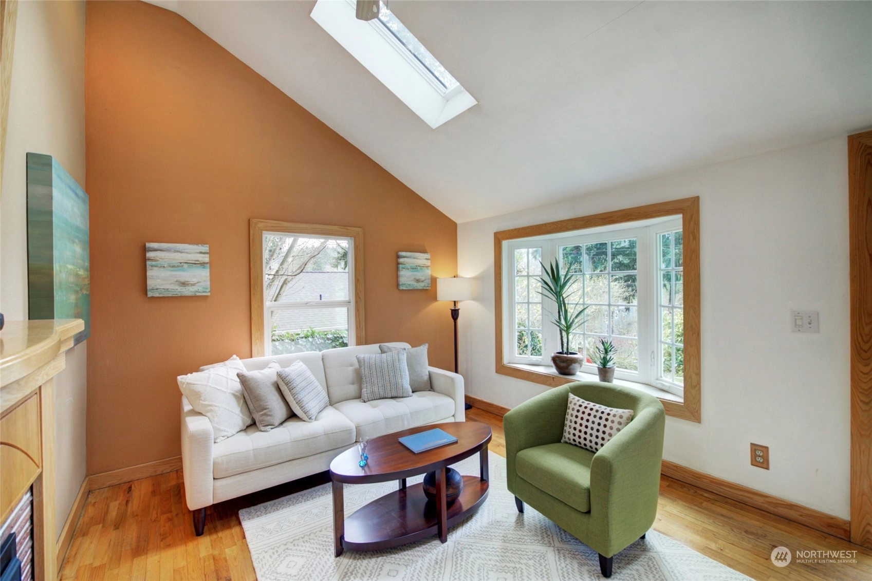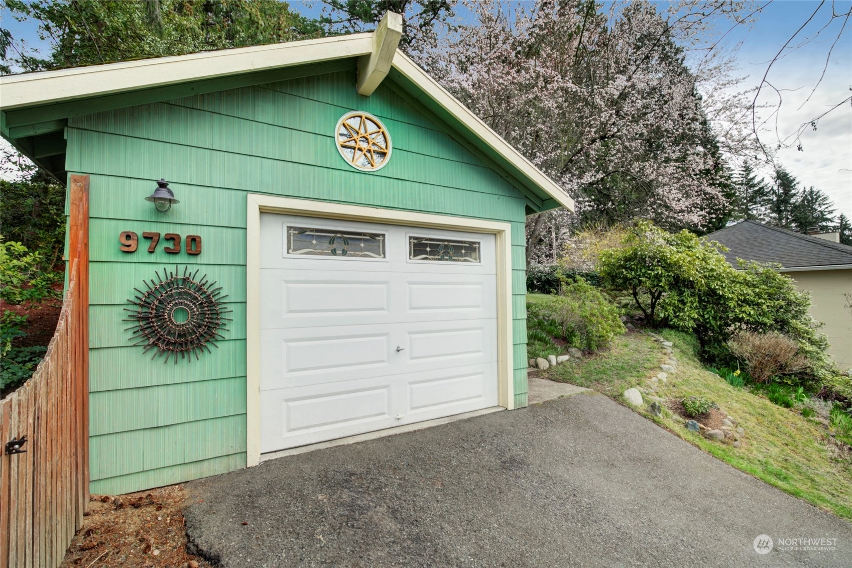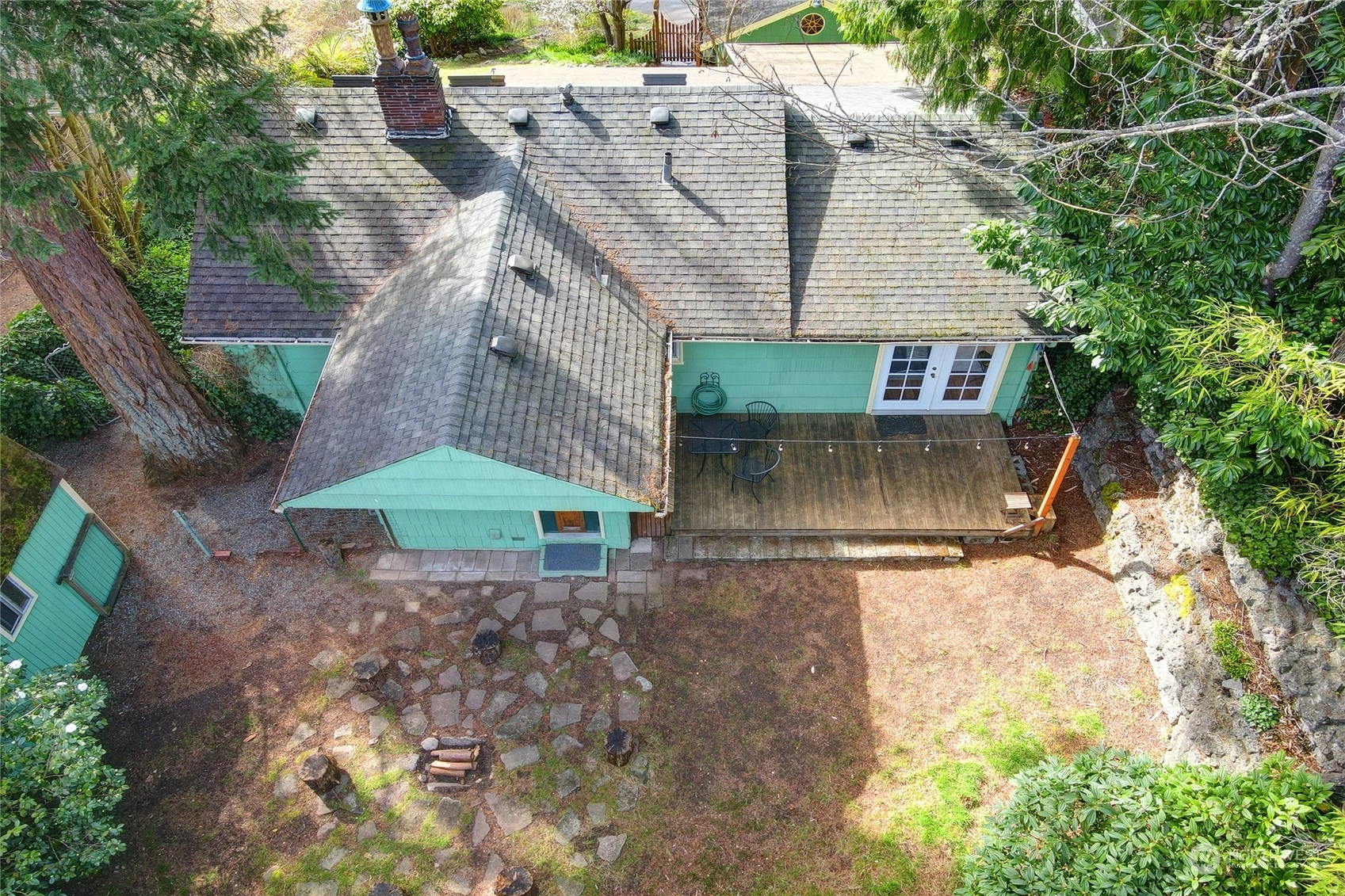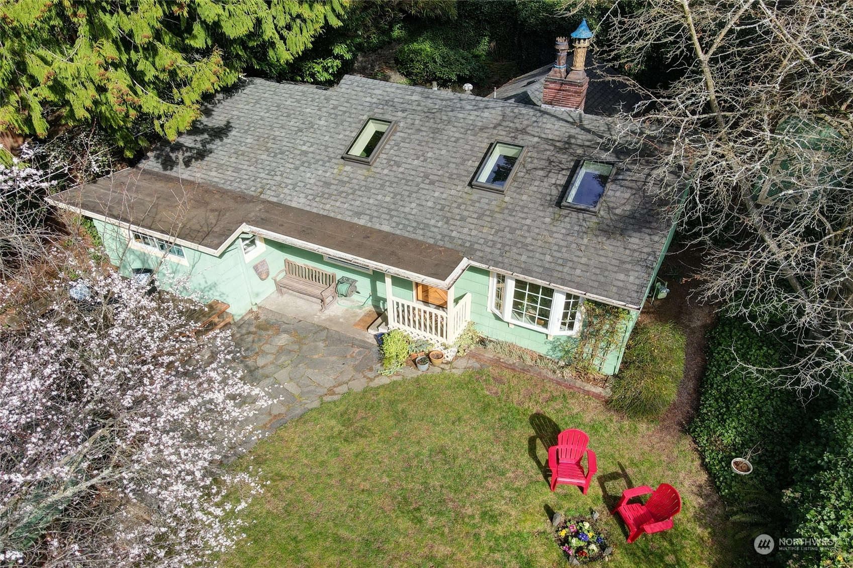 Delightful artist's cottage nestled in a lovingly landscaped yard in quiet neighborhood. Whimsical touches throughout. Two decks, one in front, one off back bedroom. Gorgeous living room with vaulted ceiling, gas fireplace, country bay window, skylight & freshly refinished oak floors. Big kitchen w/generous dining area, built-in sideboard, mullion window, vaulted ceiling. Three bedrooms & full bath. Private views from every window. Large laundry/utility room. Double-pane windows throughout. Custom detached oversized garage w/room for a vehicle plus motorcycles, plus tons of storage. Separate shed in back yard for gardening equipment, snowboards, skis, bicycles & more. Truly a delightful home, bathed in light, comfortable, solid & private.