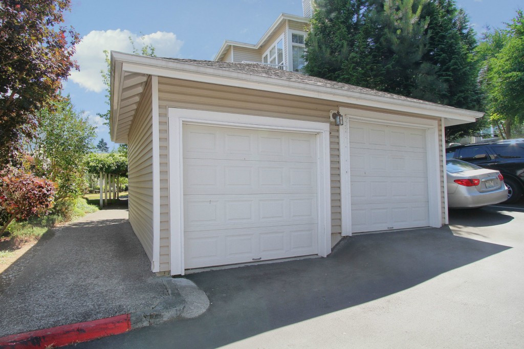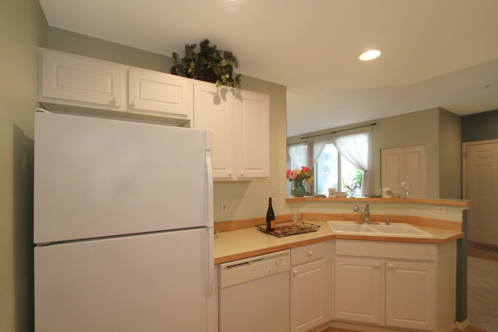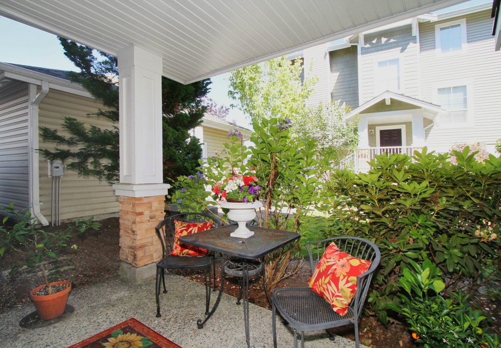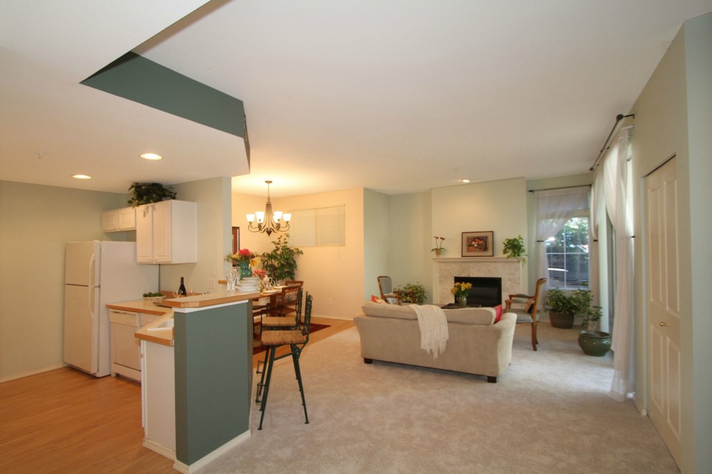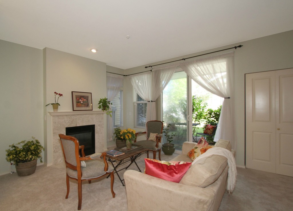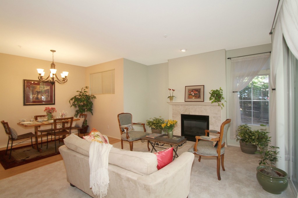 Lovely 2BR, 2BA GARDEN CONDO, 1 car garage 10 steps from front door. Your own private patio garden. Master suite gets morning sun & view of courtyard + large WIC & large bath with soaking tub. 2nd BR or den also has morning sun & view of your garden. Kitchen with breakfast counter. Separate dining room. Living room with gas fireplace/marble surround faces East to Garden & Patio. 9 ft ceilings. Brand new carpet. All appliances stay. Easy I-90 commute. Ground floor with 1-step entry.