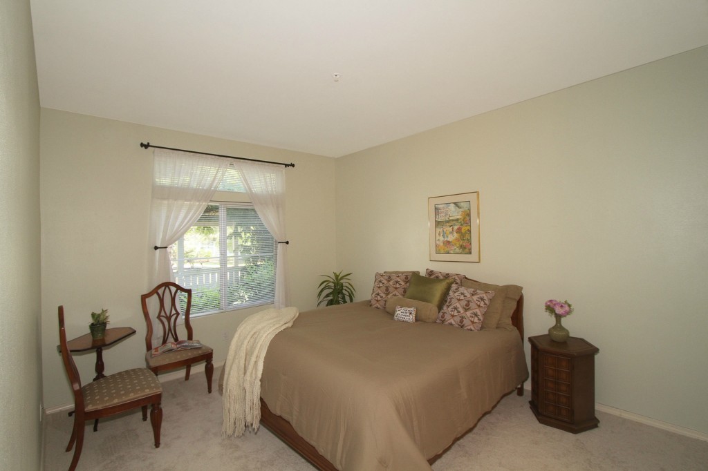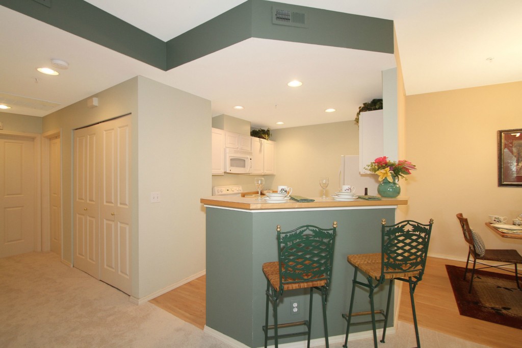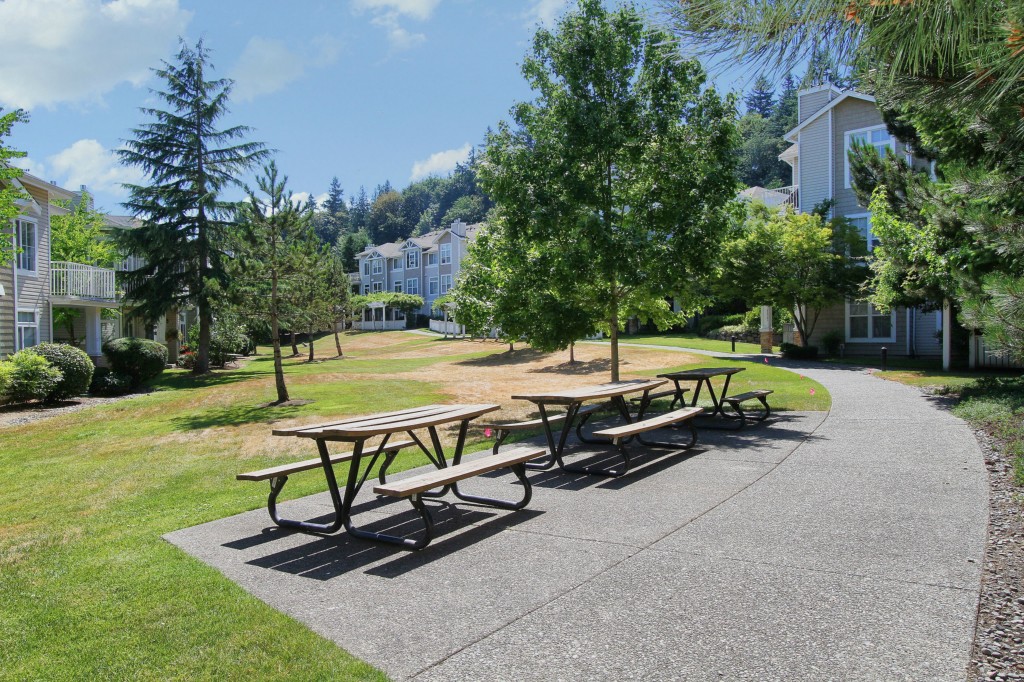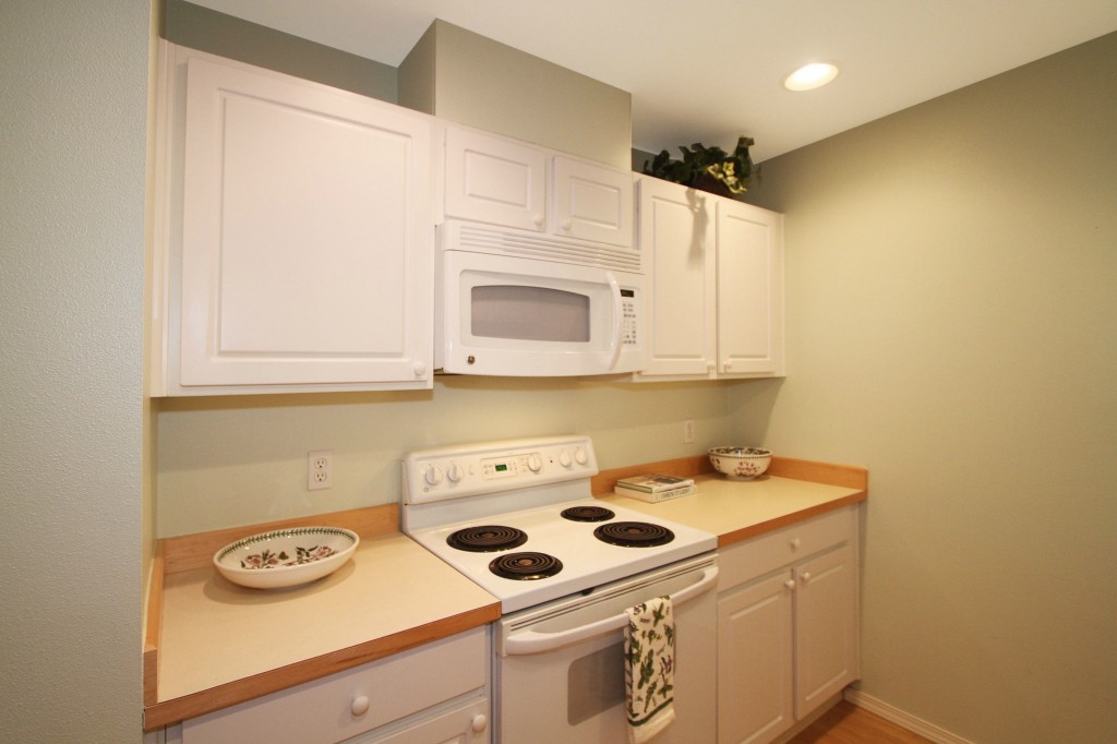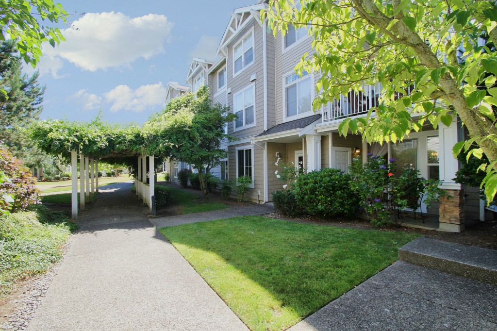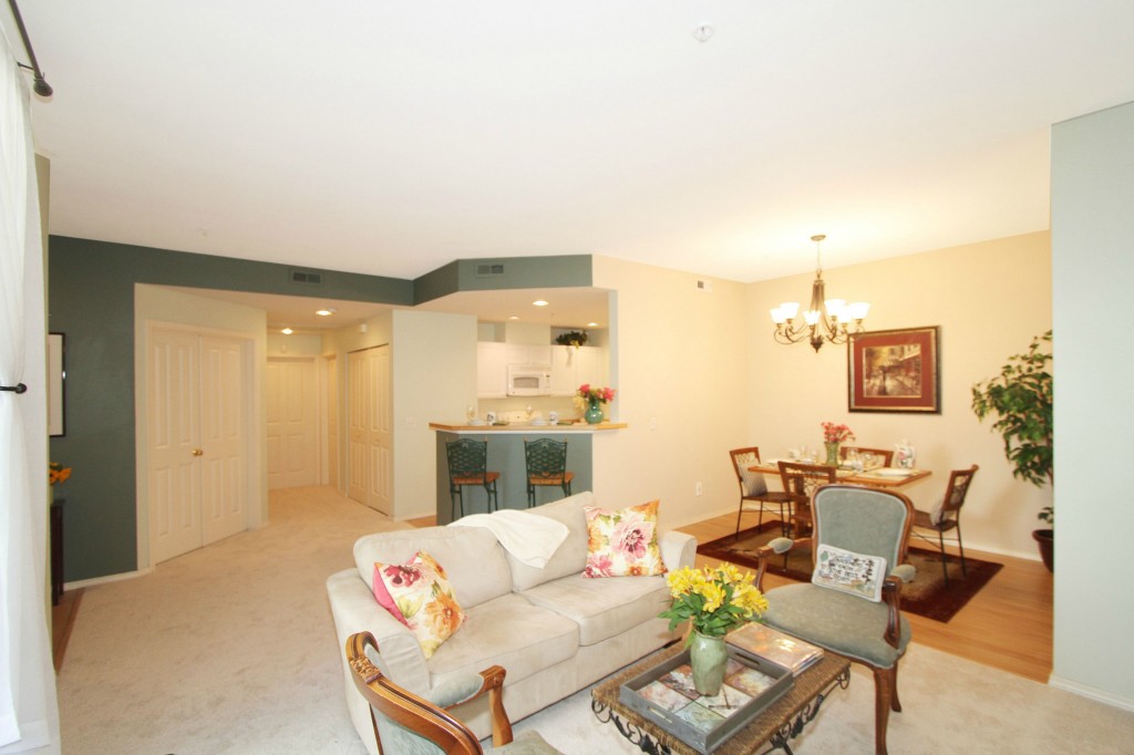 Lovely 2BR, 2BA GARDEN CONDO, 1 car garage 10 steps from front door. Your own private patio garden. Master suite gets morning sun & view of courtyard + large WIC & large bath with soaking tub. 2nd BR or den also has morning sun & view of your garden. Kitchen with breakfast counter. Separate dining room. Living room with gas fireplace/marble surround faces East to Garden & Patio. 9 ft ceilings. Brand new carpet. All appliances stay. Easy I-90 commute. Ground floor with 1-step entry.