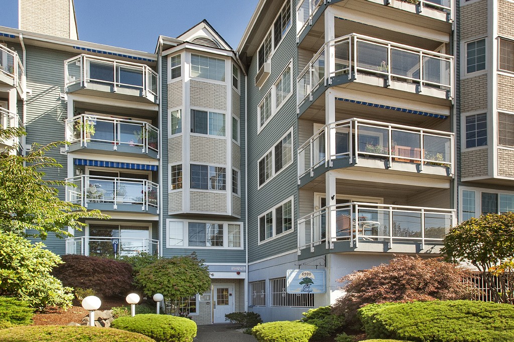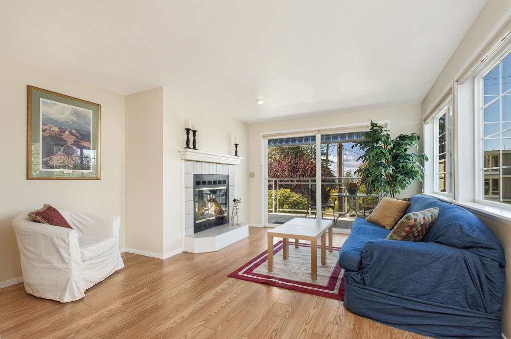 Spacious updated corner unit with partial Sound views. Updated kitchen with stainless appliances open to dining area with built-in buffet. Master boasts his/hers closets and private bath. Den off second bedroom with full continental bath. Living room features fireplace and balcony for dining al fresco. Wonderful walking location close to park, neighborhood shops and dining. Secure building with garage parking located on bus route. Additional storage area. New windows, W/D hookups in unit.