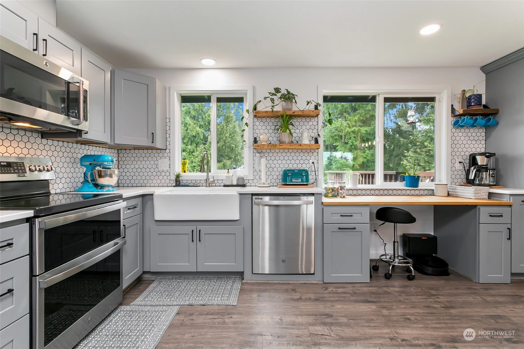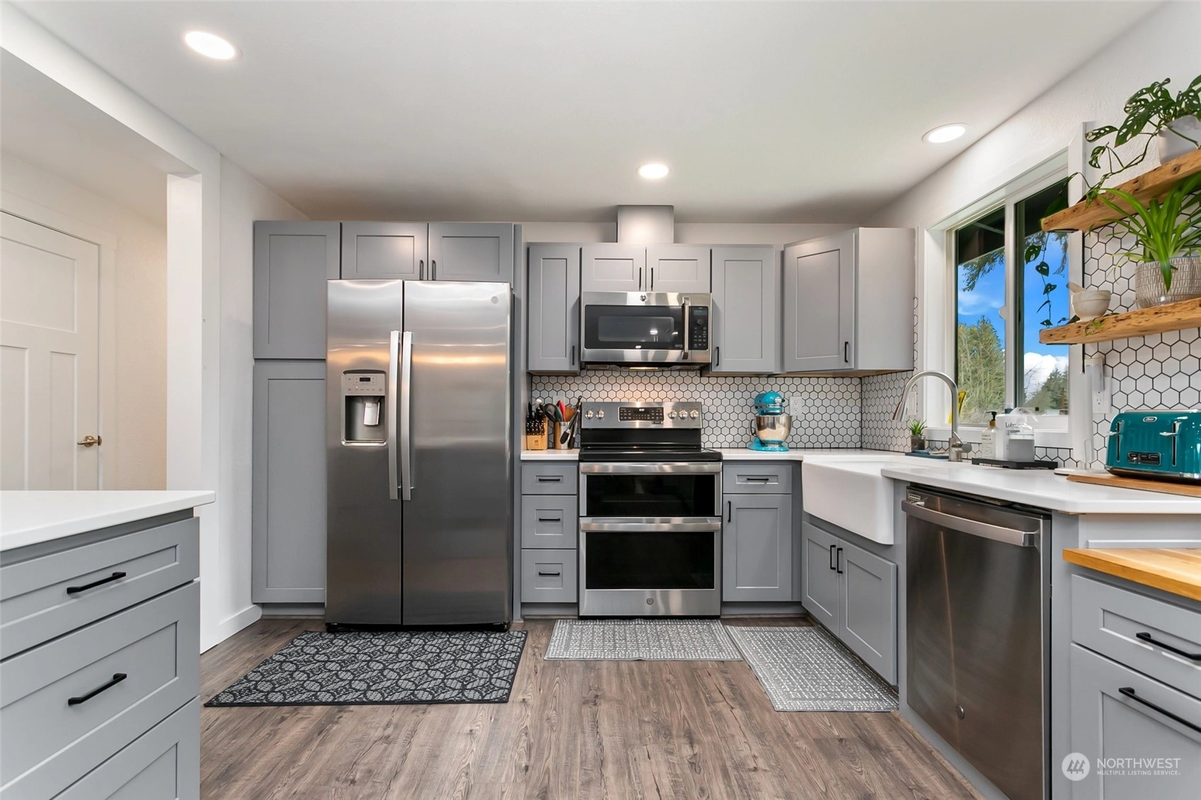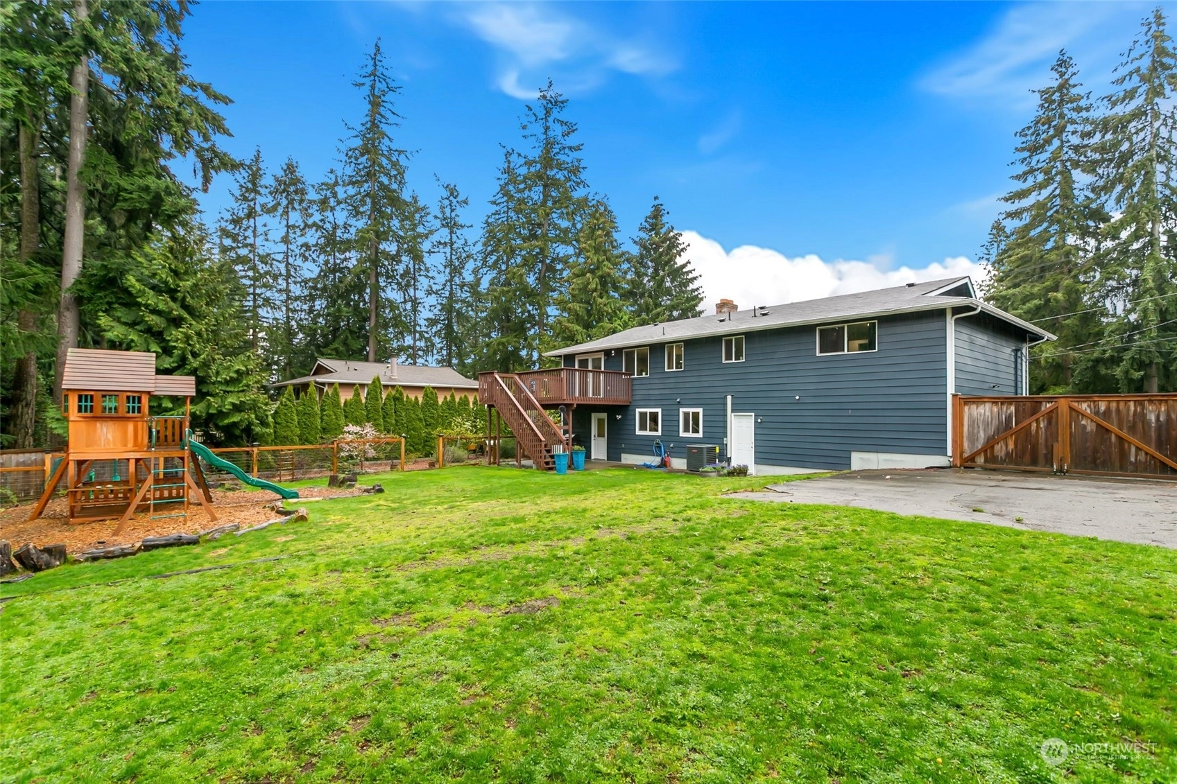 Charming home located in a quiet well established neighborhood. This beautiful gem is a 3 bedroom with an additional bonus room, and sits on a huge lot that is sure to impress. The kitchen has been thoroughly remodeled featuring gorgeous new quartz countertops and stainless steel appliances. Primary bedroom has a new closet and completely remodeled en suite bathroom. Step outside to the large, beautiful yard and enjoy the deck overlooking the established garden featuring apple, cherry, plum trees and more. Built in two car garage. This home includes a new heat pump, windows, flooring, RV parking, and truly so much more. Easy access to freeway, shops, and parks.