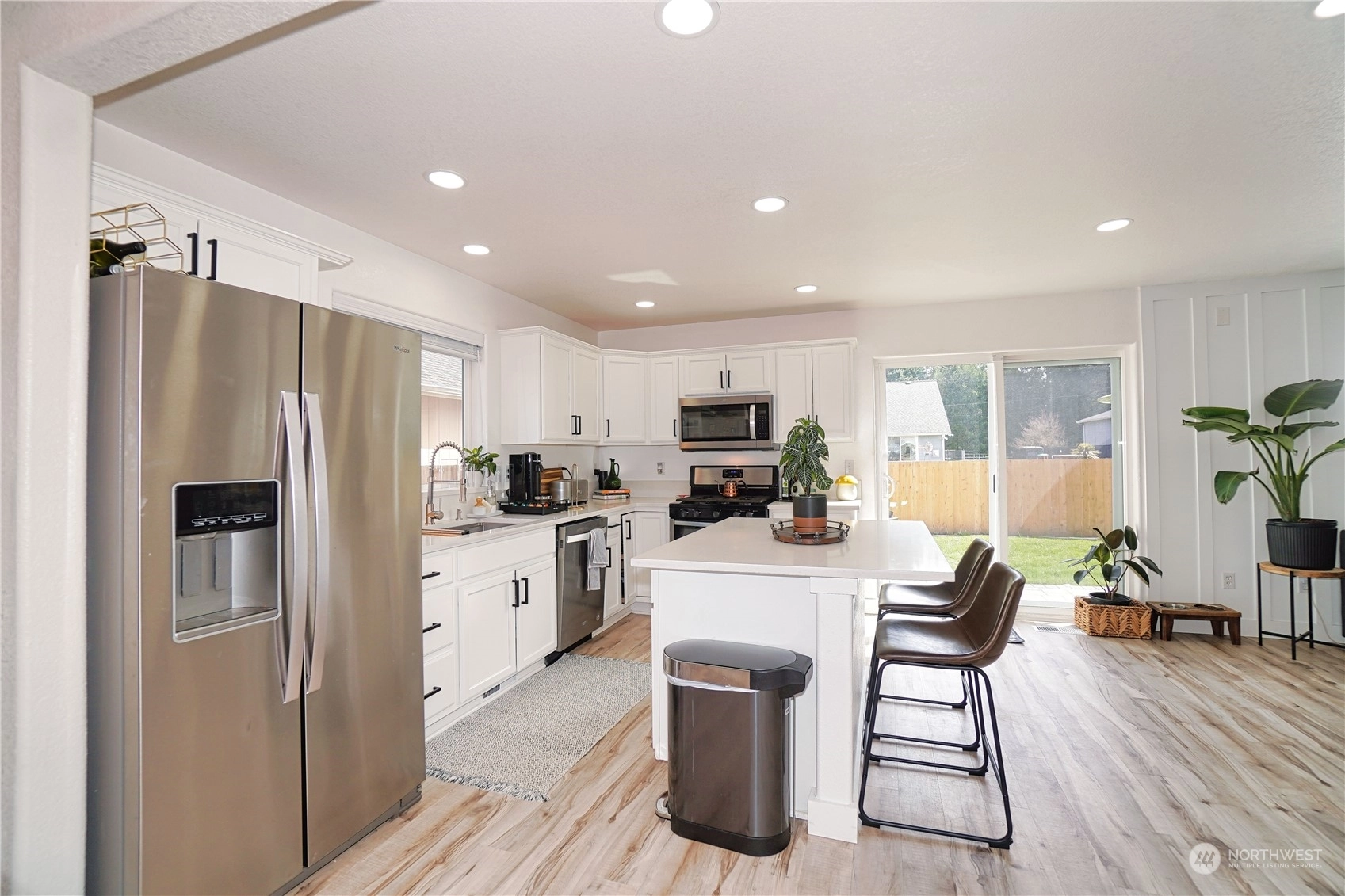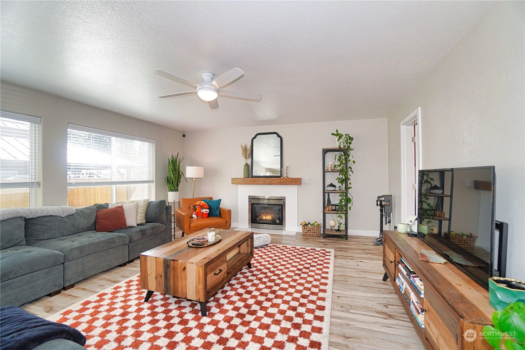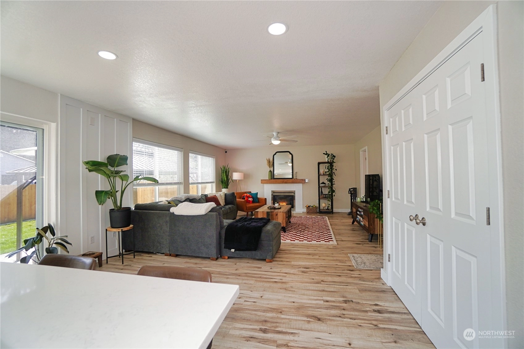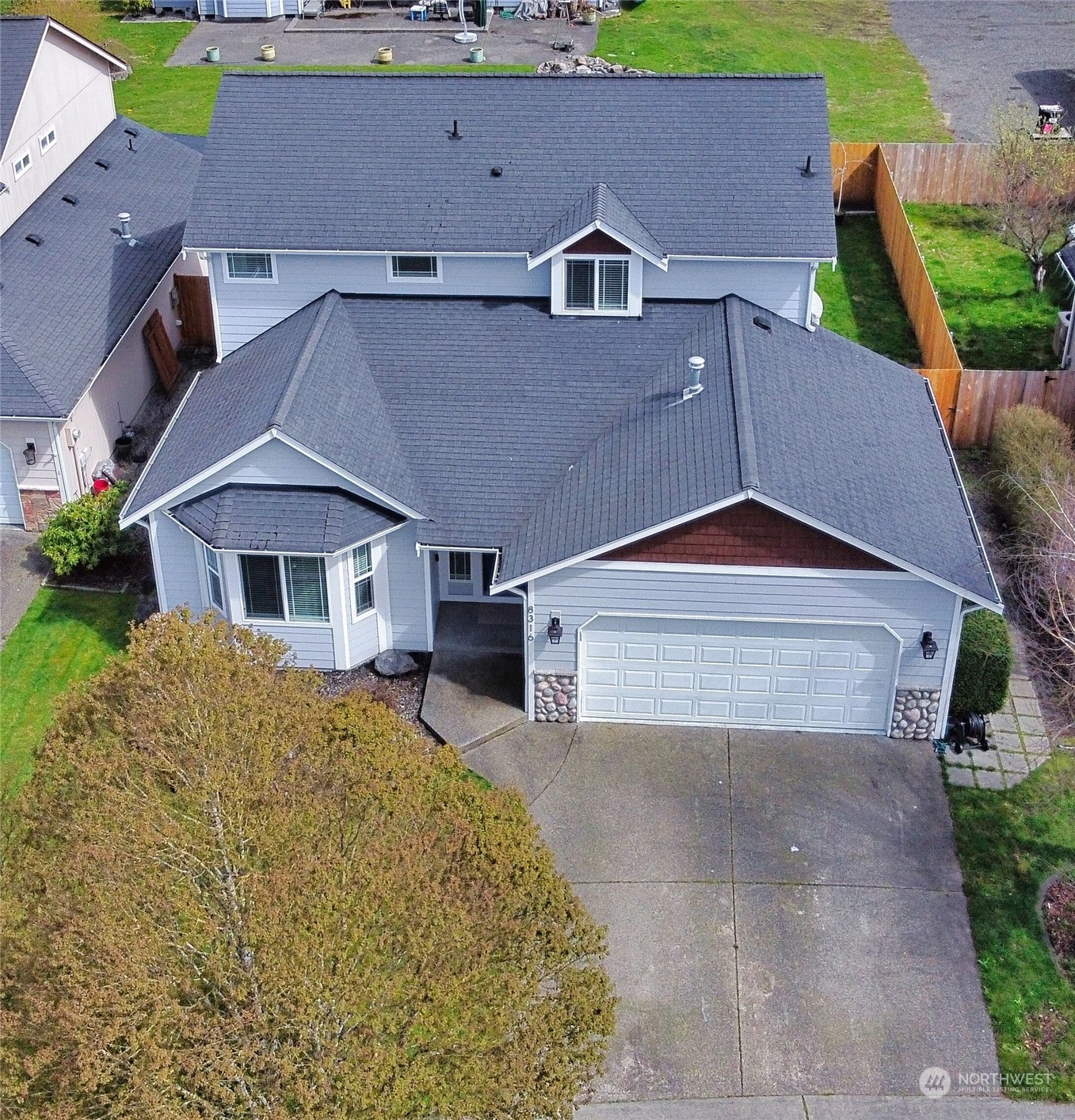 Beautifully updated home that looks and feels new. Light and bright home with decorator touches. Beautiful floors in this open floor plan home. Kitchen with beautiful cabinets, Quartz counters and large kitchen island plus a huge Pantry. Extra storage spaces. Family room with Gas fireplace for those cooler days. Flowing floor plan from the living room to dining to kitchen to family room. Light, bright and airy. Upstairs are the 4 spacious bedrooms including the primary suite with 5 piece bath. Several ceiling fans keep the air moving. The fenced backyard with large patio that has an Awning that stays. A safe accessible neighborhood. Close to lakes and they are accessible with a short walk. You will be delighted to call this home your own.