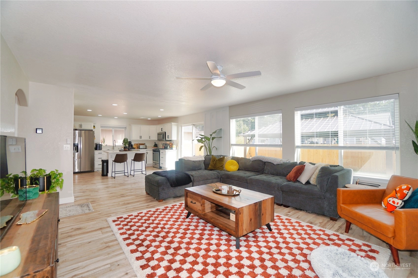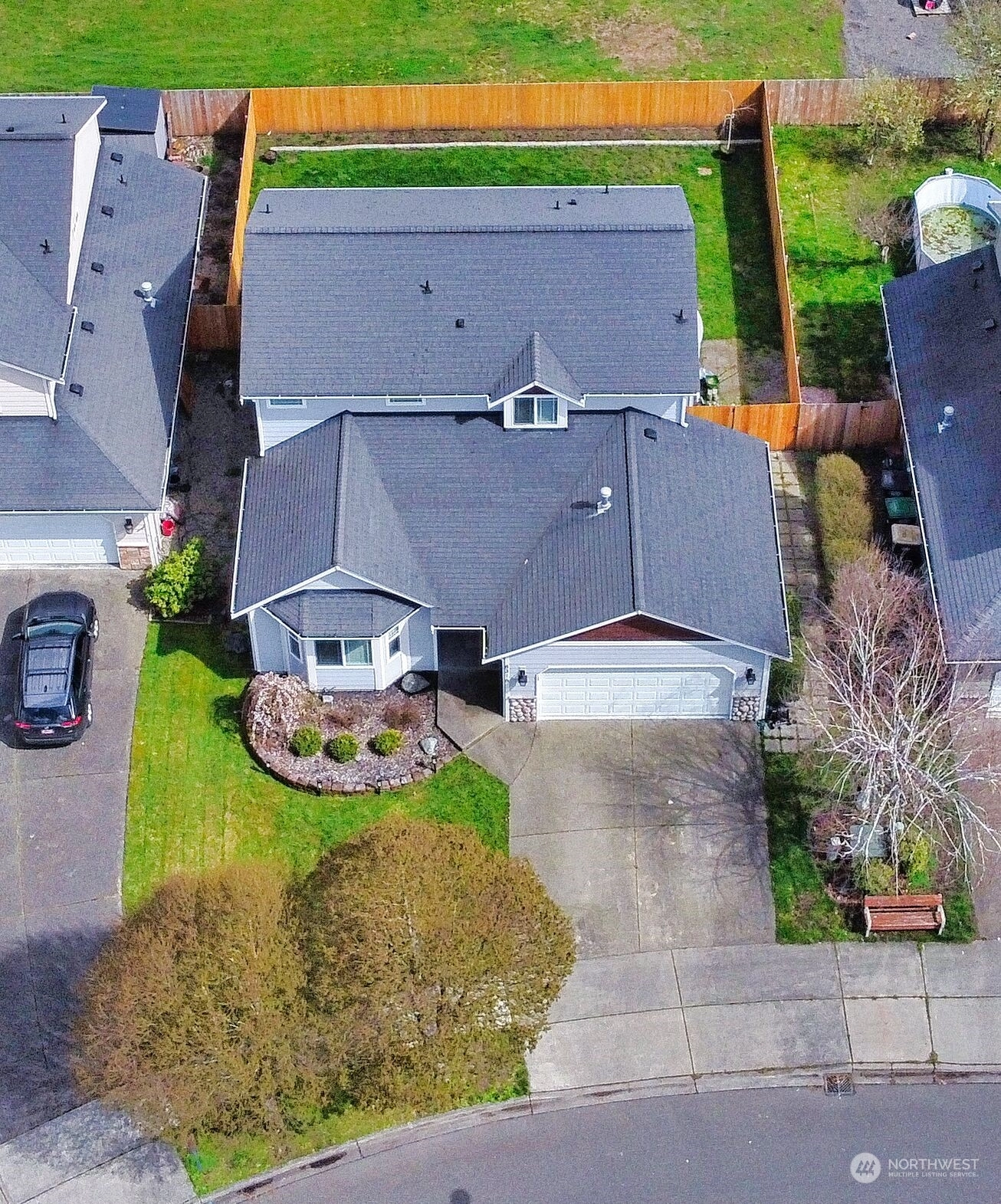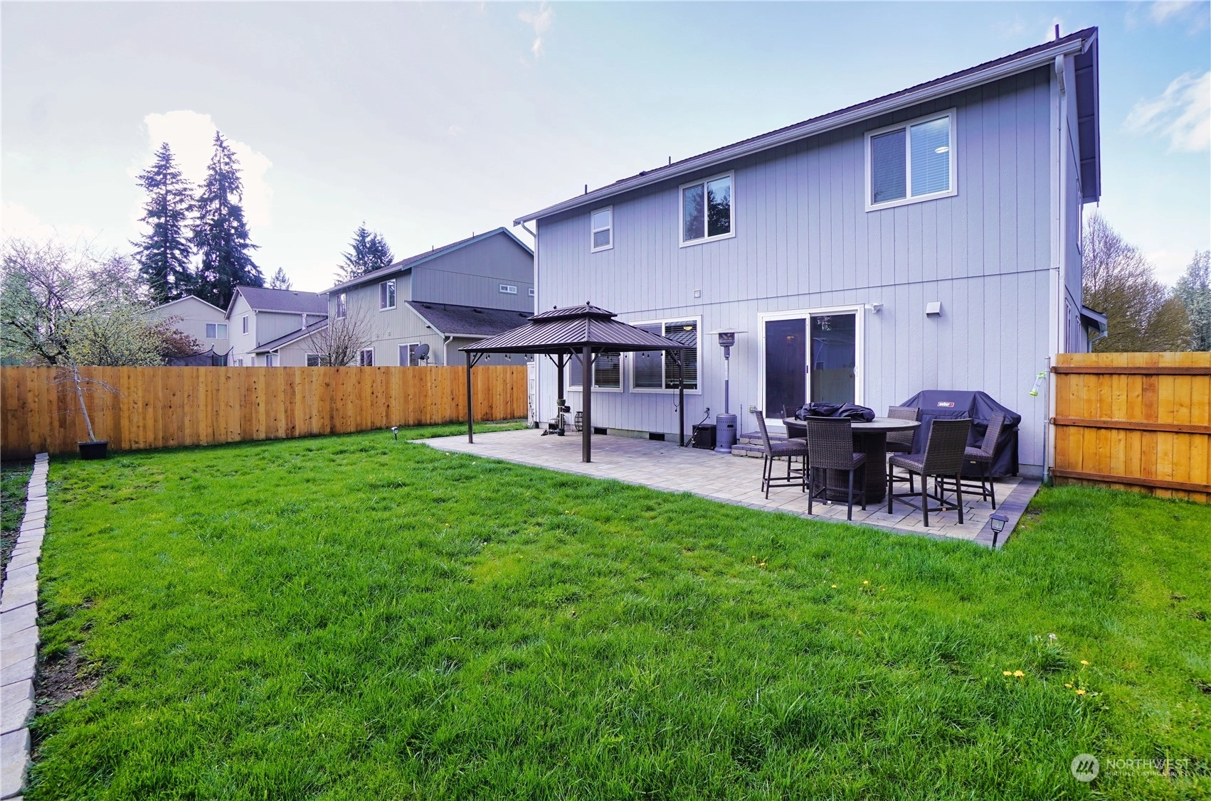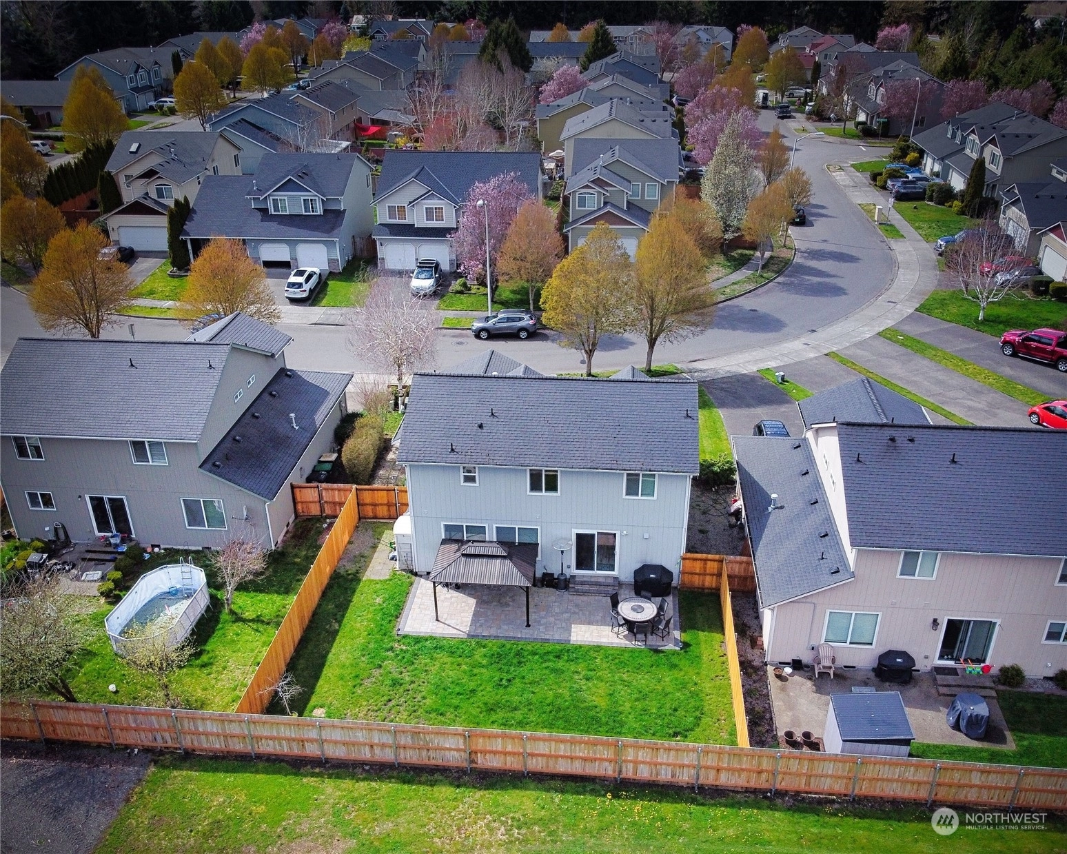 Beautifully updated home that looks and feels new. Light and bright home with decorator touches. Beautiful floors in this open floor plan home. Kitchen with beautiful cabinets, Quartz counters and large kitchen island plus a huge Pantry. Extra storage spaces. Family room with Gas fireplace for those cooler days. Flowing floor plan from the living room to dining to kitchen to family room. Light, bright and airy. Upstairs are the 4 spacious bedrooms including the primary suite with 5 piece bath. Several ceiling fans keep the air moving. The fenced backyard with large patio that has an Awning that stays. A safe accessible neighborhood. Close to lakes and they are accessible with a short walk. You will be delighted to call this home your own.