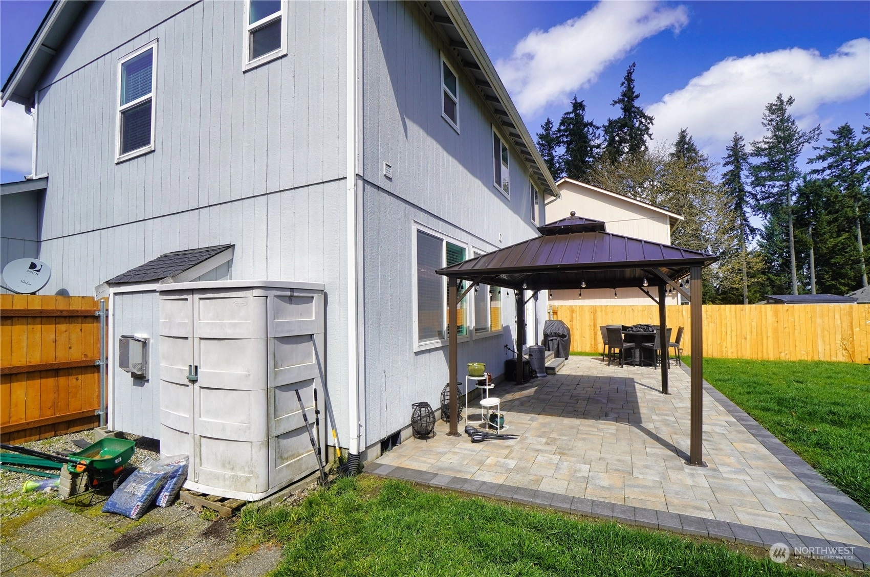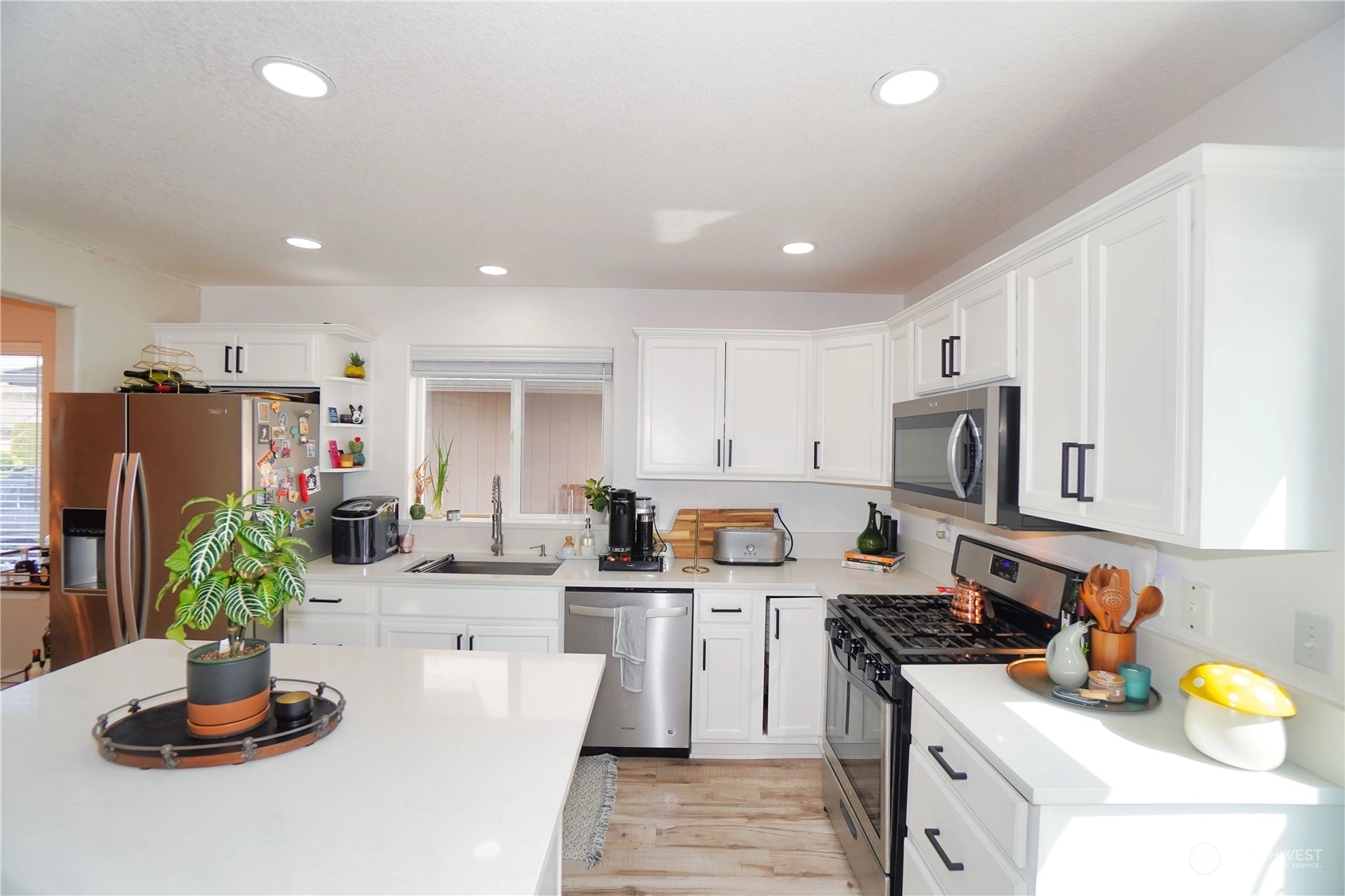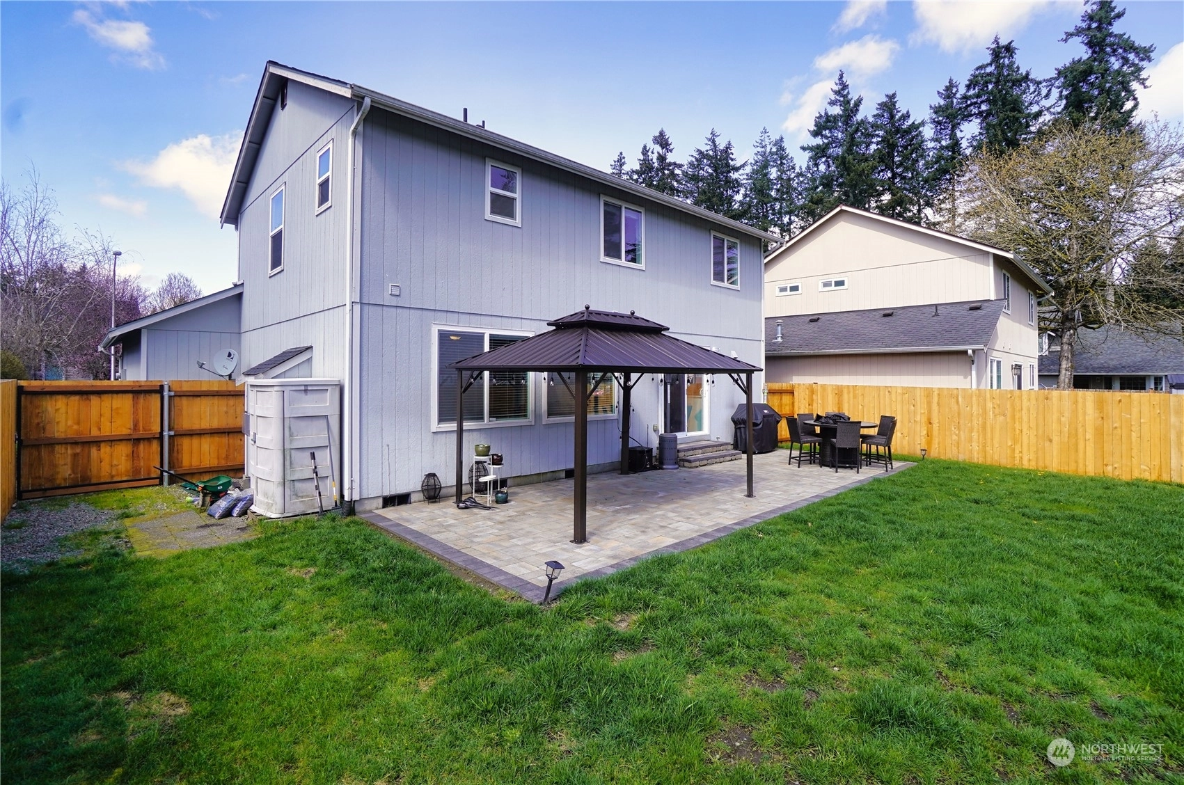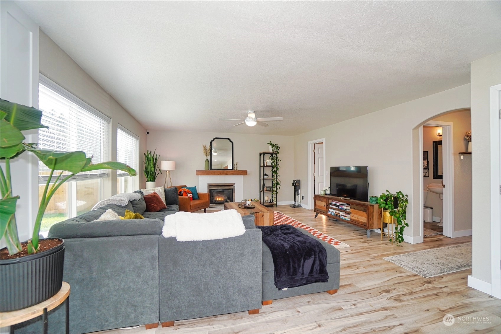 Beautifully updated home that looks and feels new. Light and bright home with decorator touches. Beautiful floors in this open floor plan home. Kitchen with beautiful cabinets, Quartz counters and large kitchen island plus a huge Pantry. Extra storage spaces. Family room with Gas fireplace for those cooler days. Flowing floor plan from the living room to dining to kitchen to family room. Light, bright and airy. Upstairs are the 4 spacious bedrooms including the primary suite with 5 piece bath. Several ceiling fans keep the air moving. The fenced backyard with large patio that has an Awning that stays. A safe accessible neighborhood. Close to lakes and they are accessible with a short walk. You will be delighted to call this home your own.