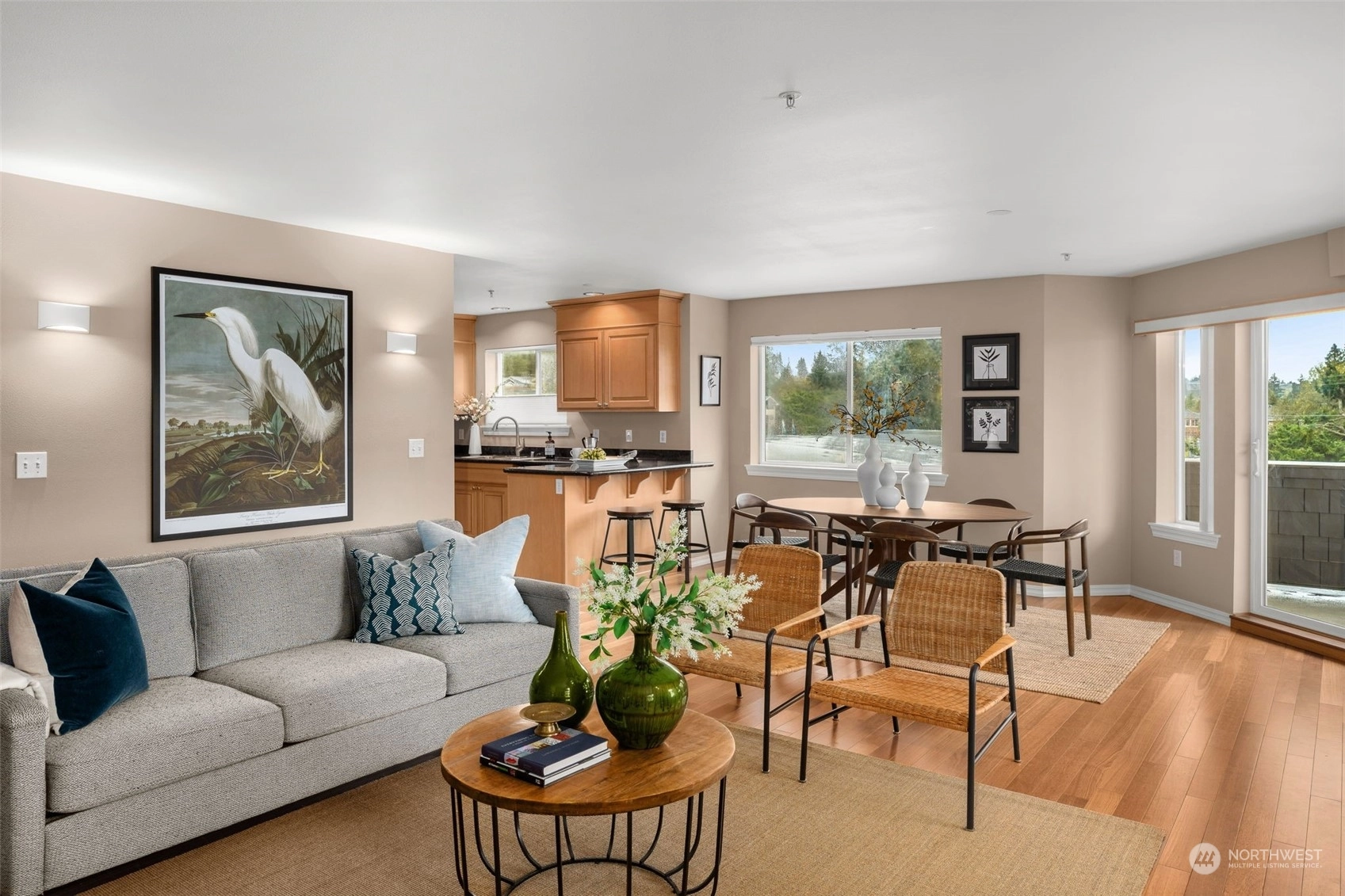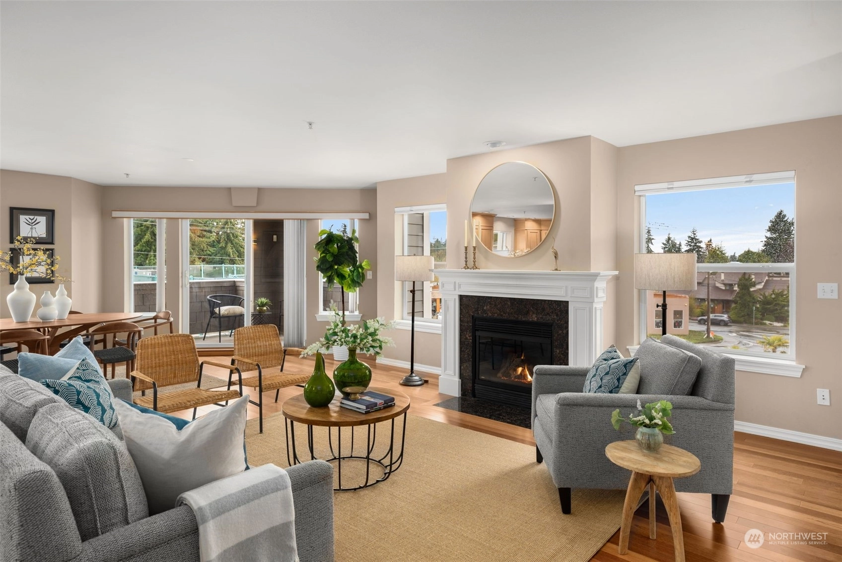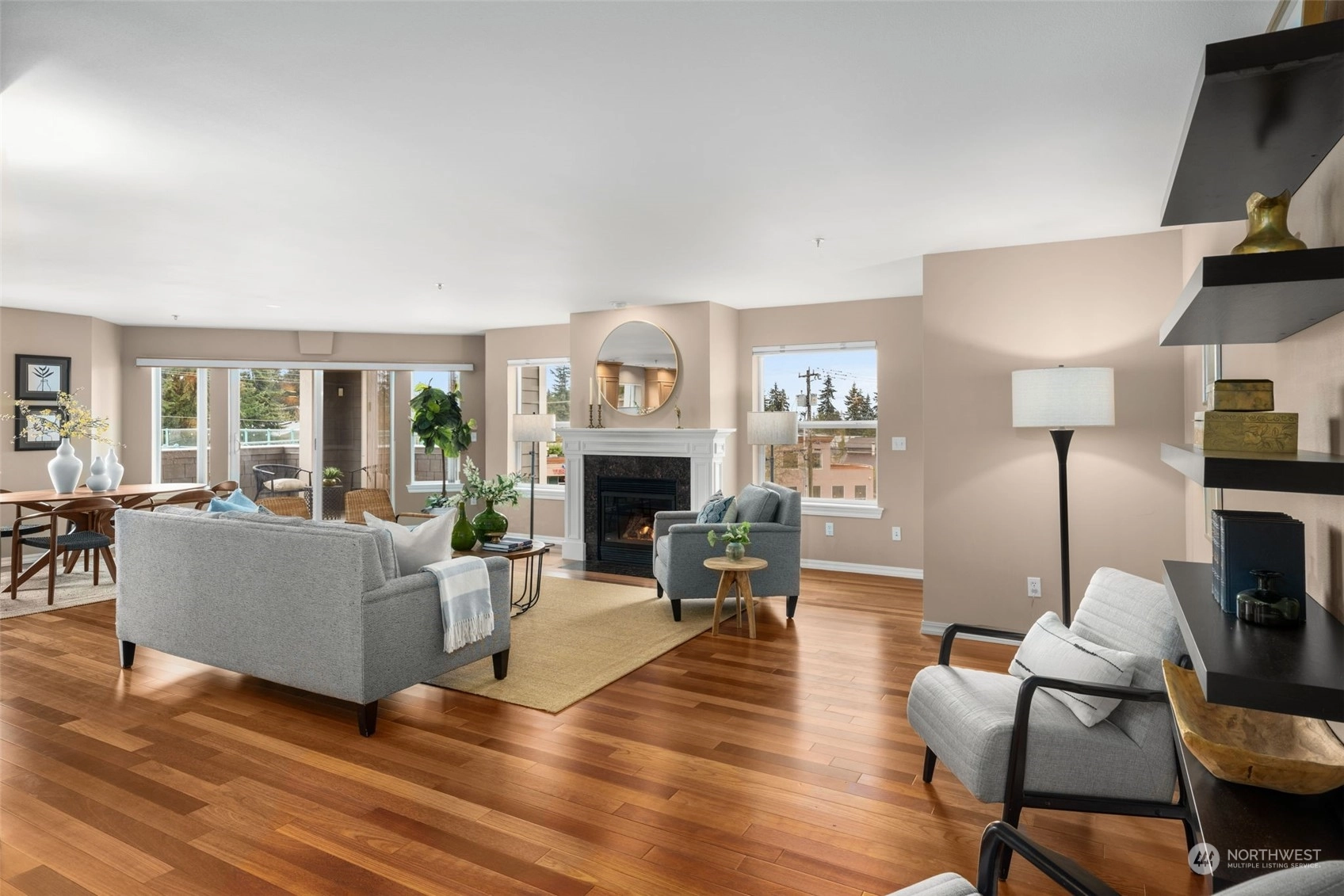 Stunning top floor condo with soaring Olympic Mountain views in coveted Richmond Beach. Enjoy single level living with easy elevator access. This SW-facing, light-filled home is an all-season retreat, featuring nearly 2,000 sf of gracious living space, with an inviting, open living & dining area + kitchen with breakfast bar, stainless appliances & beautiful hardwoods. Enjoy summer sunsets from your view deck or quiet evenings in by the gas fireplace. Home features 2 bedrooms + den/office & 2 baths incl. a primary suite with THE walk-in closet & en-suite bath. RARE bonuses: 2 secure garage parking spaces & a 200 sf storage room for all the extras. Stroll to Richmond Beach, shops, eateries & to all your new favorite neighborhood haunts!