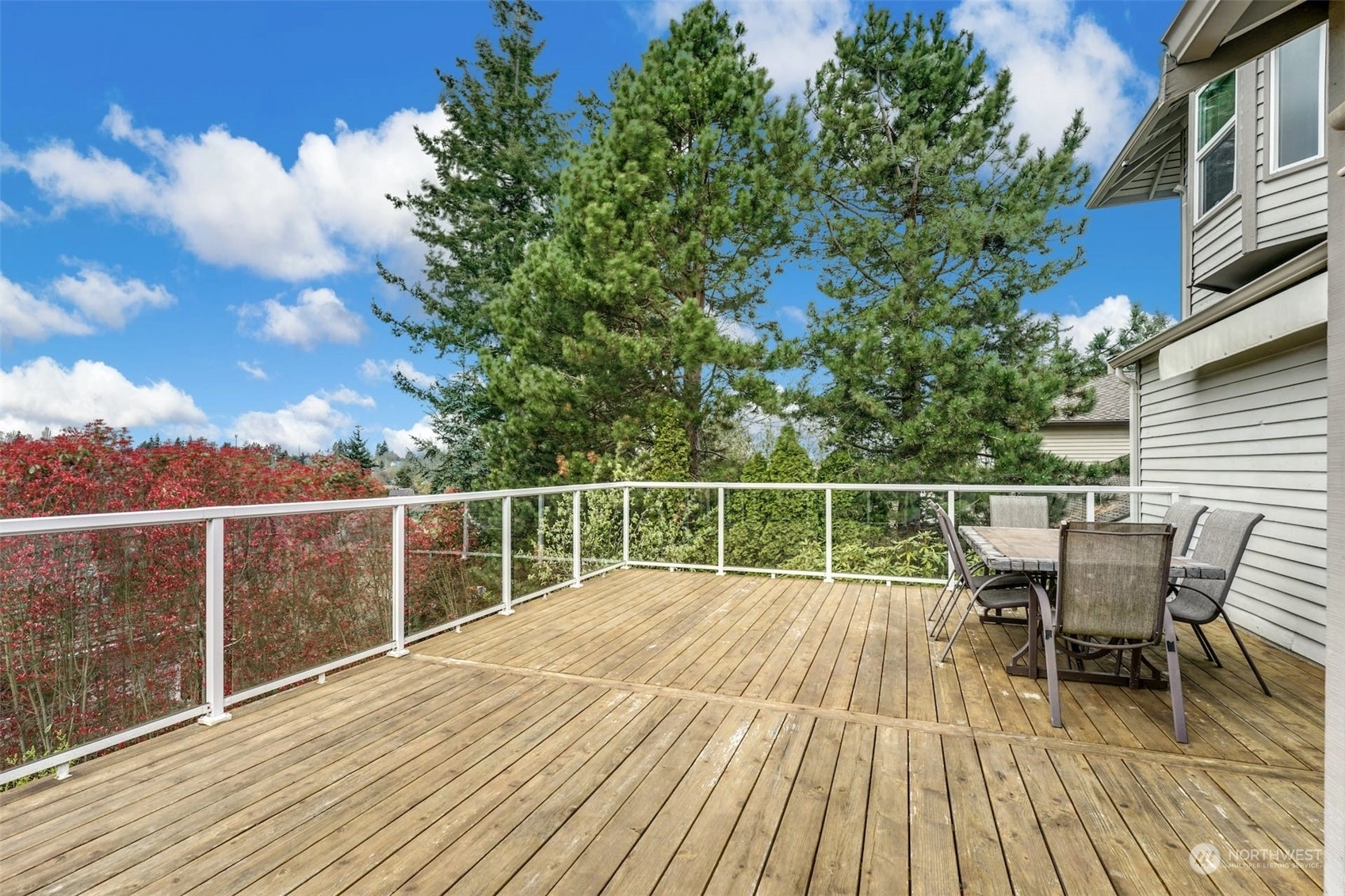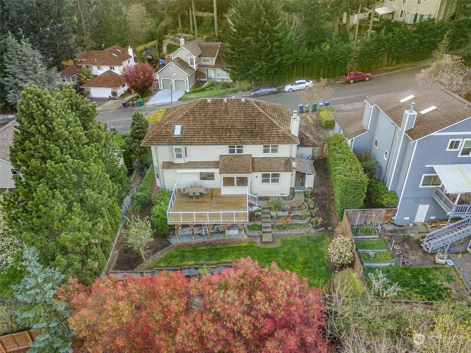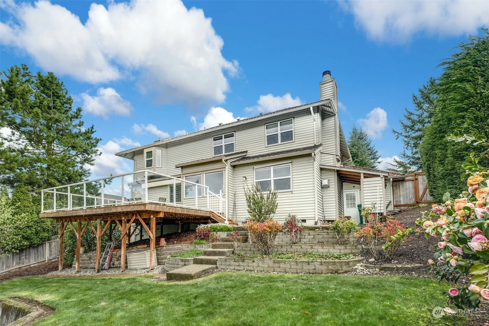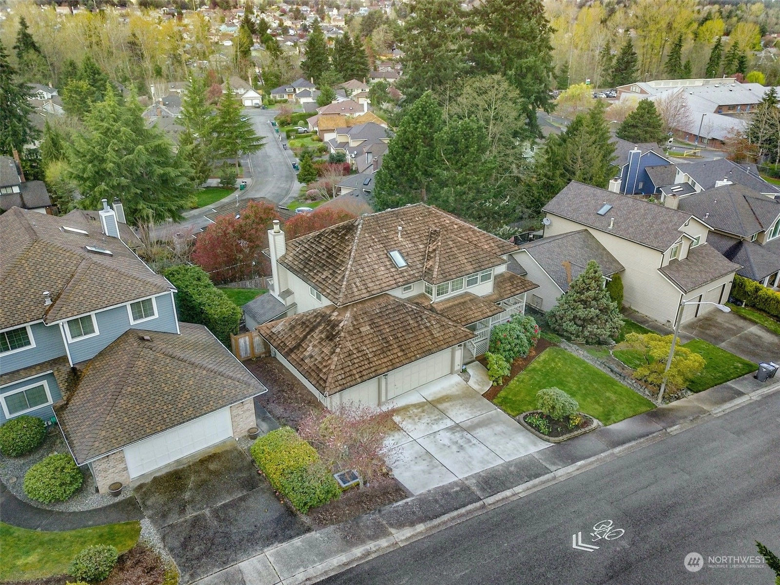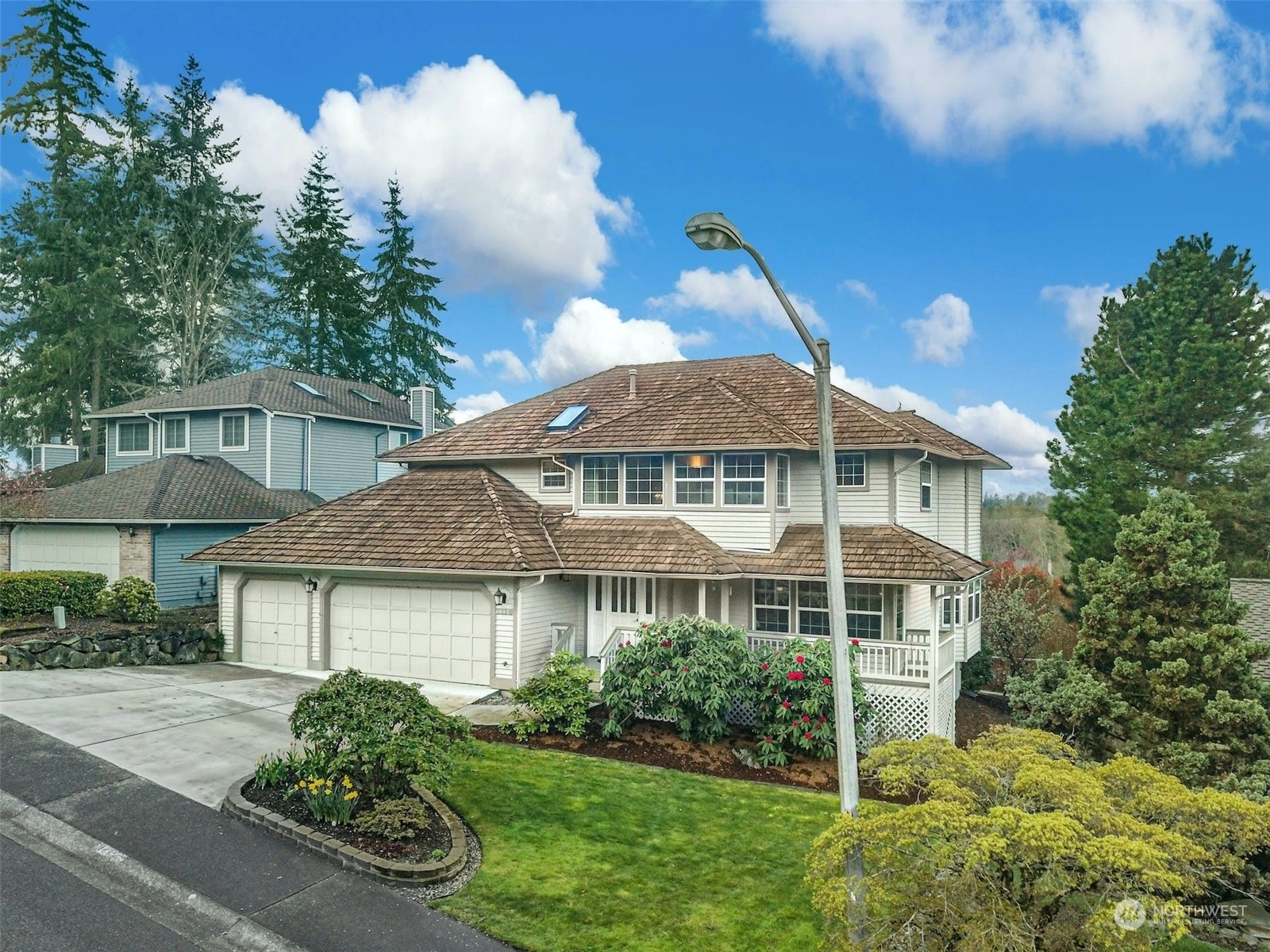 Beautifully maintained home in West Campus with 3 car attached garage (most in this neighborhood have 2 car garages), mature landscaping and great territorial/peak-a-boo view of Olypic Mts. Main floor has large new kitchen with modern cabinets (Craftmaid) from Italy, solid surface counters and high end stainless appliances (Stove is DACOR). Hardwood floors in entry, kitchen and family room. Upper floor boasts huge primary en-suite with double walk in closets plus 3 additional bedrooms and full guest bath. Large deck off living area has glass railings and automatic awning. Front and back sprinkler systems complete this move-in ready home!