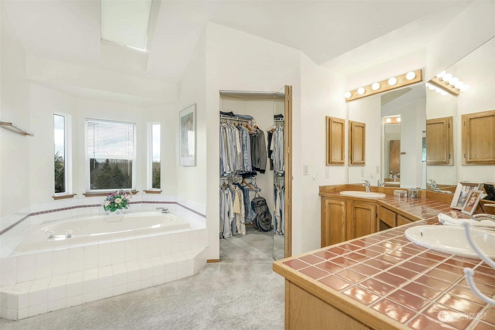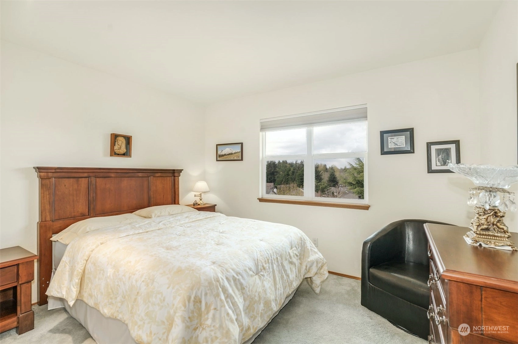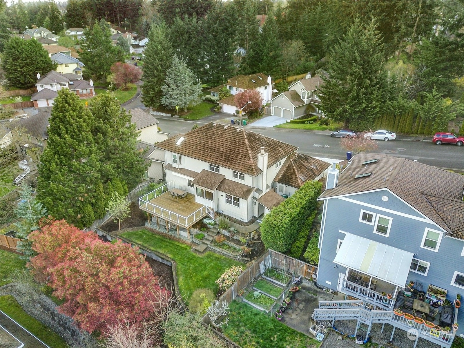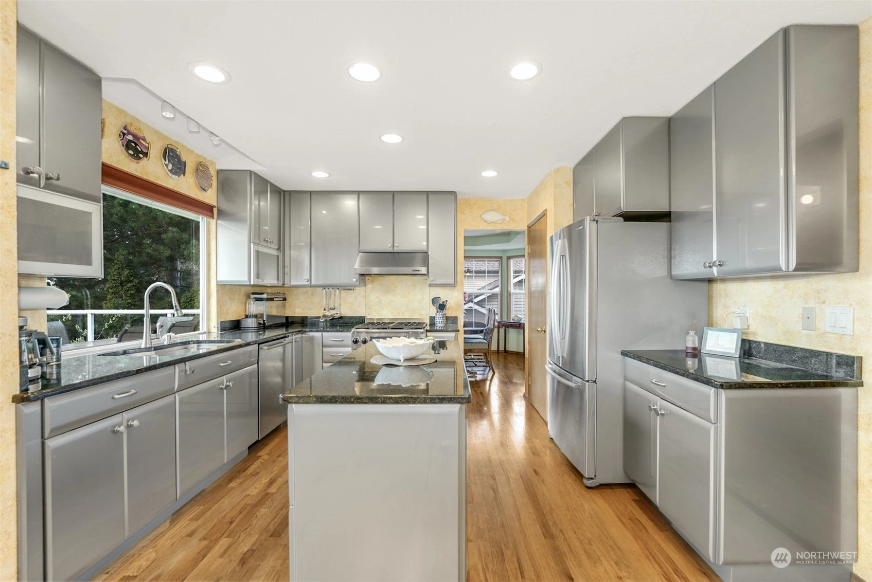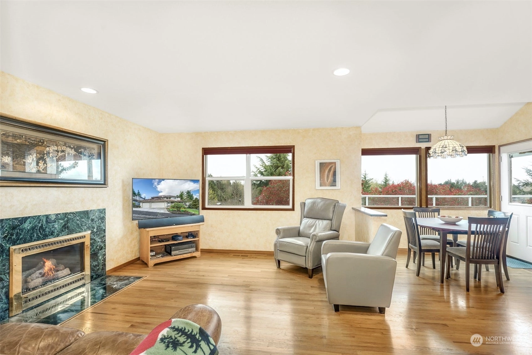 Beautifully maintained home in West Campus with 3 car attached garage (most in this neighborhood have 2 car garages), mature landscaping and great territorial/peak-a-boo view of Olypic Mts. Main floor has large new kitchen with modern cabinets (Craftmaid) from Italy, solid surface counters and high end stainless appliances (Stove is DACOR). Hardwood floors in entry, kitchen and family room. Upper floor boasts huge primary en-suite with double walk in closets plus 3 additional bedrooms and full guest bath. Large deck off living area has glass railings and automatic awning. Front and back sprinkler systems complete this move-in ready home!
