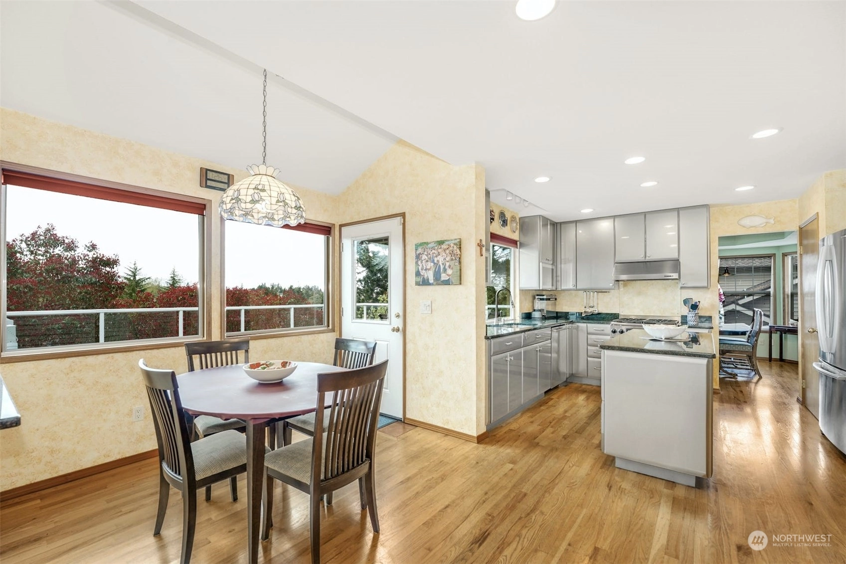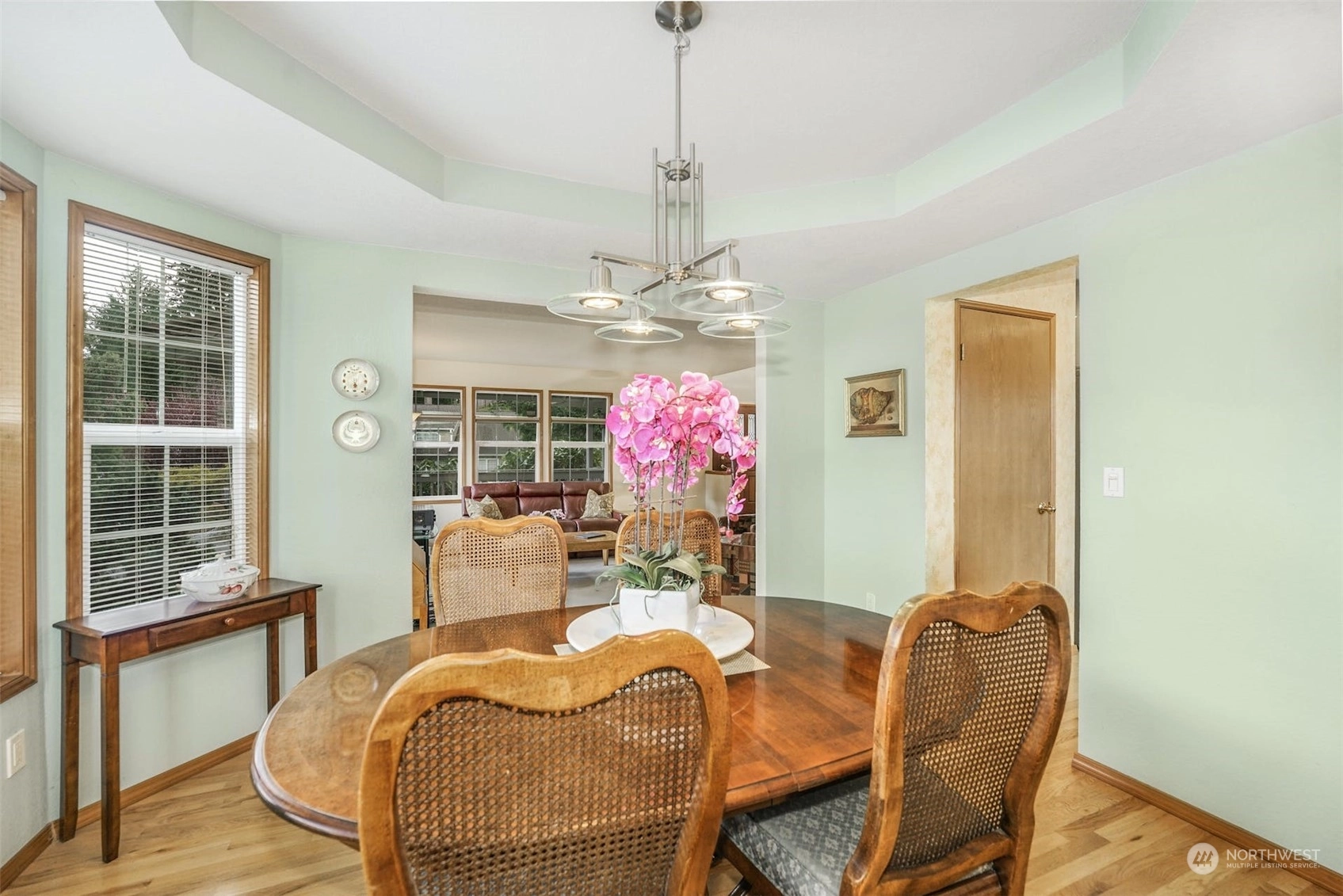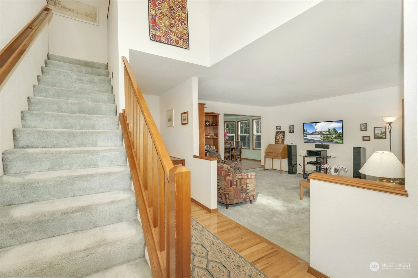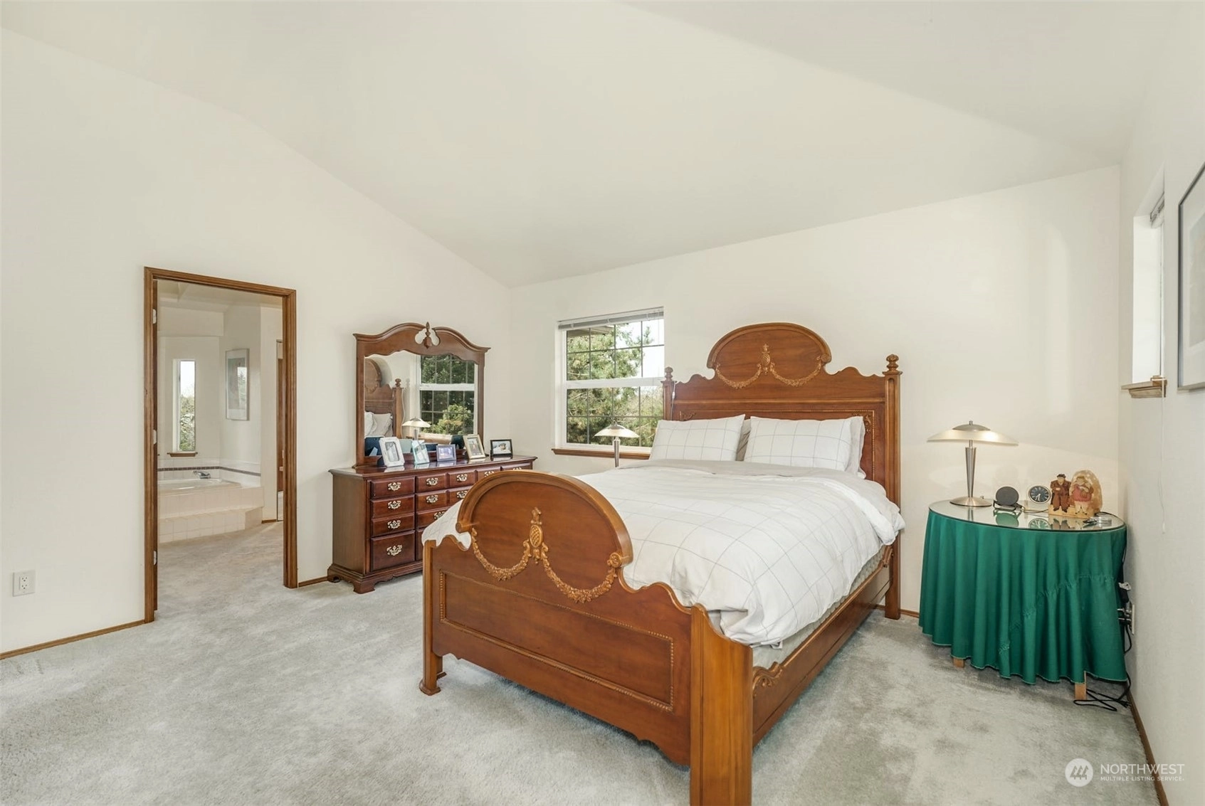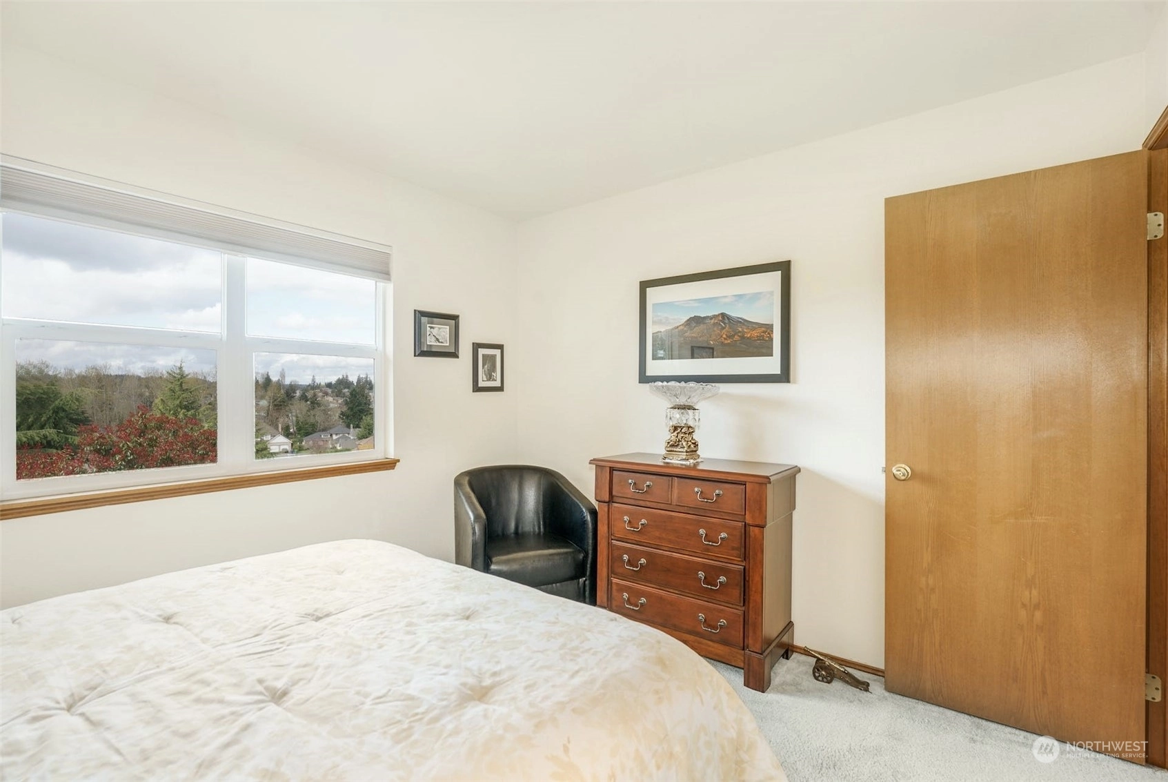 Beautifully maintained home in West Campus with 3 car attached garage (most in this neighborhood have 2 car garages), mature landscaping and great territorial/peak-a-boo view of Olypic Mts. Main floor has large new kitchen with modern cabinets (Craftmaid) from Italy, solid surface counters and high end stainless appliances (Stove is DACOR). Hardwood floors in entry, kitchen and family room. Upper floor boasts huge primary en-suite with double walk in closets plus 3 additional bedrooms and full guest bath. Large deck off living area has glass railings and automatic awning. Front and back sprinkler systems complete this move-in ready home!