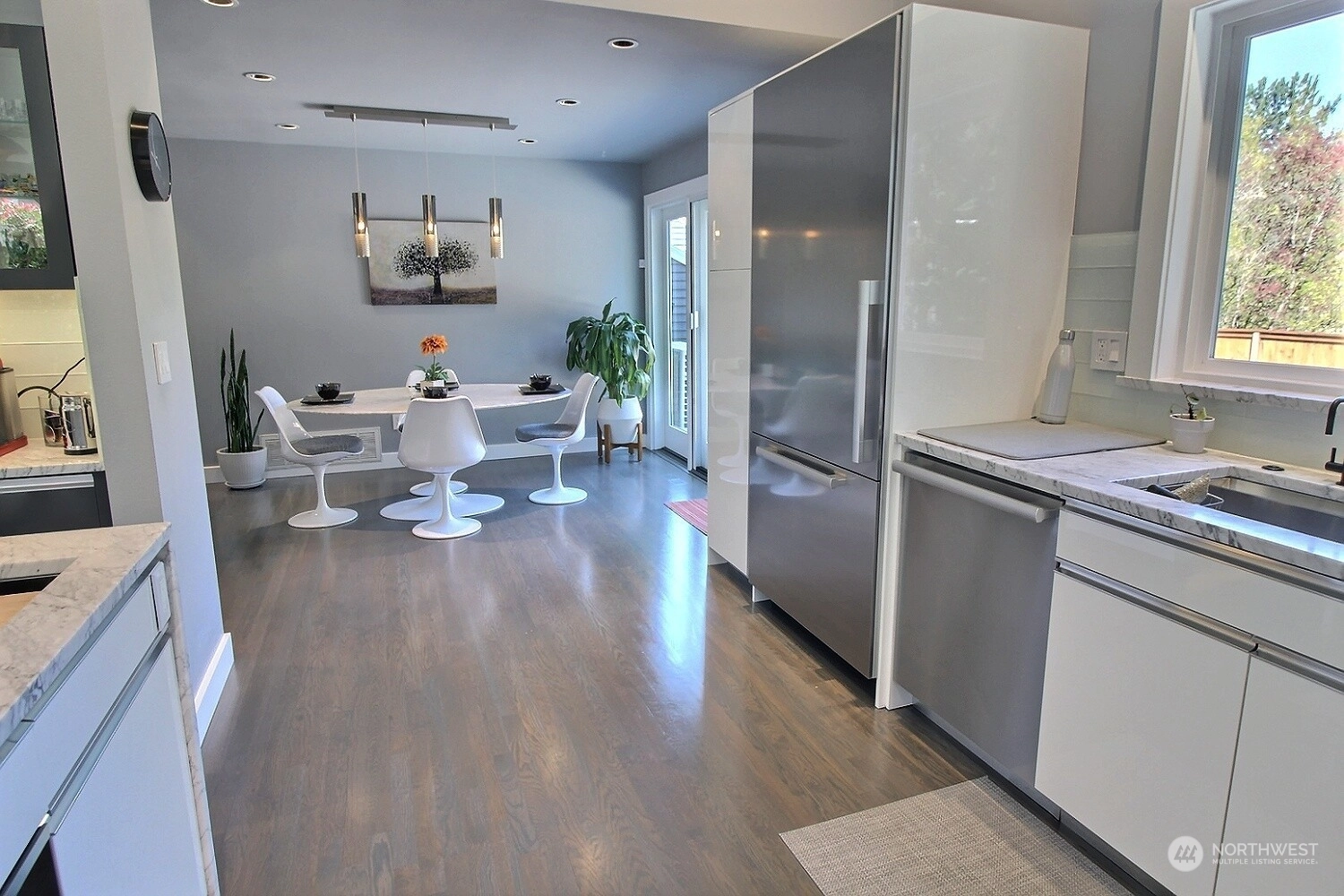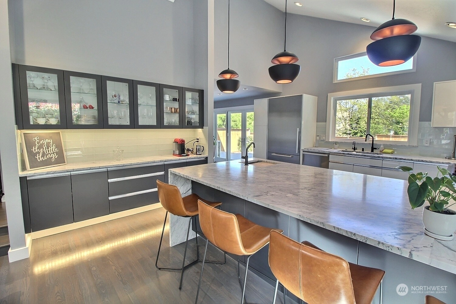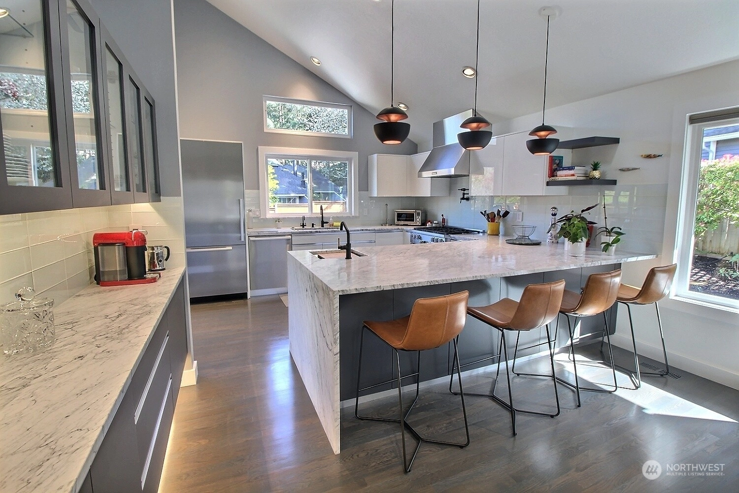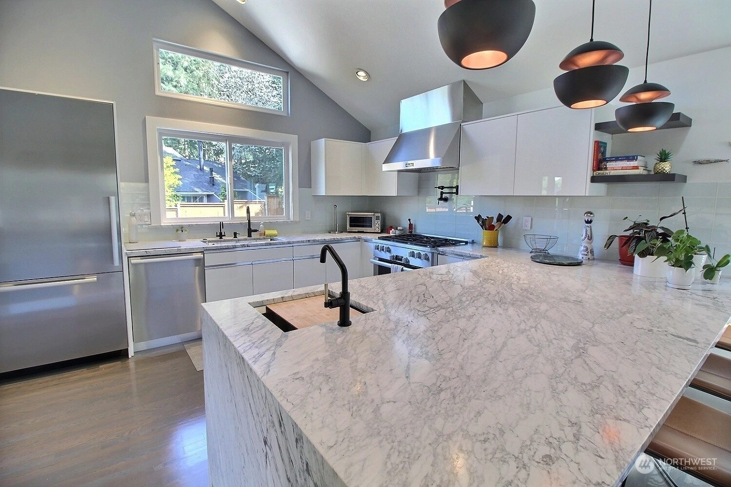 This stunning property boasts a complete Miele Chef's kitchen, equipped with top-of-the-line appliances and luxurious Carrera marble slabs. The custom lacquer cabinets provide ample storage space while adding a touch of elegance. The ¾" red oak floors throughout the home add character, while the powered Hunter Douglas blinds and Milgard triple pane windows with UV protection offer both privacy and energy efficiency. Cozy up in front of the majestic fireplace surrounded by Dal porcelain tile with remote and thermostat, perfect for chilly nights. The bathrooms feature quartz countertops, updated sinks and tile. The home is equipped with a Mr. Cool 28000 BTU split unit. And Much More! Don't miss your chance to live in this well-appointed home!