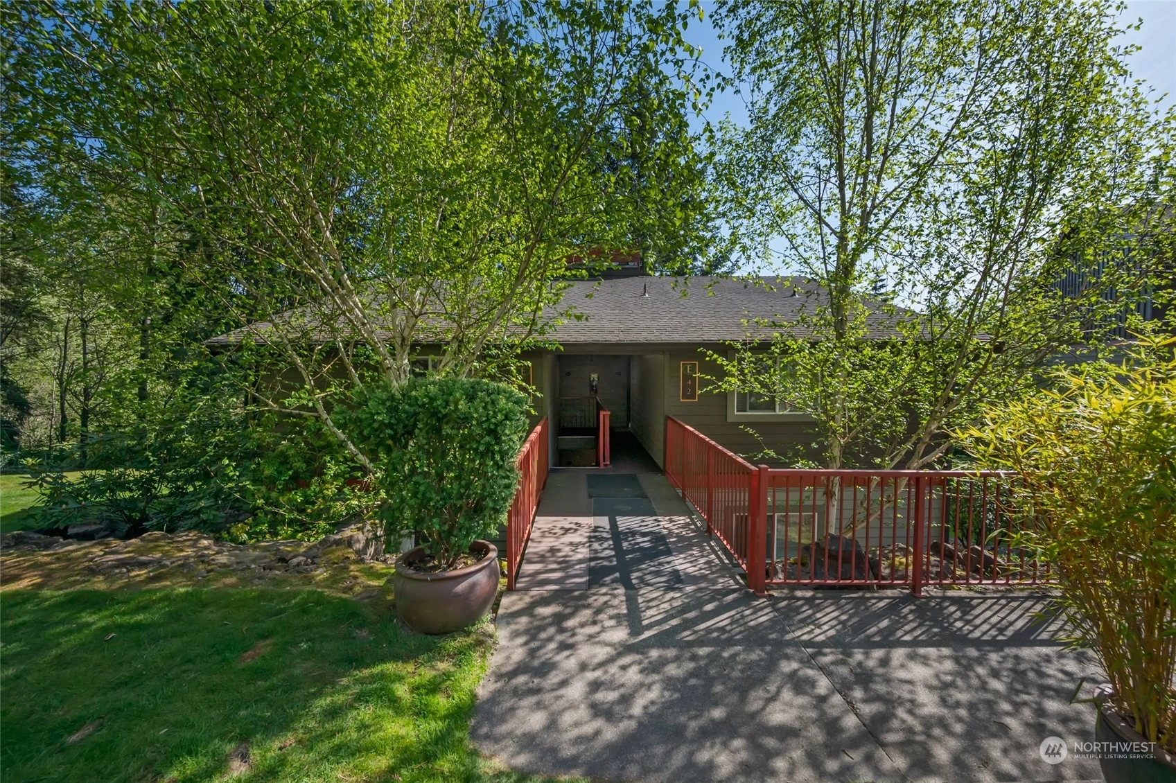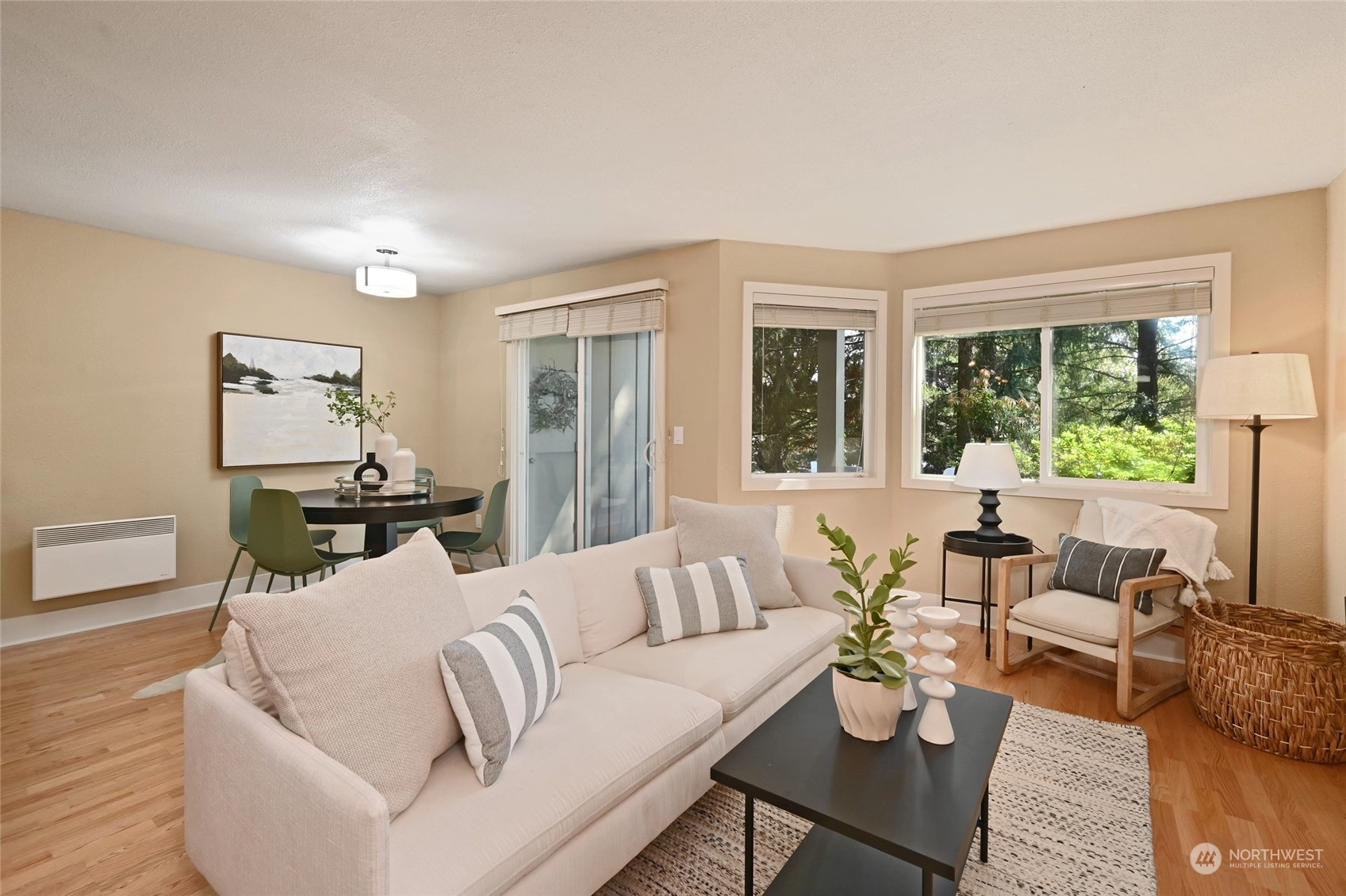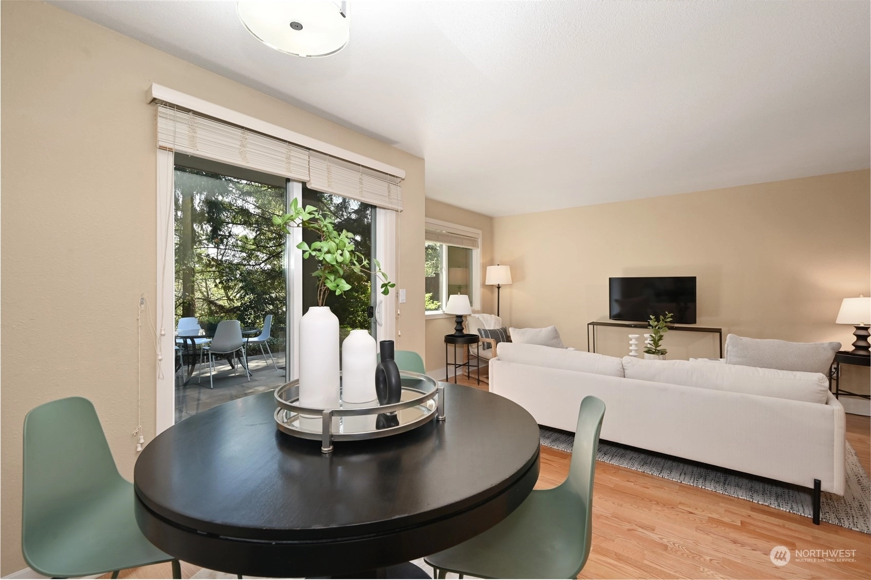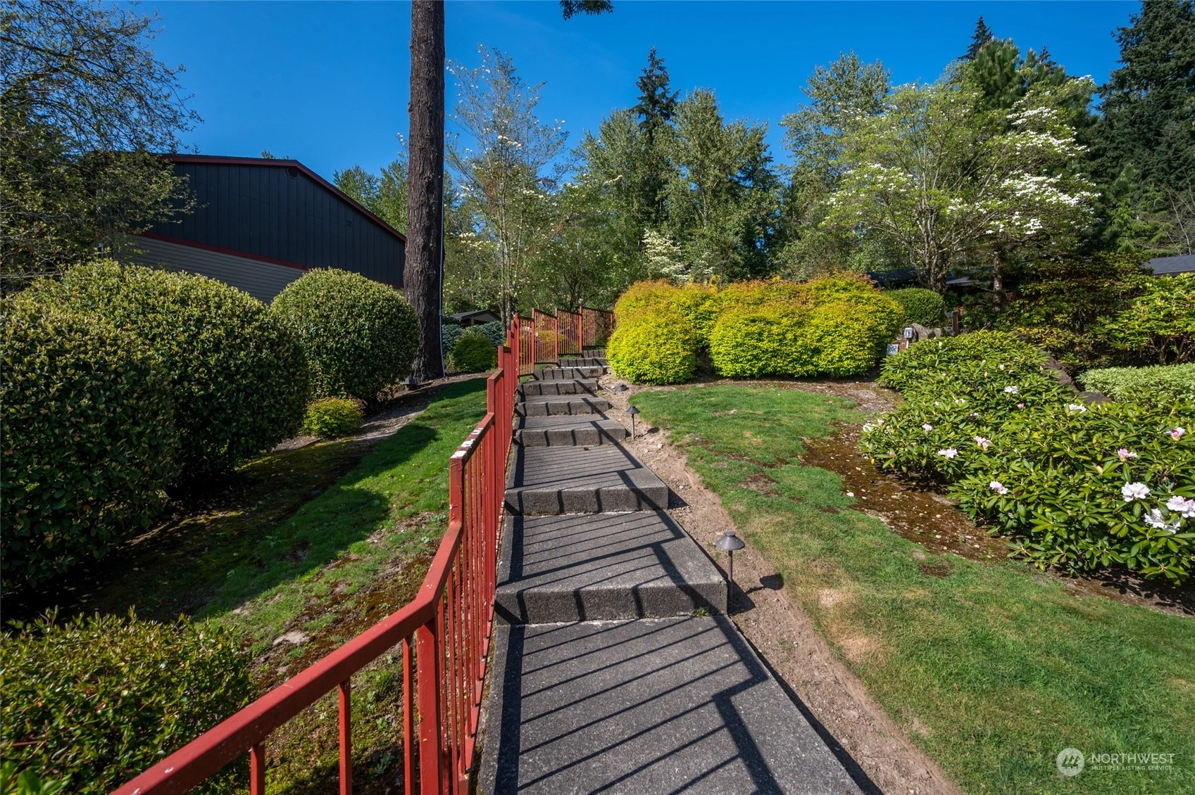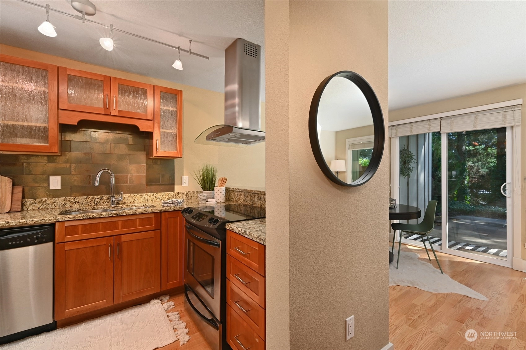 Looking for a tranquil 'turnkey' space? This is a must see for all of you condo dwellers looking for privacy, a large patio and amazing outdoor space! There are so many great features here! Gorgeous [real oak] hardwood floors throughout, a cozy wood burning fireplace, and a nice size kitchen with stainless appliances. A slider opens out to nature... imagine breakfast 'al fresco' before a busy day! Excellent location, just minutes to either DT Kirkland or DT Bellevue and super easy access to 520 or 405. And if you prefer to walk, jog or ride your bicycle, the Corridor is literally steps from the door! Super low HOA dues too!