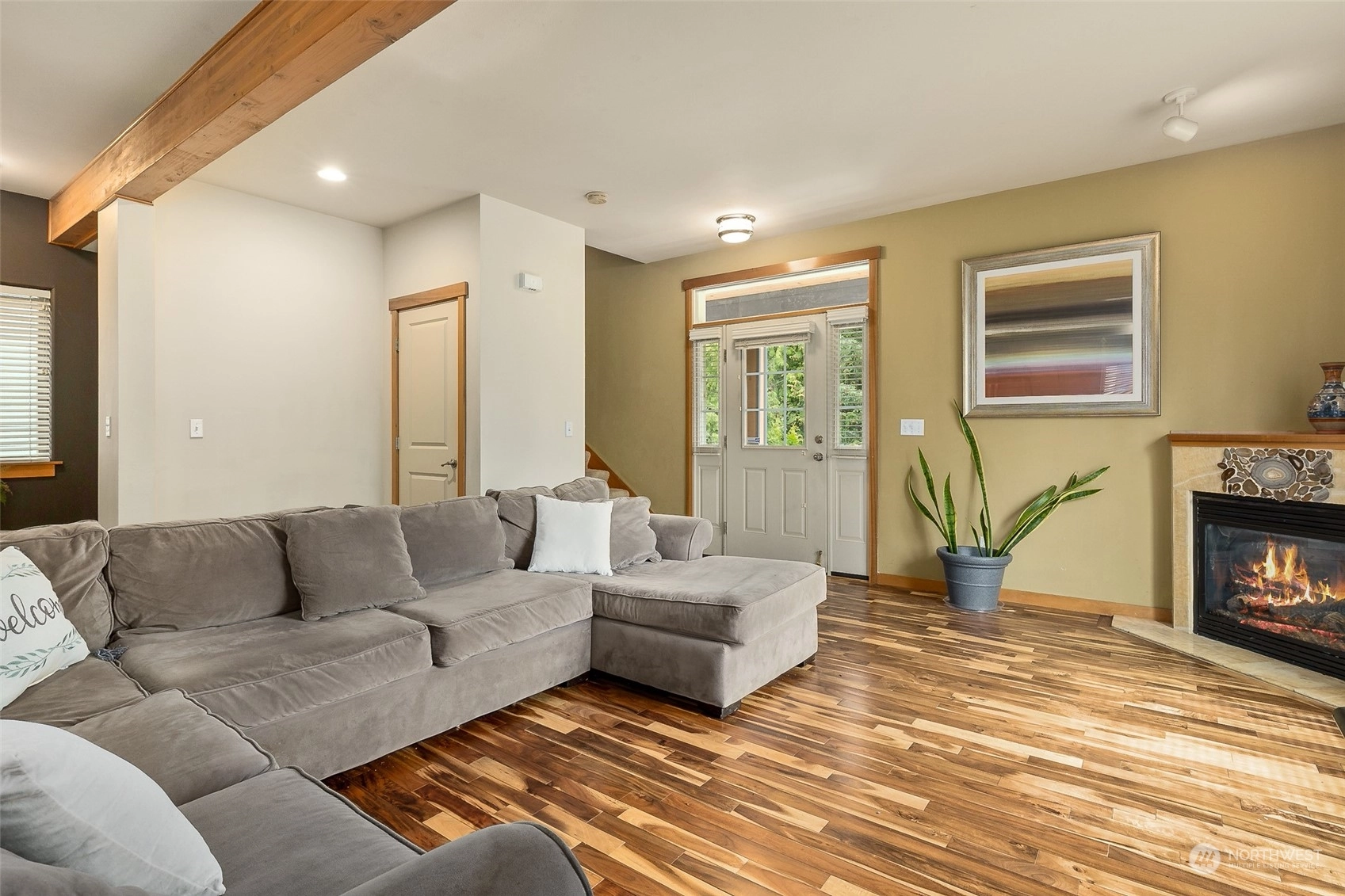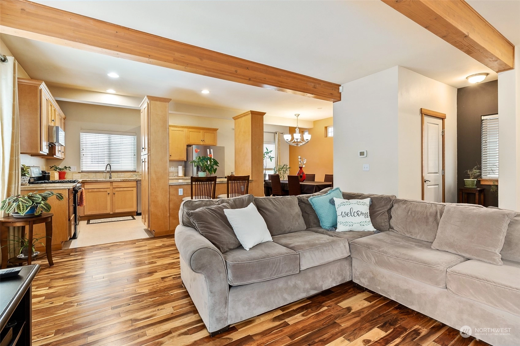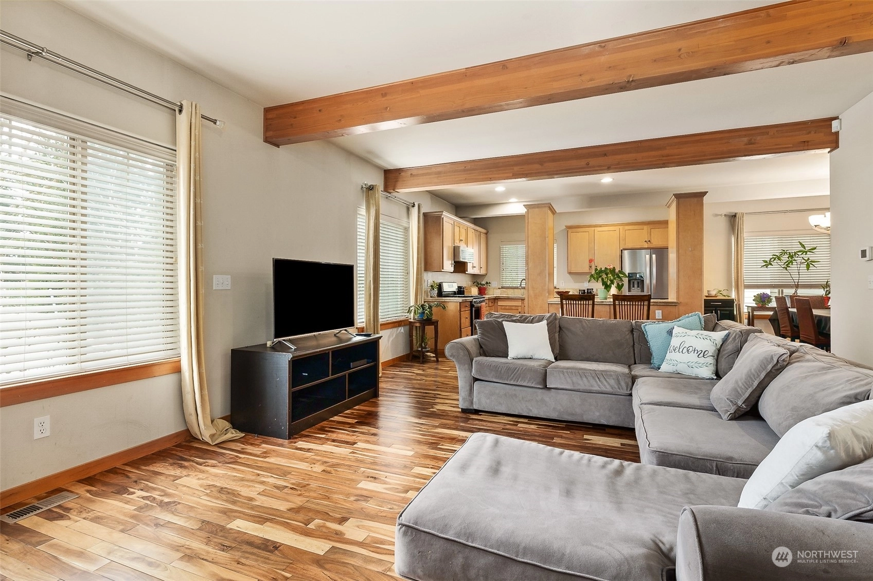 Rare opportunity in desirable Carriage Gardens! Tucked away at the end of a beautifully landcscaped, private enclave, you will find this well maintained Craftsman style home. As you enter, notice the quaint garden-style covered front porch- and then the great room, with impressive wood beamed ceilings and an abundance of windows and natural light. Main floor features gleaming hardwoods, a charming gas fireplace, spacious kitchen with breakfast bar, and formal dining room. Upstairs is your full primary suite, a 5-piece bath, 2 add'l bedrooms and main bath. Bonus room down, perfect for media/office/flex. Beautiful, professionally maintained gardens, fabulous location near the new Orange Line to Light Rail, and award winning Edmonds schools!