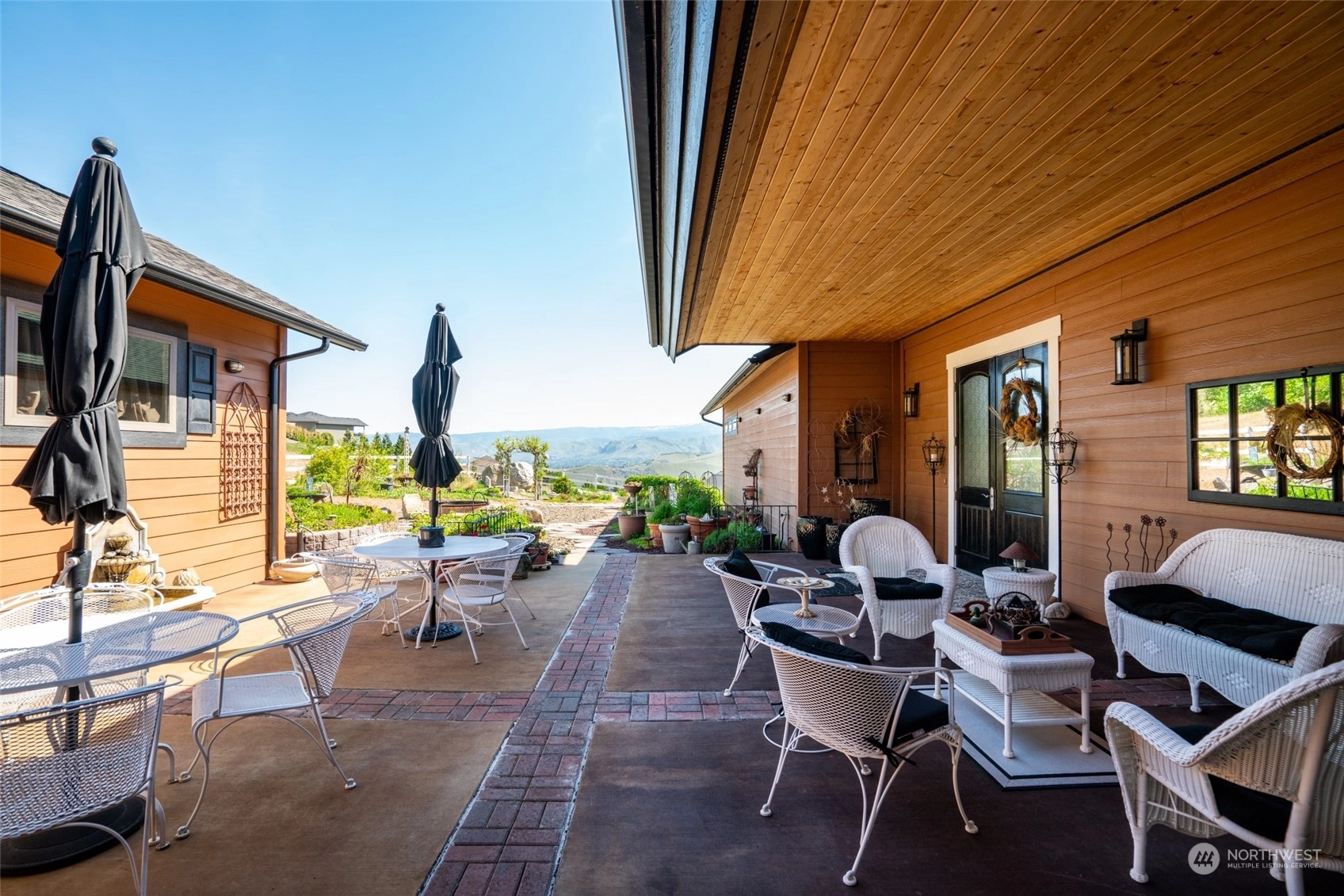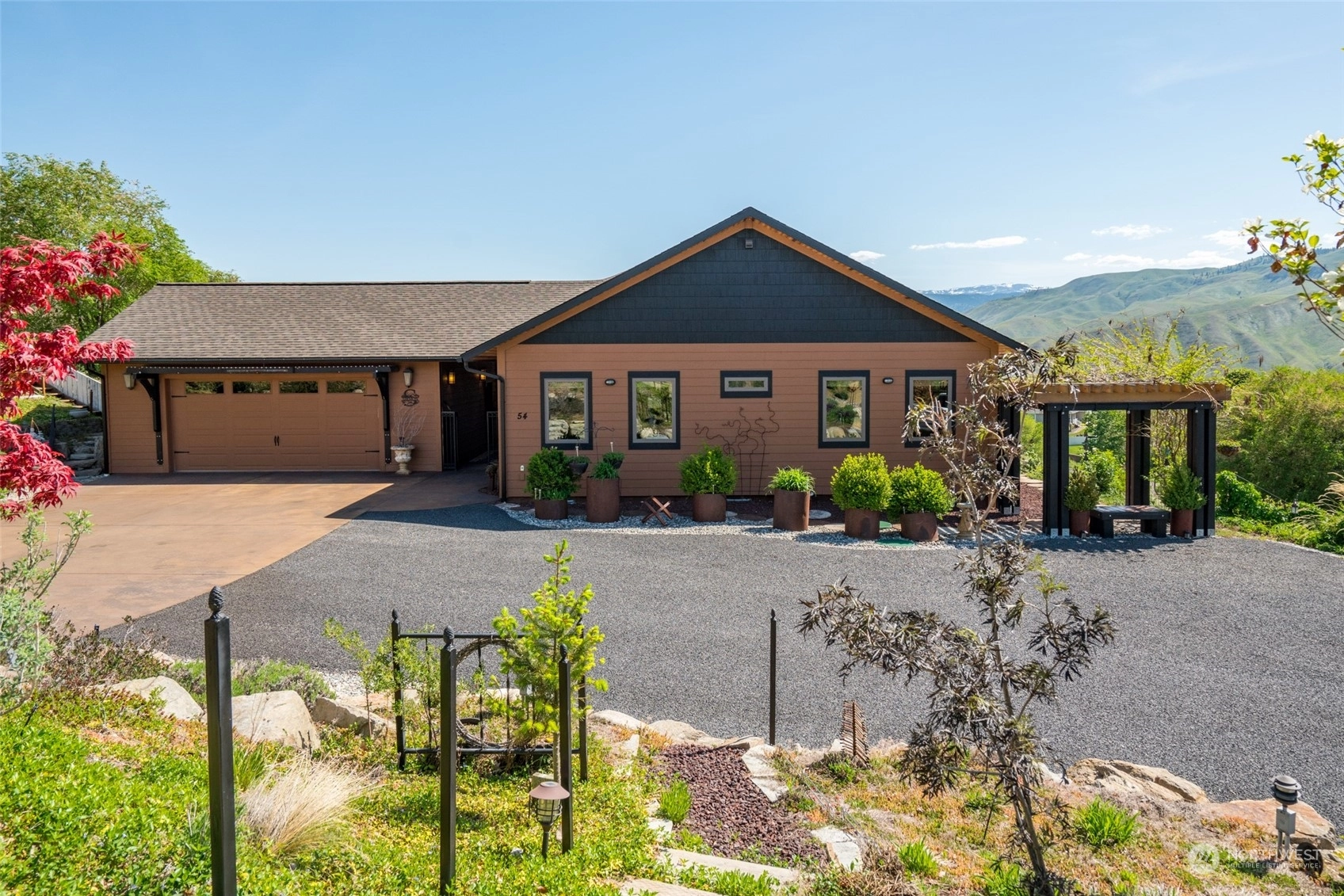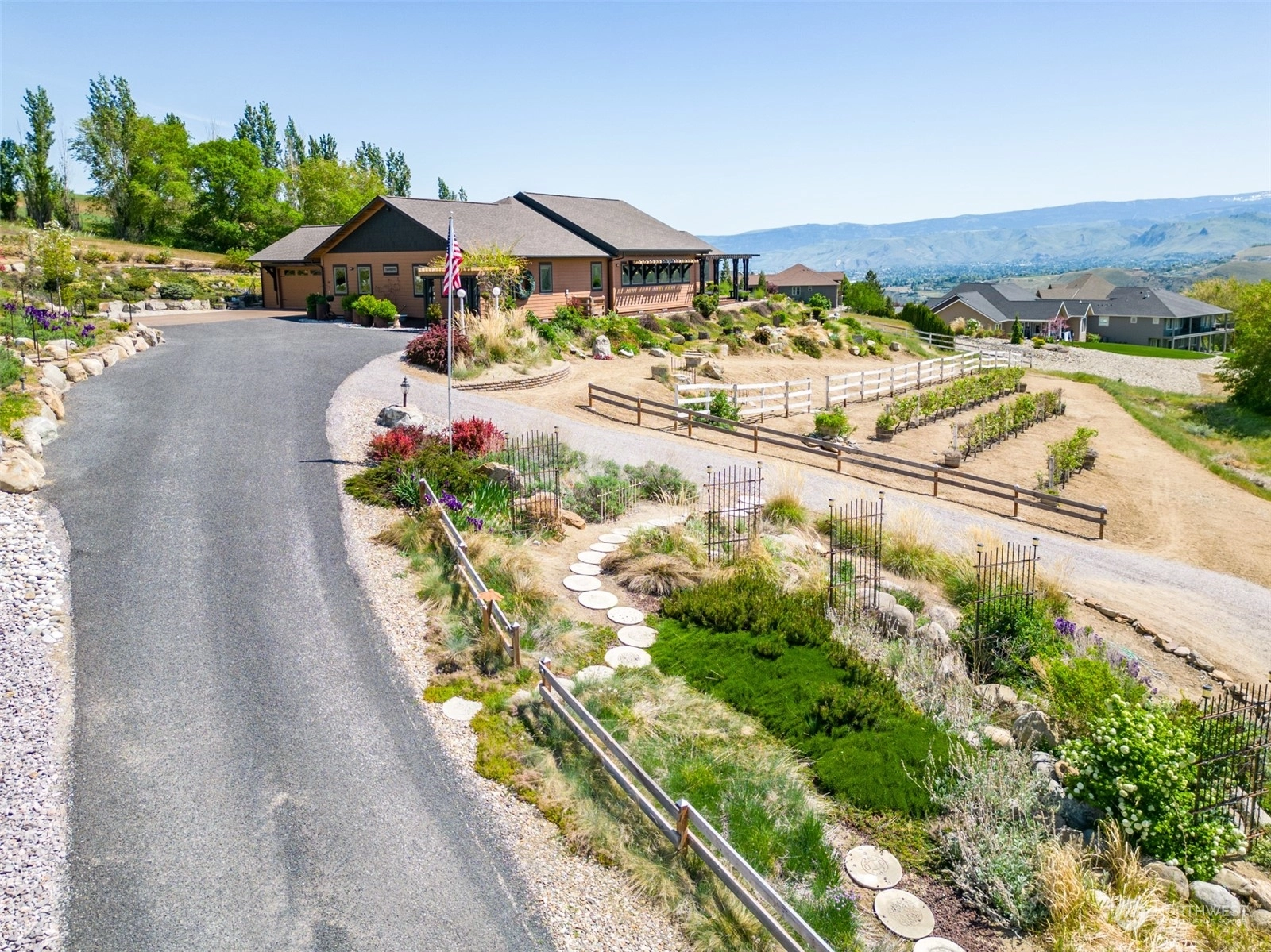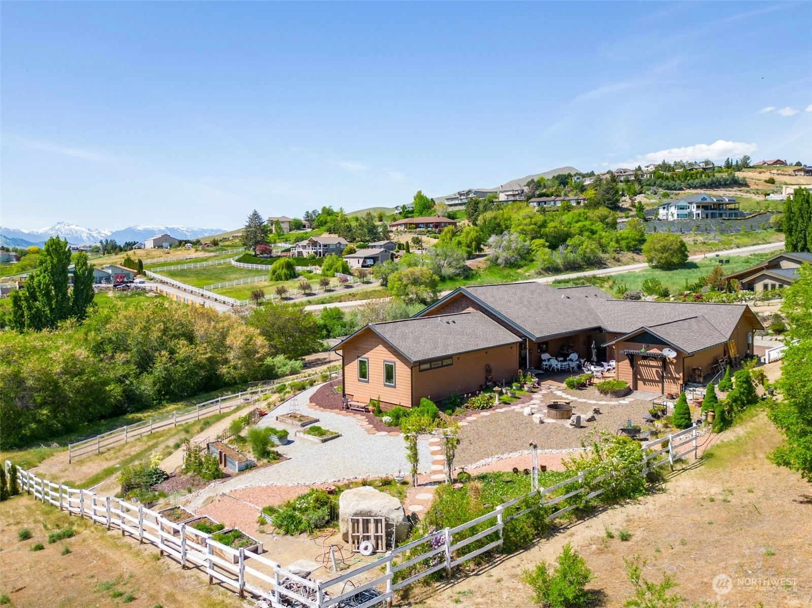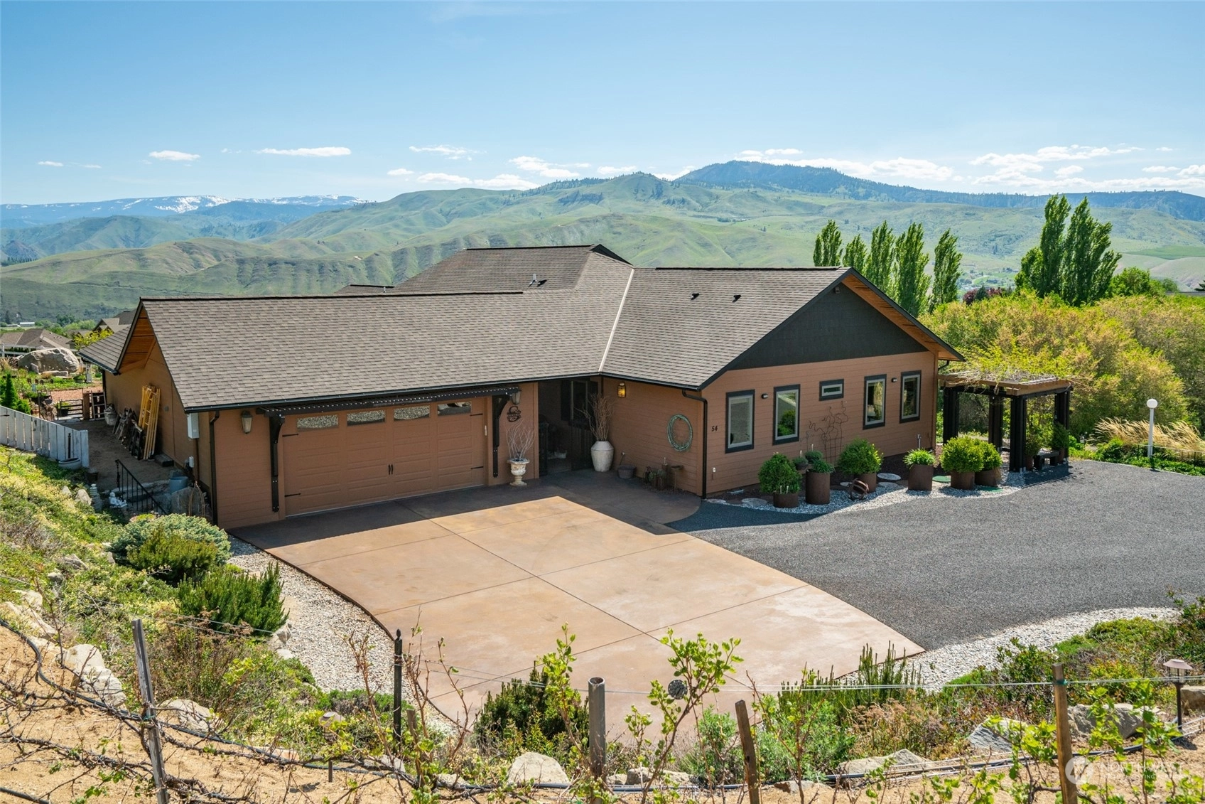 Quality custom built single level home w/ breathtaking Cascade Mtn views. 3-car garage/shop connected by breezeway, tandem bay w/ second garage door off back that is 47Ft deep. Outdoor living space is impeccable w/ expansive private patio & composite deck overlooking the garden & mountainscape. Impressive great room w/ wall of view windows, intricate beam ceilings & light filled kitchen w/ custom cabinetry, oversized island & pantry. Primary suite is spacious & situated on it's own wing of the home w/ captivating views & private bathroom w/ walk-in tile & glass shower & double sink vanity. Oversized laundry room w/ granite toped folding island, room for 2nd refer, custom cabinets & exterior access. Dedicated office room. Irrigation water.