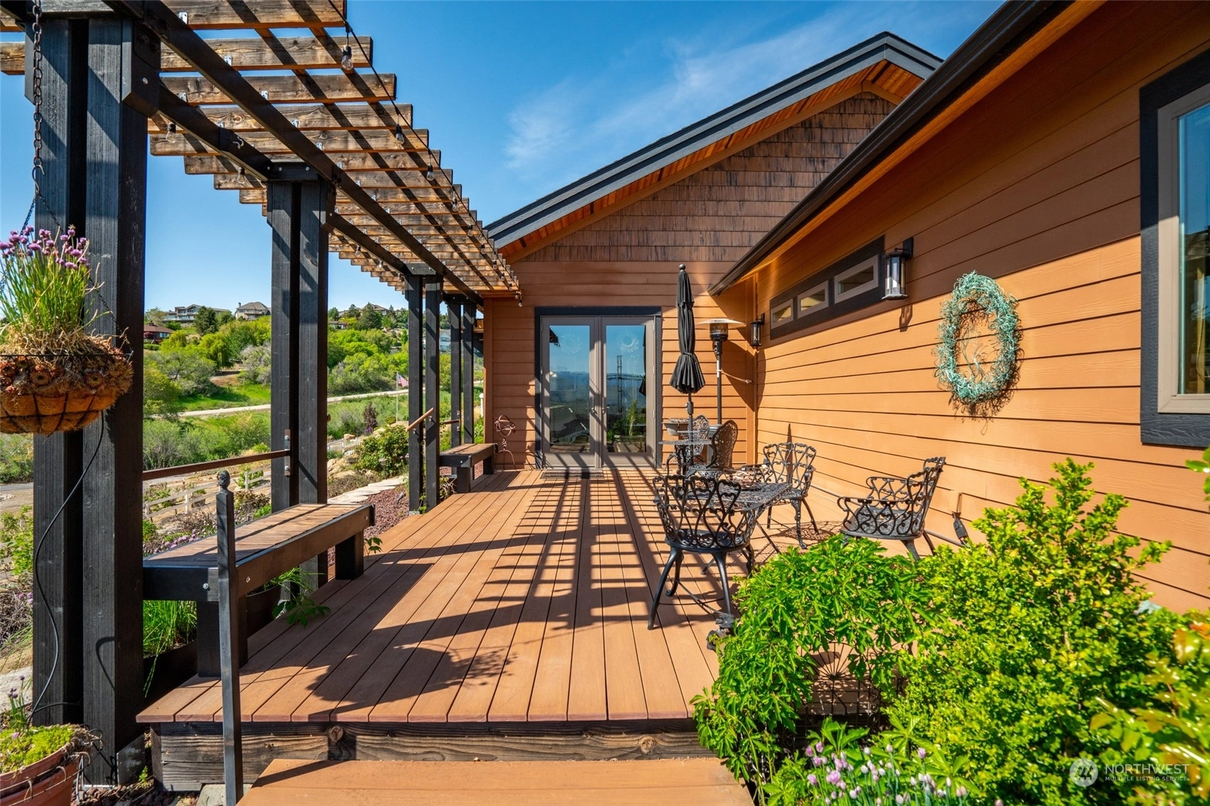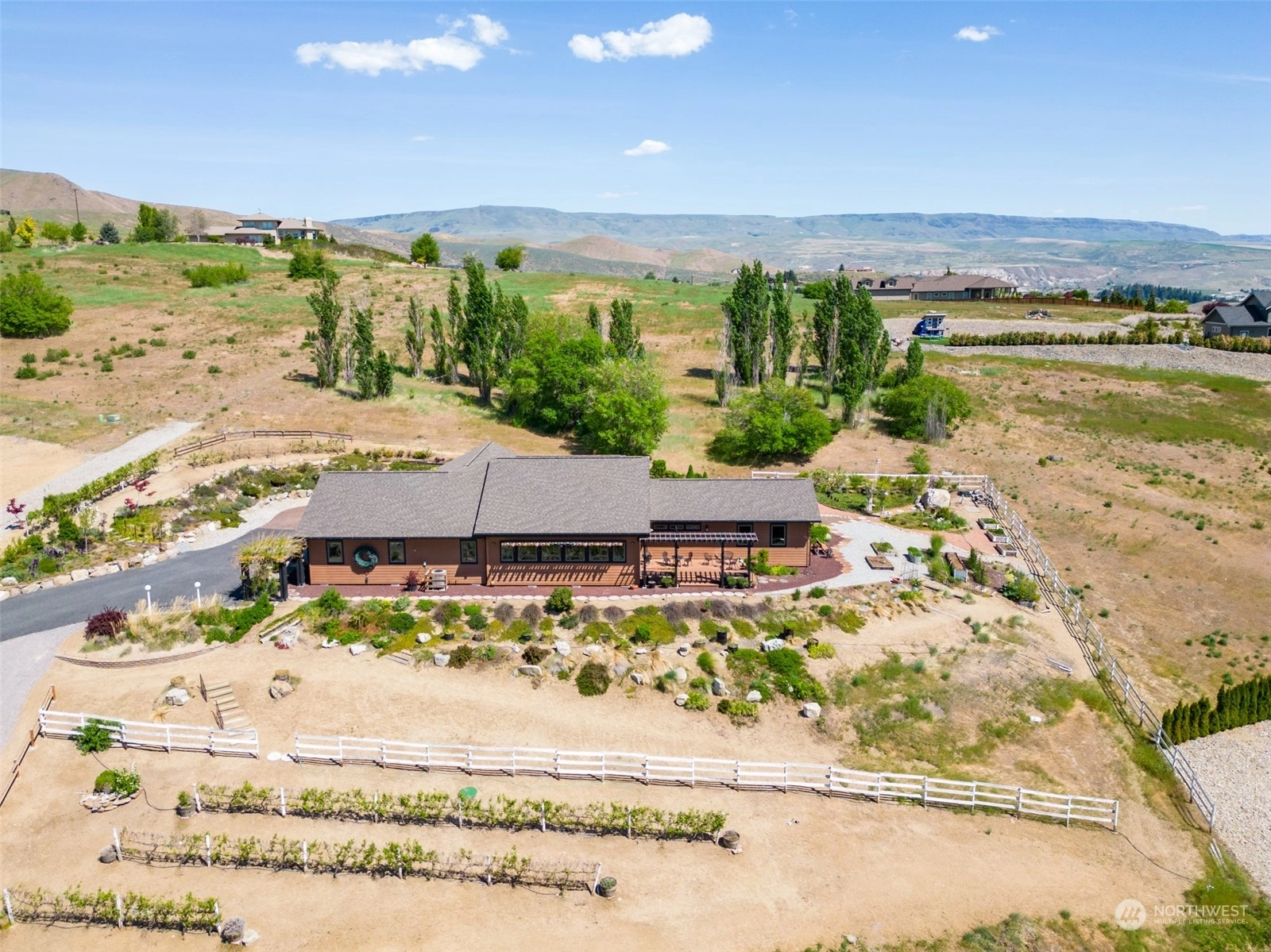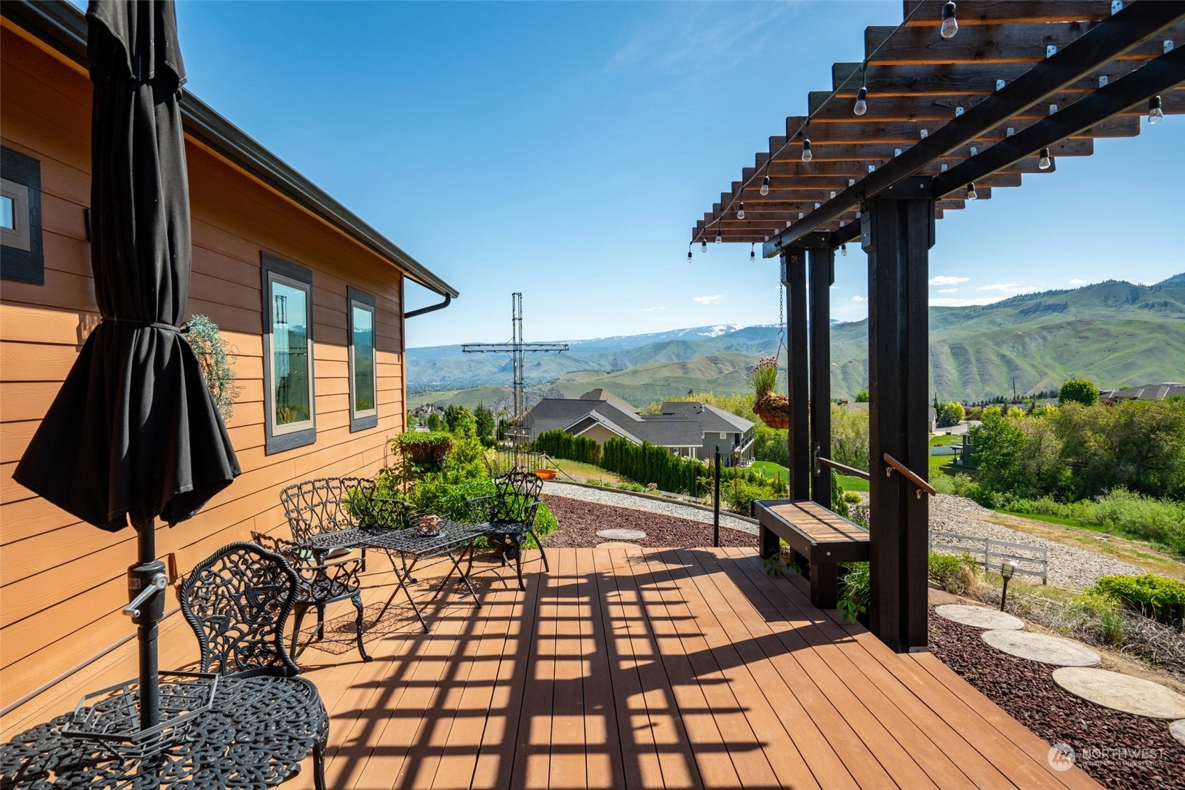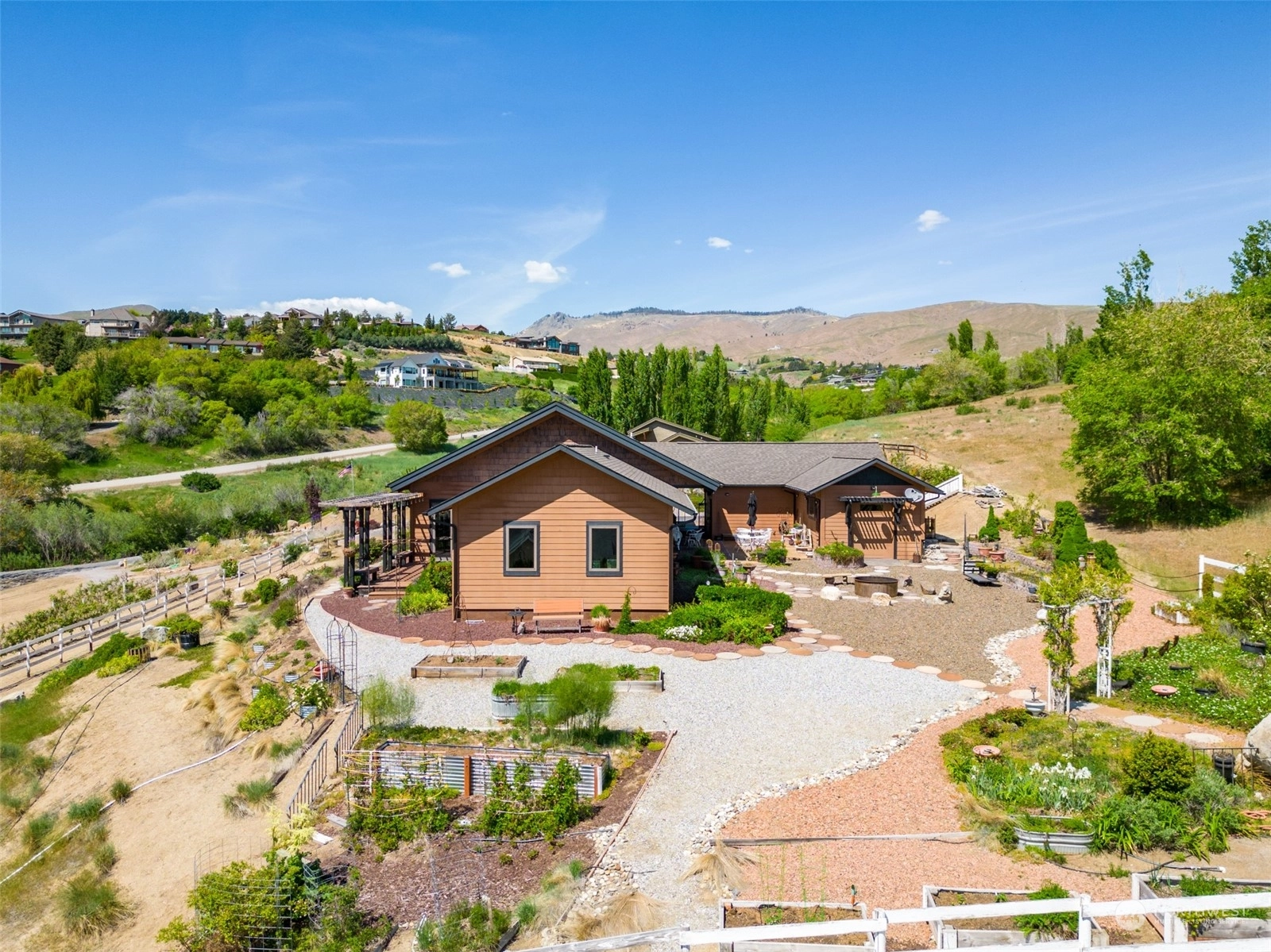 Quality custom built single level home w/ breathtaking Cascade Mtn views. 3-car garage/shop connected by breezeway, tandem bay w/ second garage door off back that is 47Ft deep. Outdoor living space is impeccable w/ expansive private patio & composite deck overlooking the garden & mountainscape. Impressive great room w/ wall of view windows, intricate beam ceilings & light filled kitchen w/ custom cabinetry, oversized island & pantry. Primary suite is spacious & situated on it's own wing of the home w/ captivating views & private bathroom w/ walk-in tile & glass shower & double sink vanity. Oversized laundry room w/ granite toped folding island, room for 2nd refer, custom cabinets & exterior access. Dedicated office room. Irrigation water.