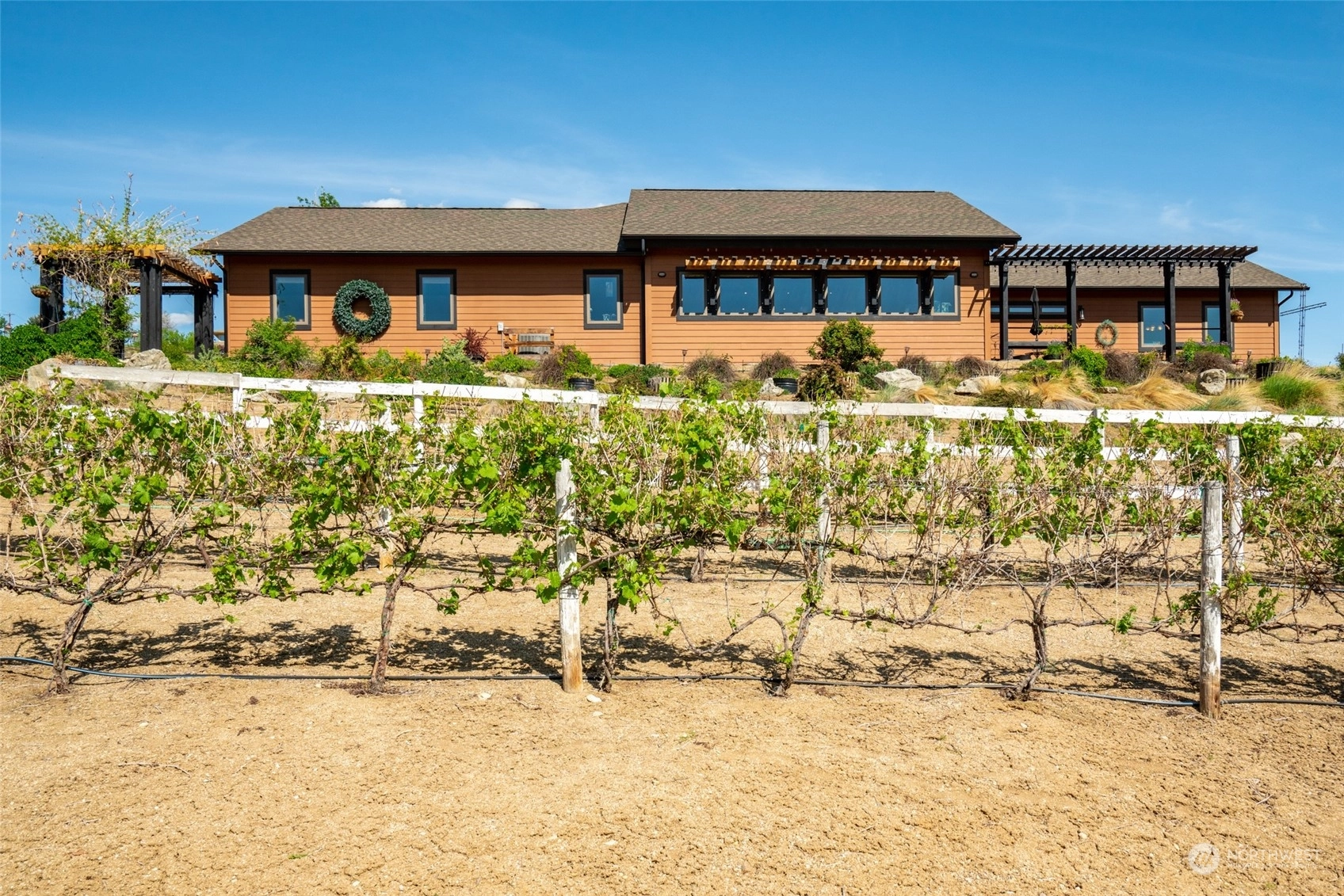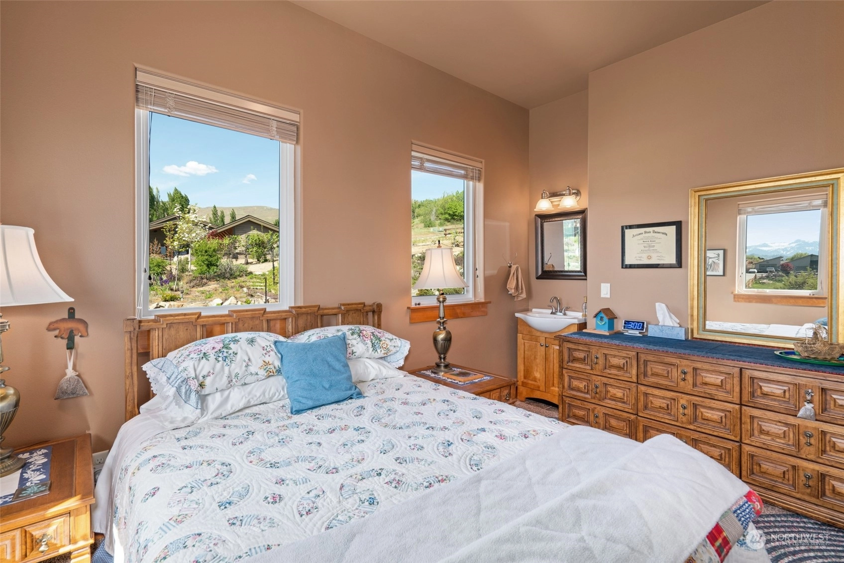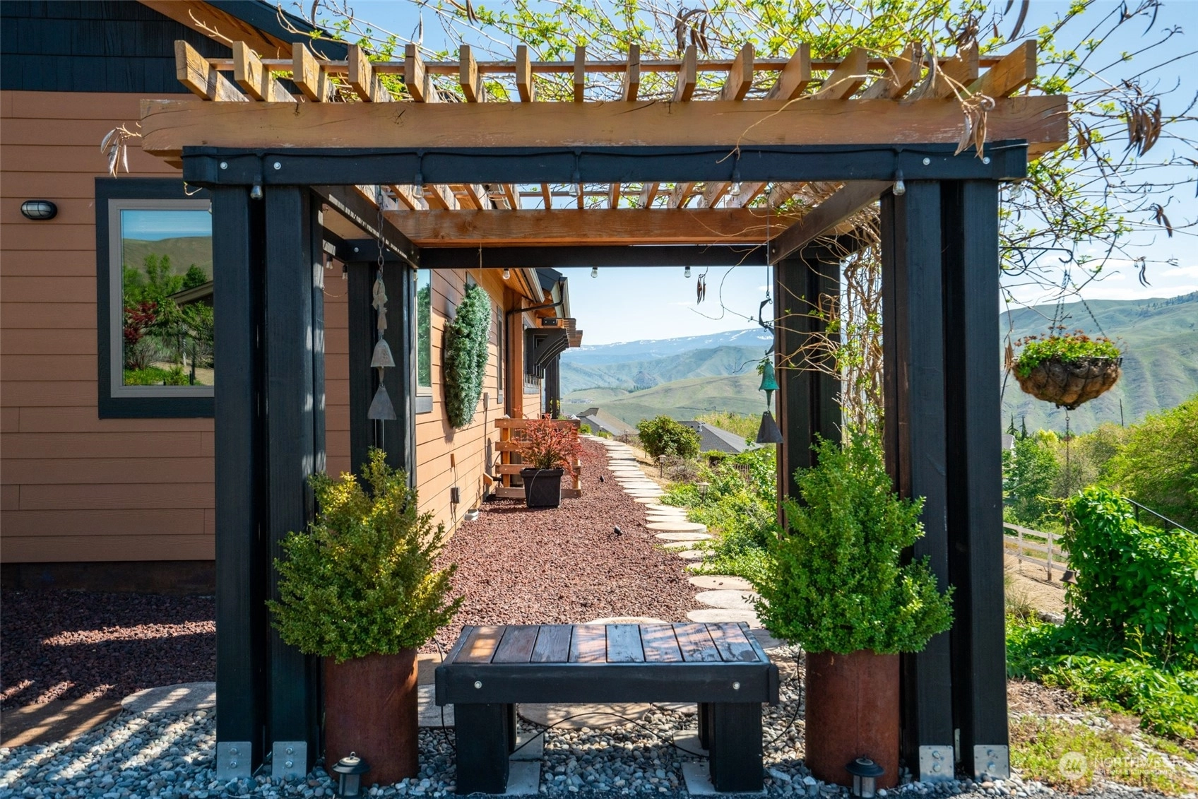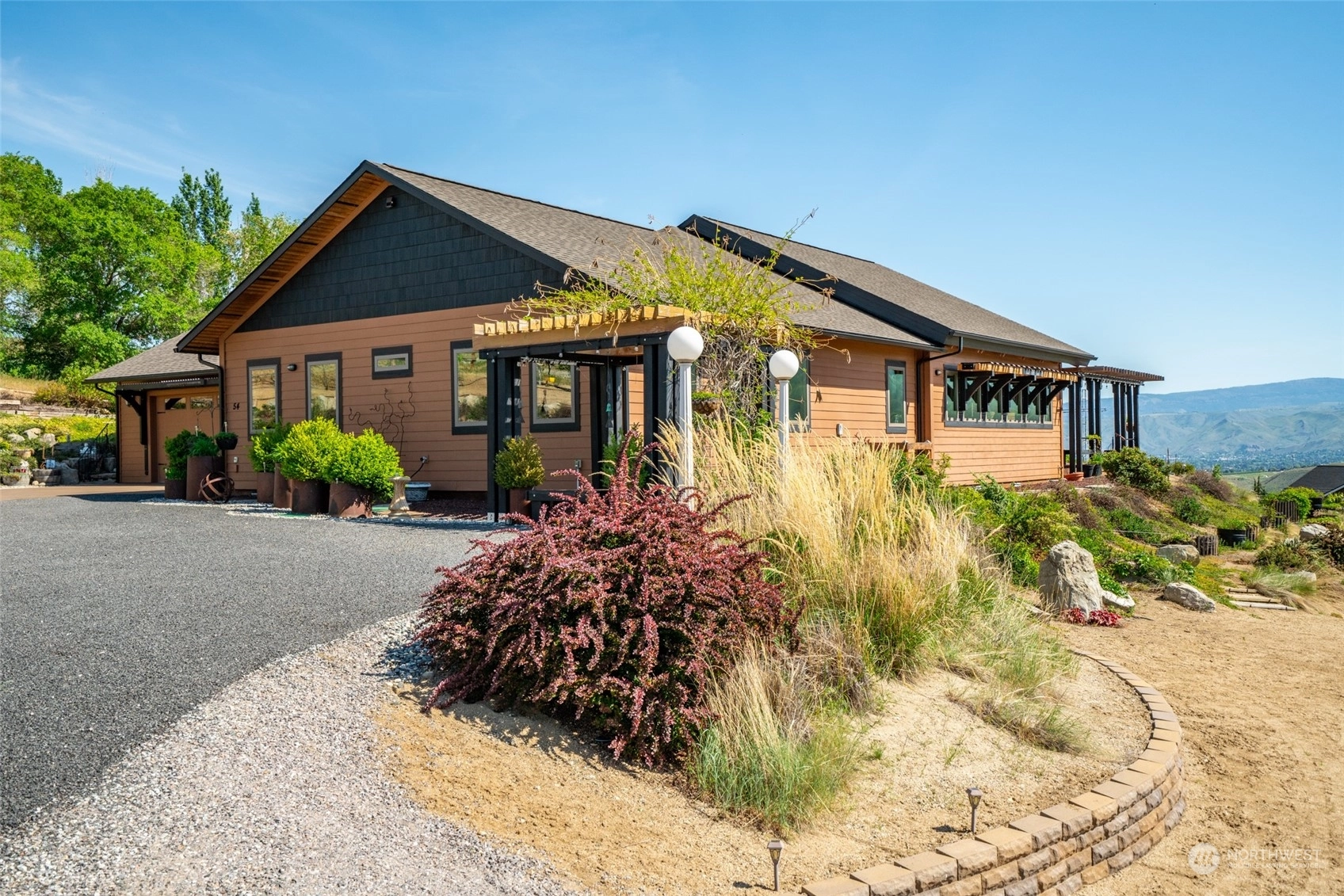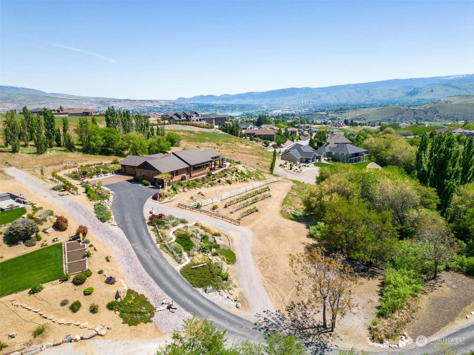 Quality custom built single level home w/ breathtaking Cascade Mtn views. 3-car garage/shop connected by breezeway, tandem bay w/ second garage door off back that is 47Ft deep. Outdoor living space is impeccable w/ expansive private patio & composite deck overlooking the garden & mountainscape. Impressive great room w/ wall of view windows, intricate beam ceilings & light filled kitchen w/ custom cabinetry, oversized island & pantry. Primary suite is spacious & situated on it's own wing of the home w/ captivating views & private bathroom w/ walk-in tile & glass shower & double sink vanity. Oversized laundry room w/ granite toped folding island, room for 2nd refer, custom cabinets & exterior access. Dedicated office room. Irrigation water.