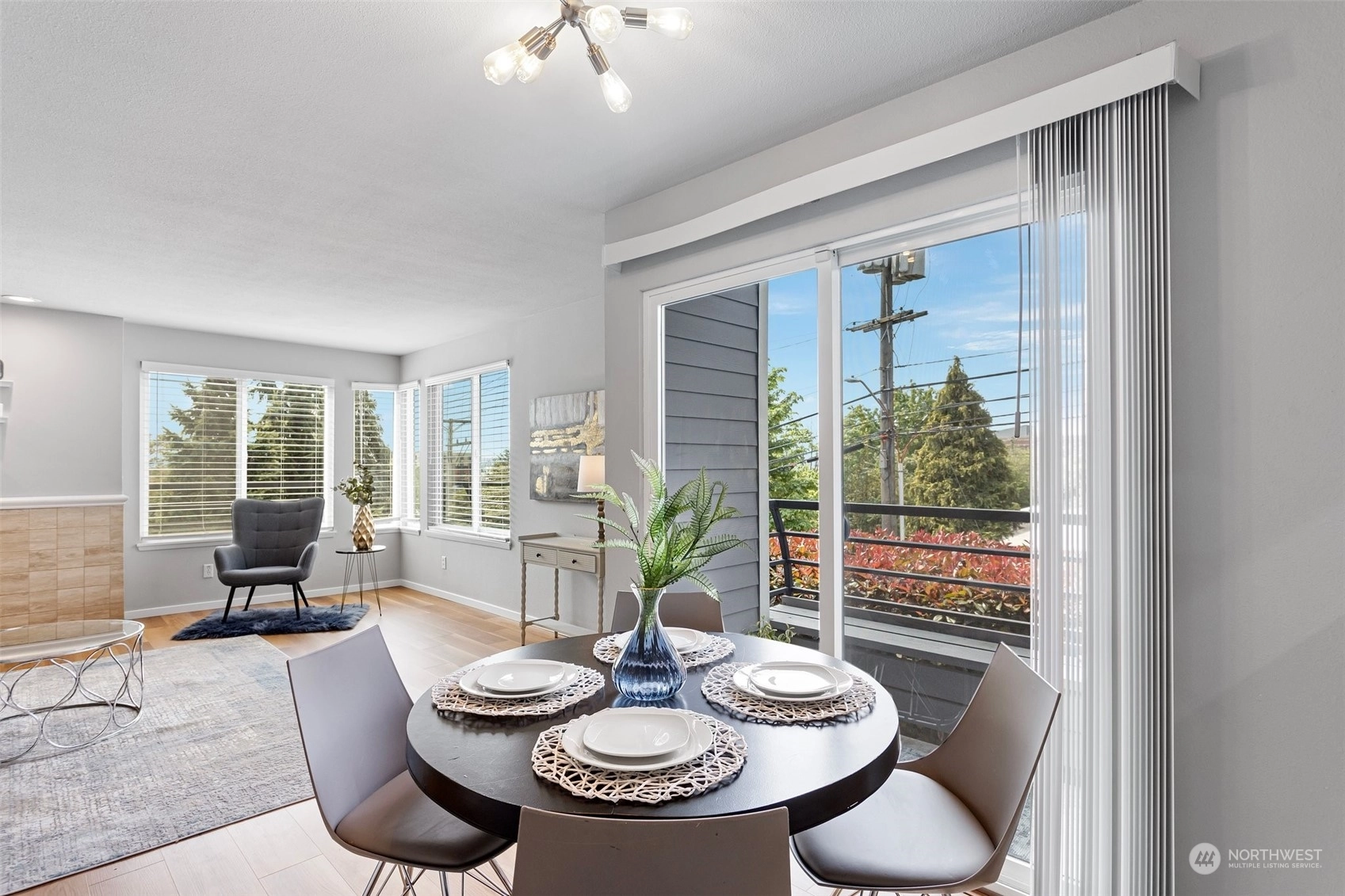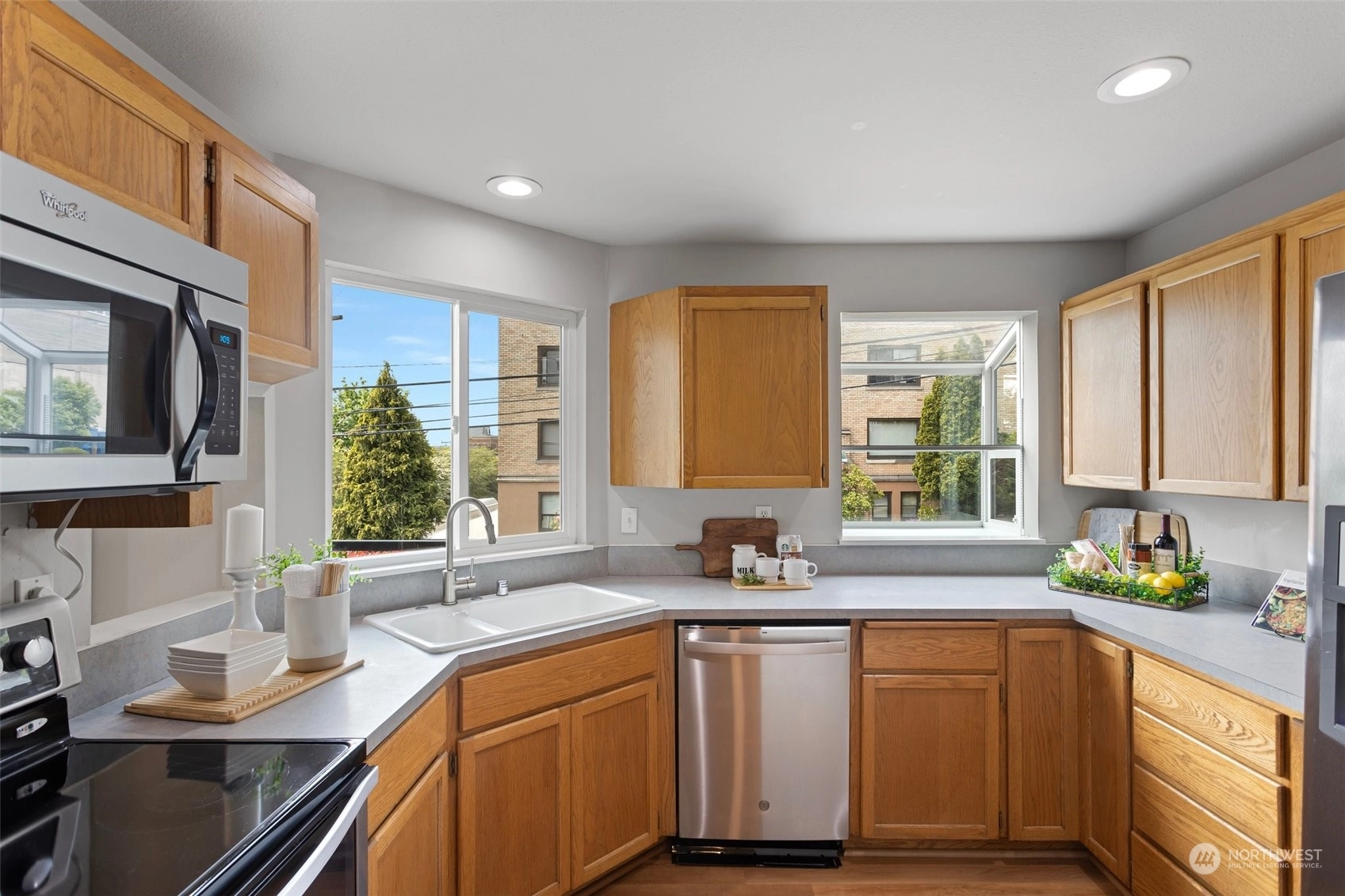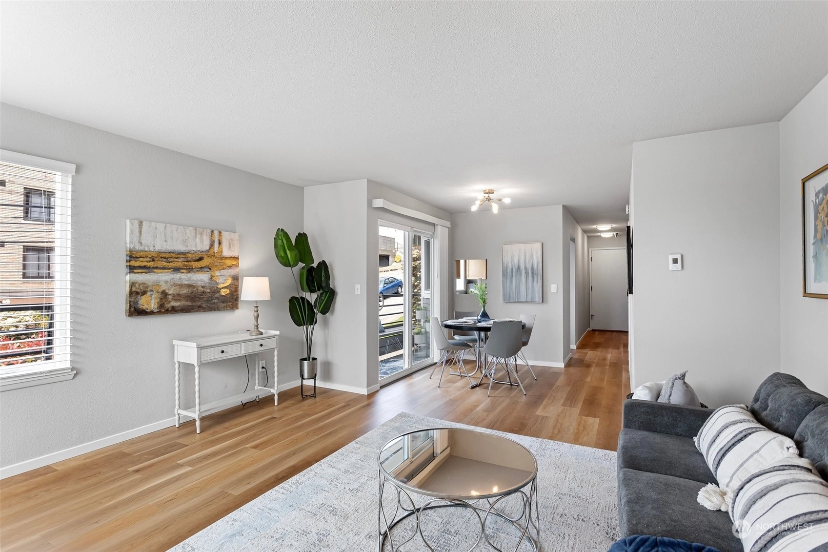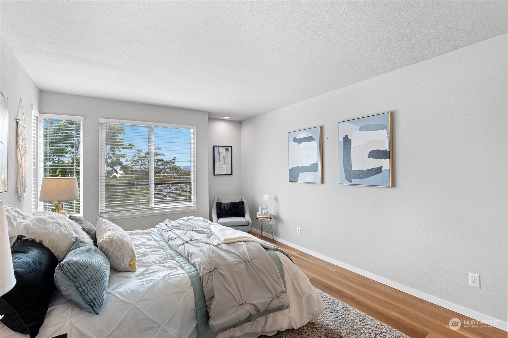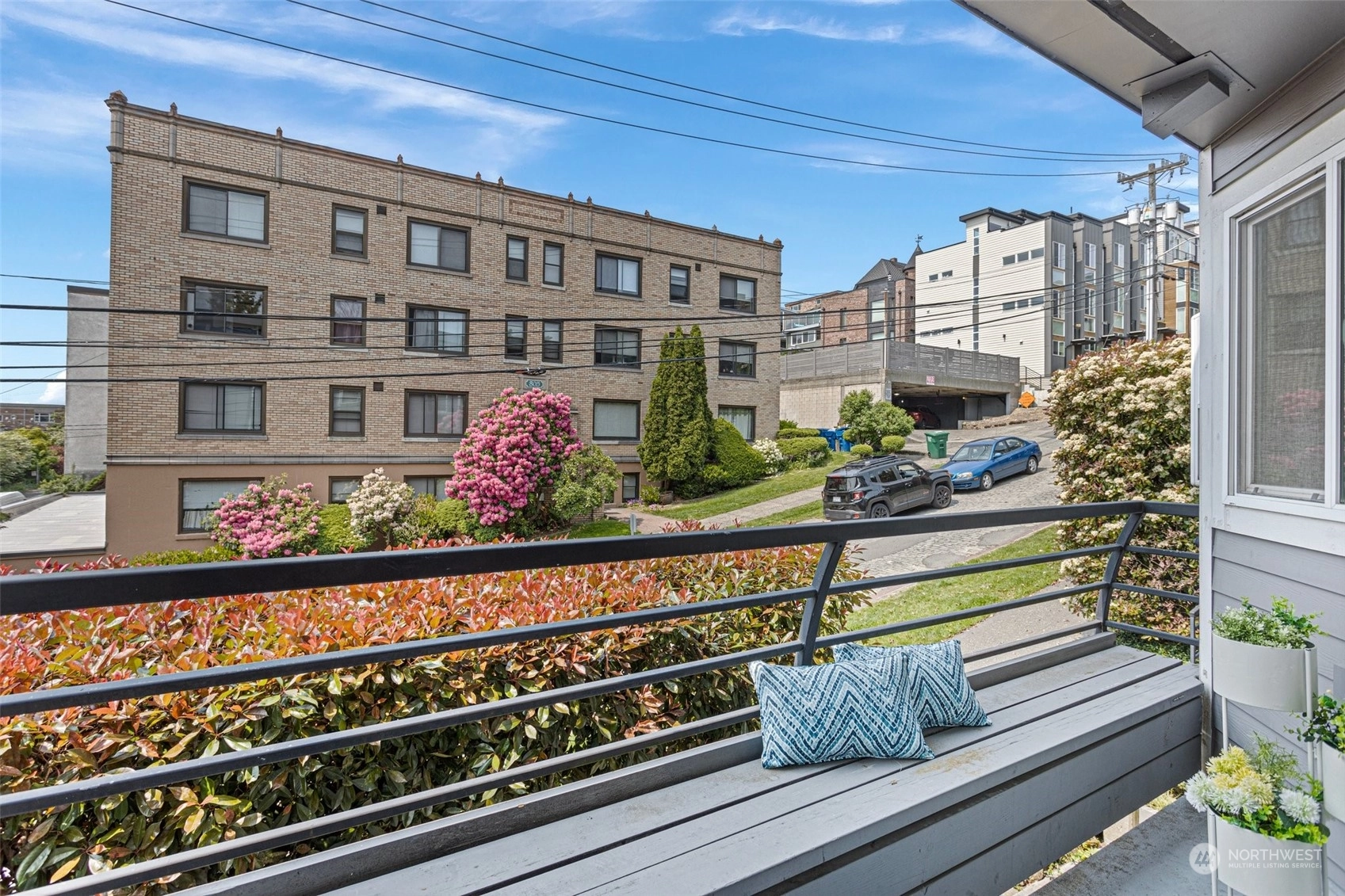 Morning coffee just tastes better with a sparkling view of the Sound from your balcony! Welcome home to this 2nd floor 2-bedroom/2-bath condo in a fantastic Queen Anne location with iconic Seattle views of the Space Needle, City Skyline, & Elliot Bay. Easy walk to Seattle Center & many close-by coffee bars, theaters, and restaurants plus errands are a breeze with many nearby amenities. Inviting primary bedroom features an en-suite bathroom and double closets. The unit boasts of updated floors, vanities, garbage disposal, fresh paint, water heater & appliances. Well-run HOA, dues cover W/S/G, and more! Pet friendly. 1-car assigned garage parking and a storage space. In unit washer and dryer completes the package! No Rental cap. Welcome Home!