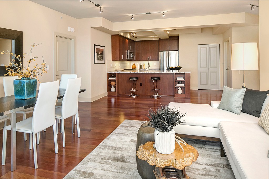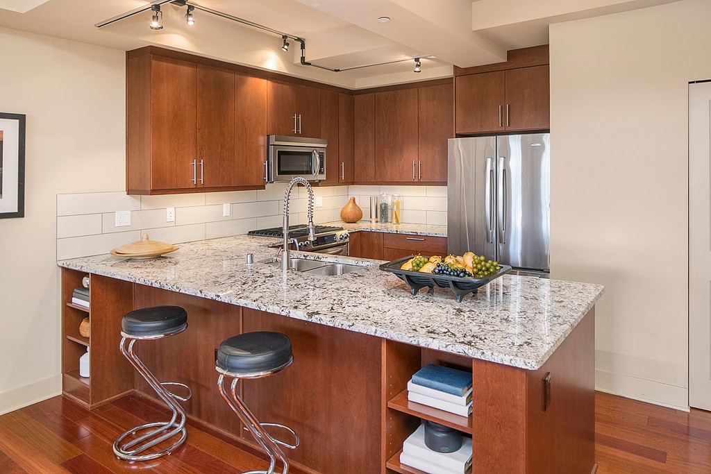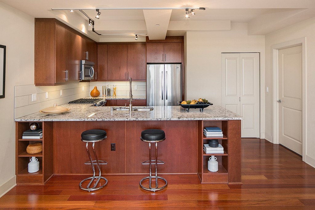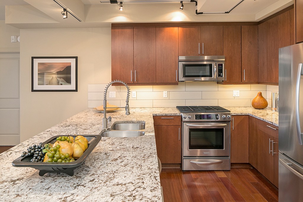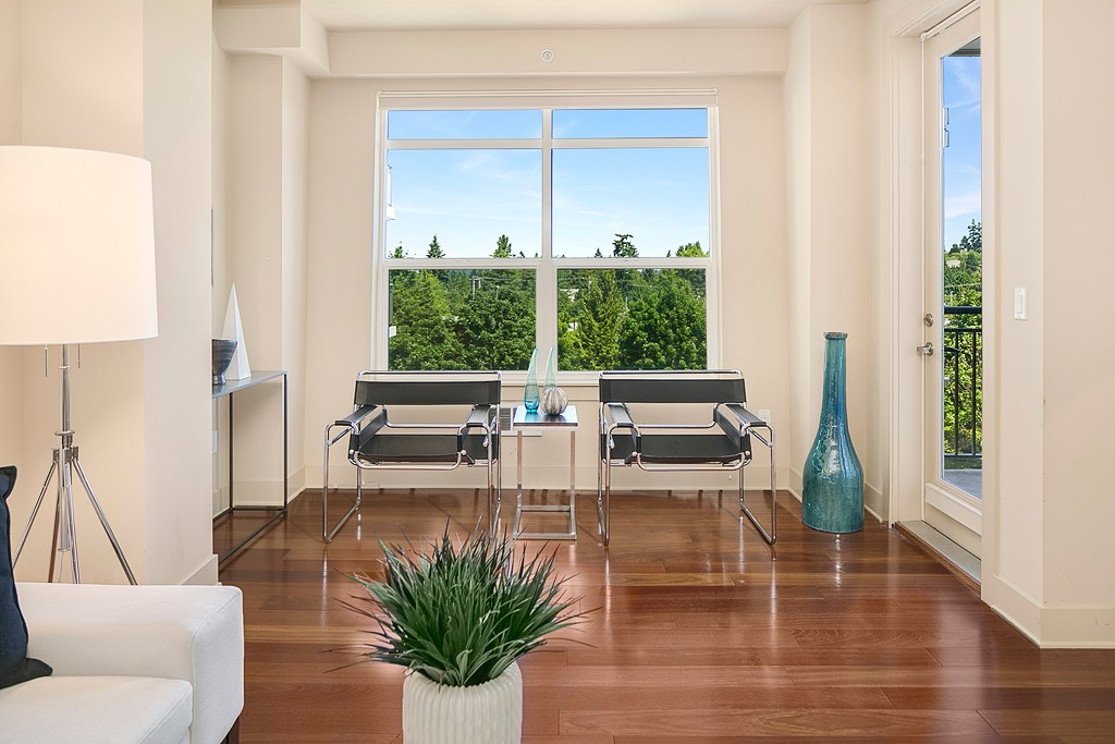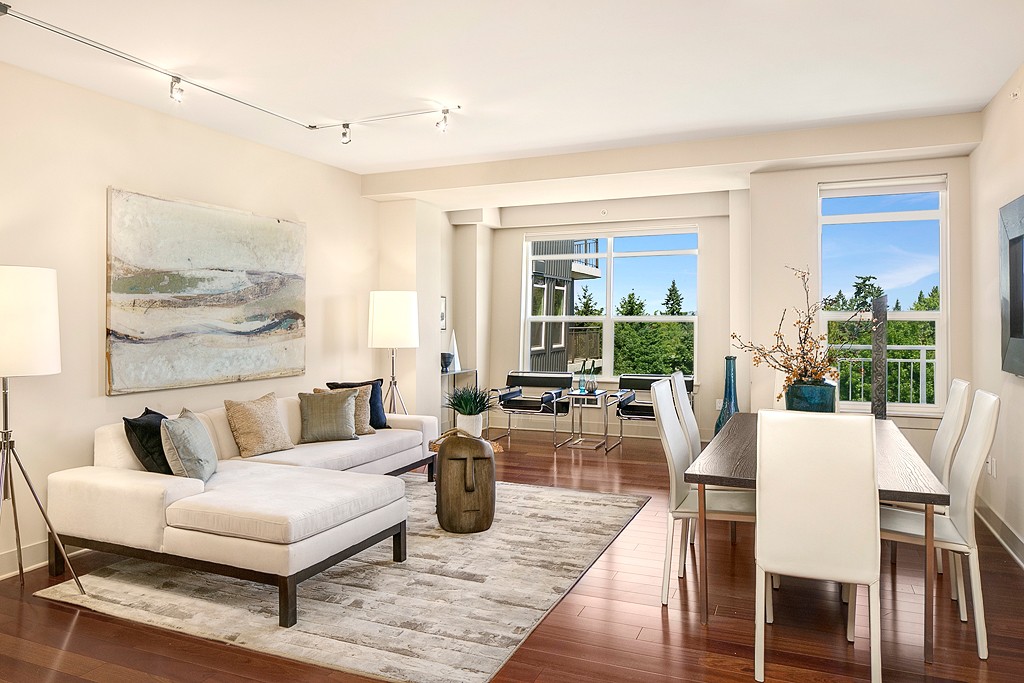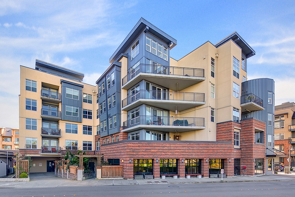 Priced below 2015 assessed value of $704,000. Art lovers will love overlooking the Island's sculpture park, views to the North from your private terrace. Spacious center great room separates two bedroom suites in this extremely livable floor plan. Generous open kitchen has slab granite counter tops, full height cabinets, pantry and stainless appliances. Boutique concrete and steel building in downtown Mercer Island. Walk everywhere! Two side by side parking spaces and storage.