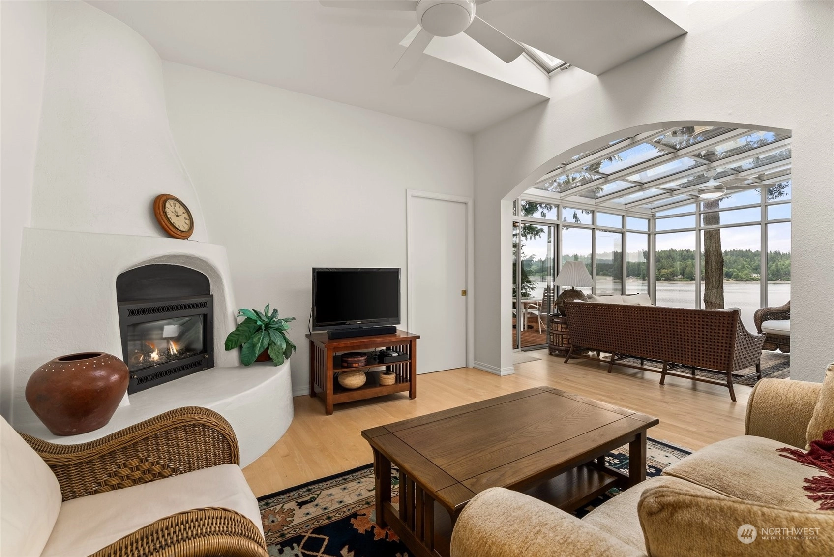 Ceramic Tile Hardwood Wall to Wall Carpet Wired for Generator Bath Off Primary Ceiling Fan(s) Double Pane/Storm Window Dining Room Fireplace (Primary Bedroom) Jetted Tub Security System Skylight(s) Solarium/Atrium Vaulted Ceiling(s) Walk-In Closet(s) Fireplace Water Heater