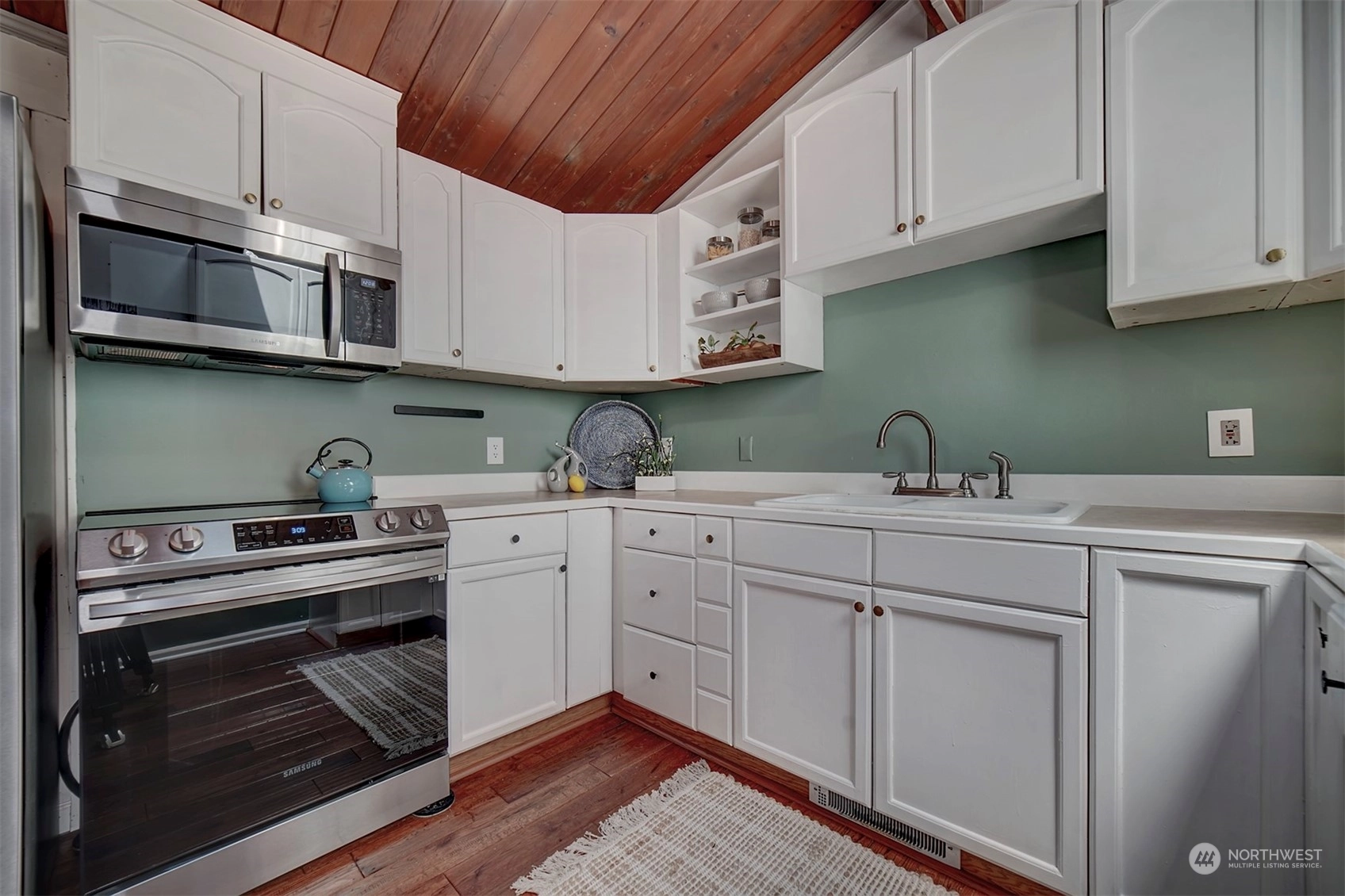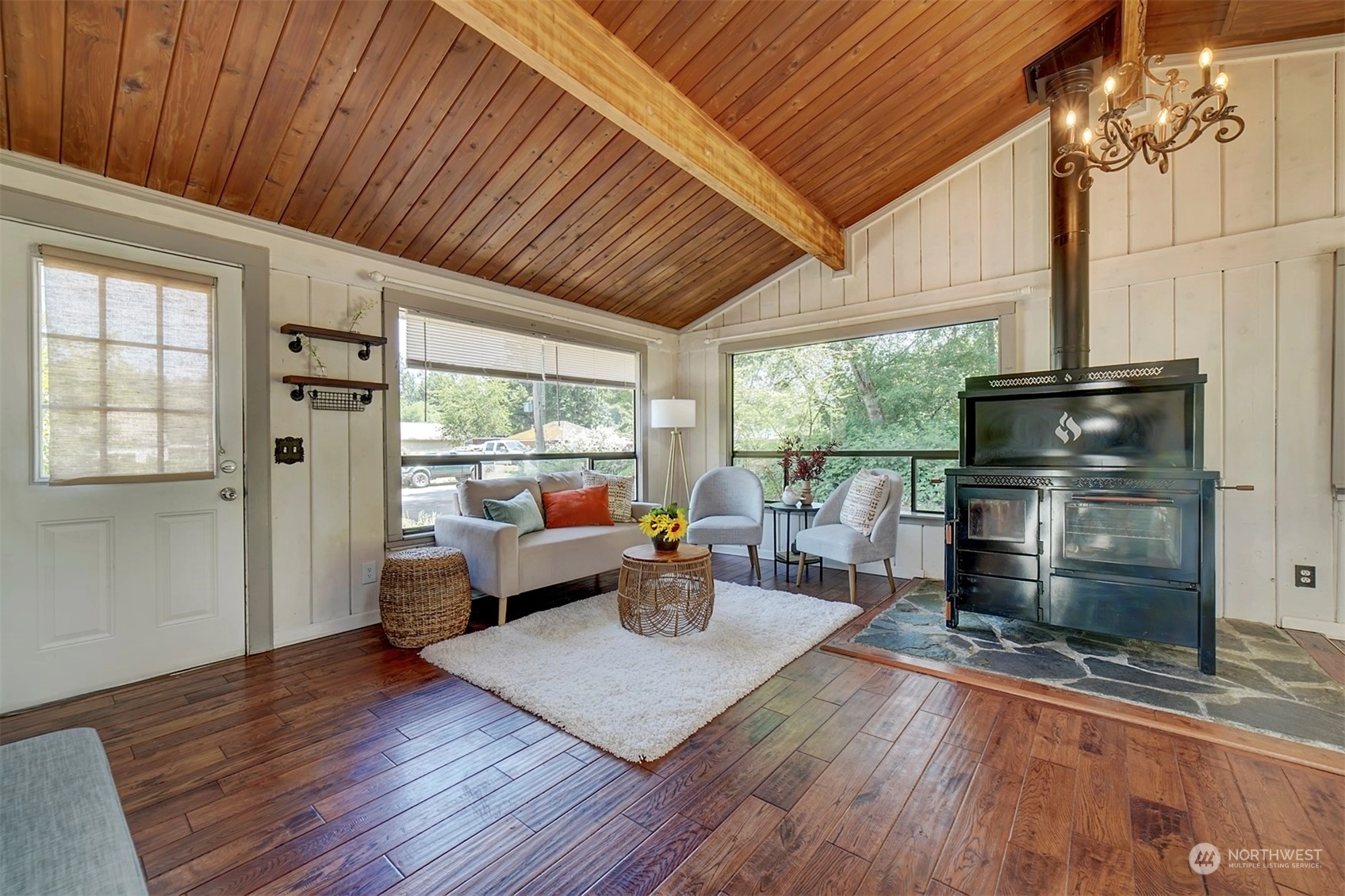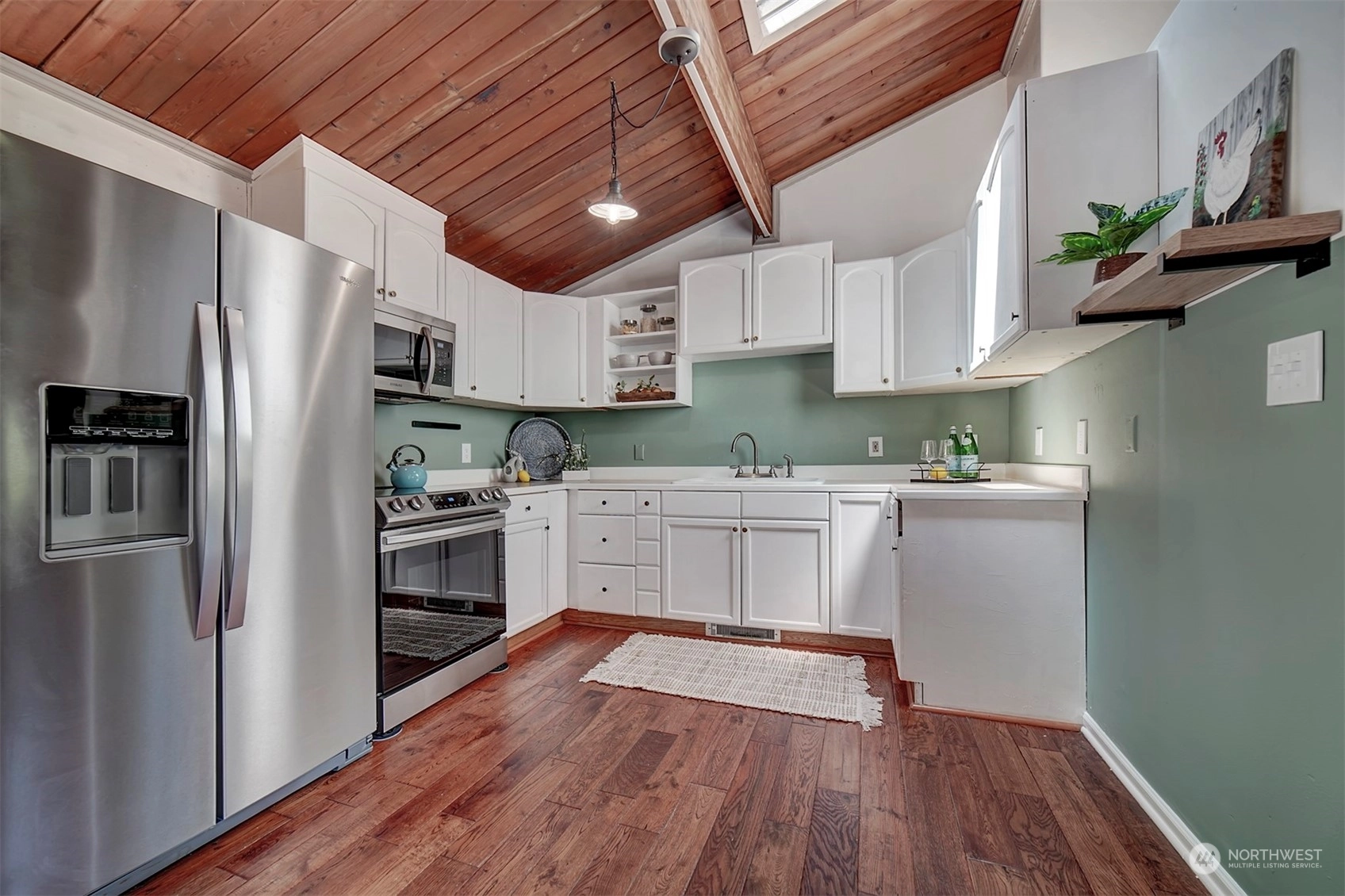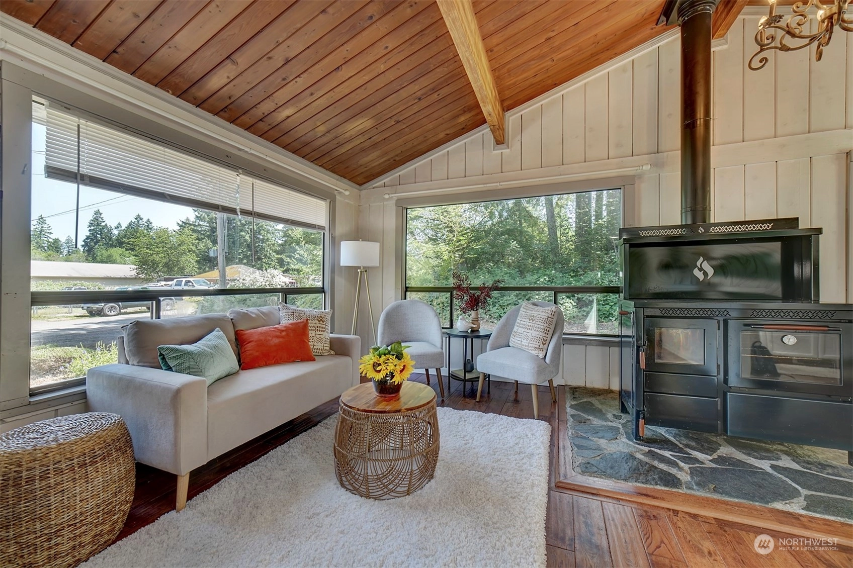 Charming 3 bed/1.5 bath rambler with a mini-orchard on usable level property. This includes apple, pear, fig, and peach trees, grapes, assortment of berries and herbs. If that is not enough, home is walking distance to Farmers Market. Home has hardwoods, new roof in 2019/2020, new stainless steel appliances, oversized cooking woodstove, vaulted ceilings, and updated bathrooms. Back yard has been updated to entertain - but property does allow for chickens. Outbuilding can be used as shed/chicken coop. Near Airporter, easy commute to freeway or to Southworth ferry for access to military bases.