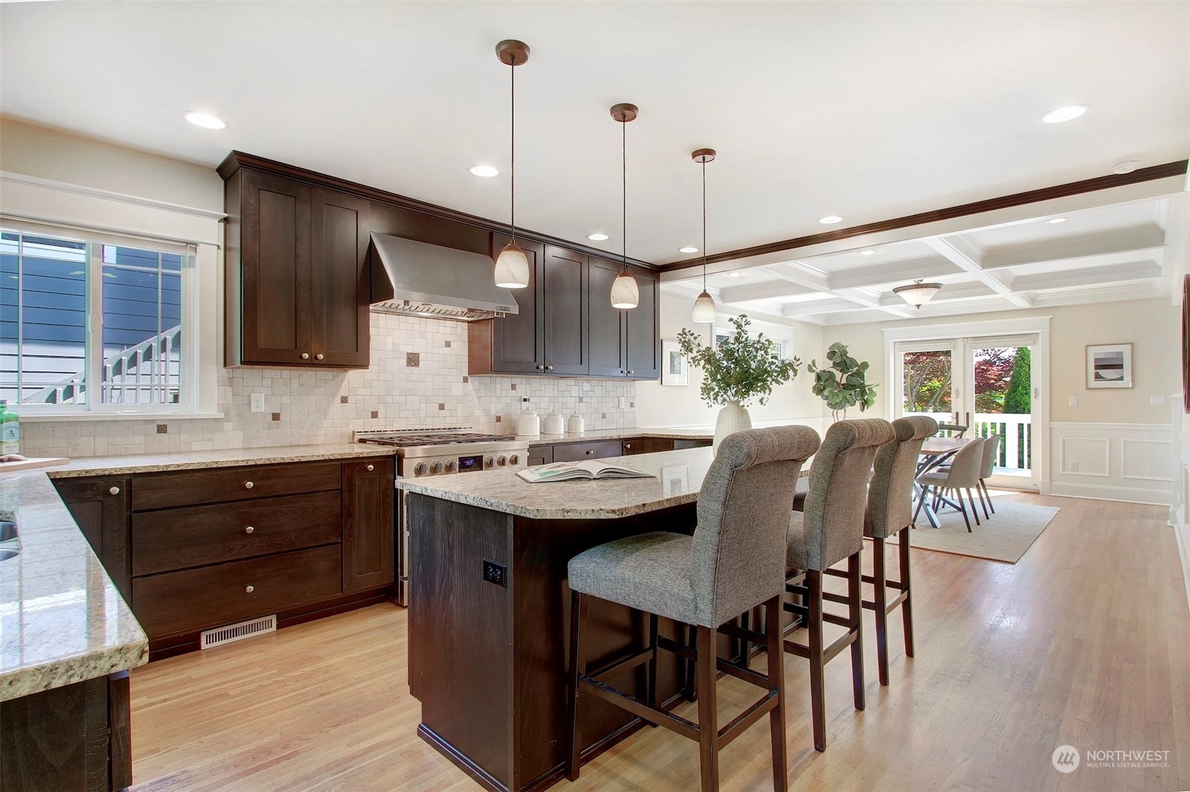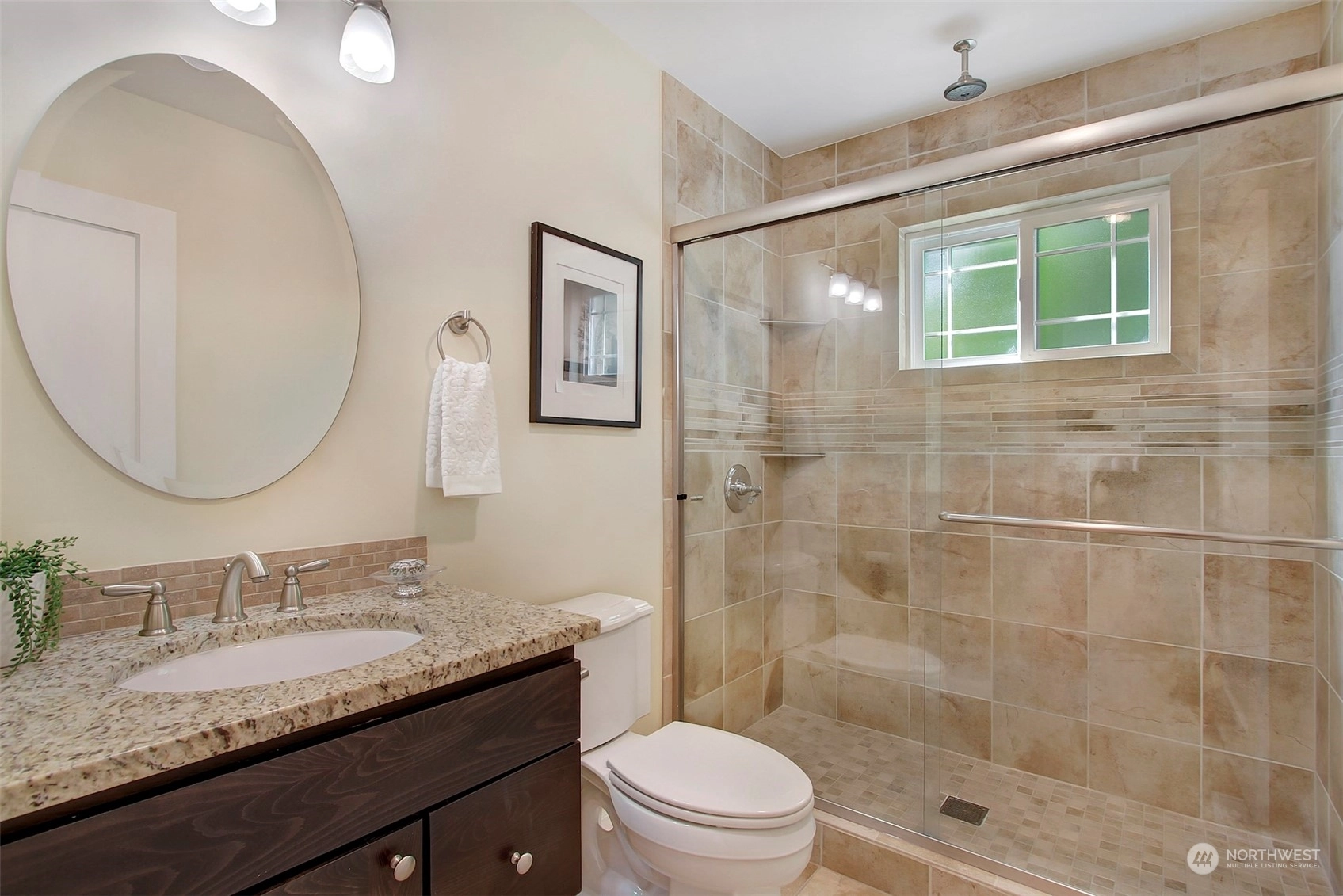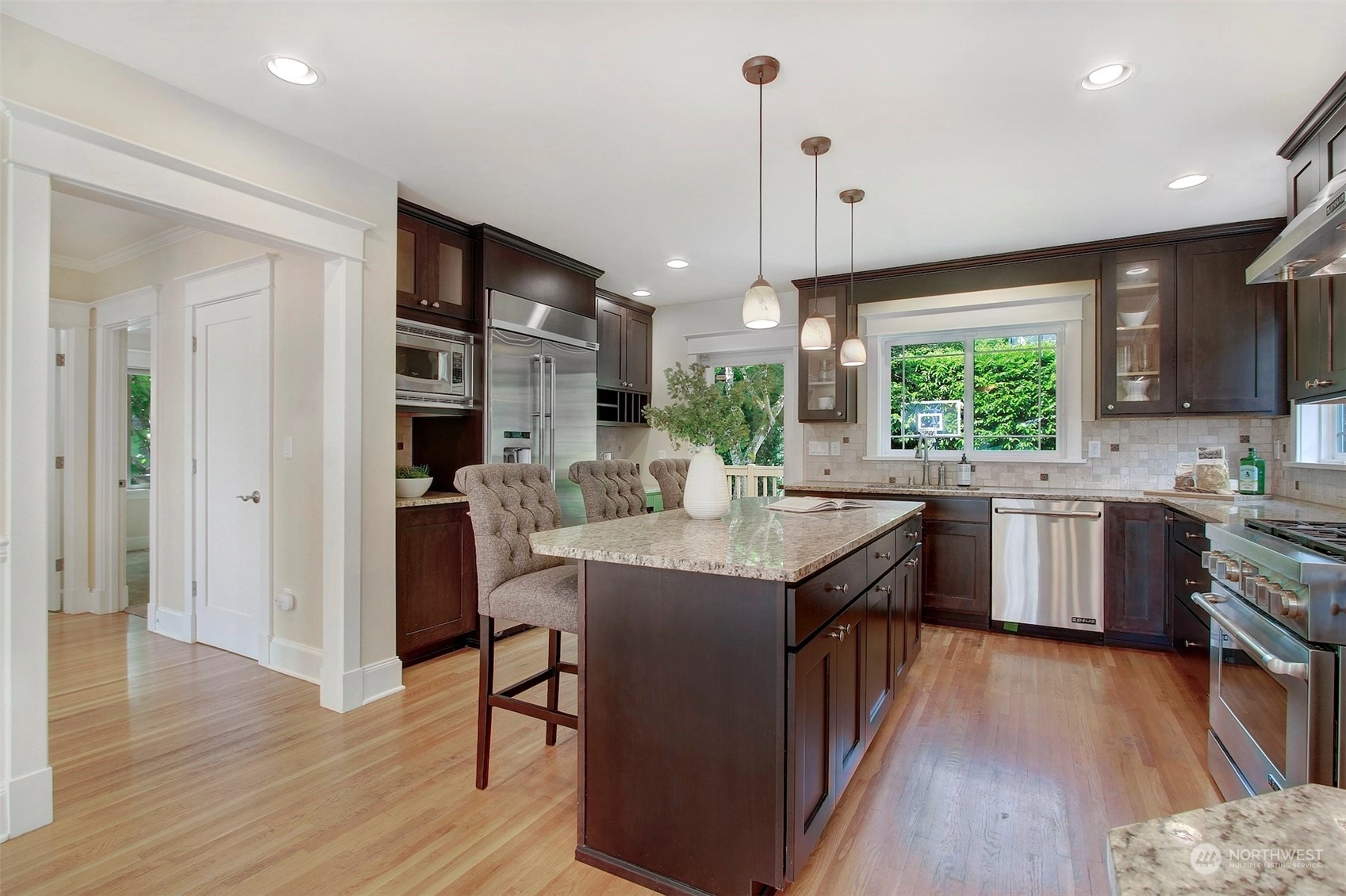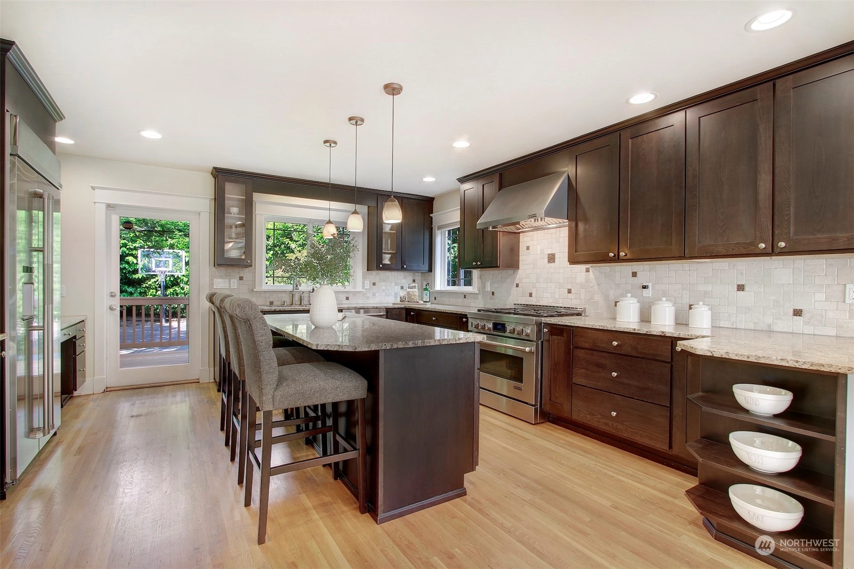 Beautifully remodeled Leschi home with stunning Cascade, Mt Rainier, Lake Washington & Downtown Bellevue views. Blocks to all the great restaurants, shopping, parks and amenities this part of city has to offer. Updated systems and finishes throughout including bathrooms; kitchen with Jenn-Air appliances, granite counters and custom cabinets. Large lower-level rec room features wetbar & wine chiller as well as guest suite with separate entrance and private bath. ADU potential? New siding & roof. Large front and back decks. Huge private and level back yard with lots of potential. 1 car detached garage.