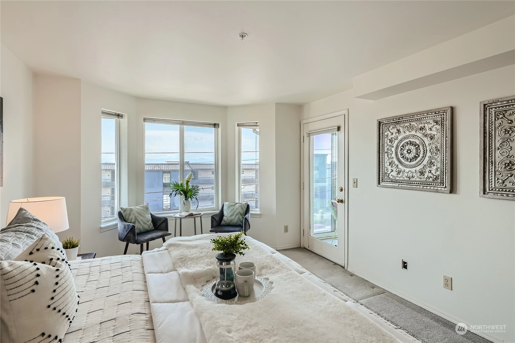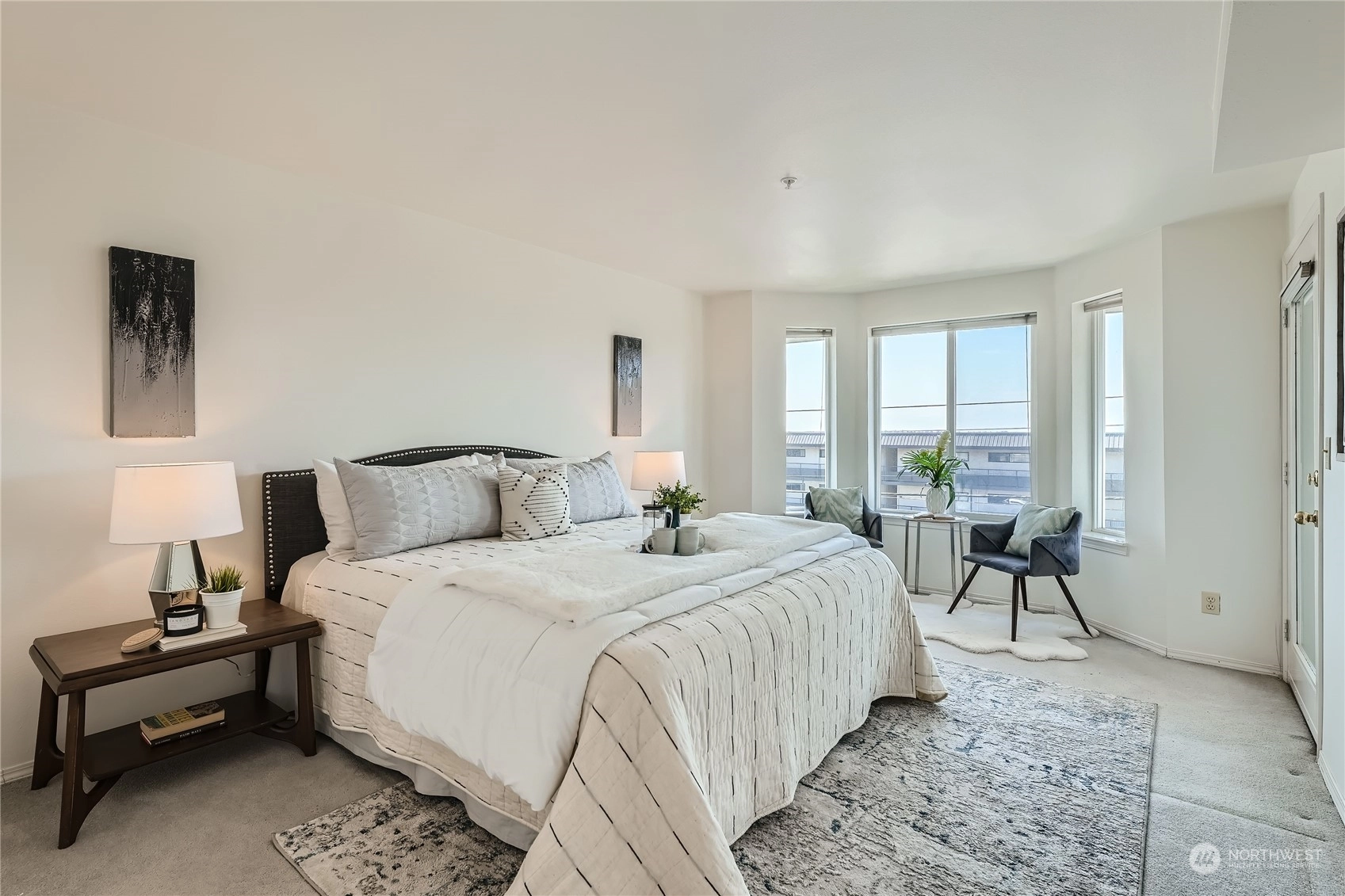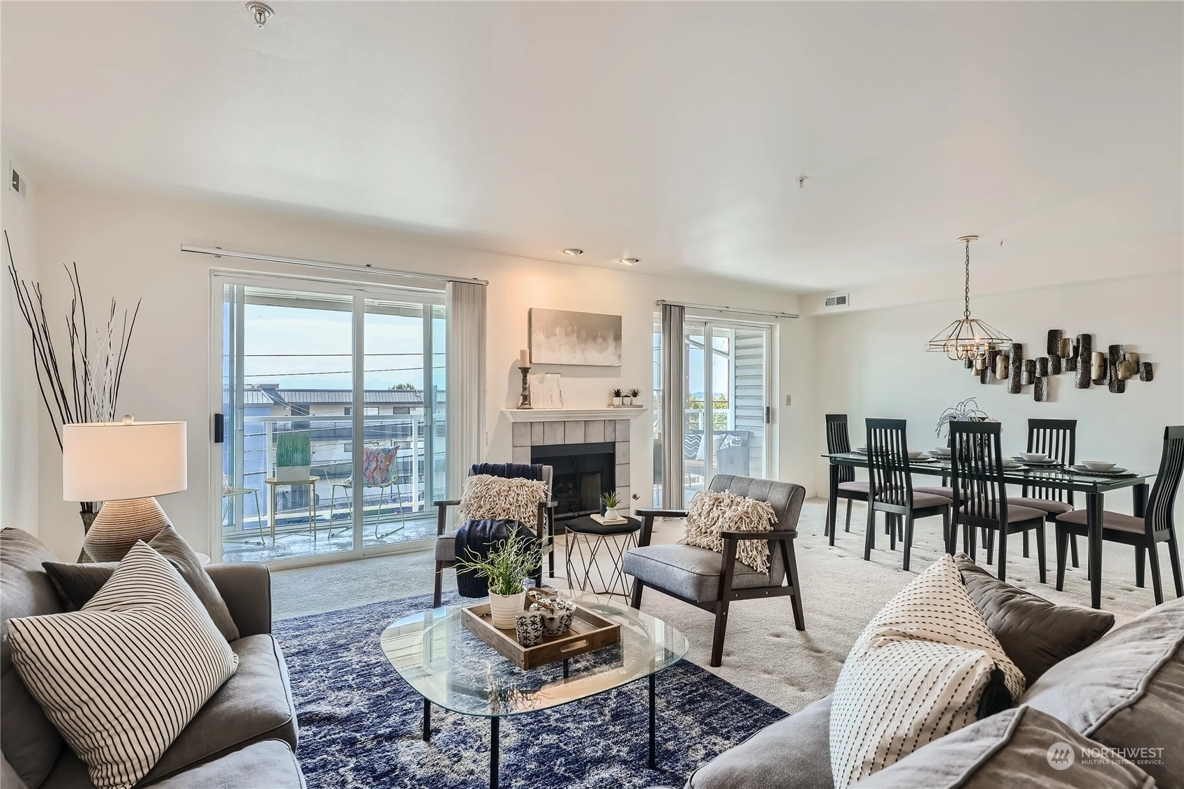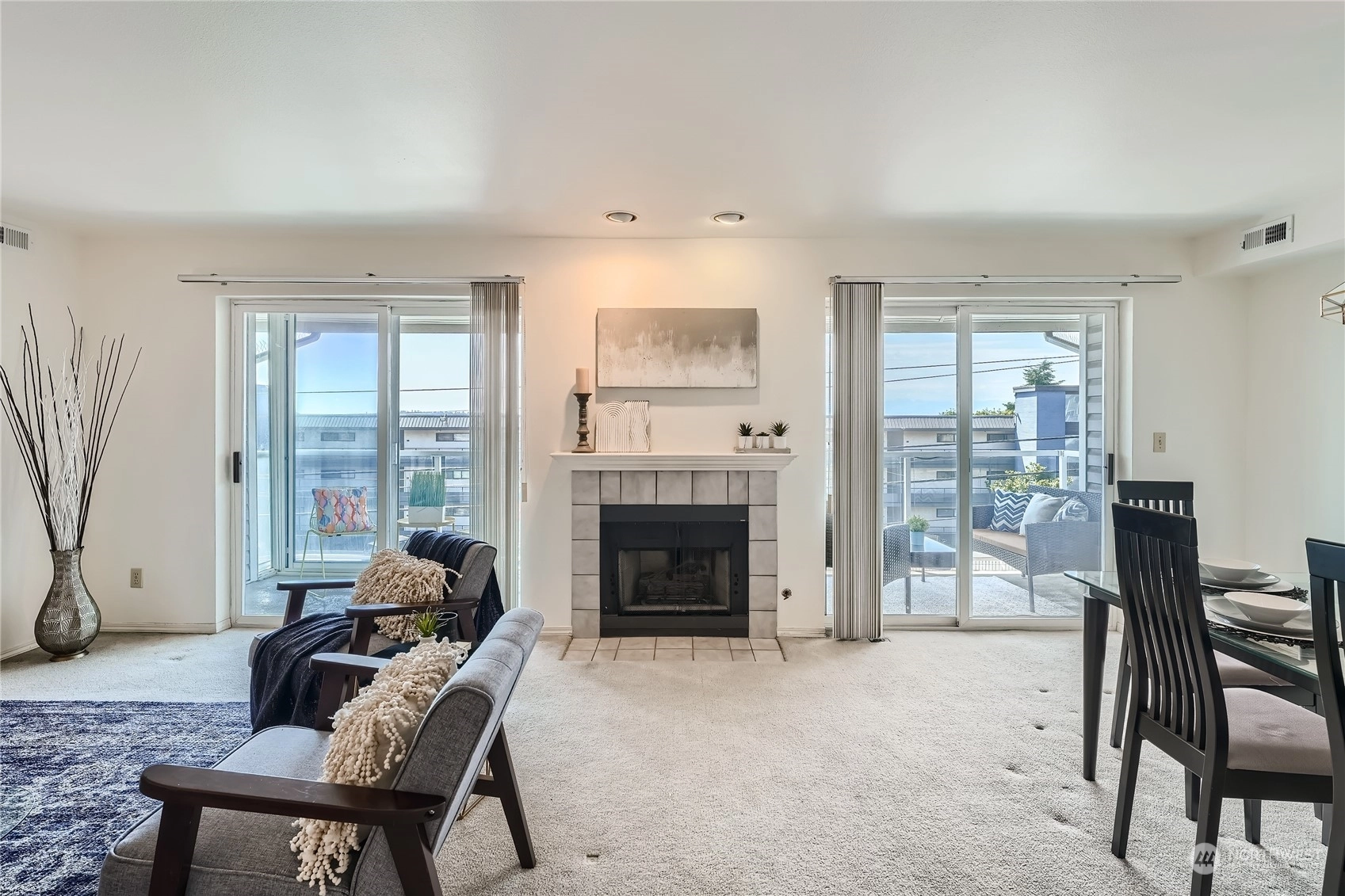 Large natural light filled top floor corner unit with westerly views of City, Olympics & Territorial. Nice size spaces thru-out. Primary bedroom with 3/4 bath & access to deck. Den/Office could easily be another bedroom if needed or TV room. Spacious living/dining area includes gas fireplace. Full size side by side washer dryer, sprinkler system & two view decks (one can be enclosed). Full bath has jetted tub. Two large car garage spaces covered & secure a big plus. Quick easy access all within 5/10 minutes via bus route 36 or 60 (at the corner) to downtown Seattle, international district, stadiums, first & capitol hill plus freeway to all points. Rare to find a unit with this amount of square feet in this price range. Worth a look.
