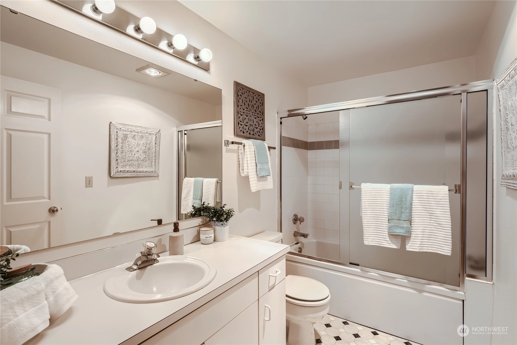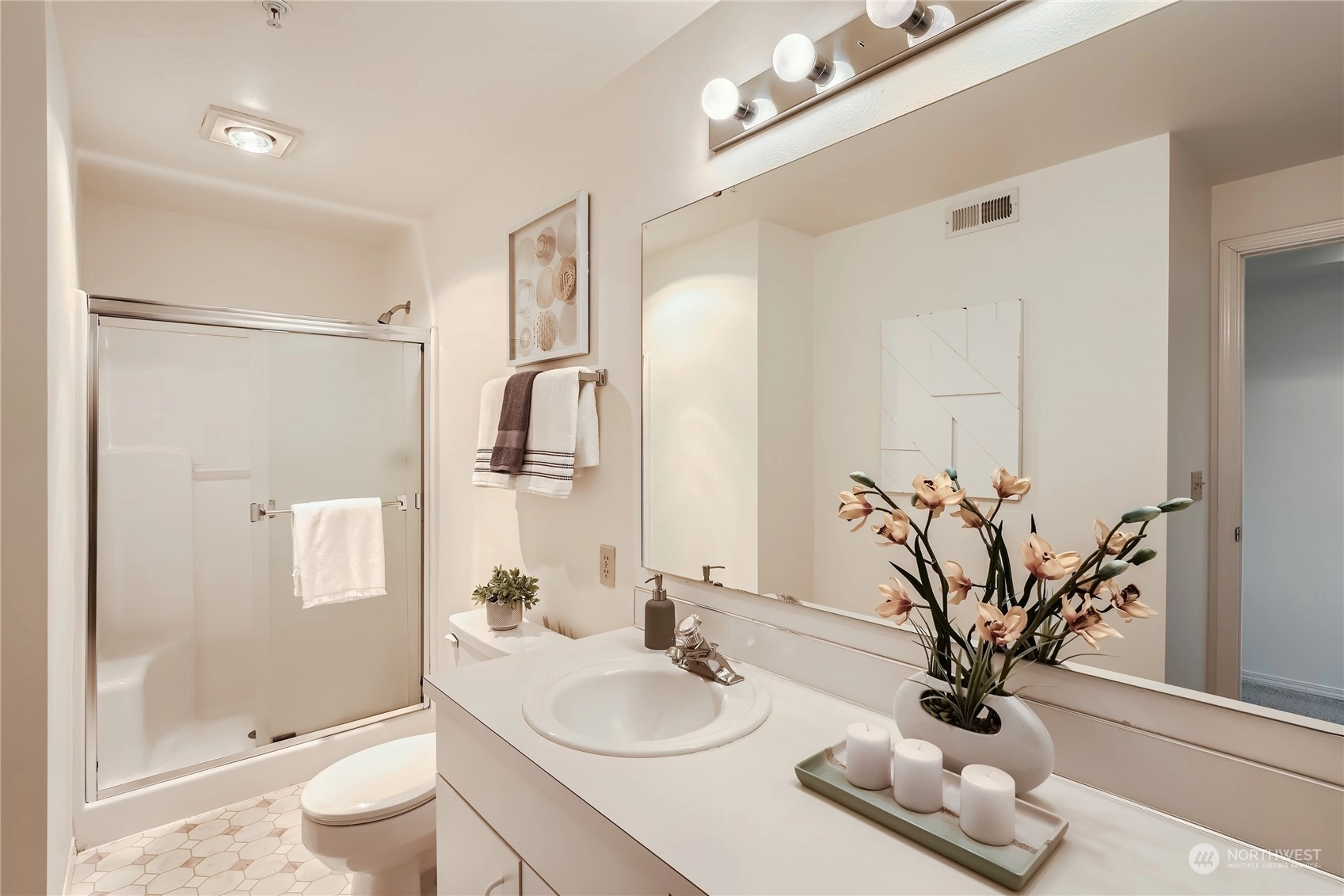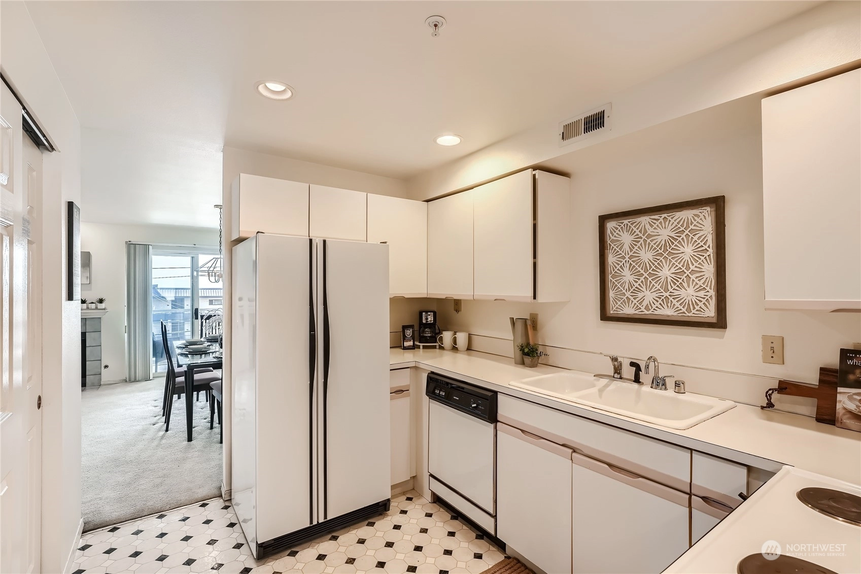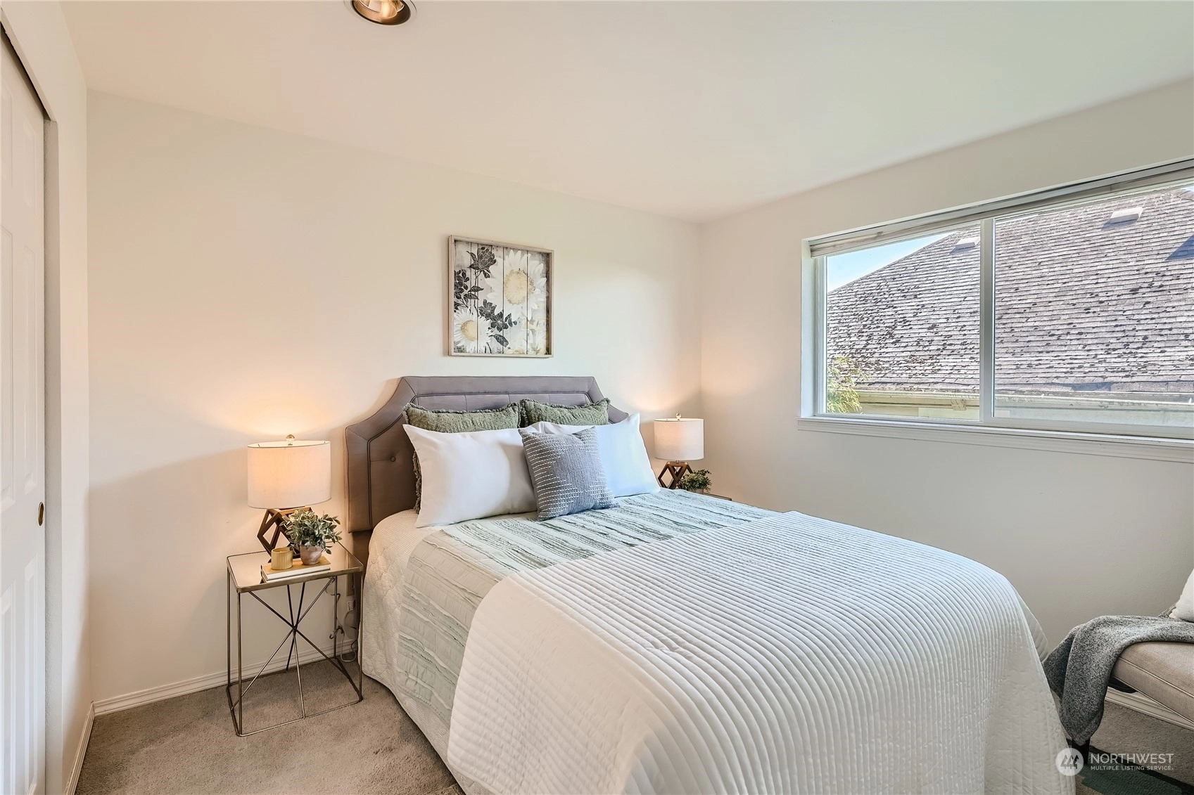 Large natural light filled top floor corner unit with westerly views of City, Olympics & Territorial. Nice size spaces thru-out. Primary bedroom with 3/4 bath & access to deck. Den/Office could easily be another bedroom if needed or TV room. Spacious living/dining area includes gas fireplace. Full size side by side washer dryer, sprinkler system & two view decks (one can be enclosed). Full bath has jetted tub. Two large car garage spaces covered & secure a big plus. Quick easy access all within 5/10 minutes via bus route 36 or 60 (at the corner) to downtown Seattle, international district, stadiums, first & capitol hill plus freeway to all points. Rare to find a unit with this amount of square feet in this price range. Worth a look.