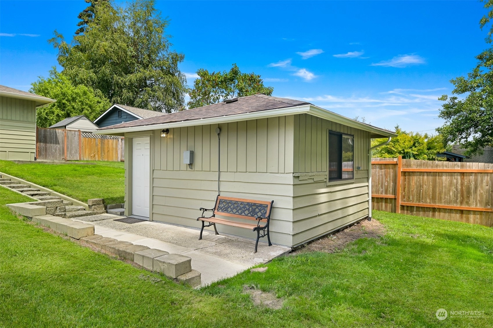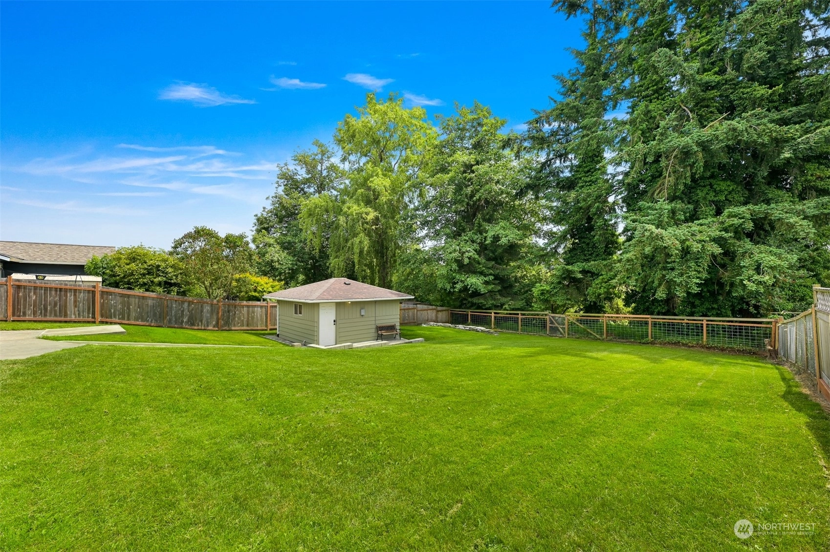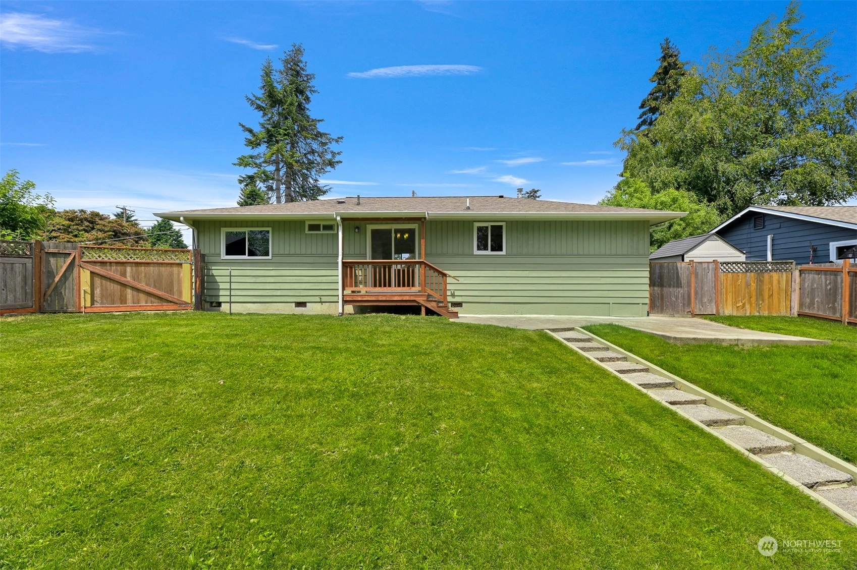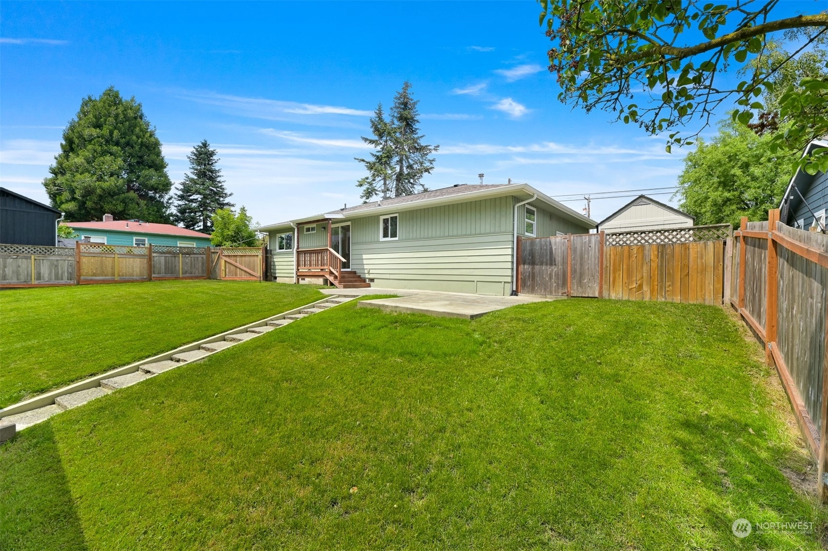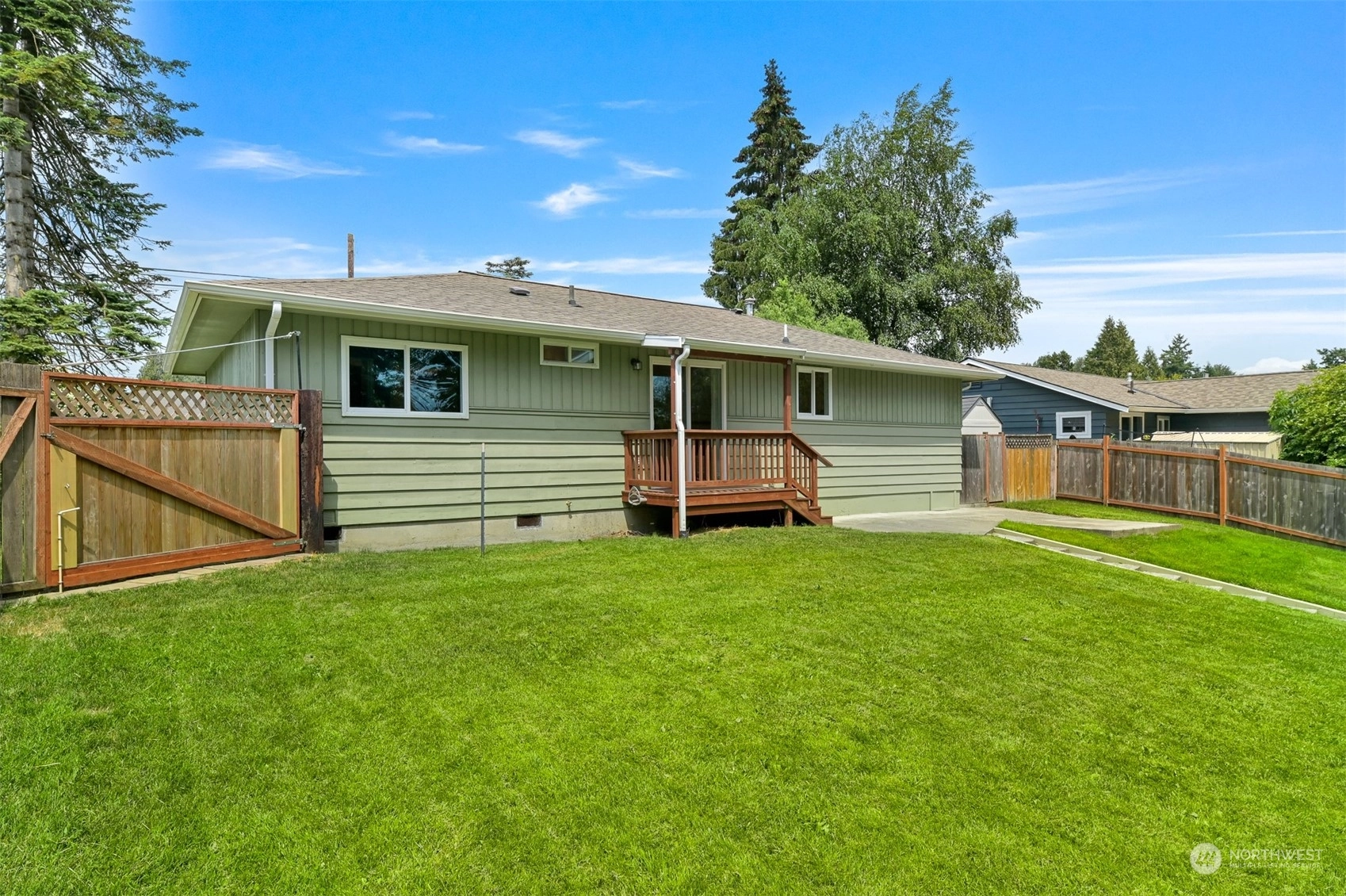 Centrally located Burlington rambler close to parks, schools & downtown! Whole home was completely remodeled in 2014 - roof, flooring, walls, mechanicals - newer everything! The home feels large w/ vaulted ceilings & engineered hardwood floors throughout. The open layout combination of living & dining room, kitchen opens up the heart of the home. Kitchen has plenty of cabinet storage, pantry, SS appliances, gas stovetop, w/ adjacent 1/2 bath & garage access. Washer/Dryer hookups in garage. Wet areas have low mntc Marmoleum flooring. Down the hall are 2 bedrooms w/ spacious closets+remodeled whole hallway bathrm. Surprise detached artist/music studio/multipurpose space in backyard! Home backs up to small creek & nature! Come & see this home!